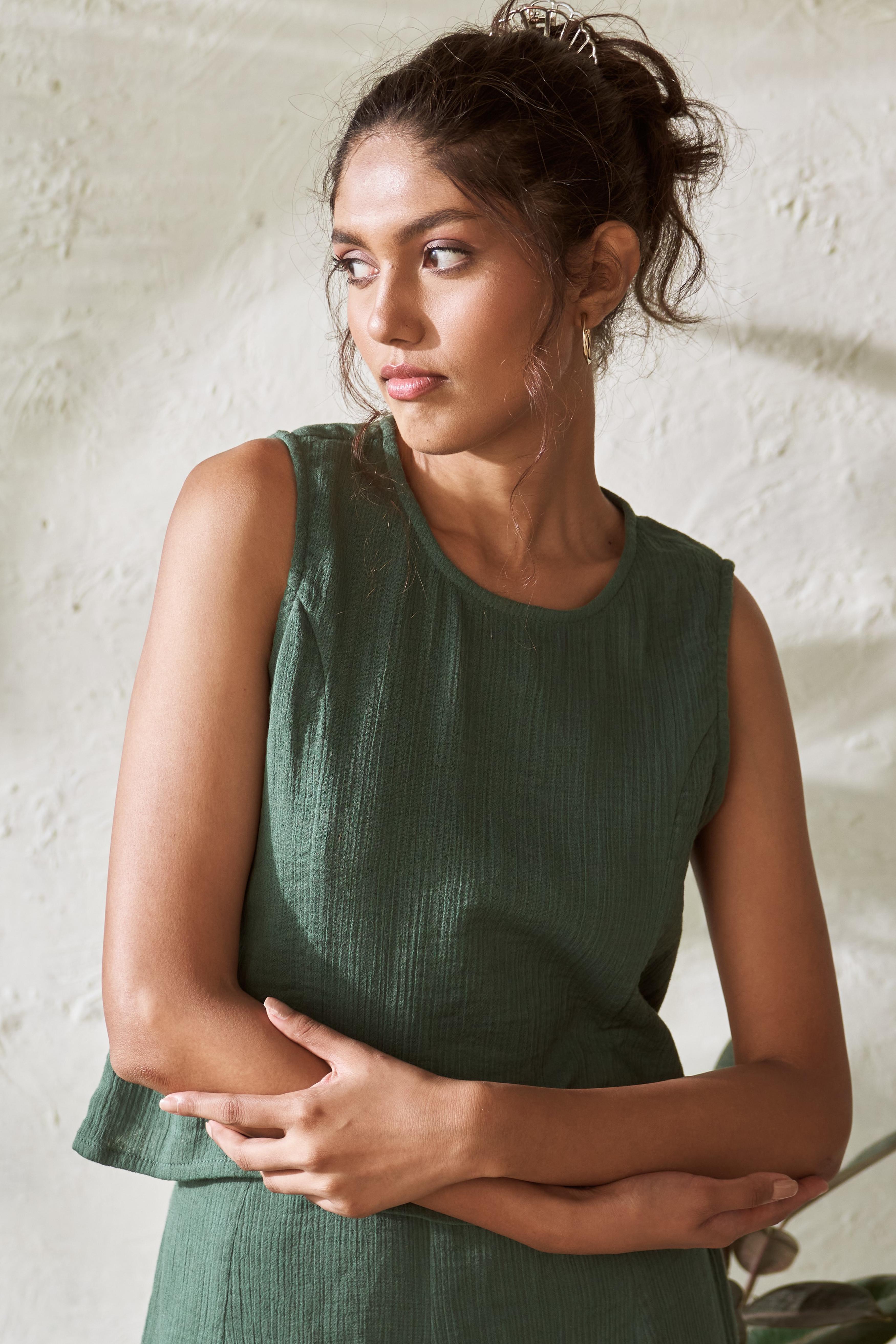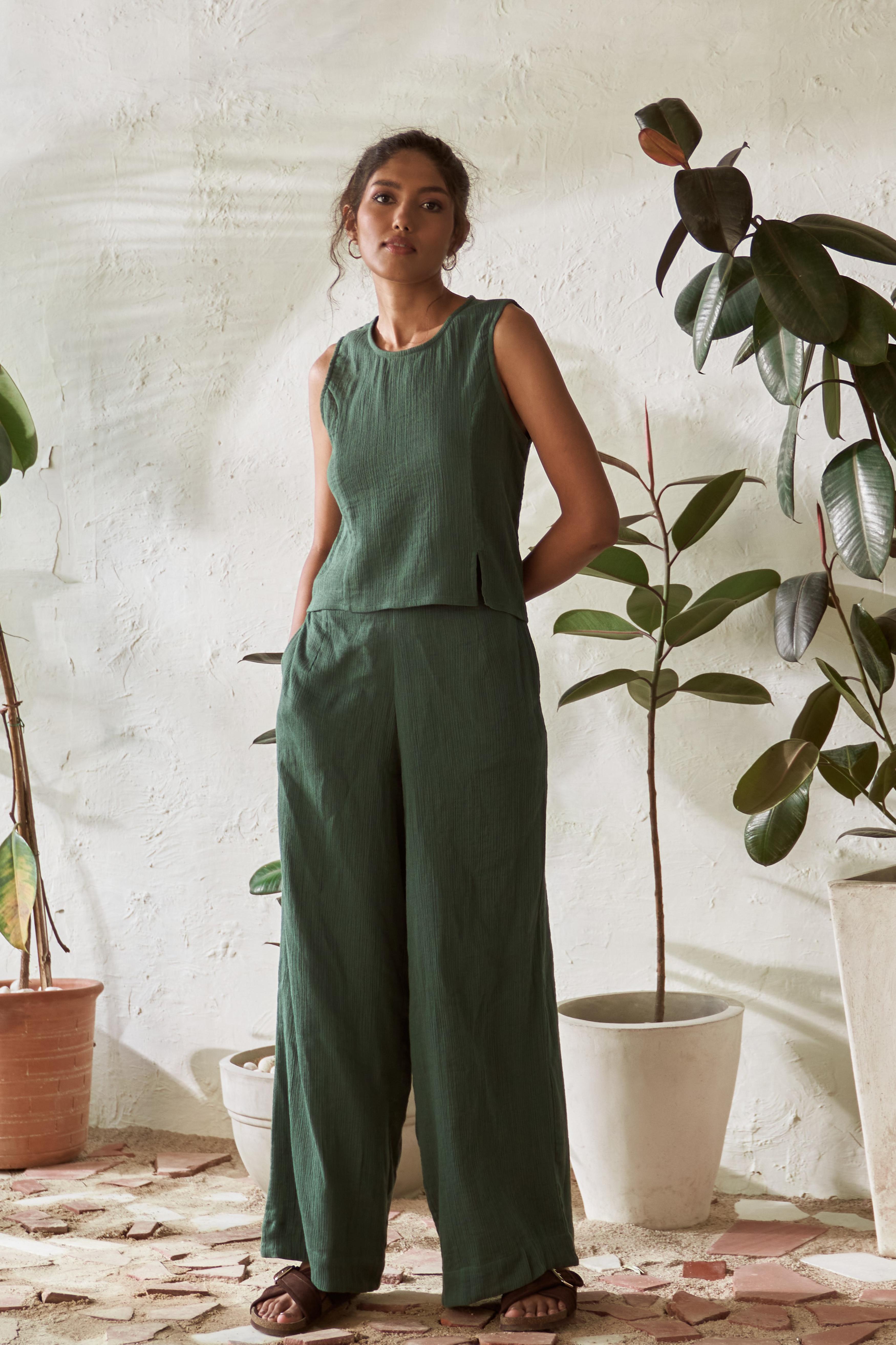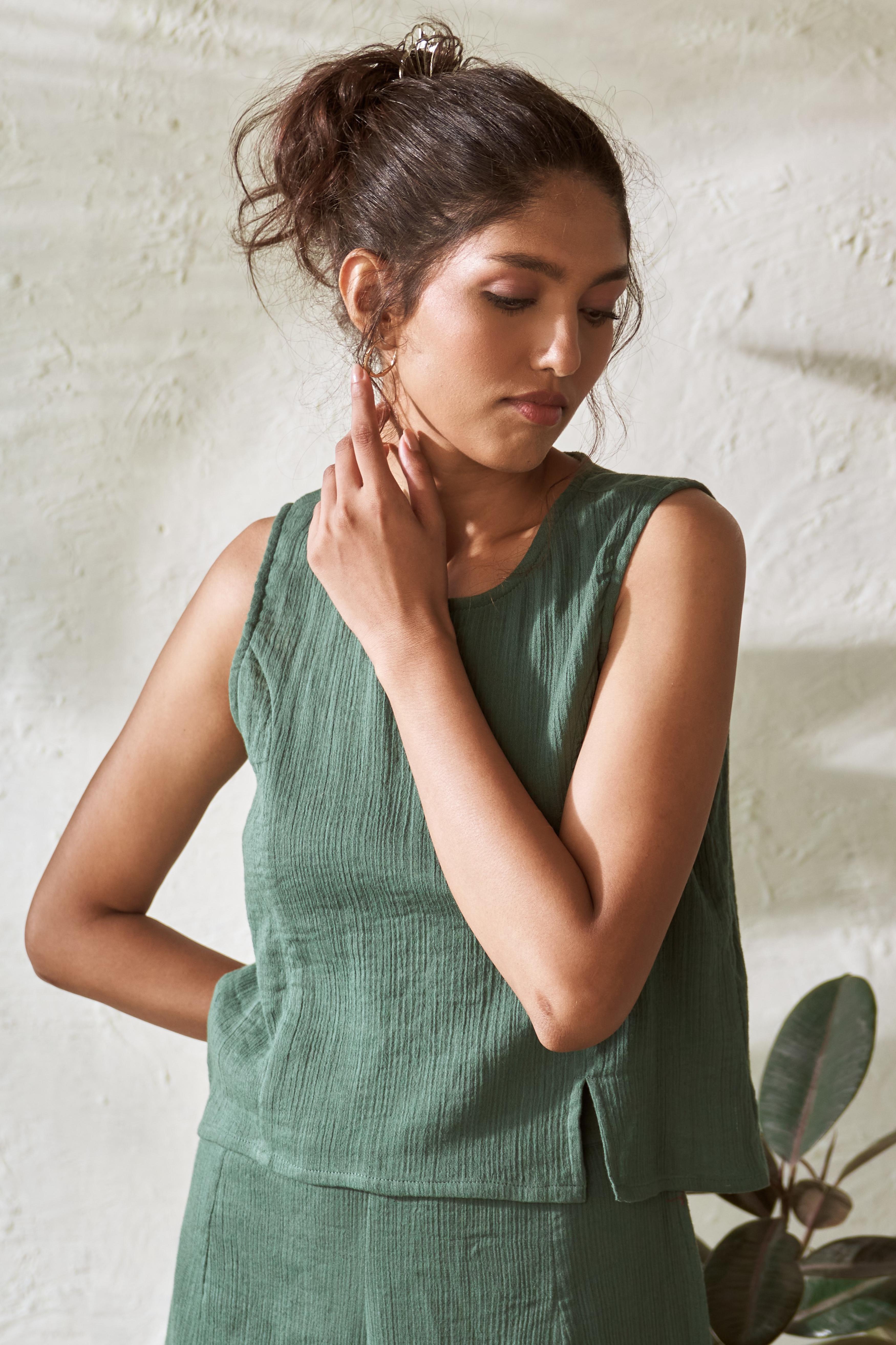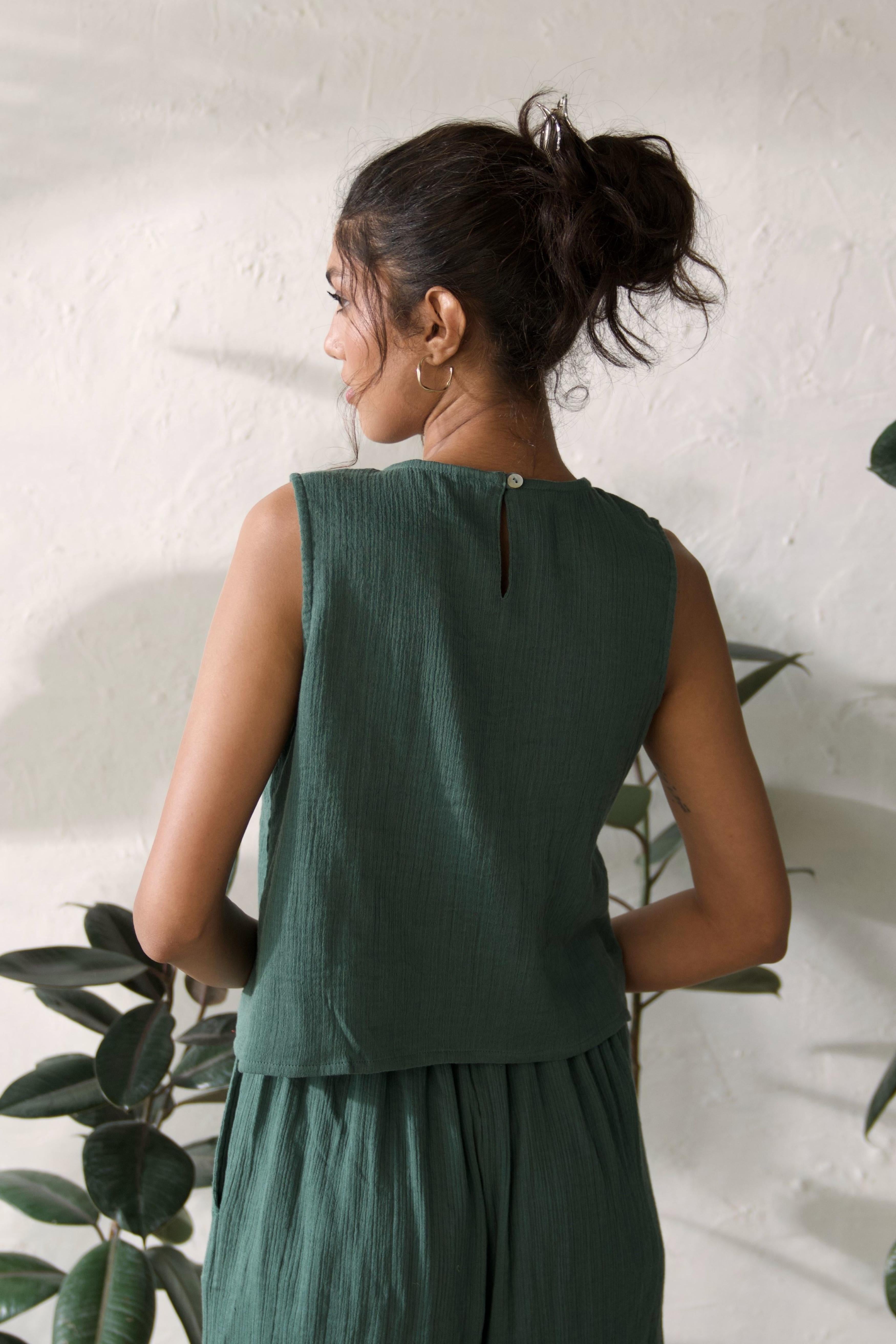 Stay cool and stylish with our sleeveless top in a serene Leafy Green. The color choice perfectly complements the earthy tone. With its round neckline and delicate front slit, this top strikes the perfect balance between laid-back and refined. Pair it with our matching wide-legged pants for a breezy, nature-inspired ensemble that’s perfect for your next outing.