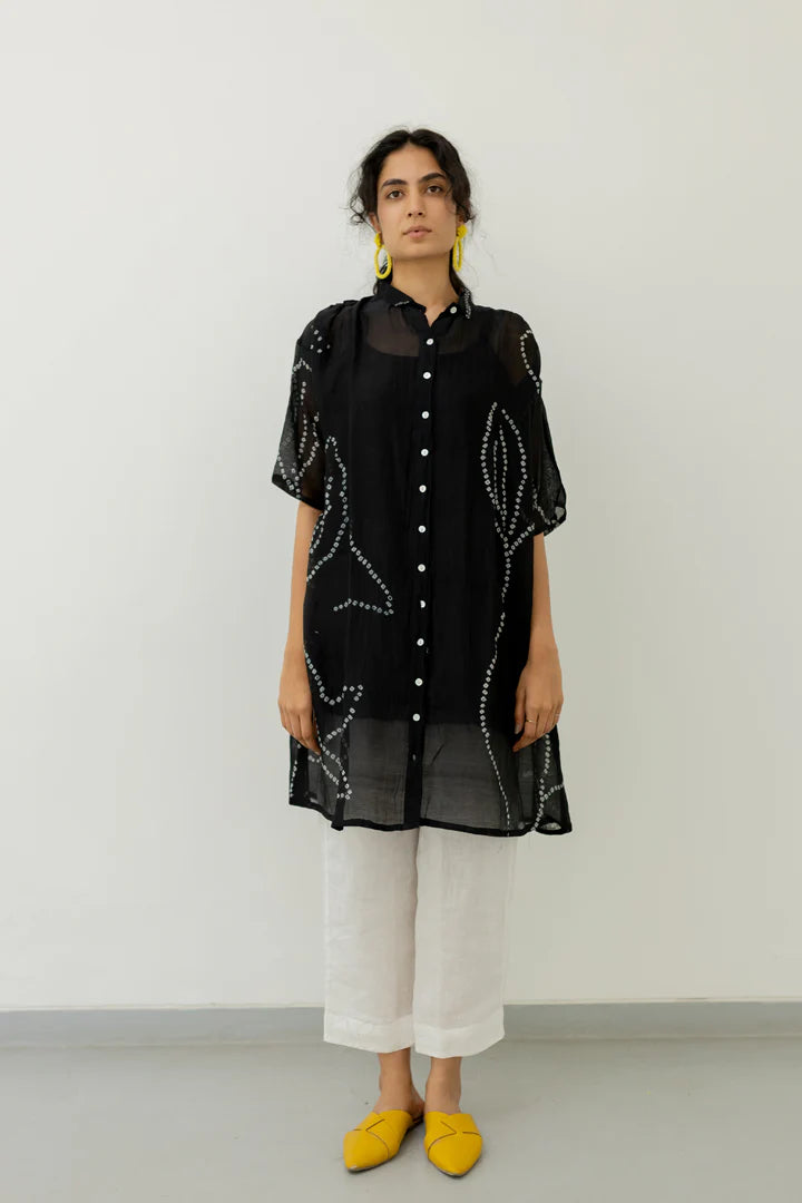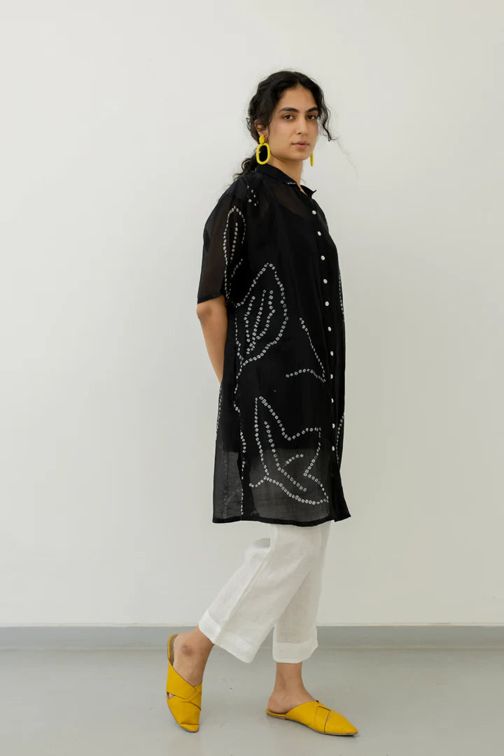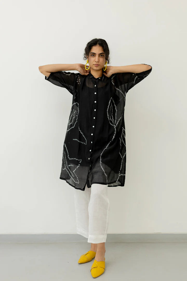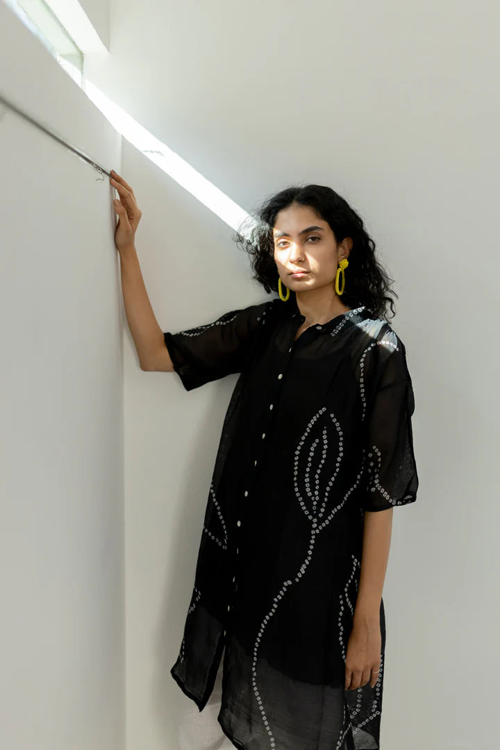 Black bandhani tunic with slip - set of 2 Button down A line shirt dress Gathers details at sleeve Comes with same coloured slip Dyed with artisanal bandhani technique Dress Length - 38"