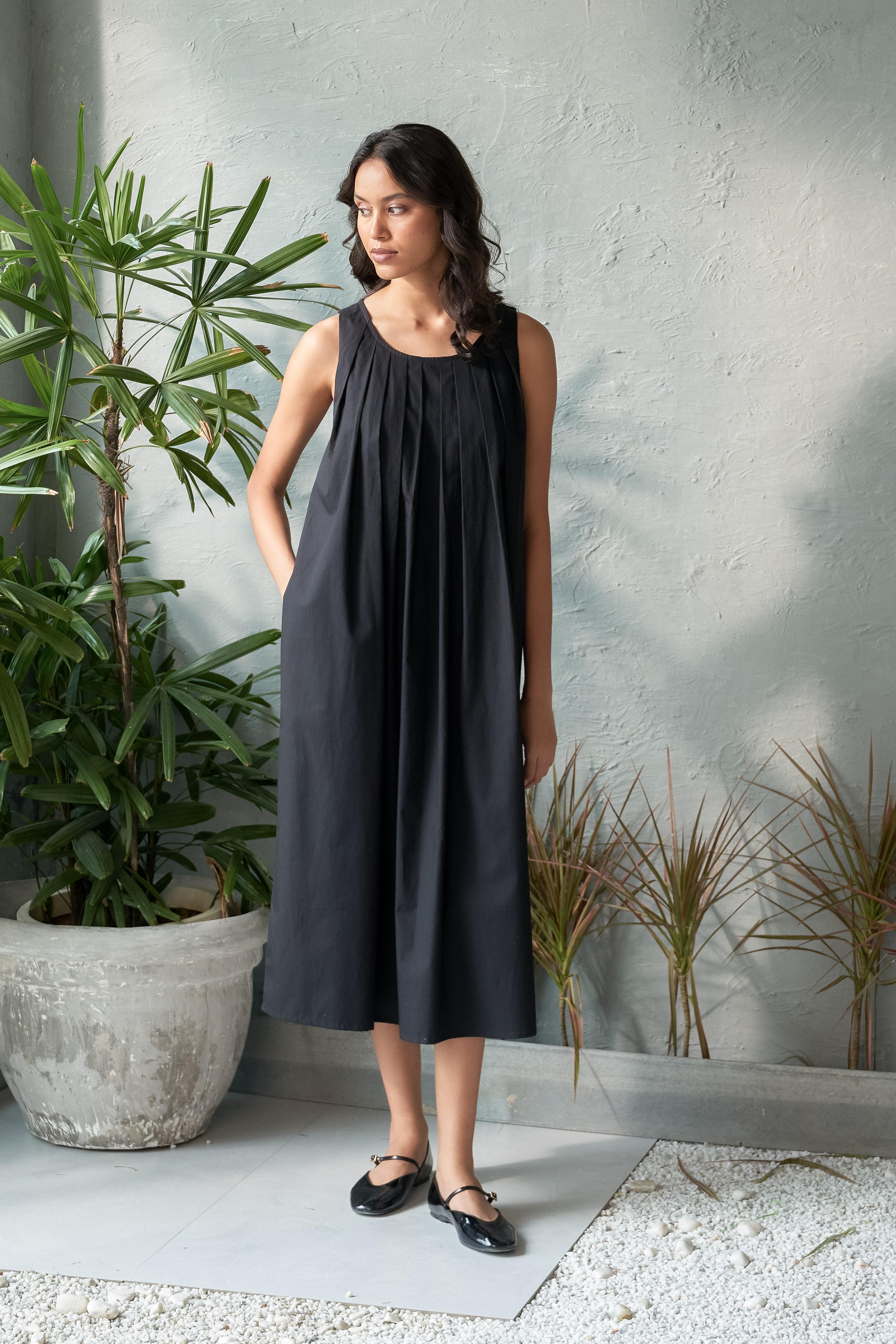 Refresh your wardrobe with our sleek black midi dress, featuring a U scoop neckline and sharp box pleats that bring structure and sophistication to the design. The overlapping back panel, complete with a subtle keyhole detail, adds a modern edge and a hint of allure. Made from premium fabric, this dress drapes effortlessly to a flattering midi length, making it an ideal choice for any occasion. Whether you're attending a formal gathering or stepping out for a chic evening, this dress combines classic elegance with contemporary flair.