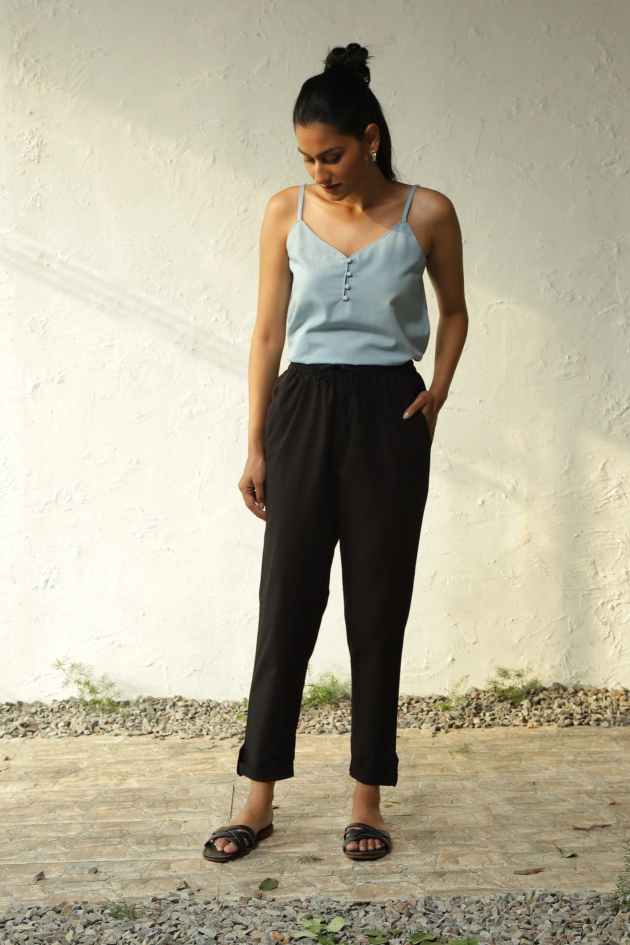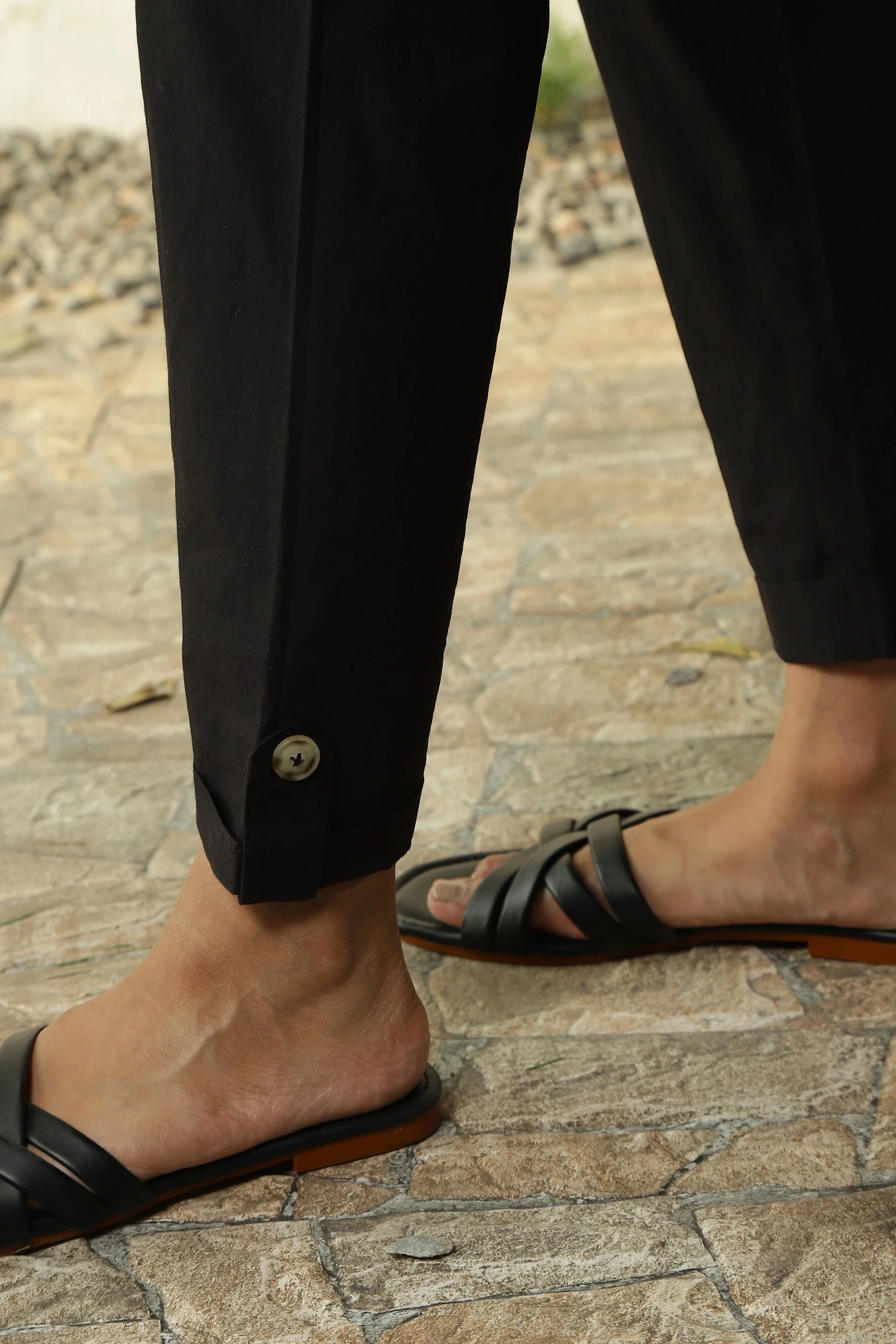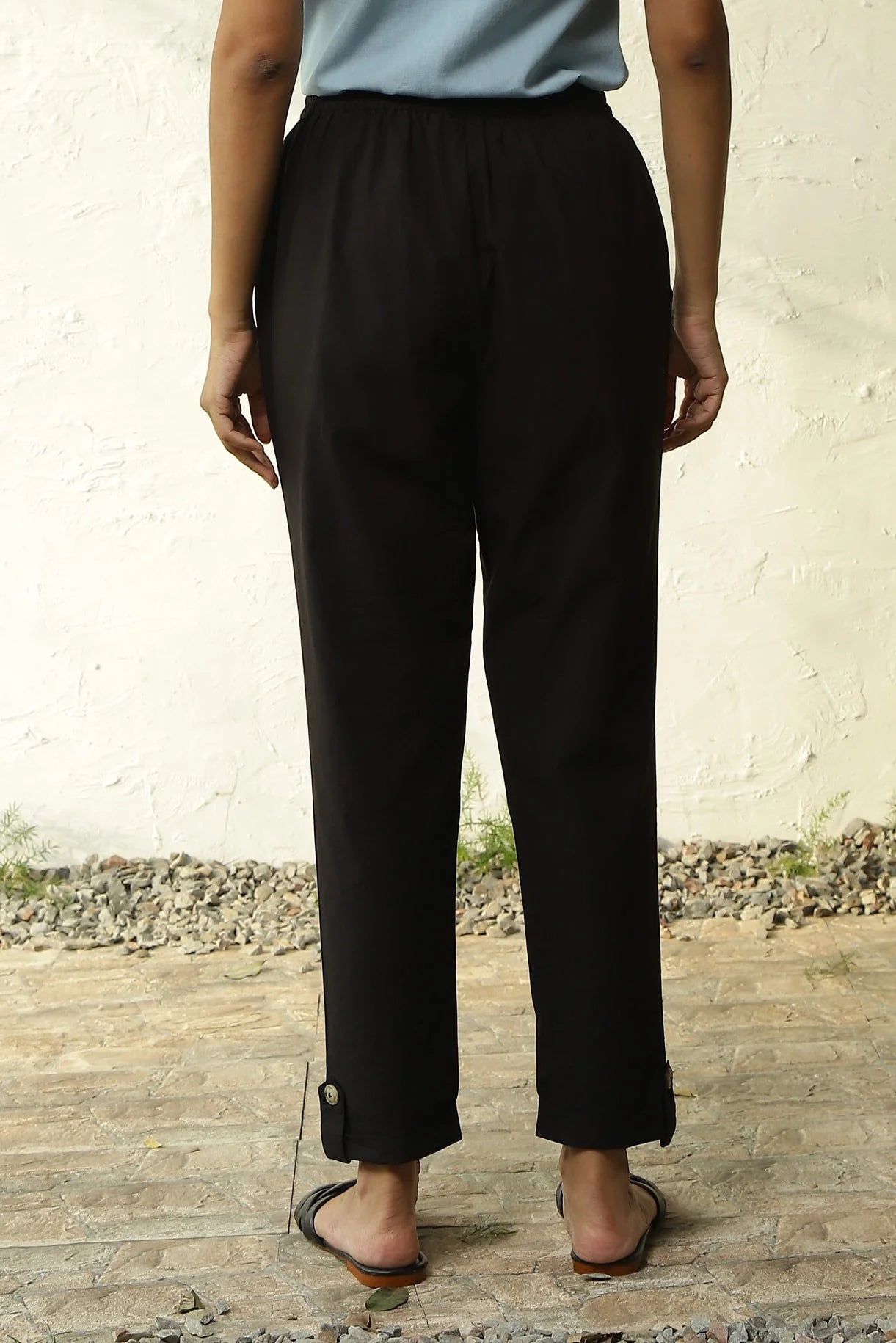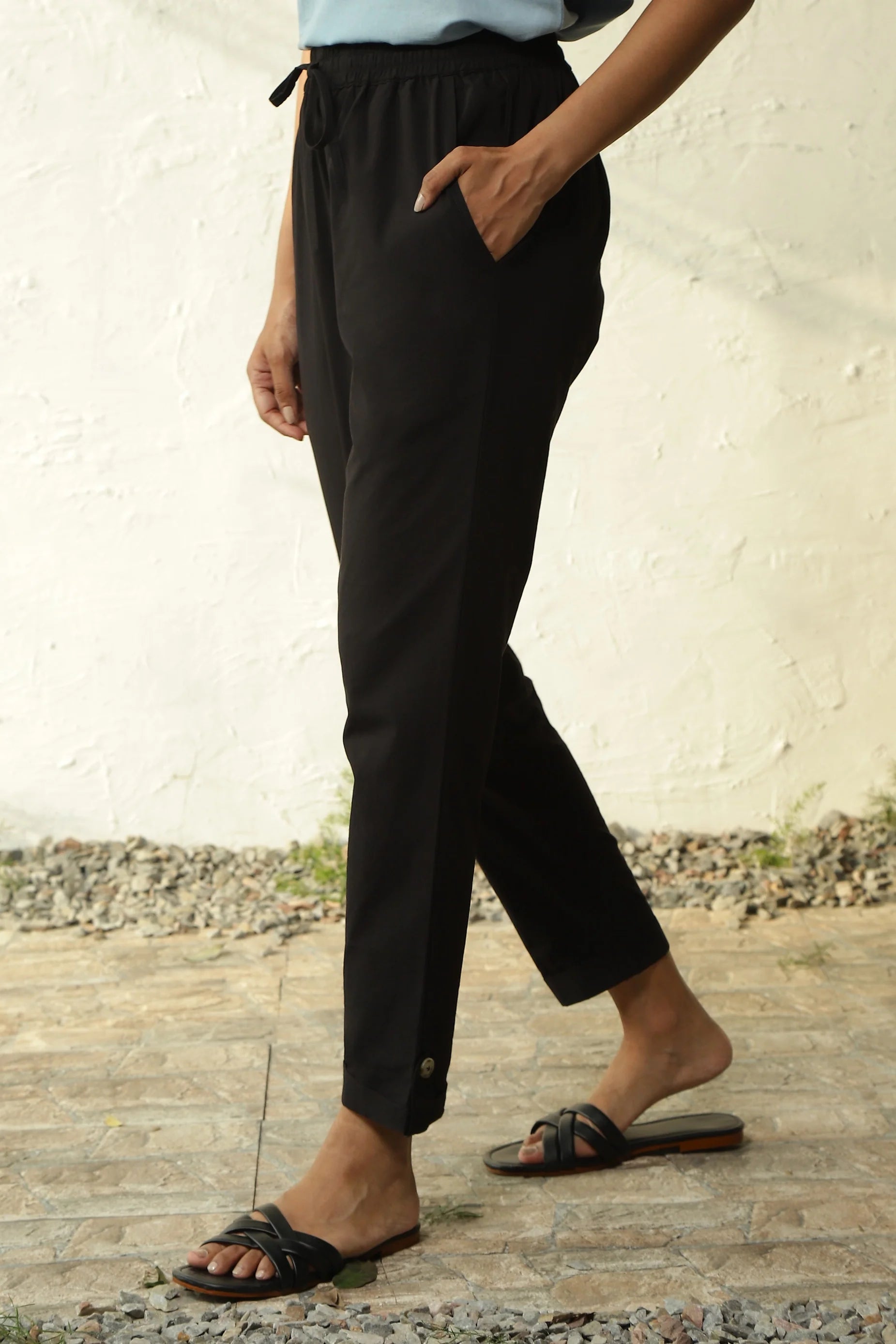 Comfort and style in our black poplin cotton narrow pants. The relaxed-fit elasticated bottoms, equipped with a drawstring and side pockets, promise unmatched comfort. A subtle touch of flair is added by the small buttoned loop on the bottom fold.