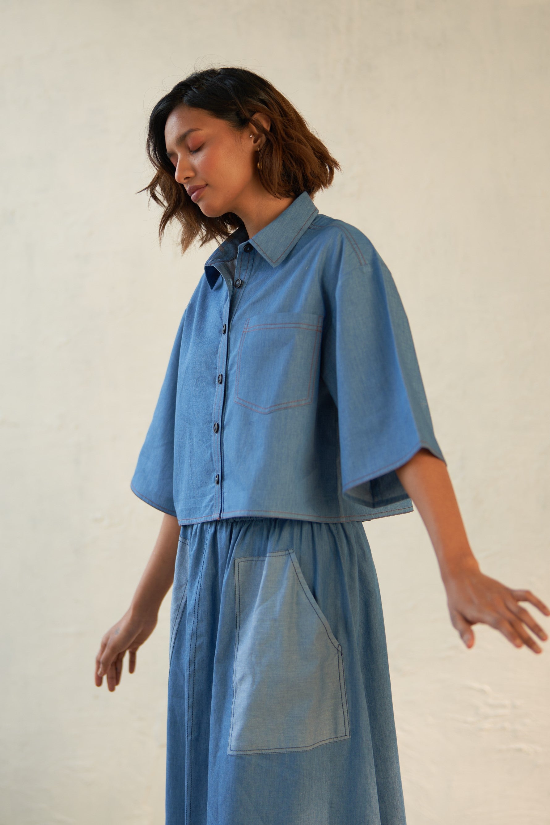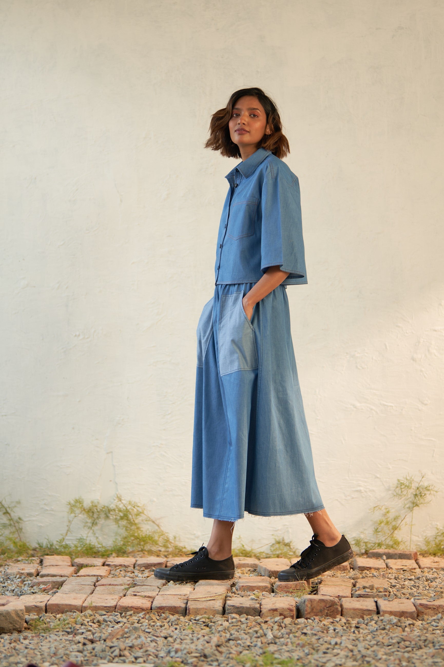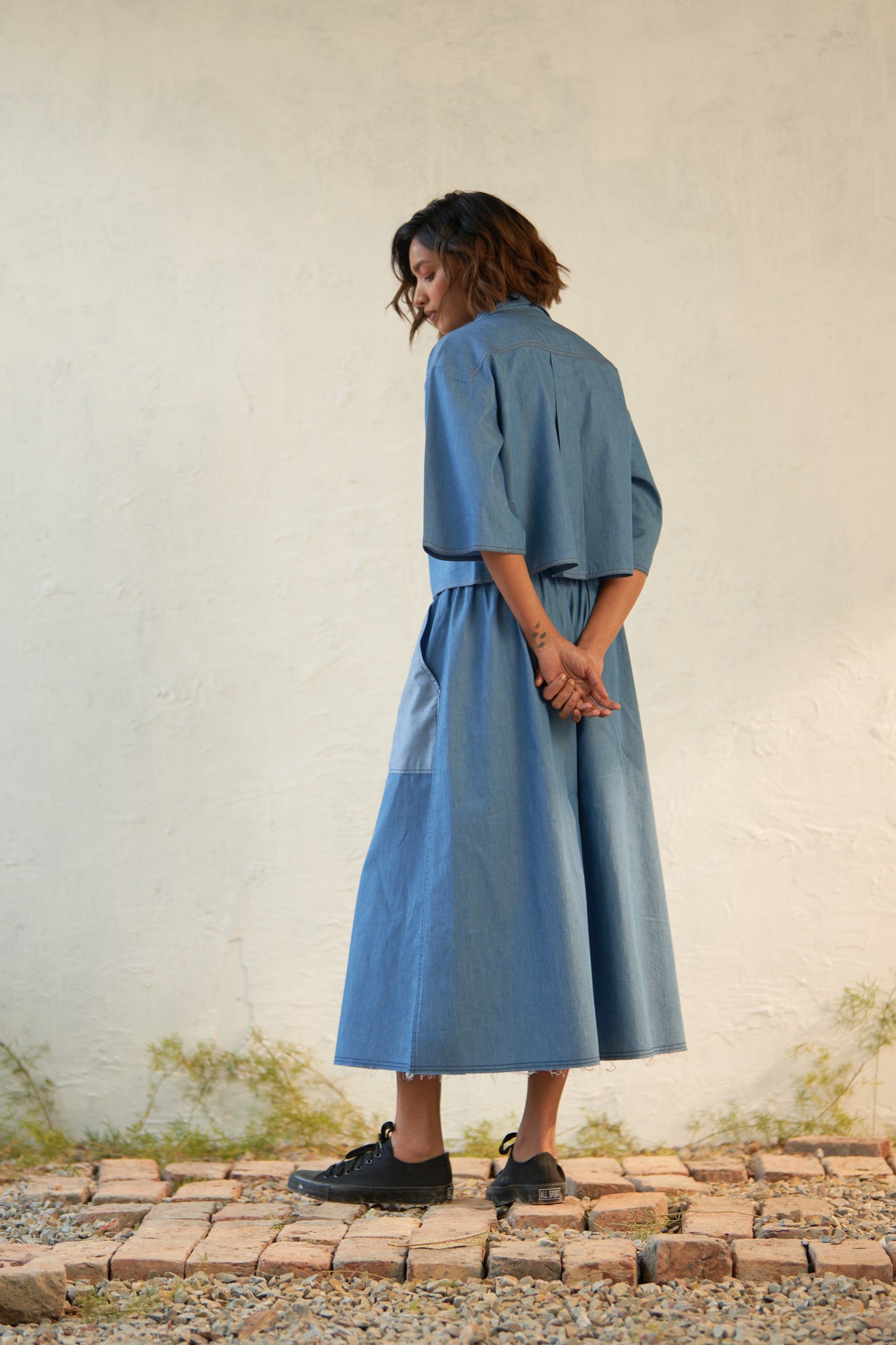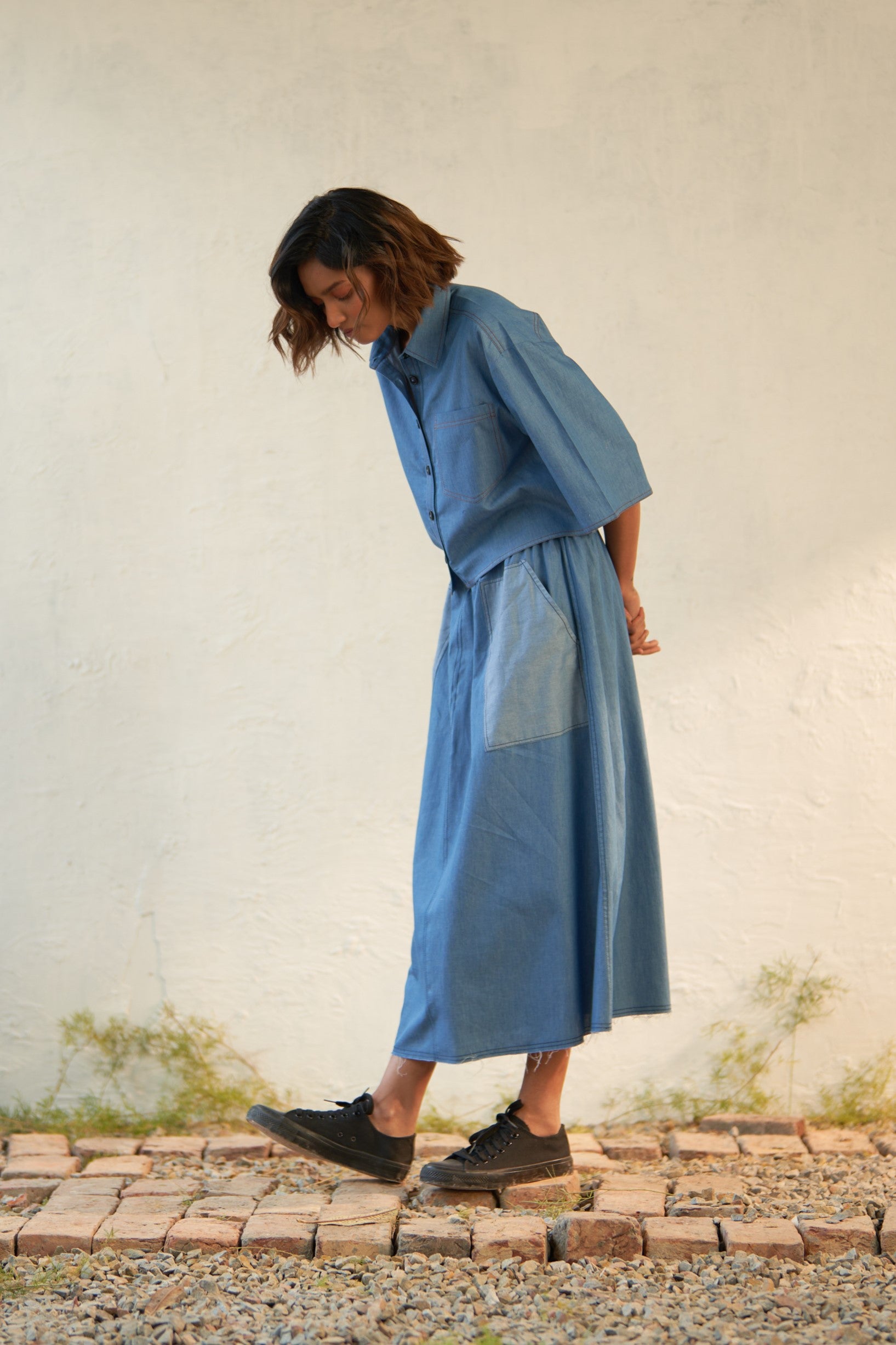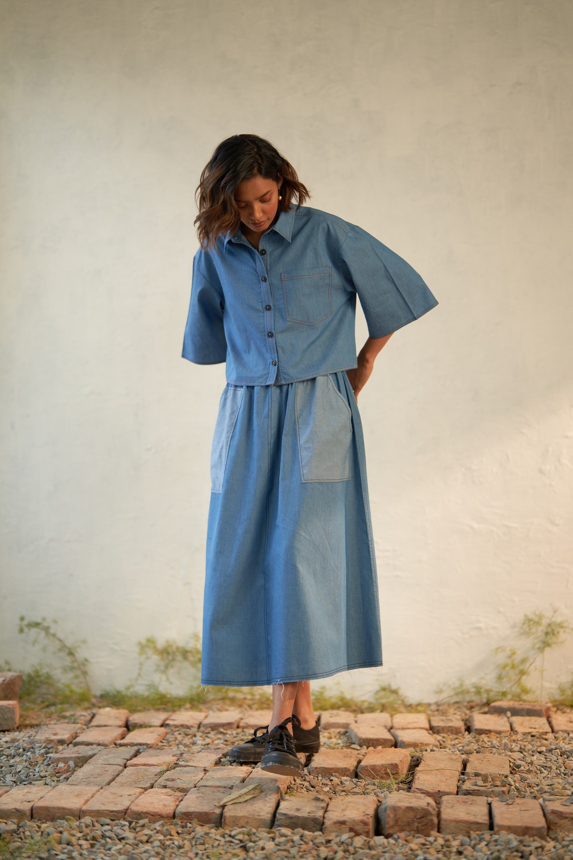 The rugged charm of denim with our shirt and skirt set, tailored for a rider's vibe. The shirt, in a boxy profile, is adorned with patch pockets and bold black buttons, exuding a touch of rugged sophistication. Paired seamlessly with our maxi skirt, featuring an elasticated waistline for comfort and ease. The double-sided patch pocket with delicate thread detailing adds a hint of uniqueness, while the fringed hem completes the look with a playful twist.