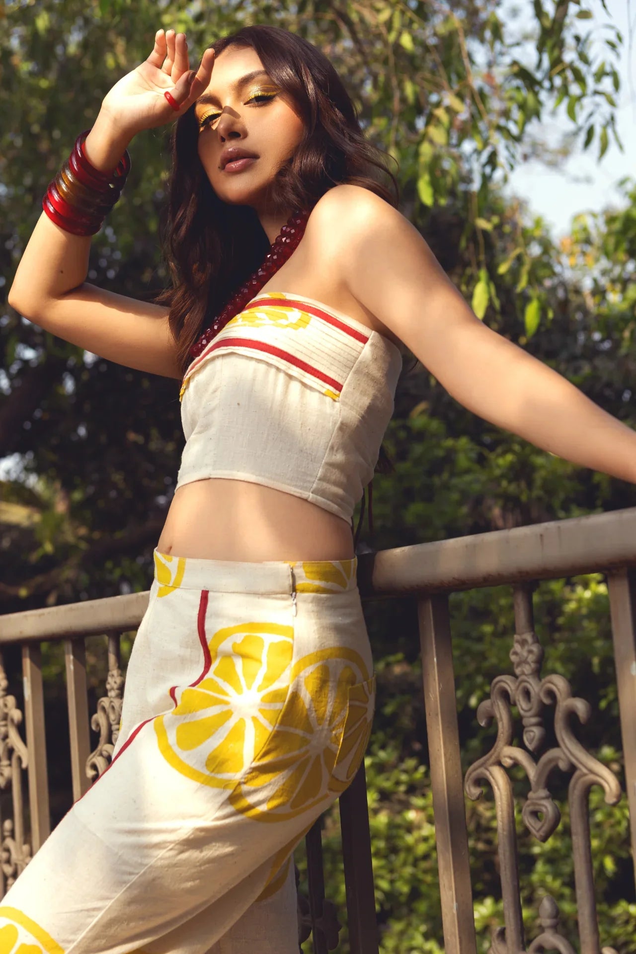 The Limoncello pants are adorned with cheerful lemon prints and vibrant red stripes on the front, complemented by lemon embroidery details on the back pockets, offering both playfulness and sophistication. A handy side pocket adds convenience to this delightful and whimsical ensemble.