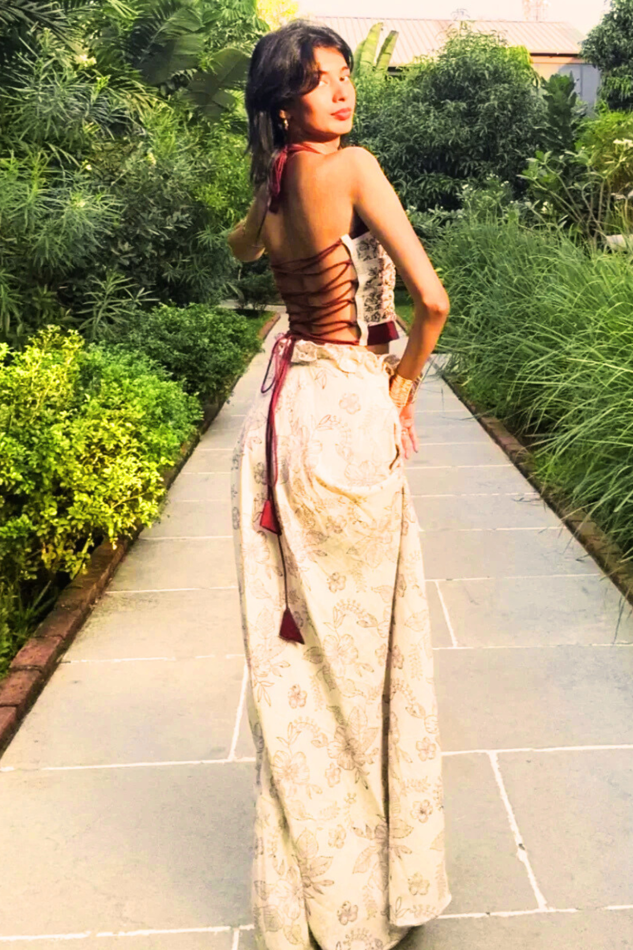 The Scarlet features a hibiscus print long-length skirt with a flowy design that includes a side zipper and a convenient pocket. Charming frill details on the waistband complete the look with whimsical elegance.