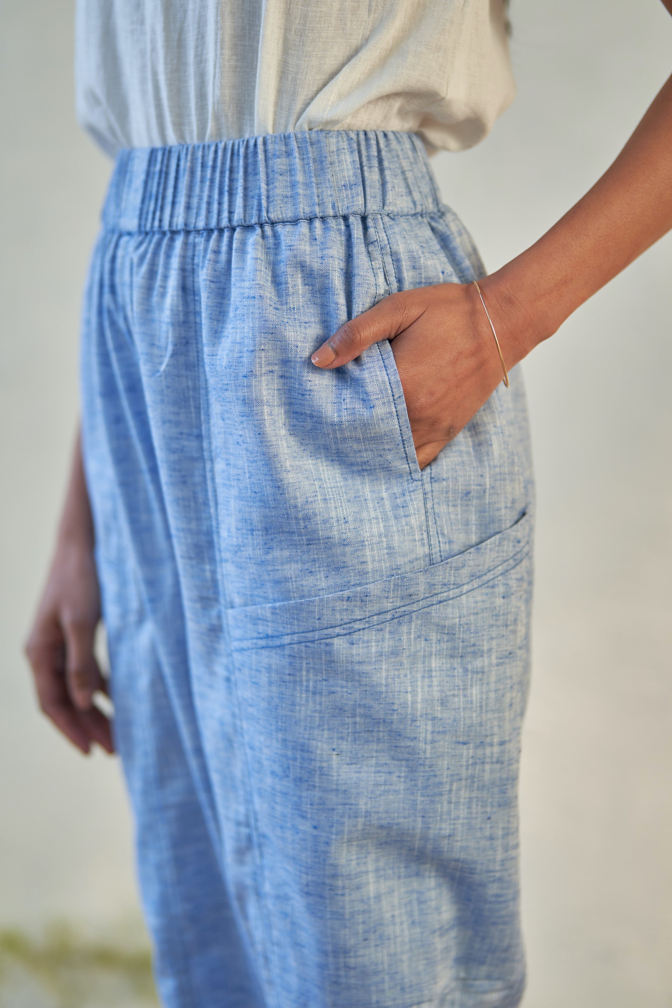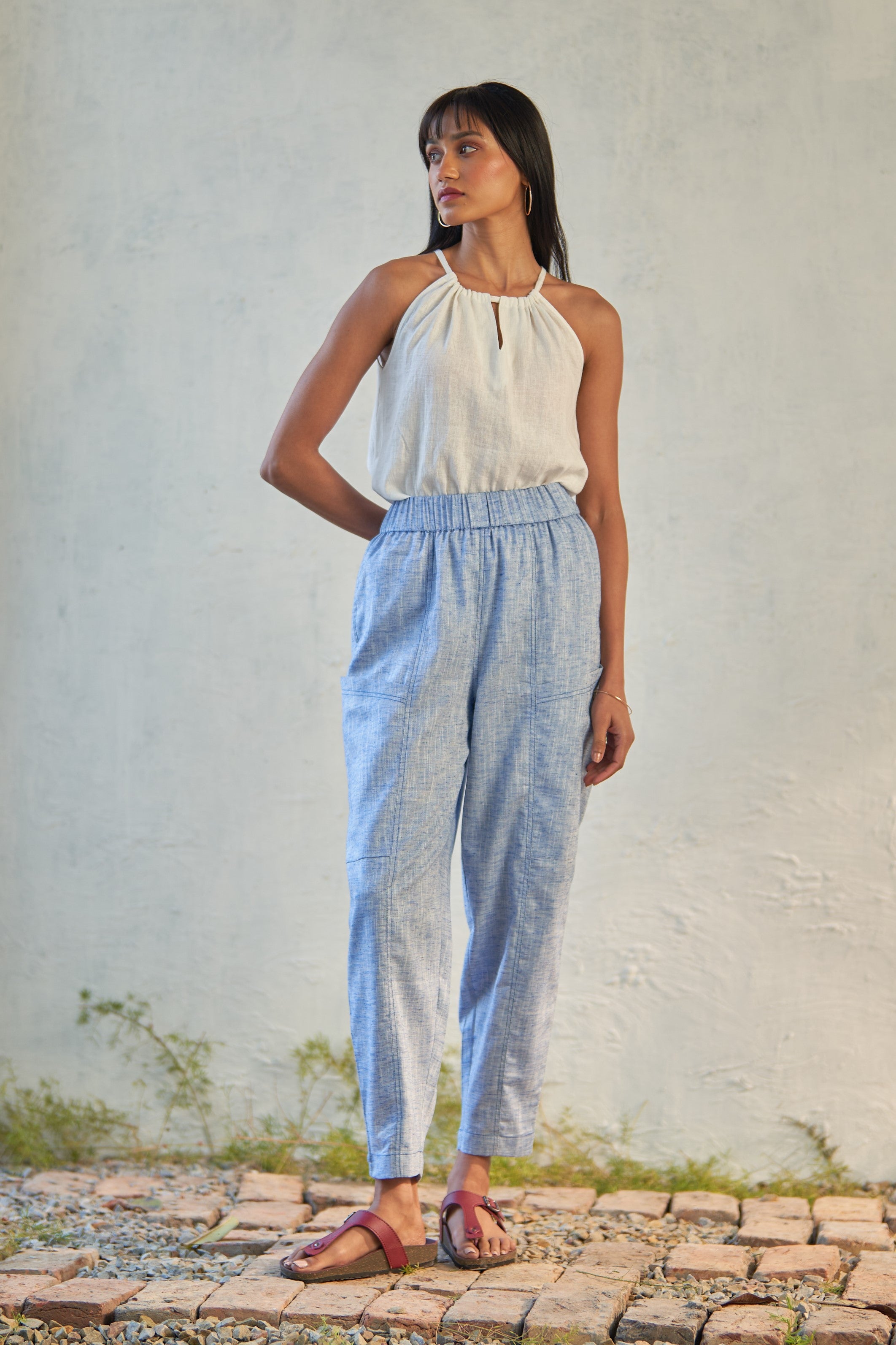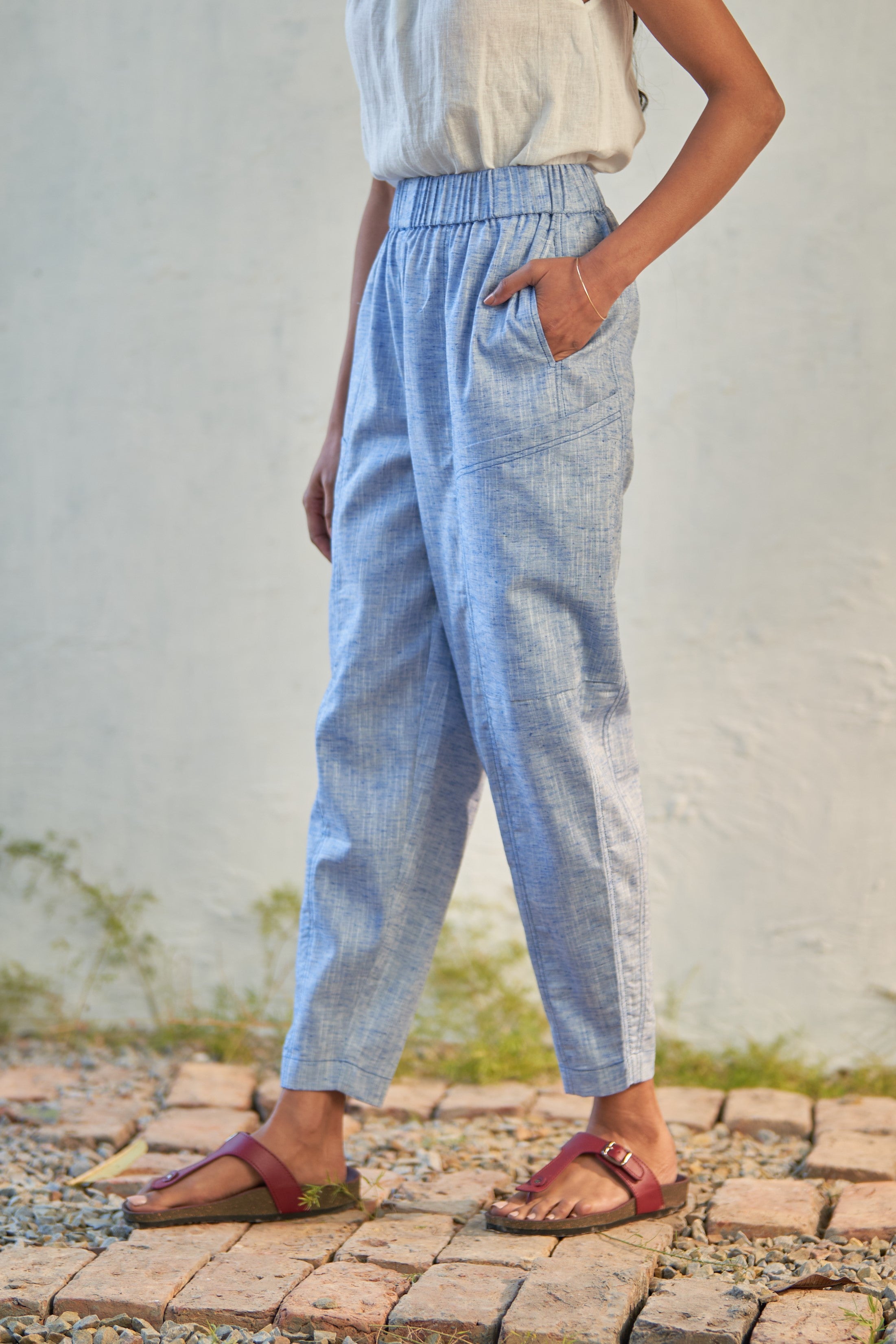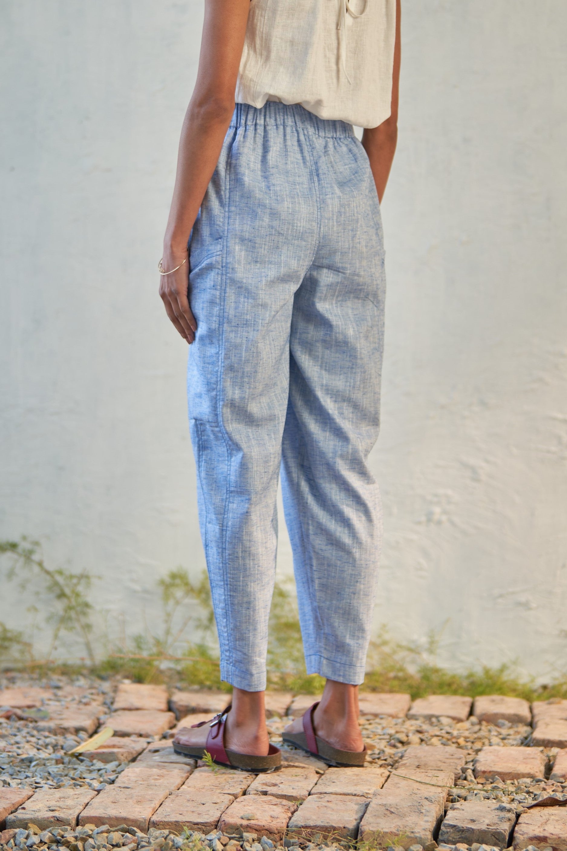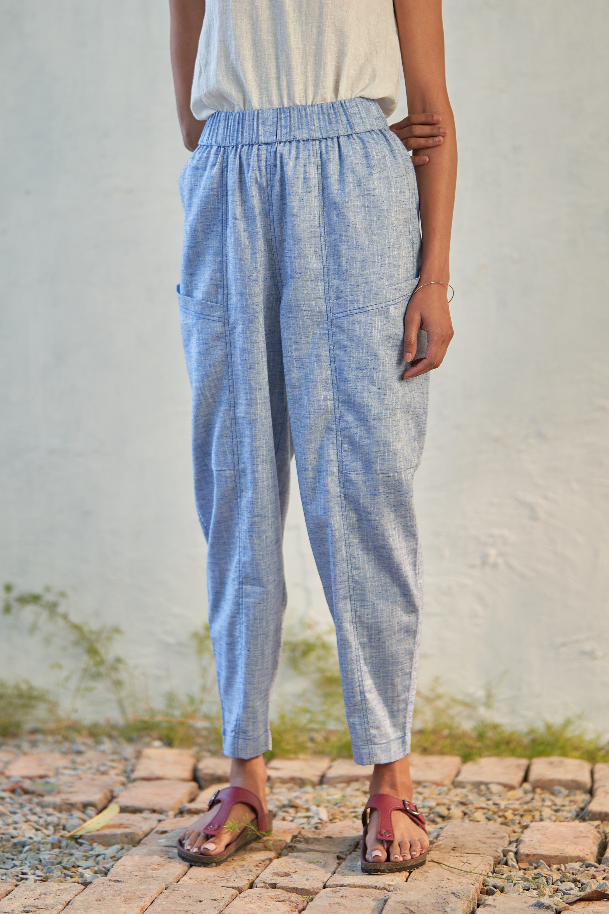 These modern pants will add a directional touch to your casual looks. Crafted textured cotton in a soothing blue hue, they taper down the legs and are designed with ankle-length hems, perfect for highlighting your sandals or loafers. These carrot pants are ideal for long travel hauls, ensuring both style and comfort on your journey.