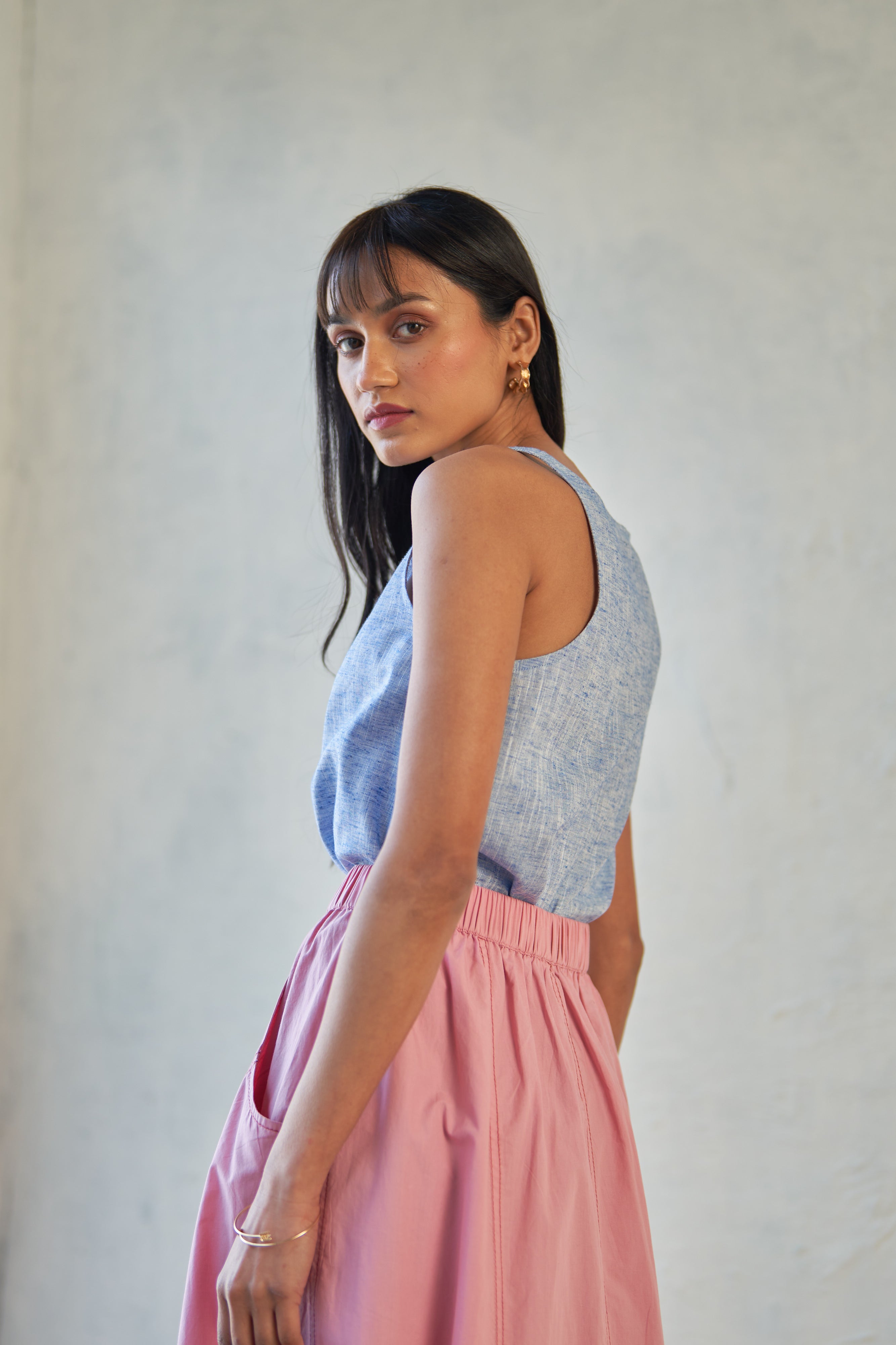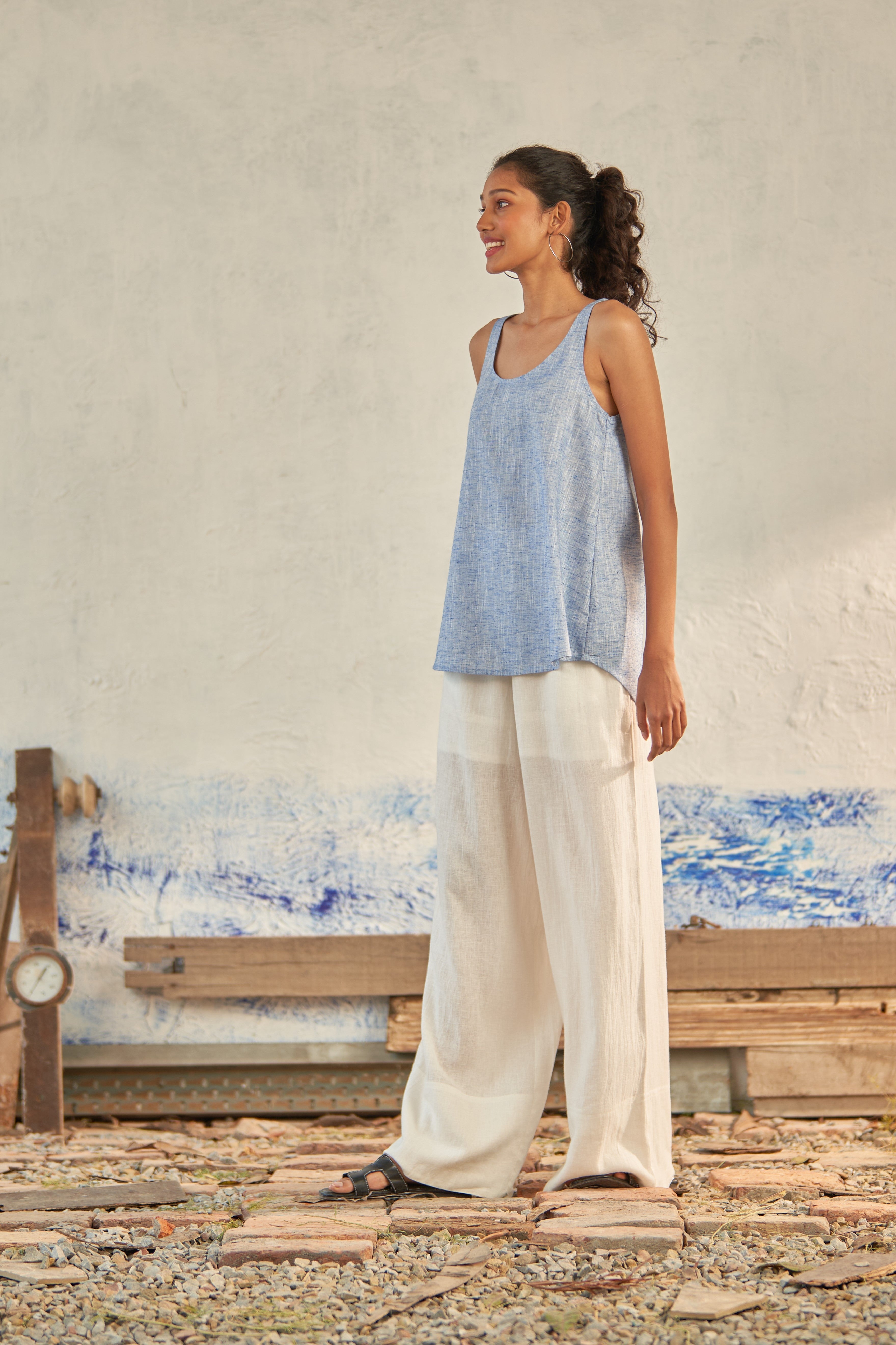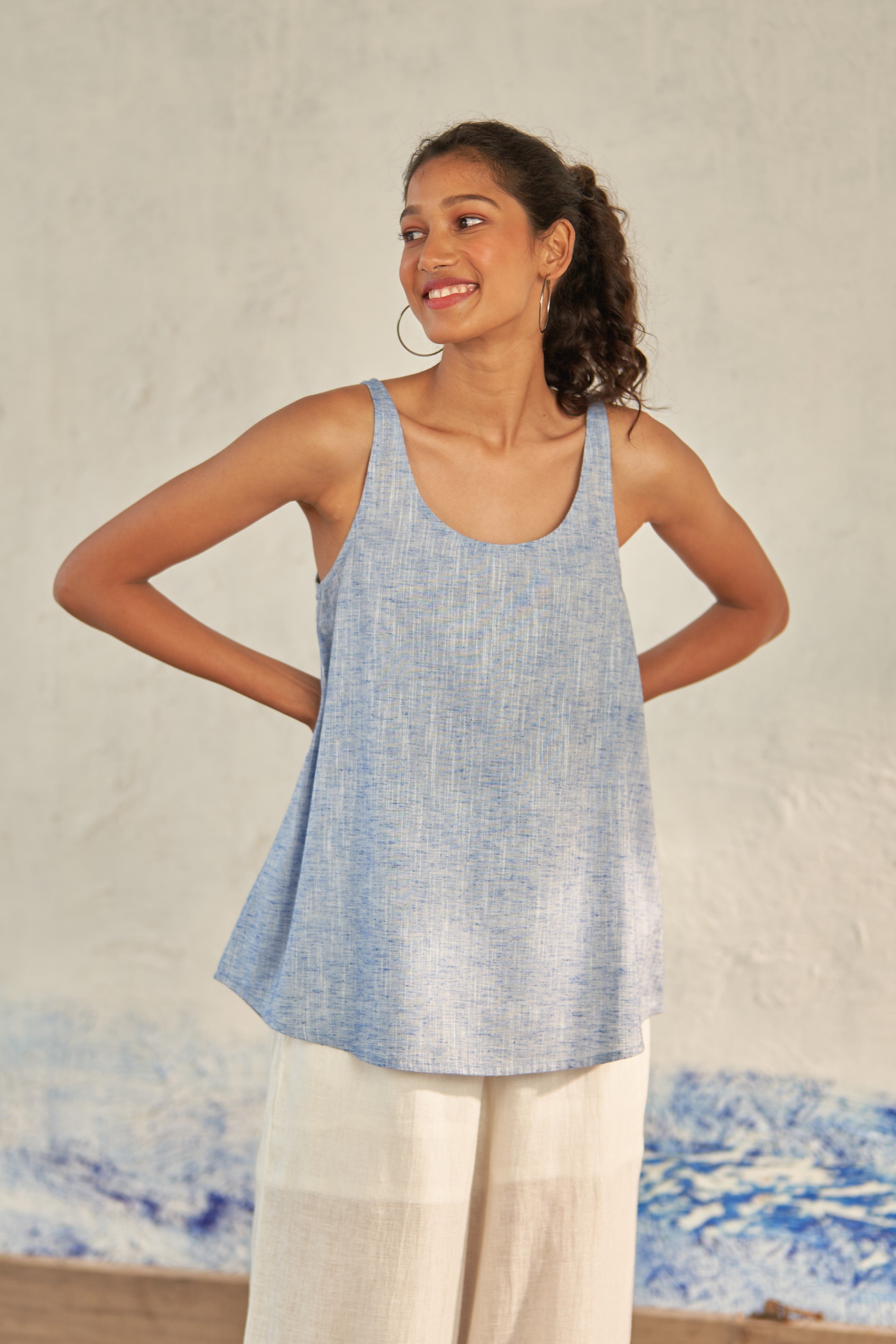 In beautiful blue textured cotton, this tank top becomes your go-to wear for any and all outings. Its effortlessly chic A-line silhouette and versatile design ensure it's the perfect choice. With its timeless style and comfortable fit, this tank top promises both ease and elegance wherever your adventures take you.