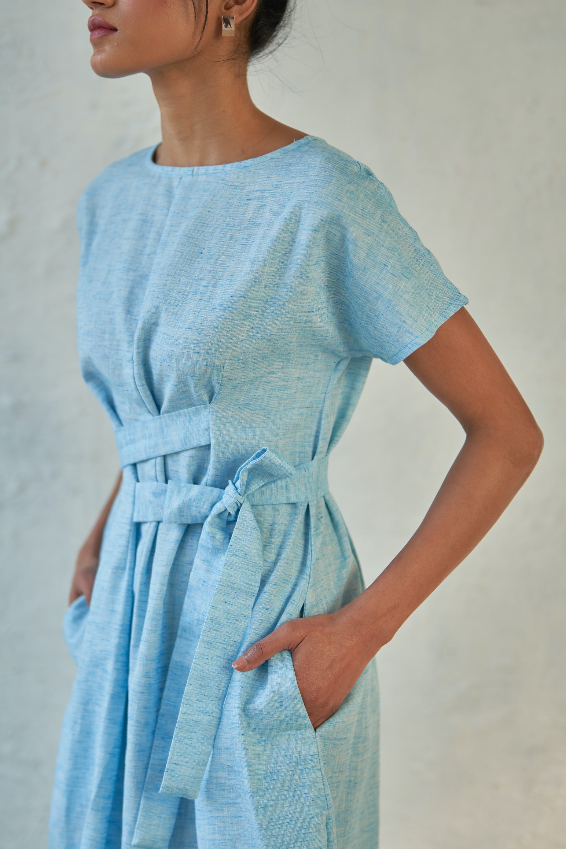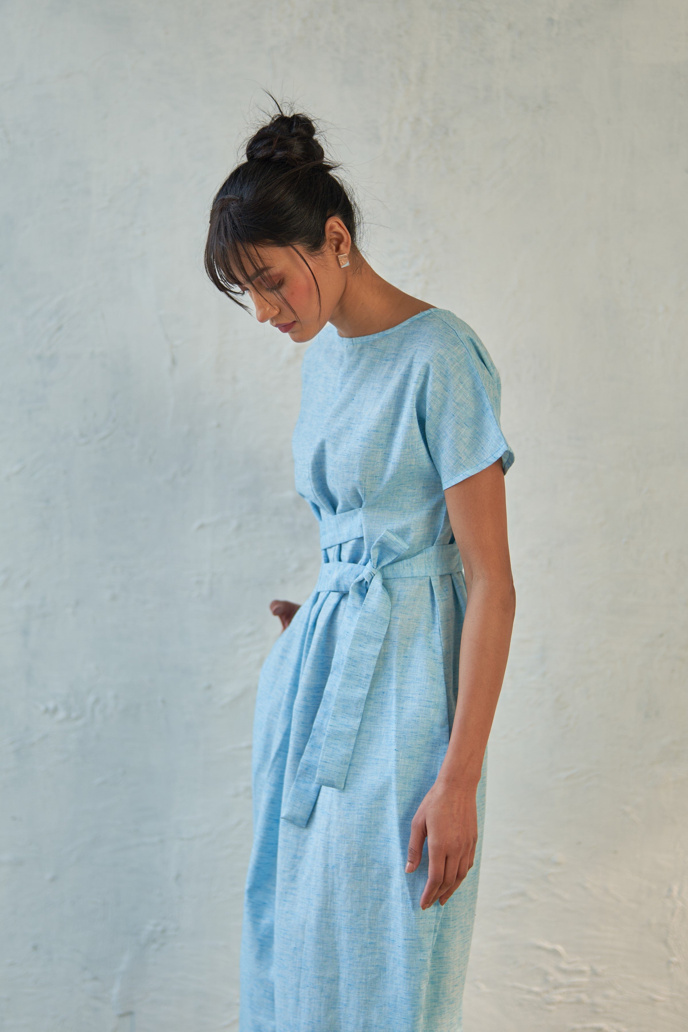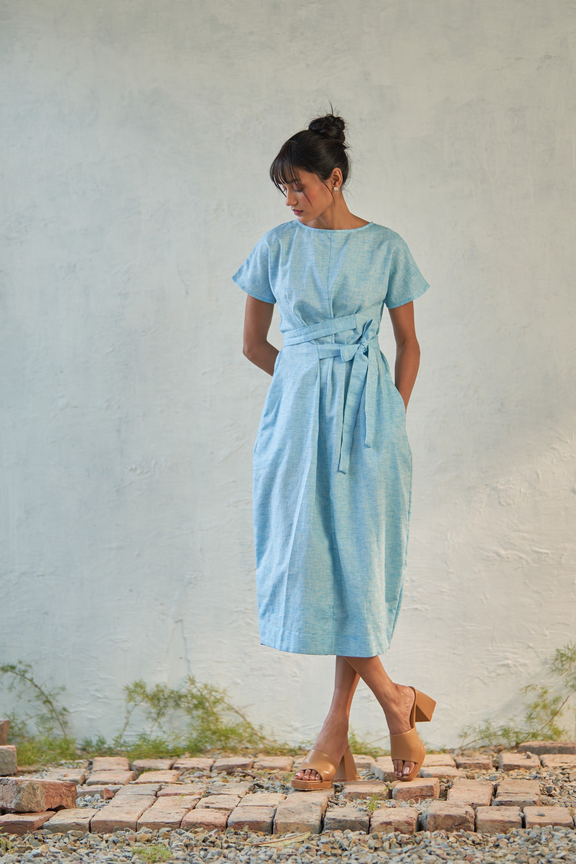 Beauty of a bluefall sky, this whimsical double-belted dress epitomizes elegance and femininity. Crafted from textured cotton, it gently drapes over the body, accentuating the waist and enhancing the wearer's silhouette with grace. The dress boasts a charming U-shaped neckline and a distinctive double-belted waistline, adding a touch of whimsy and sophistication to its enchanting design.
