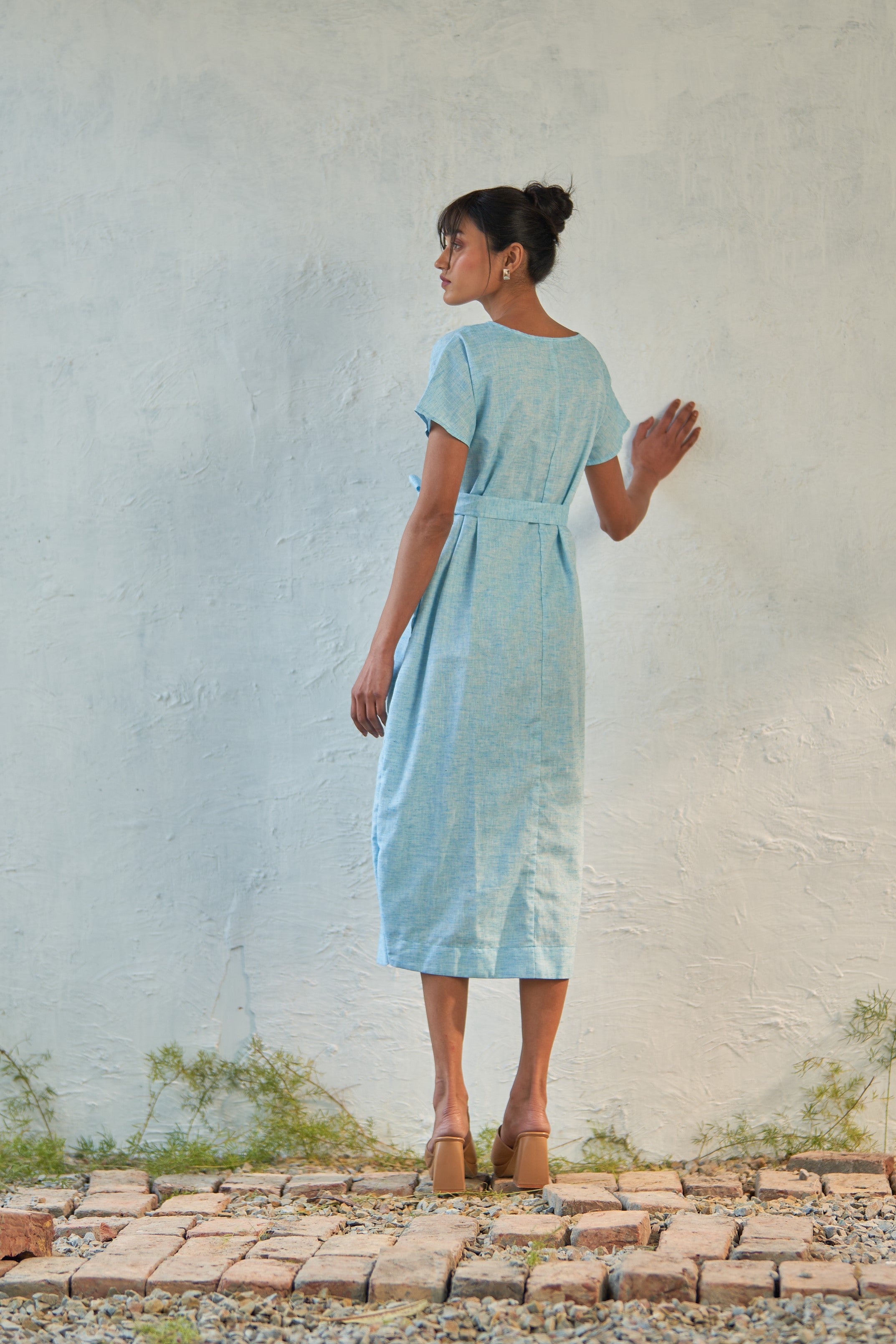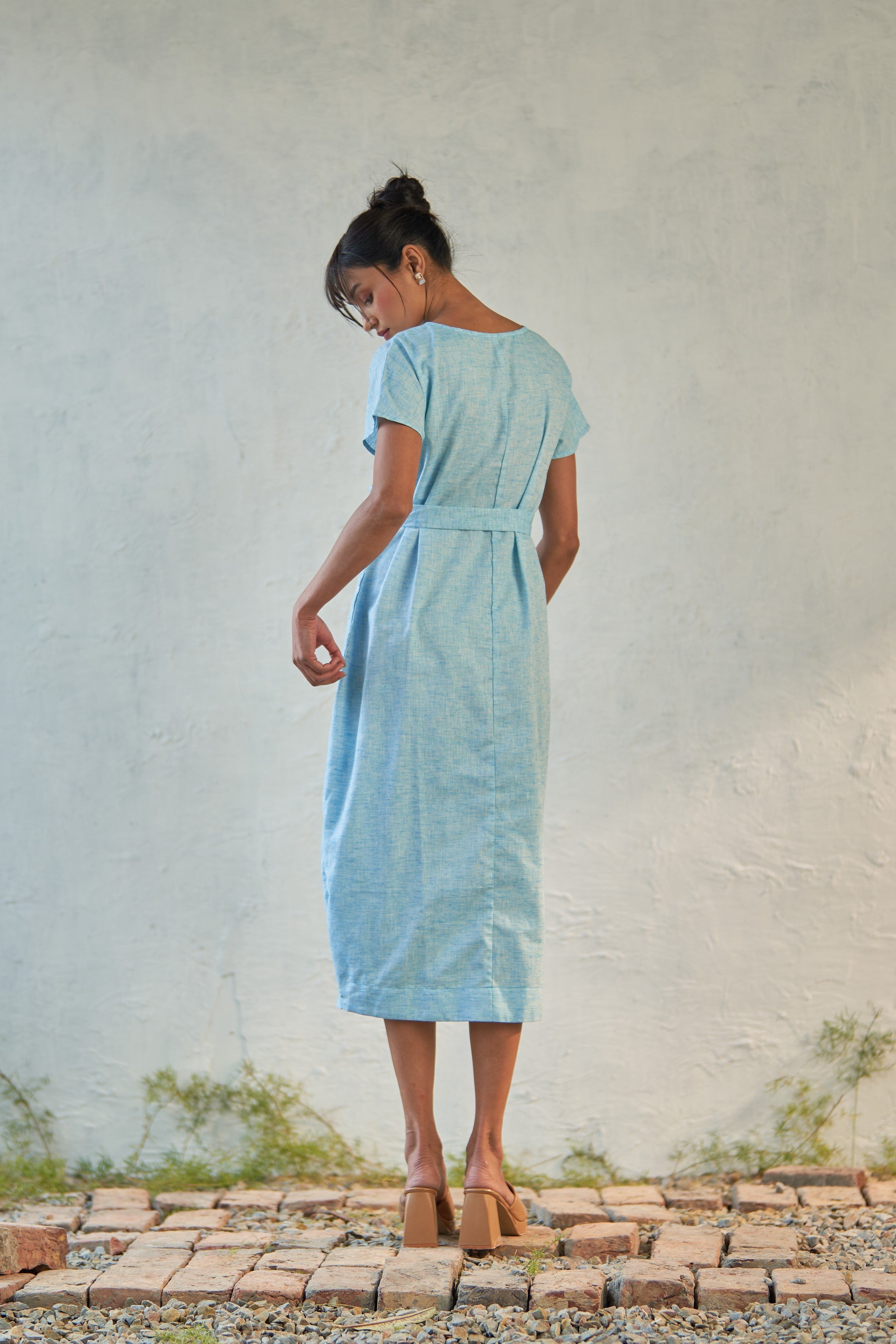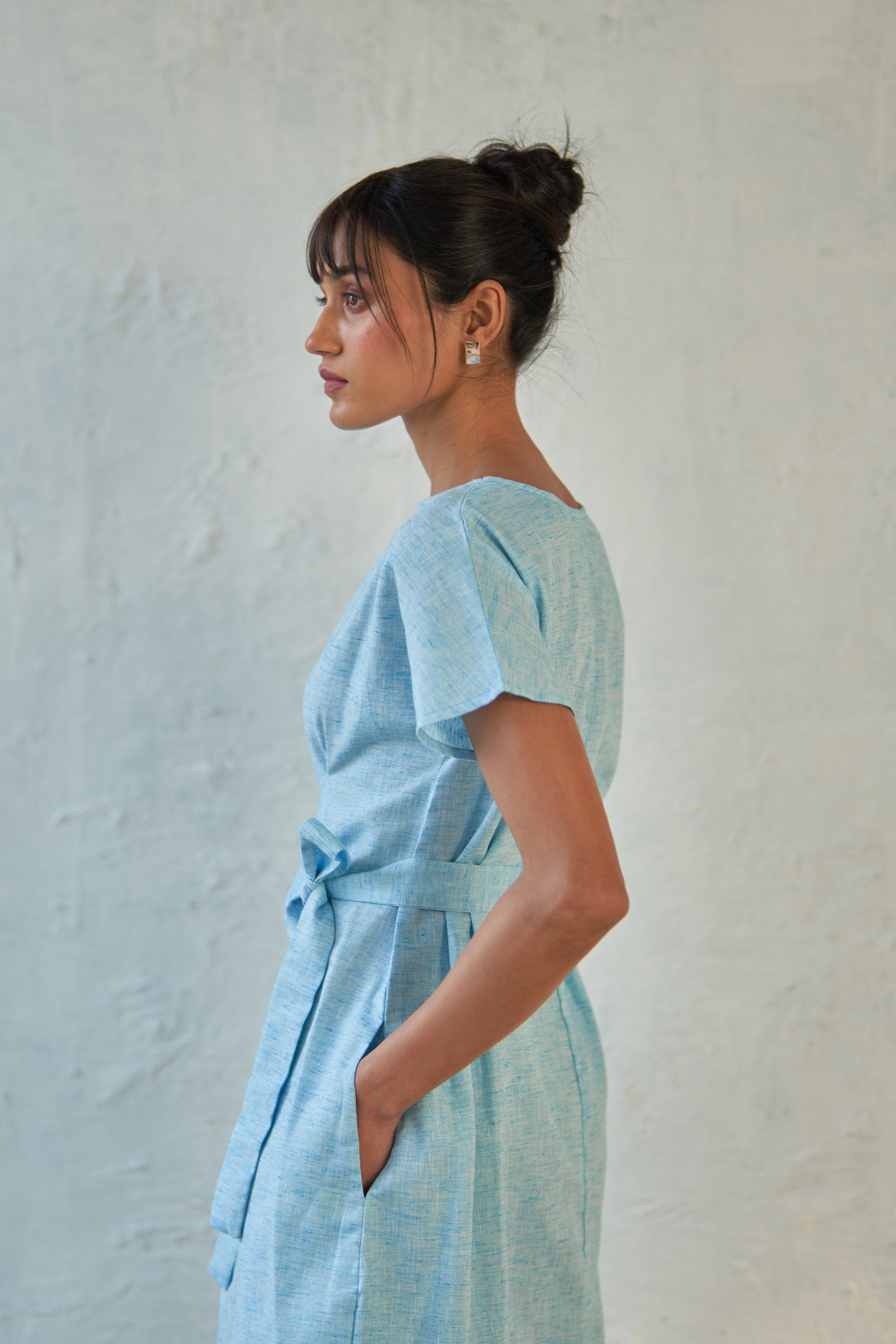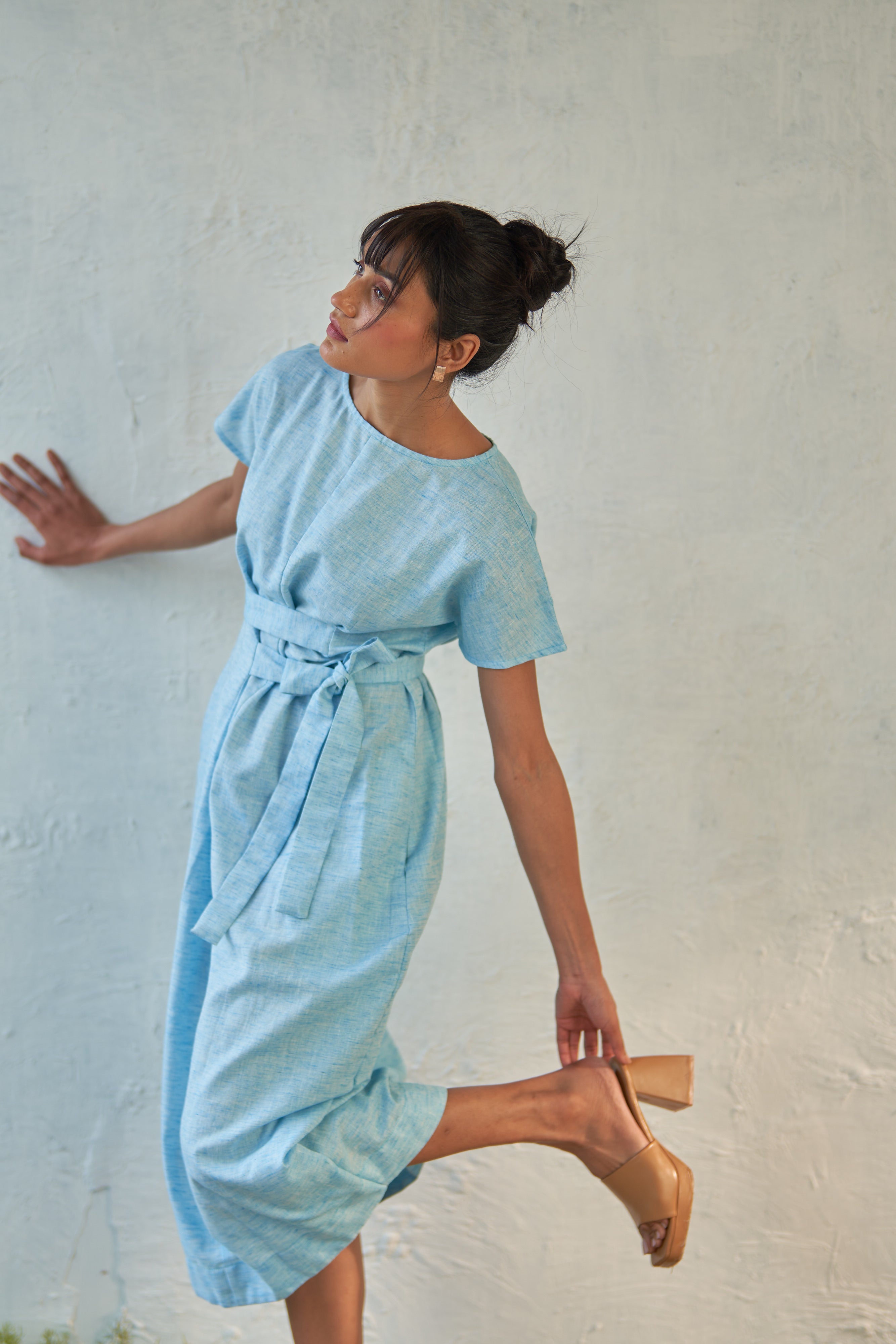 Beauty of a bluefall sky, this whimsical double-belted dress epitomizes elegance and femininity. Crafted from textured cotton, it gently drapes over the body, accentuating the waist and enhancing the wearer's silhouette with grace. The dress boasts a charming U-shaped neckline and a distinctive double-belted waistline, adding a touch of whimsy and sophistication to its enchanting design.