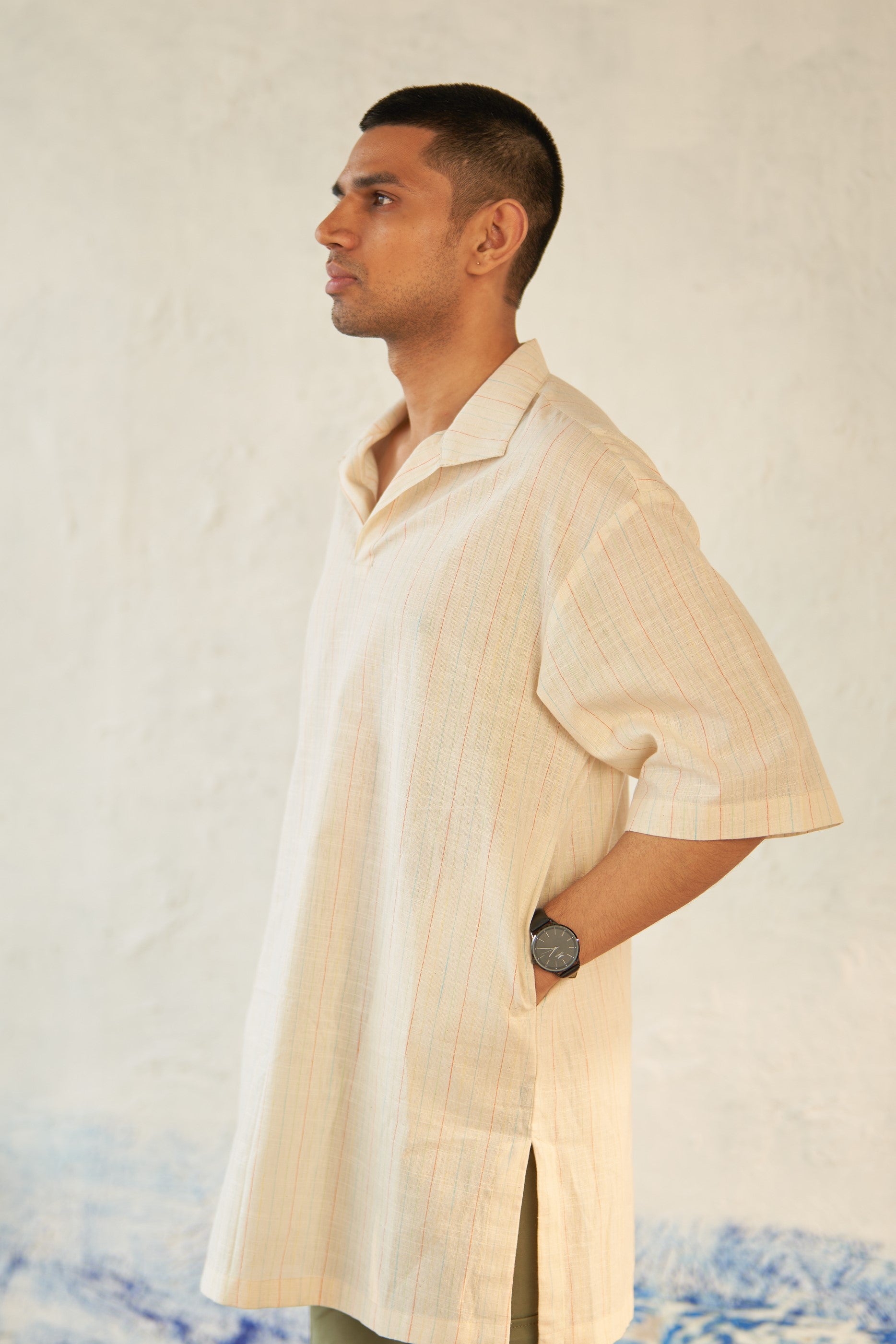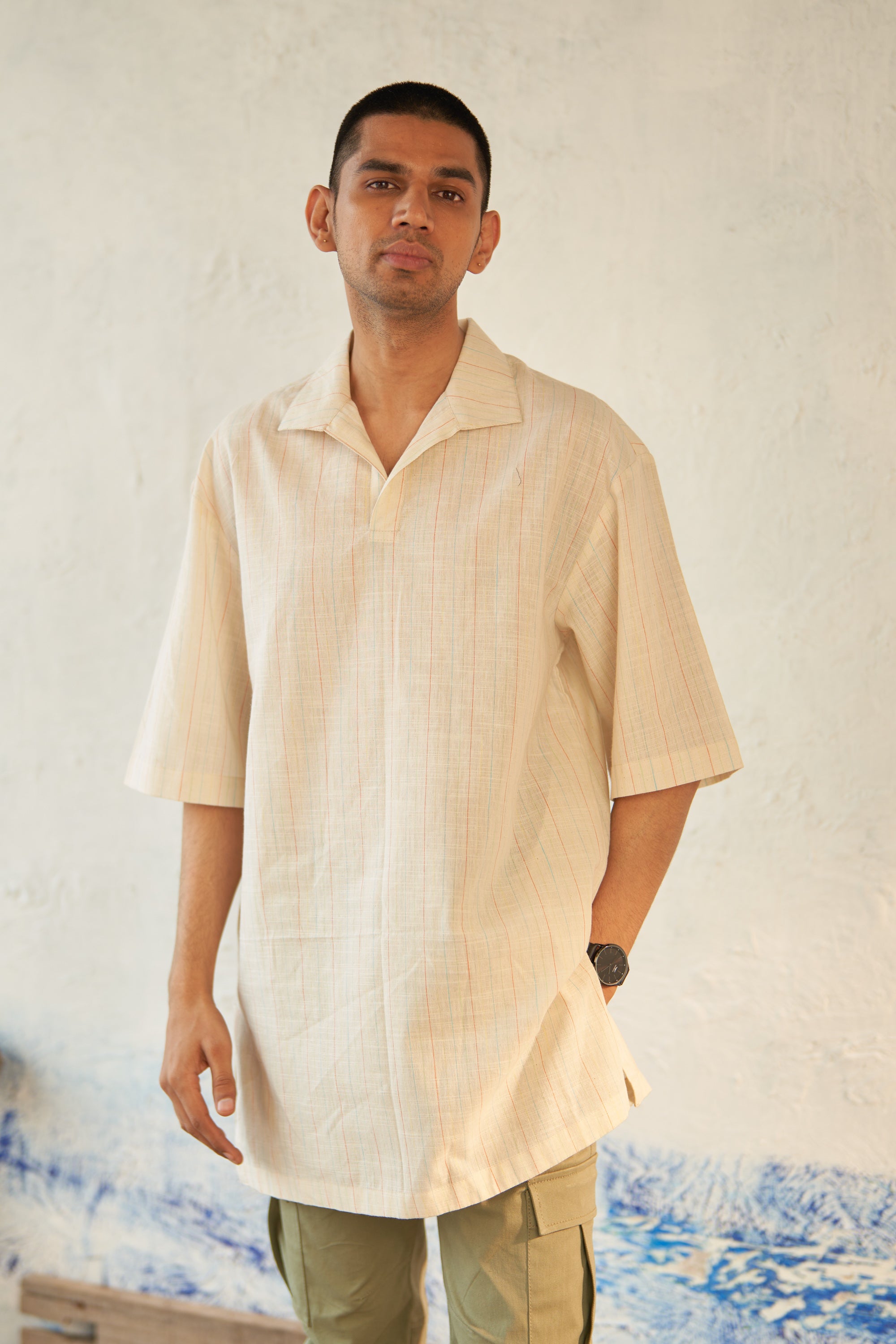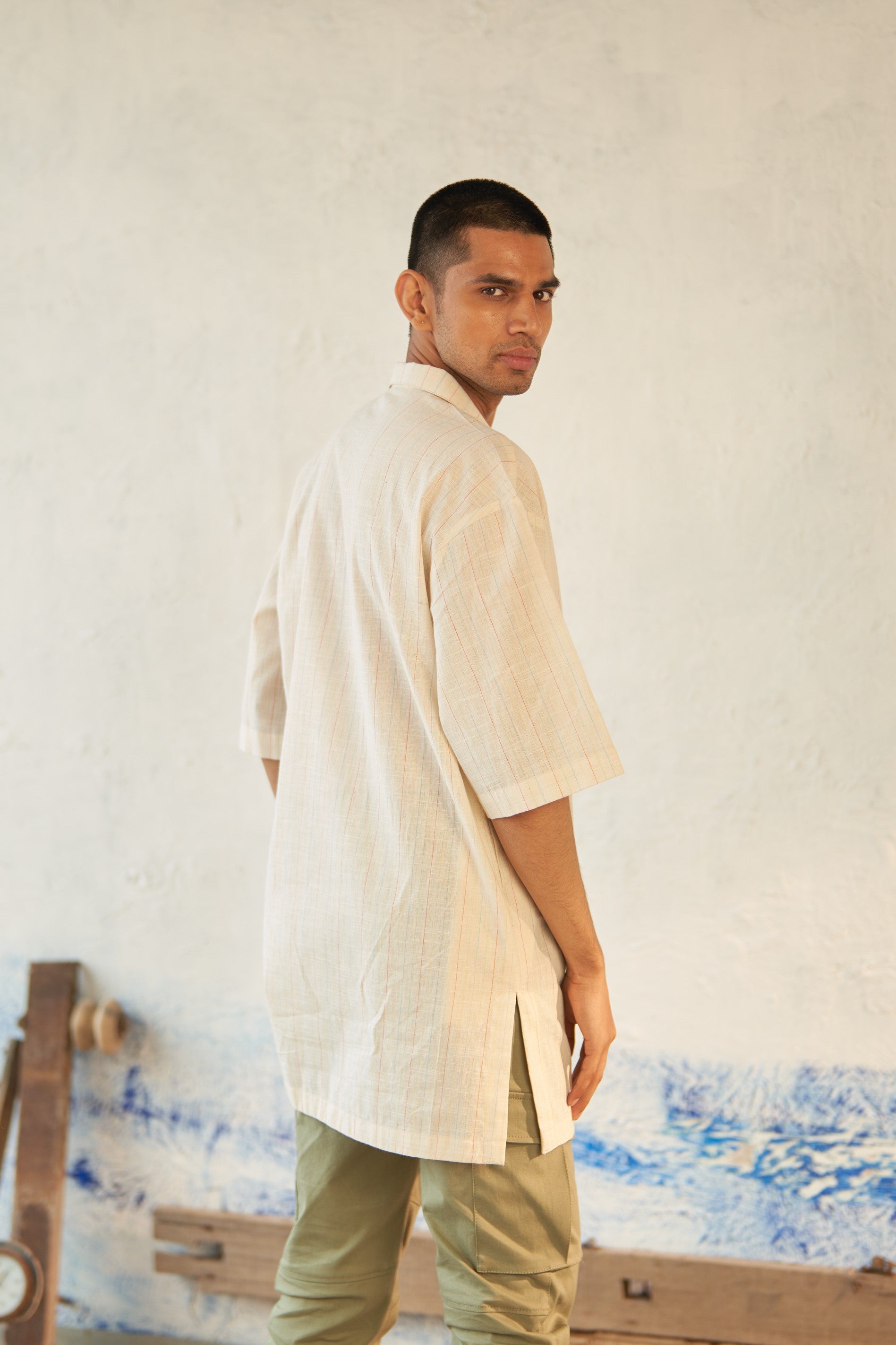 Crafted from textured cotton for a comfortable and stylish wear. This shirt is tailored in a relaxed shape, featuring an overlapping placket that creates a chic v-neck opening. The broad back yoke reflects a shirt fit, while providing enhanced comfort reminiscent of a traditional kurta.