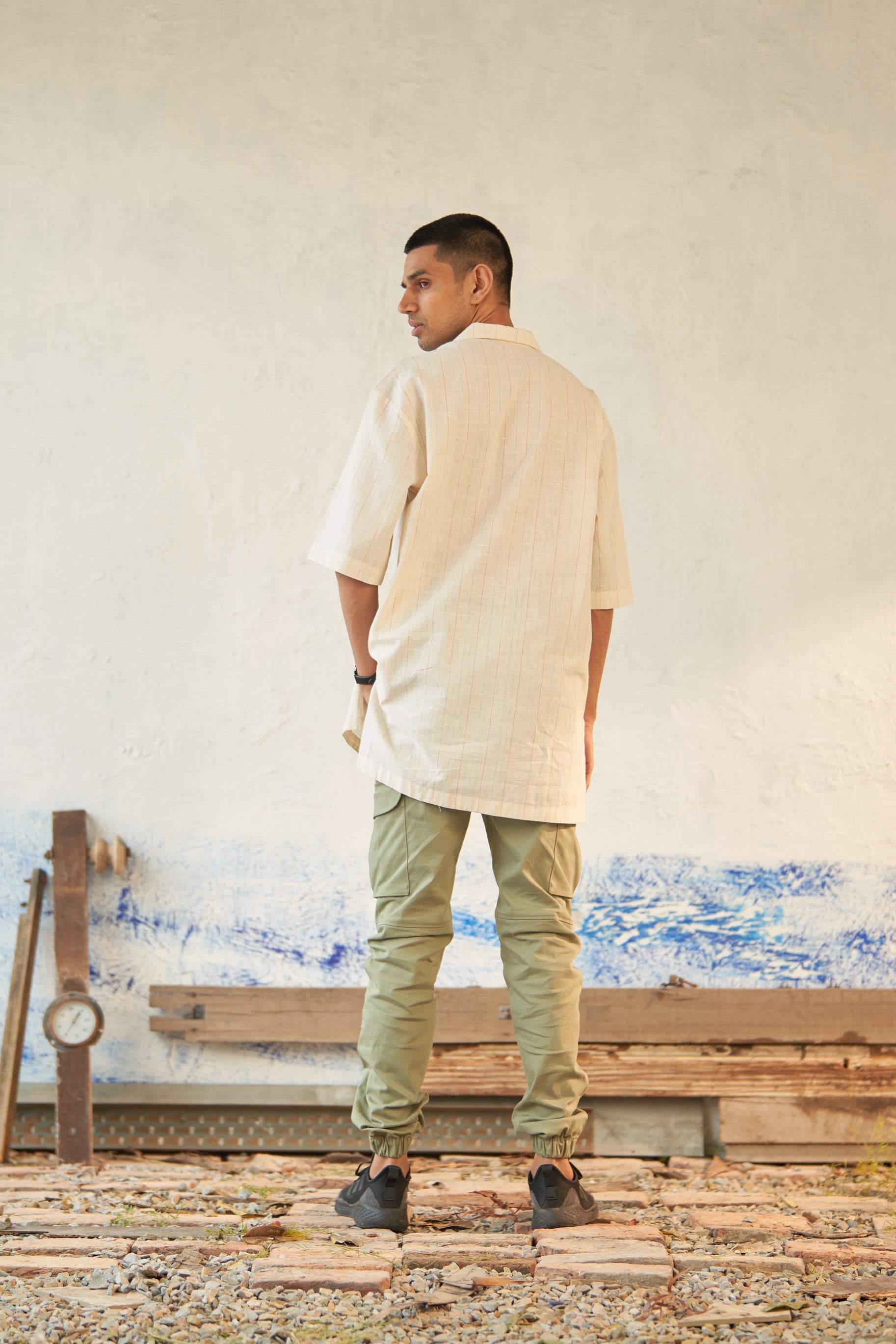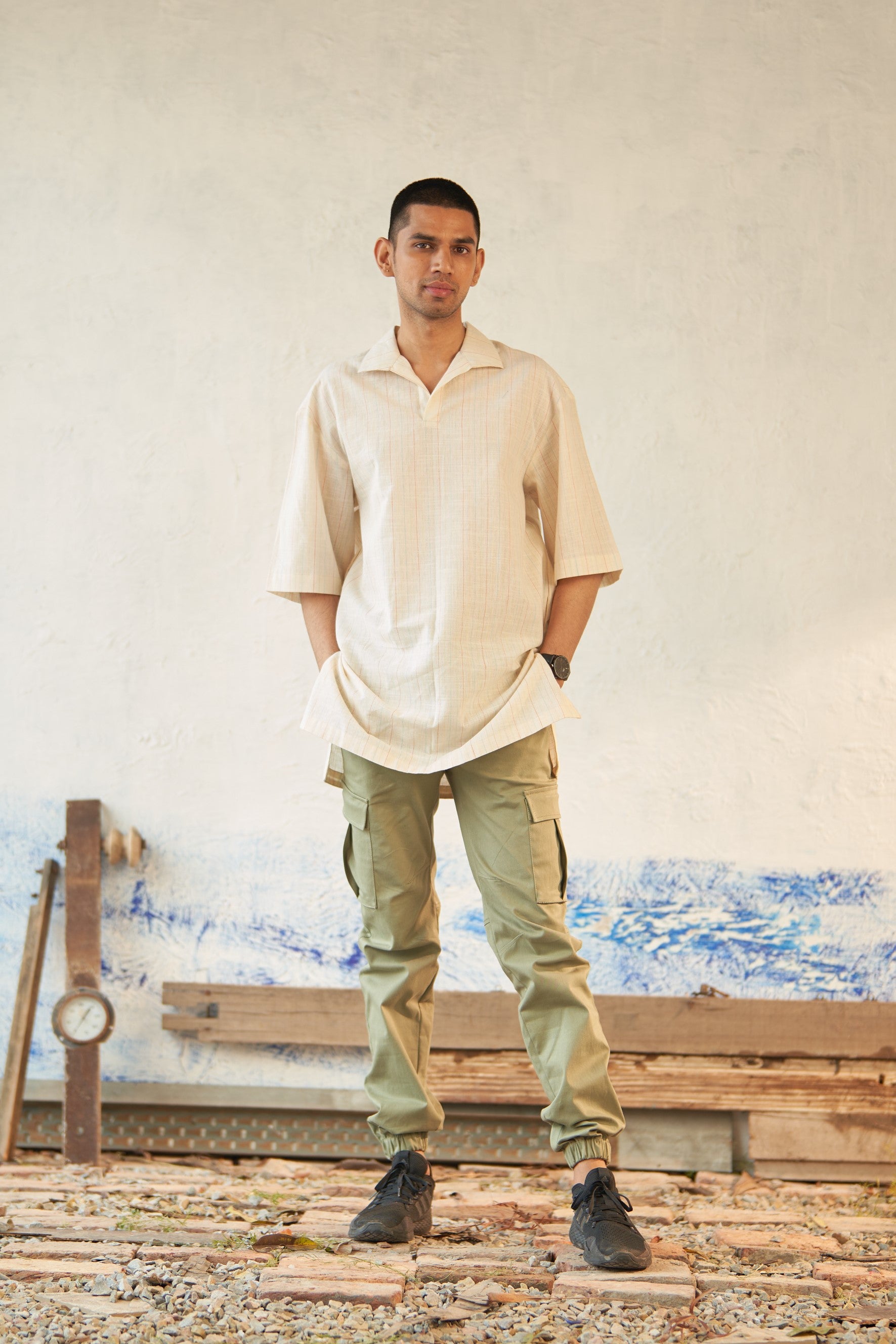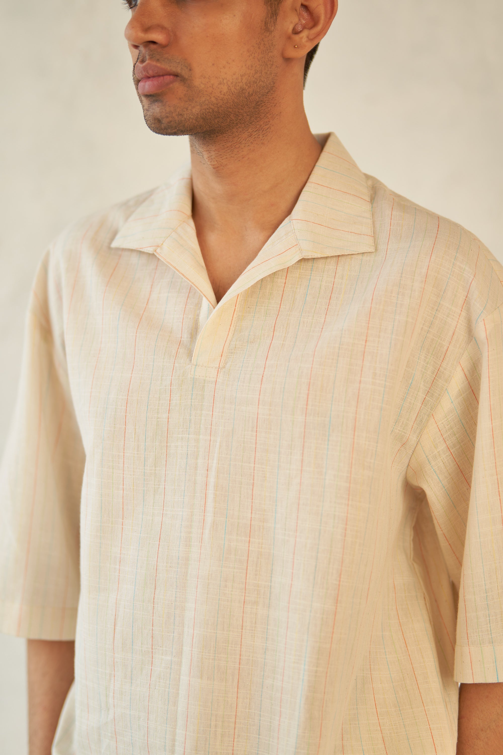 Crafted from textured cotton for a comfortable and stylish wear. This shirt is tailored in a relaxed shape, featuring an overlapping placket that creates a chic v-neck opening. The broad back yoke reflects a shirt fit, while providing enhanced comfort reminiscent of a traditional kurta.