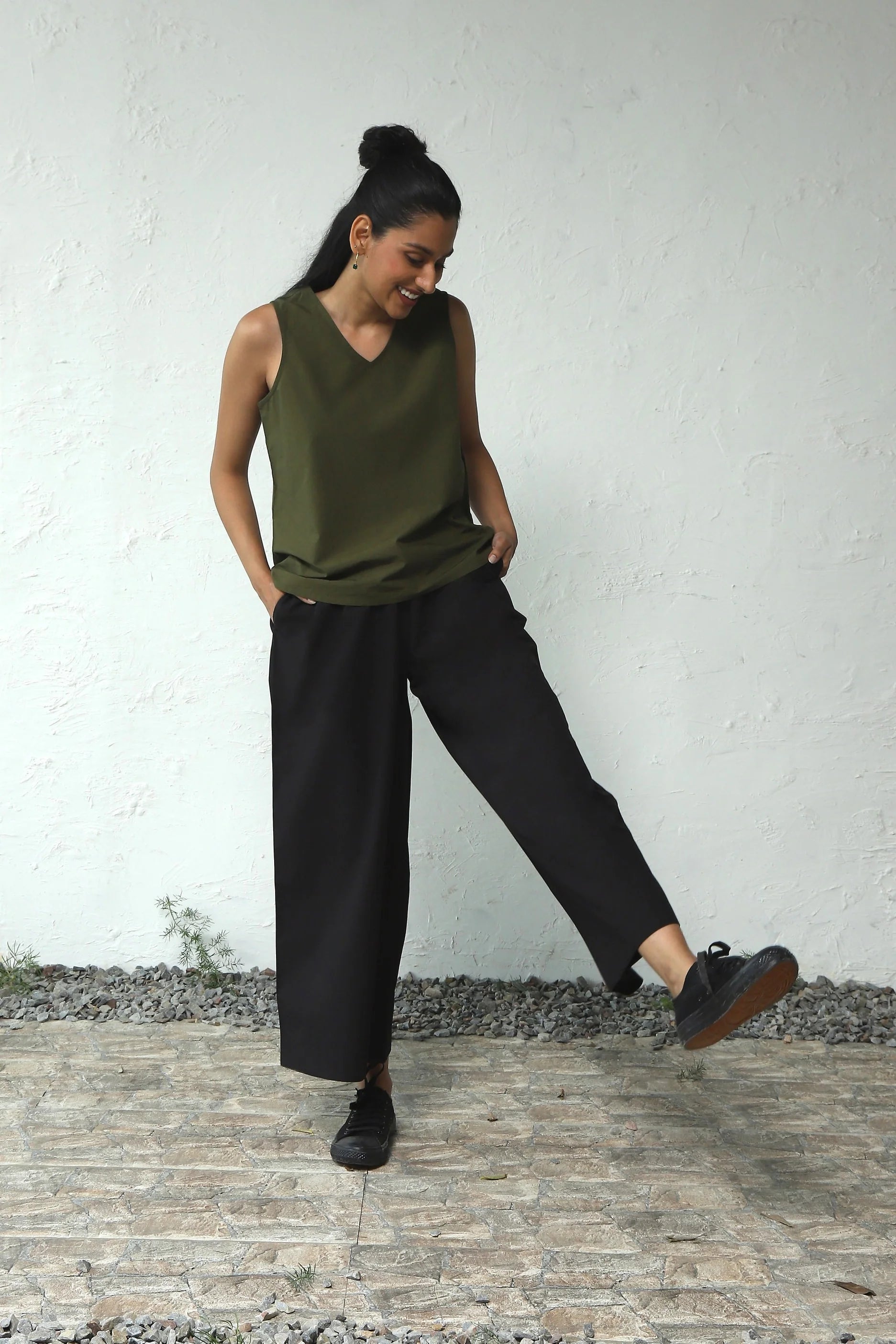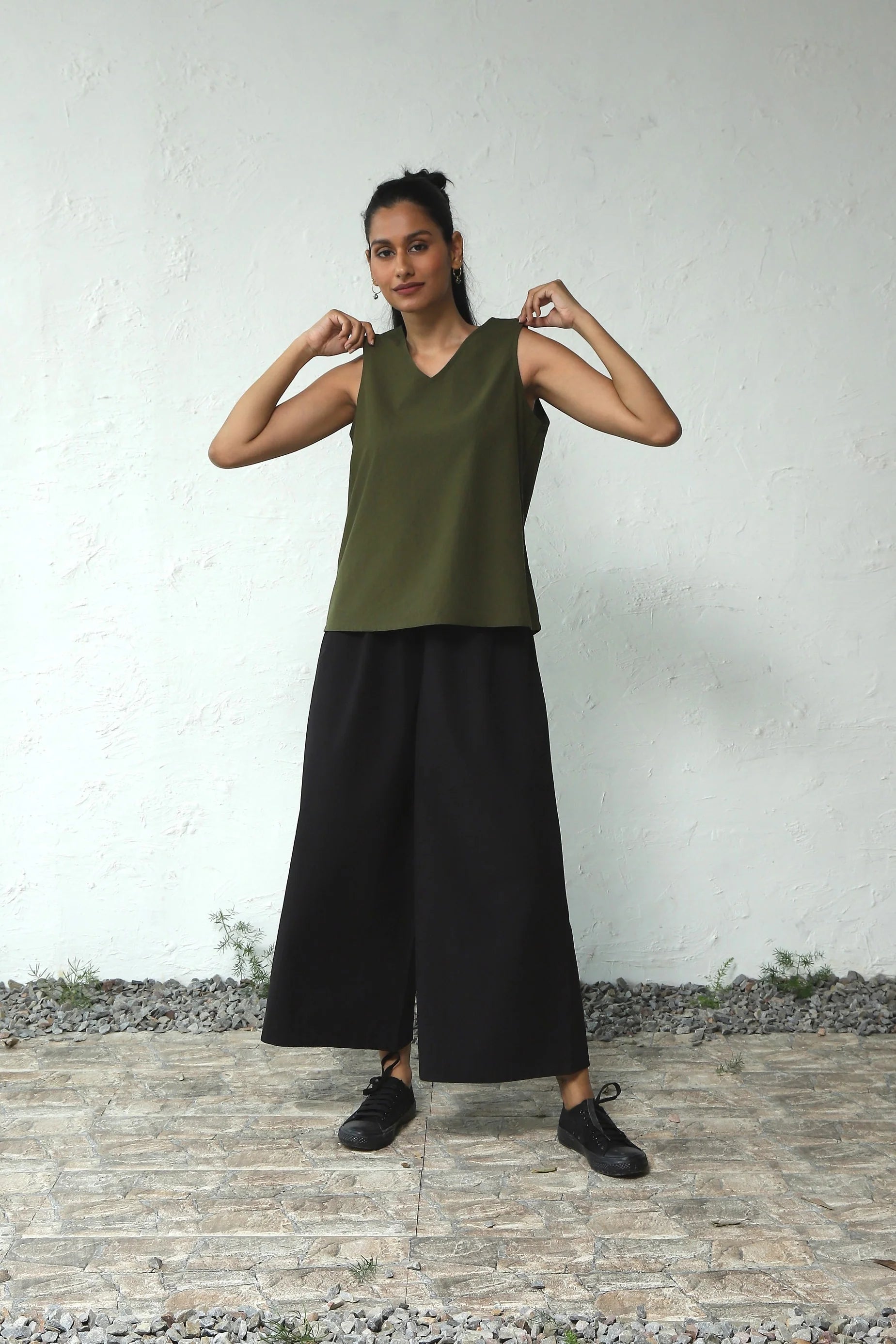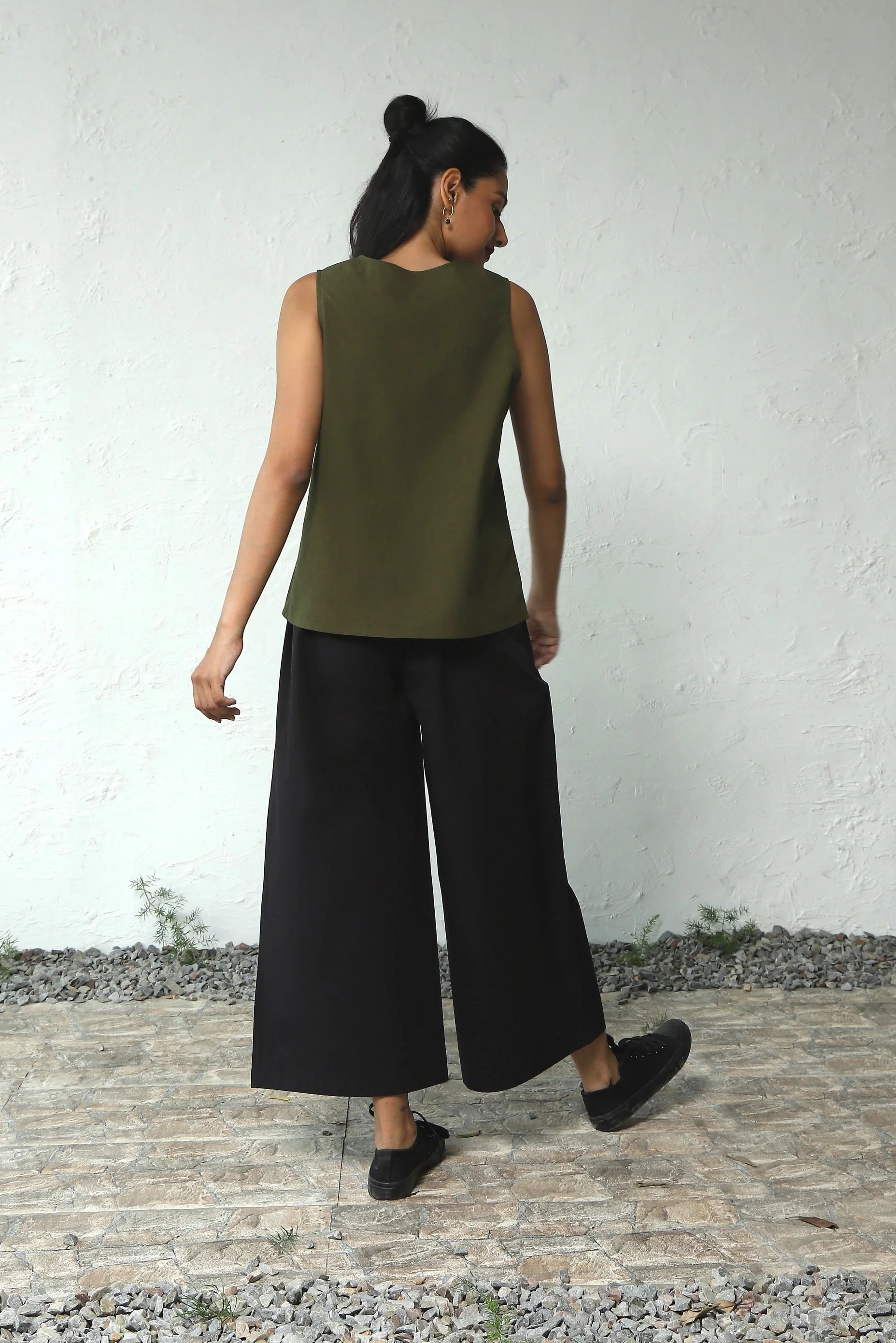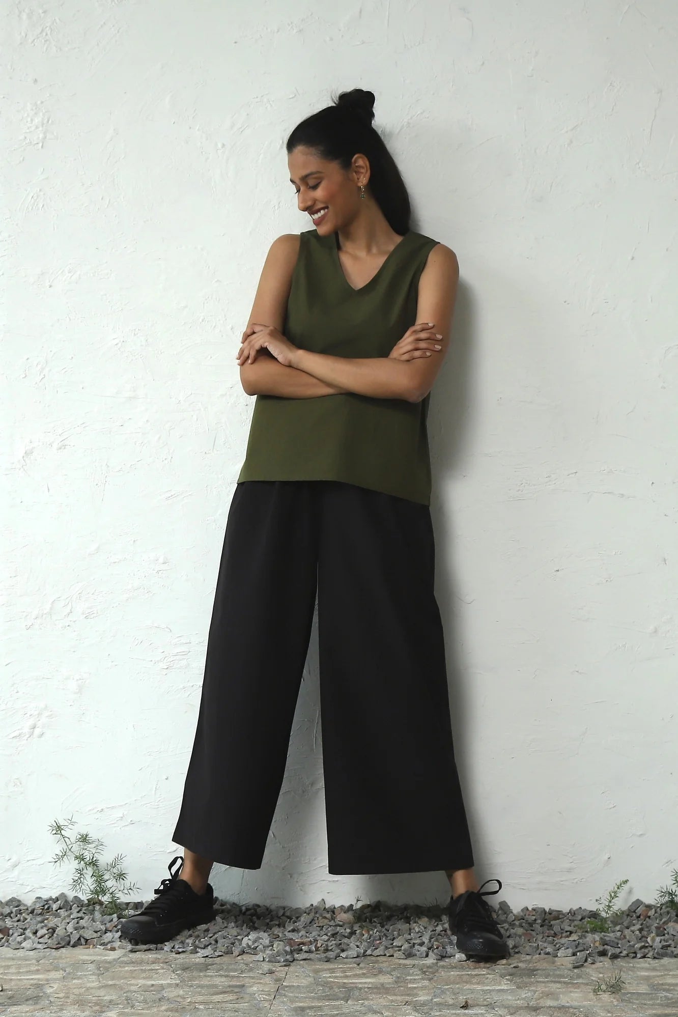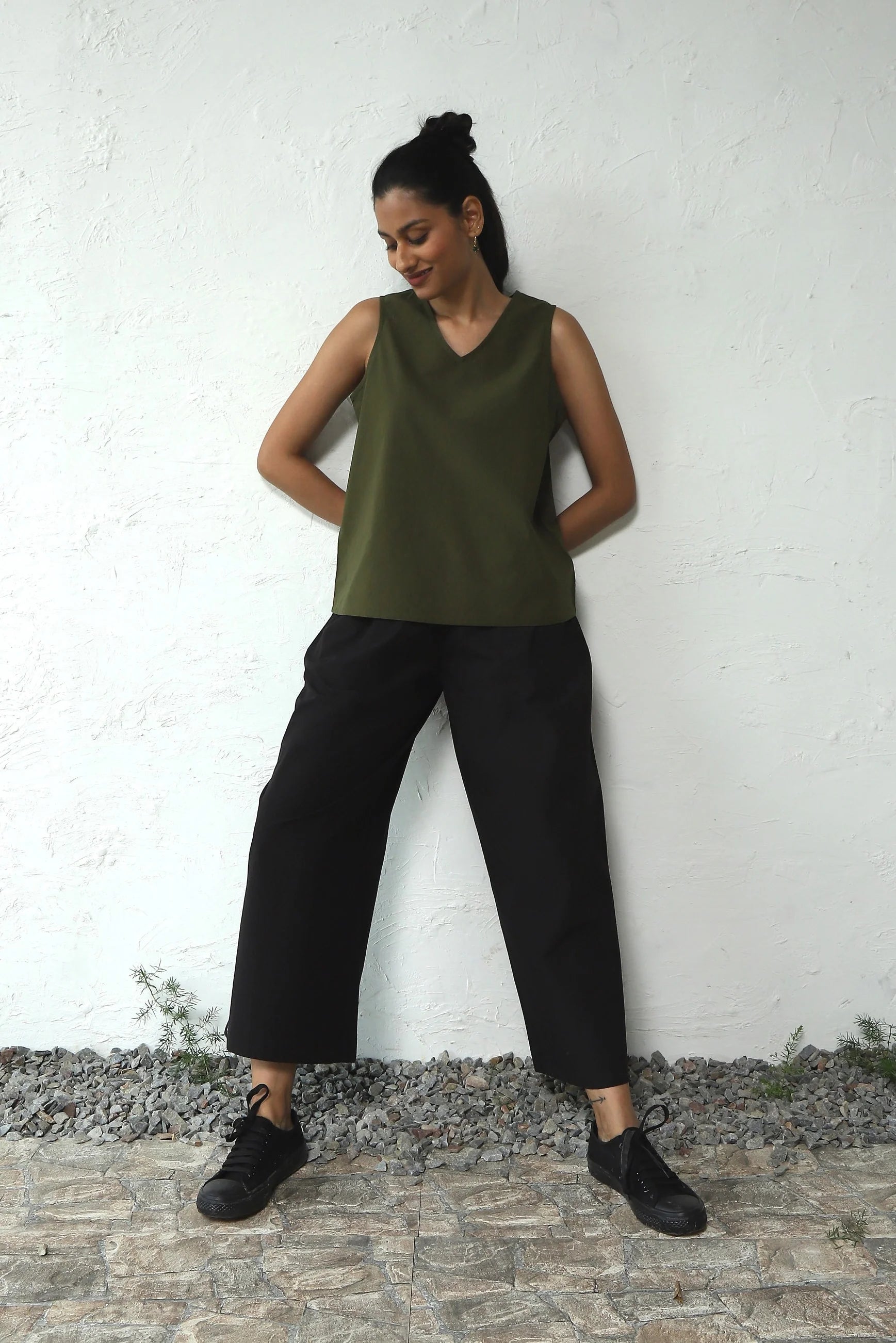 Slip into this forest green sleeveless top for a comfortable and stylish look. The deep color, versatile neckline, and airy silhouette allow for easy pairing with various bottoms and accessories, creating a range of stylish looks. This makes it a perfect piece to pack for holidays.