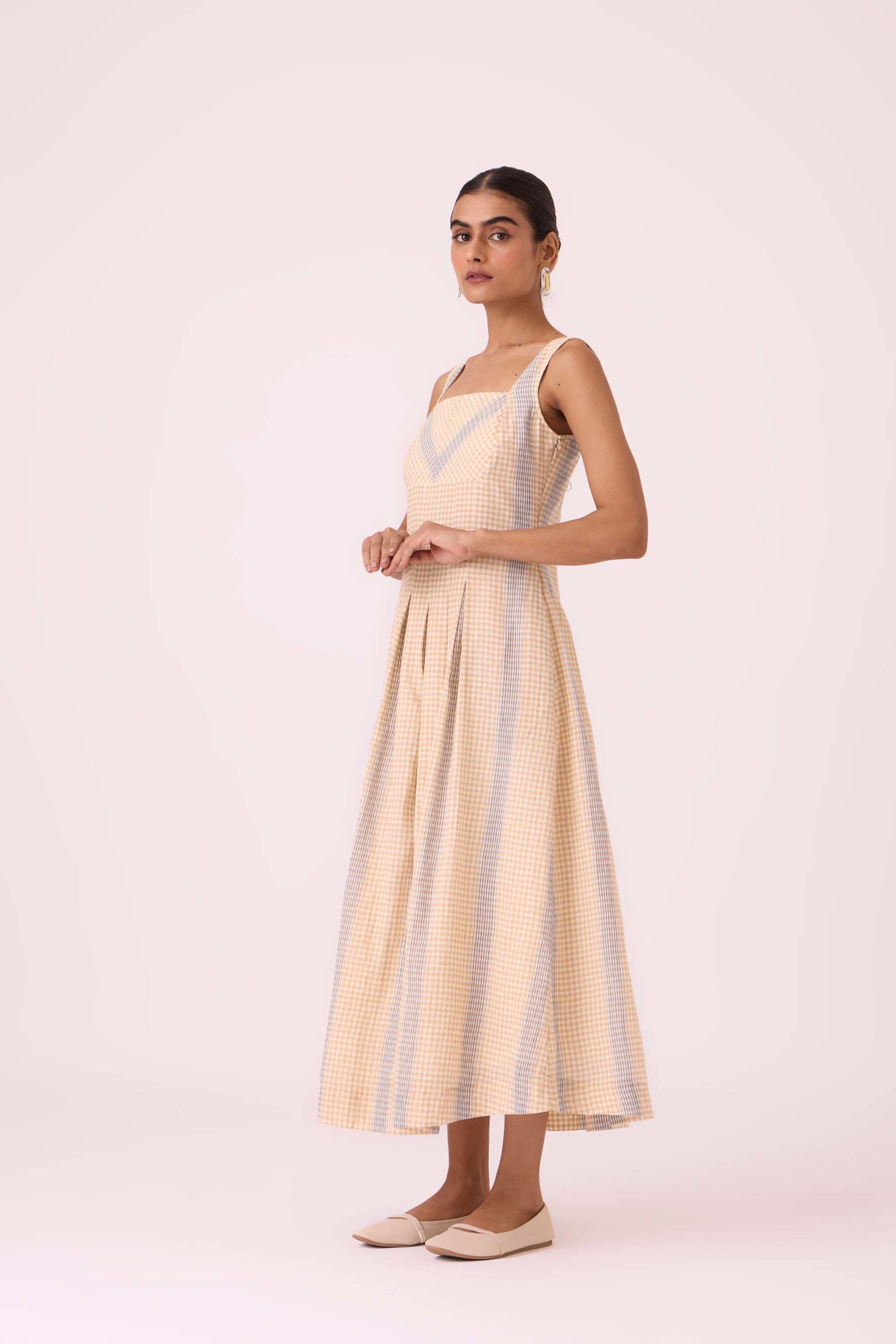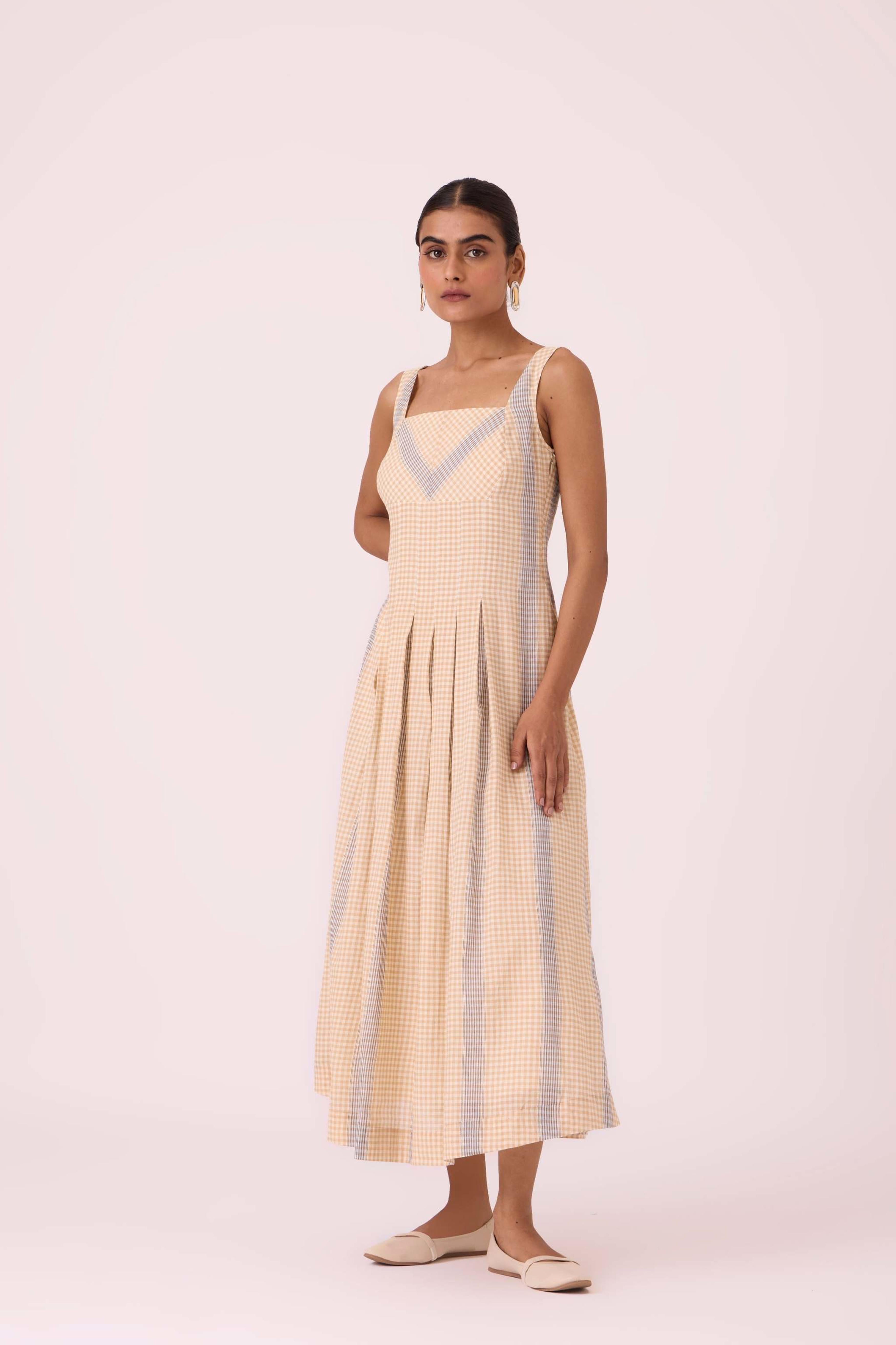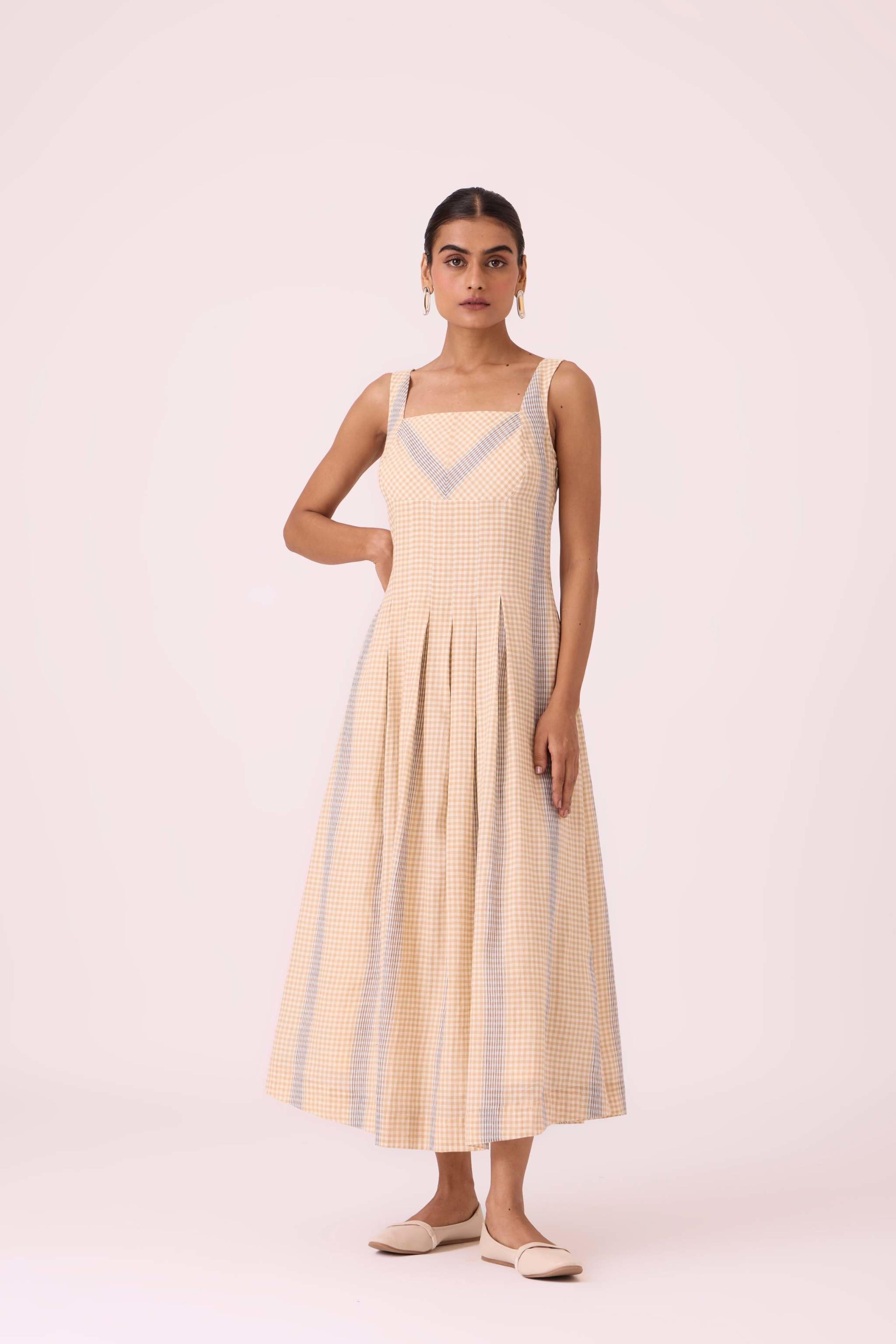 This *summer slim-fit midi dress* features a *square neck* at both the front and back. It includes practical *in-seam pockets* and a *side zip*. The dress is *fully lined* and is made from a fabric developed in a studio and *handwoven by artisans in Bengal*. For sizing, the model Chhavi, who is 5'6", is wearing an XS.