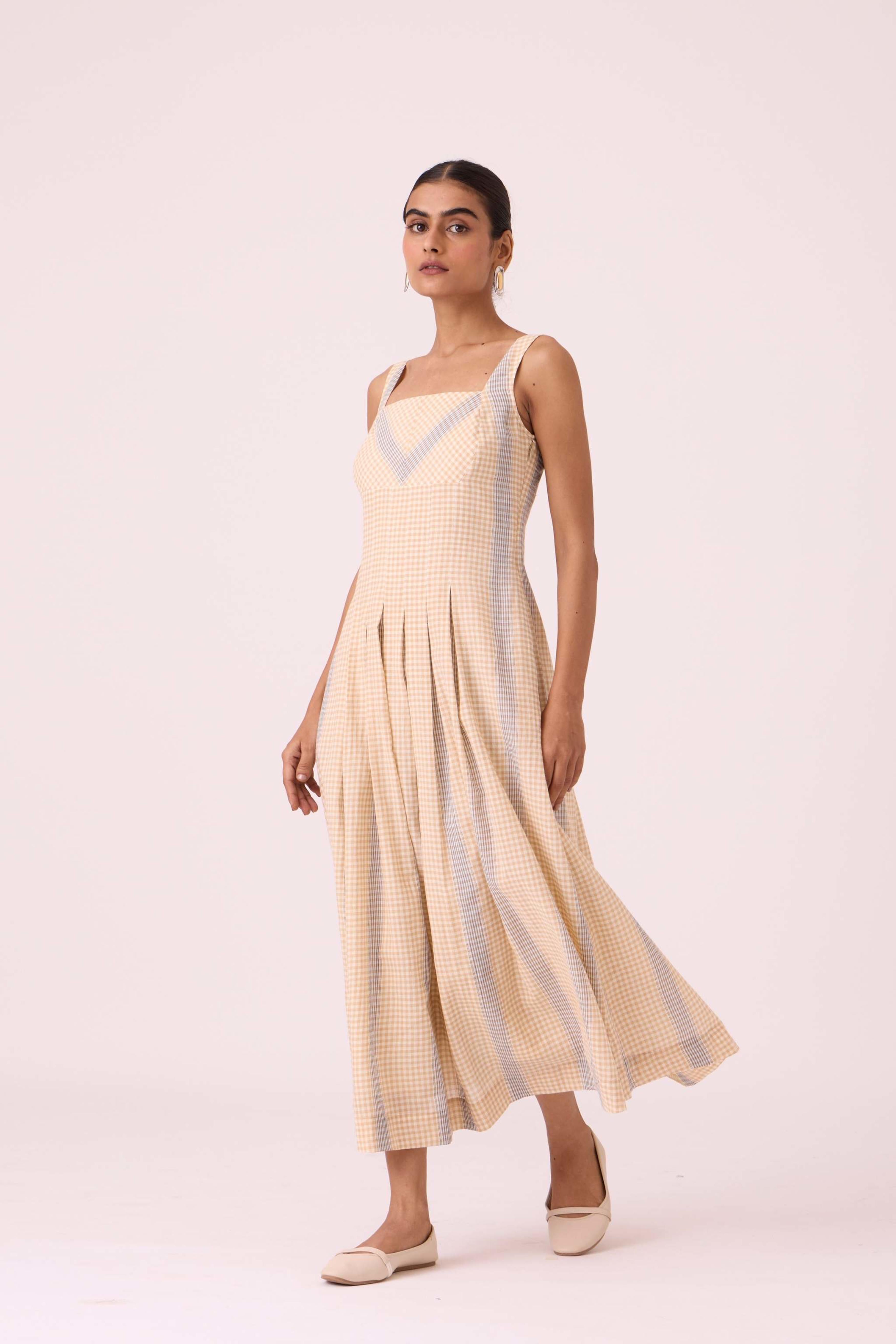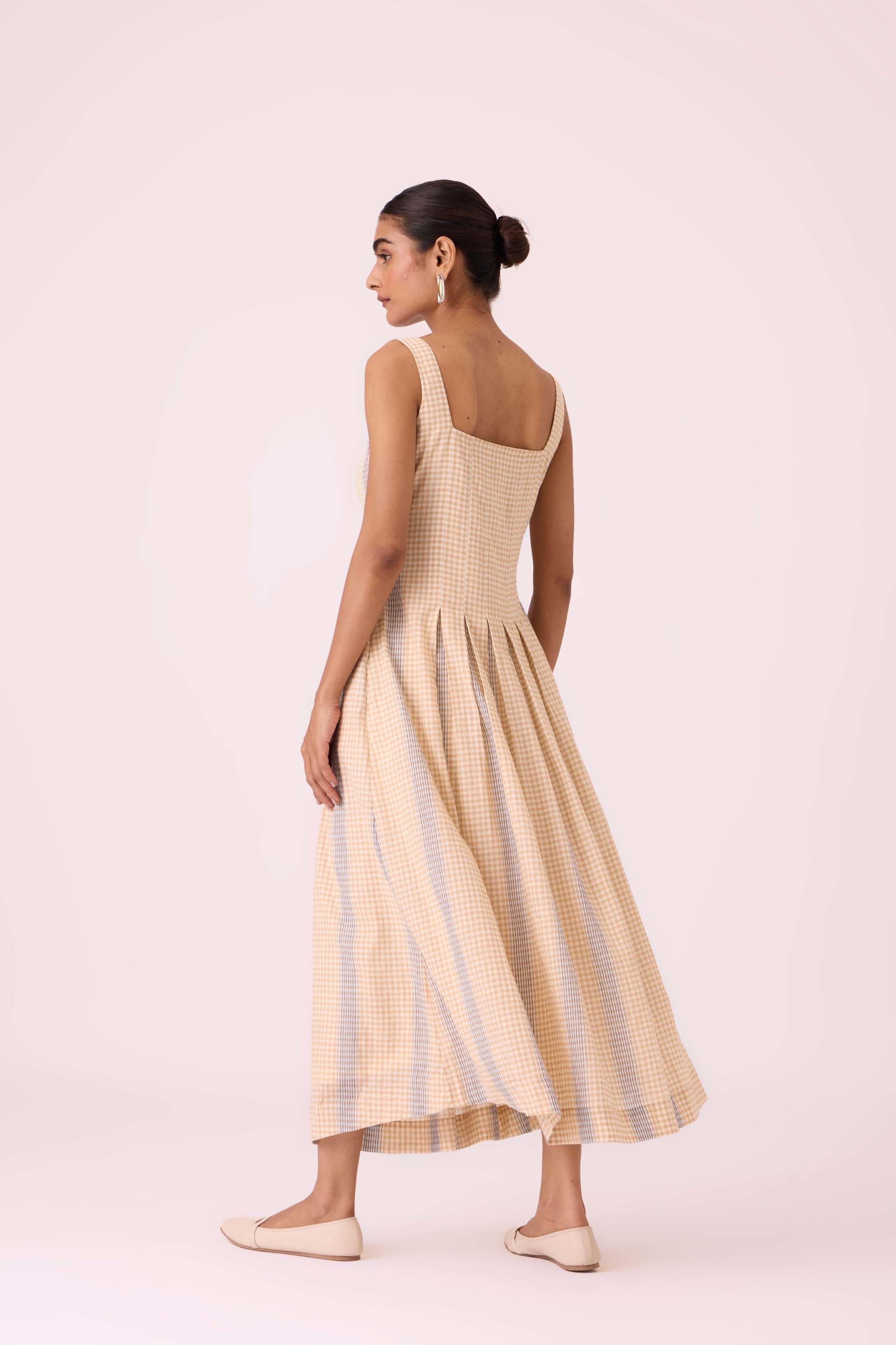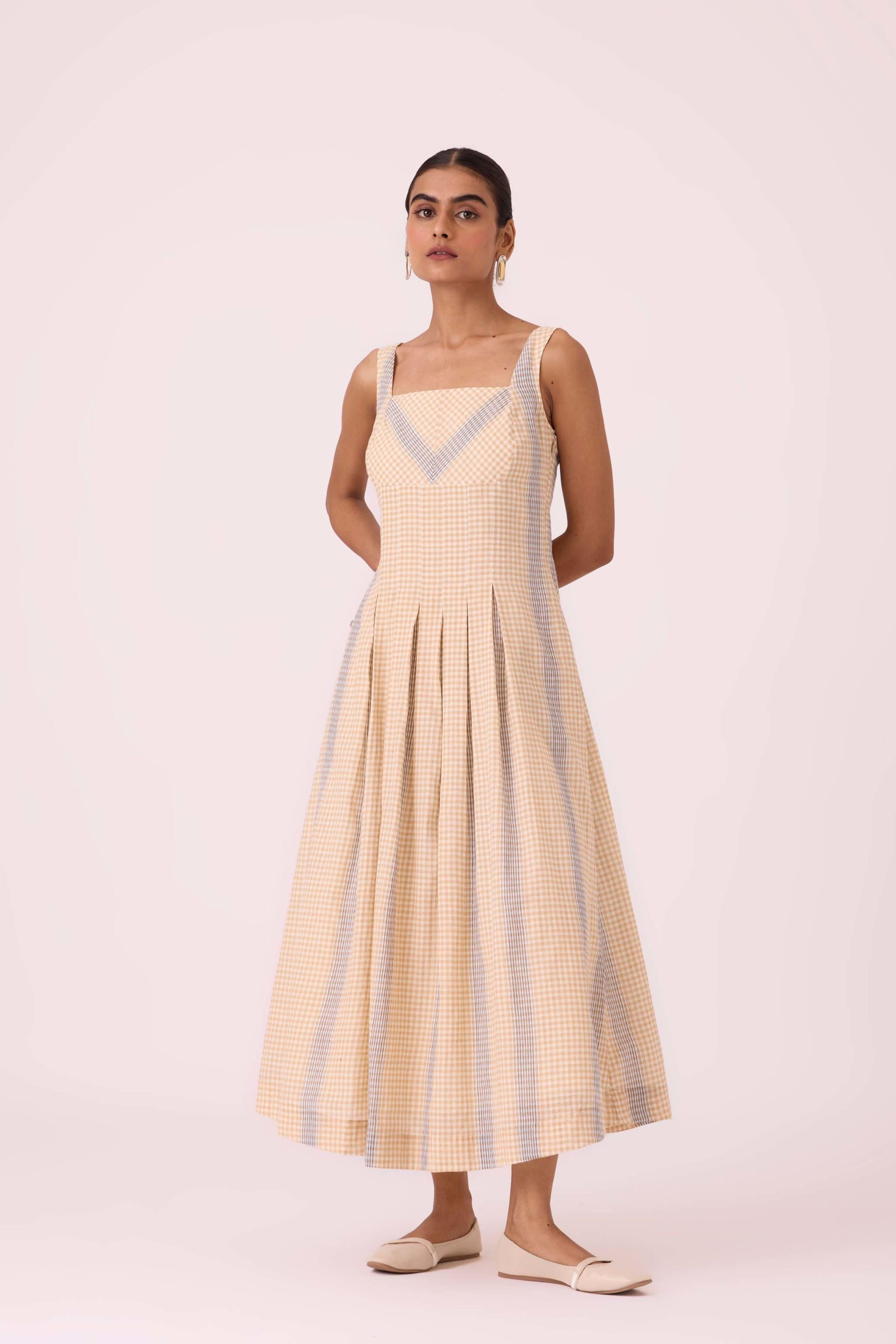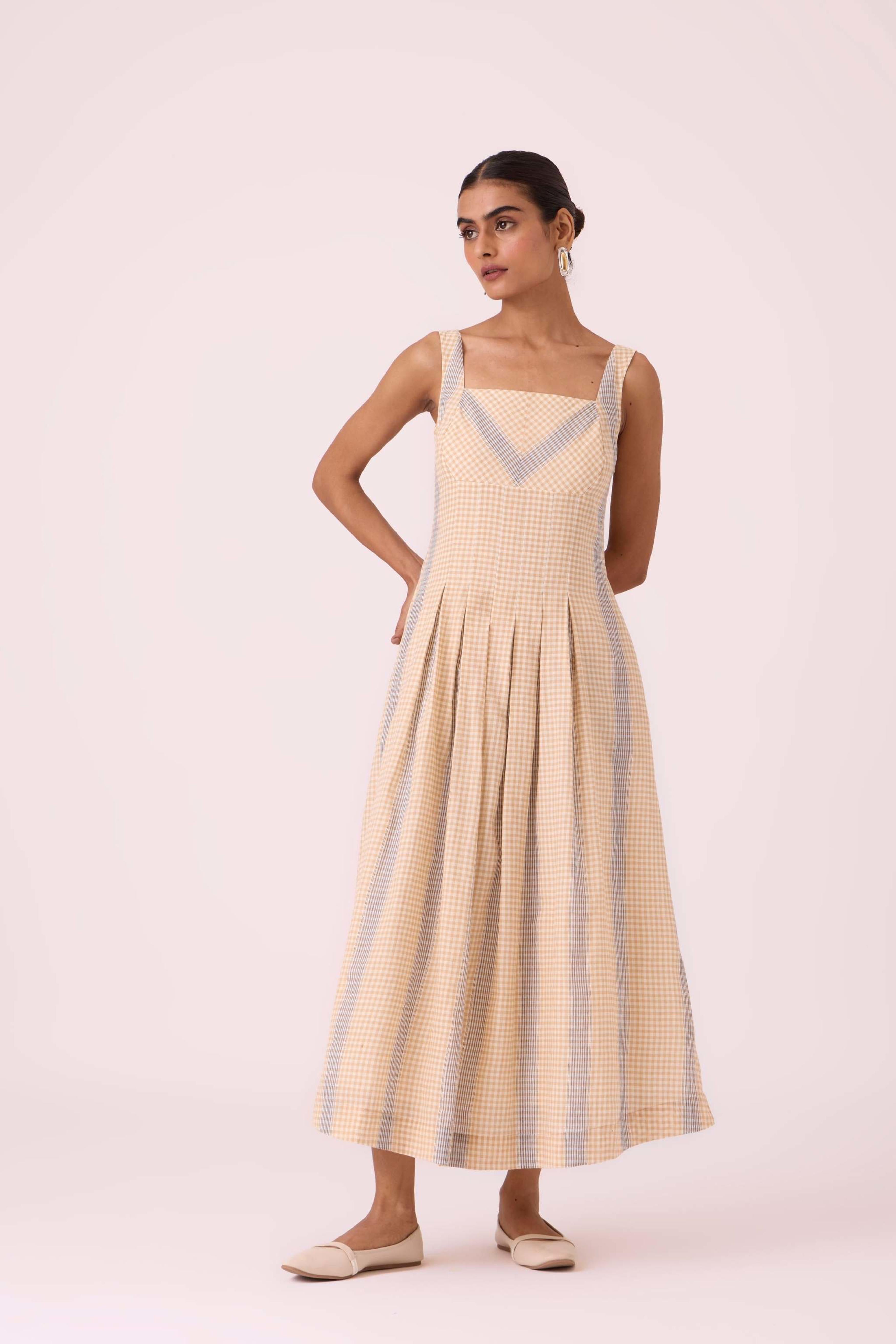 This *summer slim-fit midi dress* features a *square neck* at both the front and back. It includes practical *in-seam pockets* and a *side zip*. The dress is *fully lined* and is made from a fabric developed in a studio and *handwoven by artisans in Bengal*. For sizing, the model Chhavi, who is 5'6", is wearing an XS.