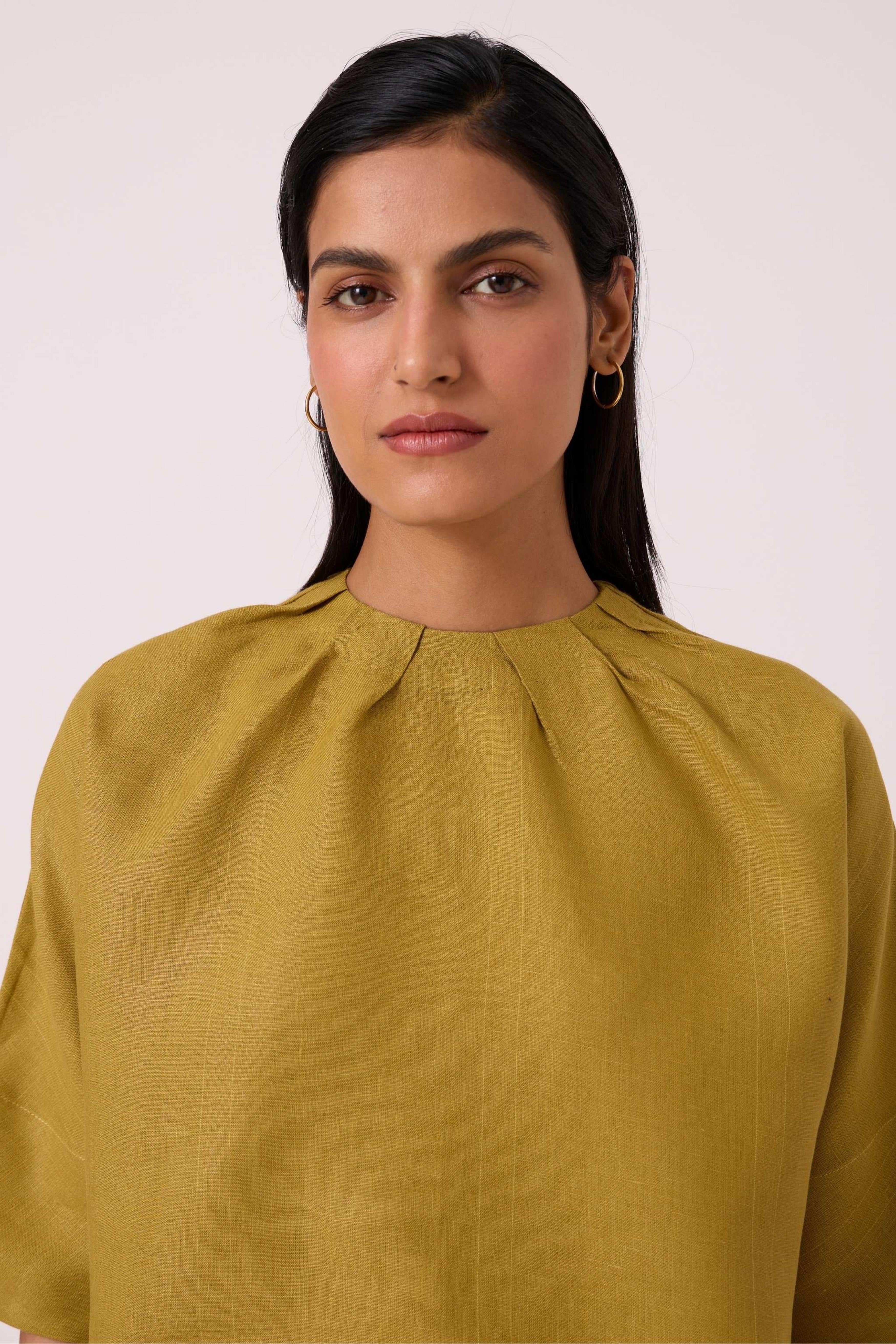 This is a *cropped, regular-fit top* with a *pleated neckline* detail. It has *drop shoulders*, *elbow-length sleeves*, and a *back button fastening*. The model, Chhavi, is 5'6" and is wearing a size XS.