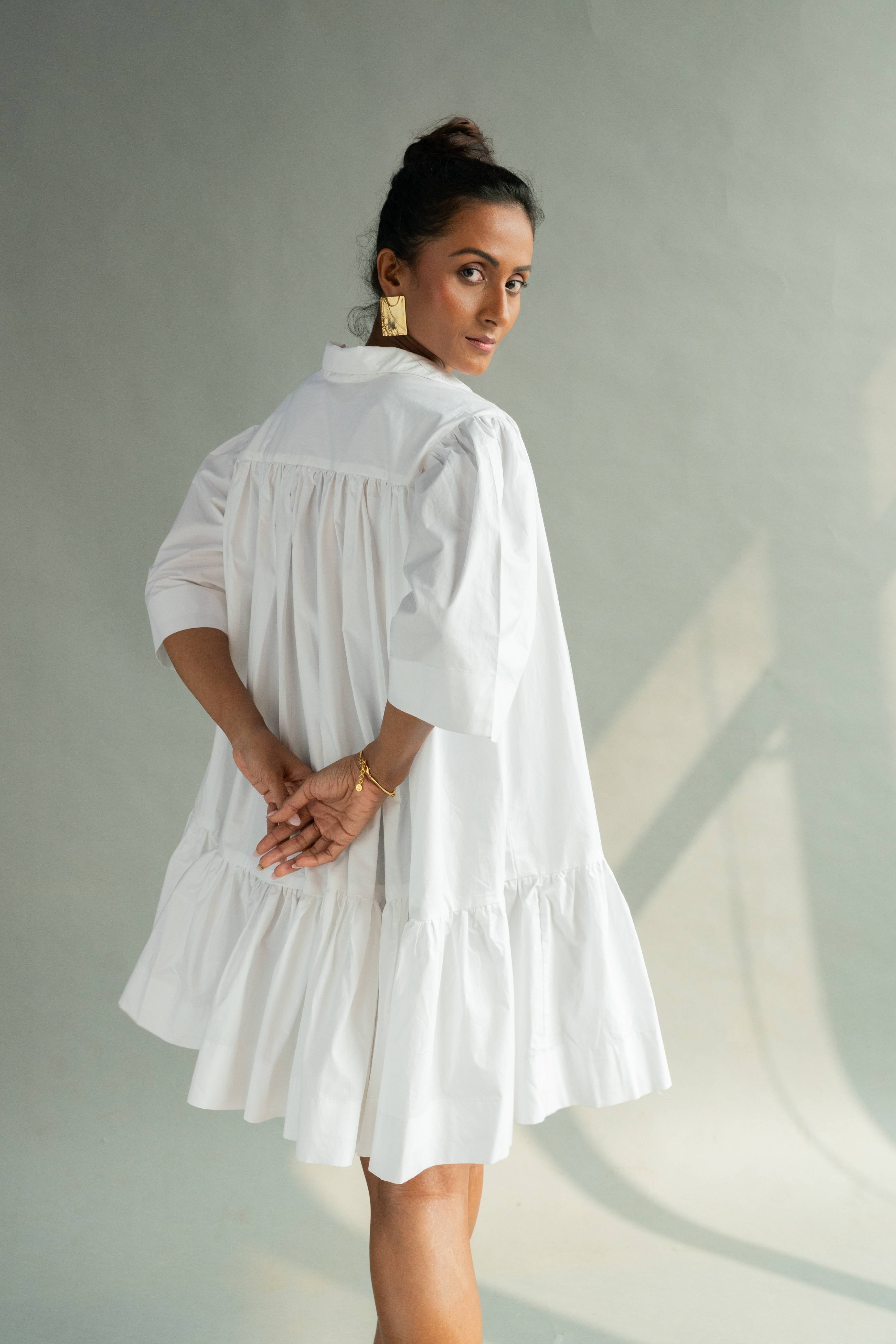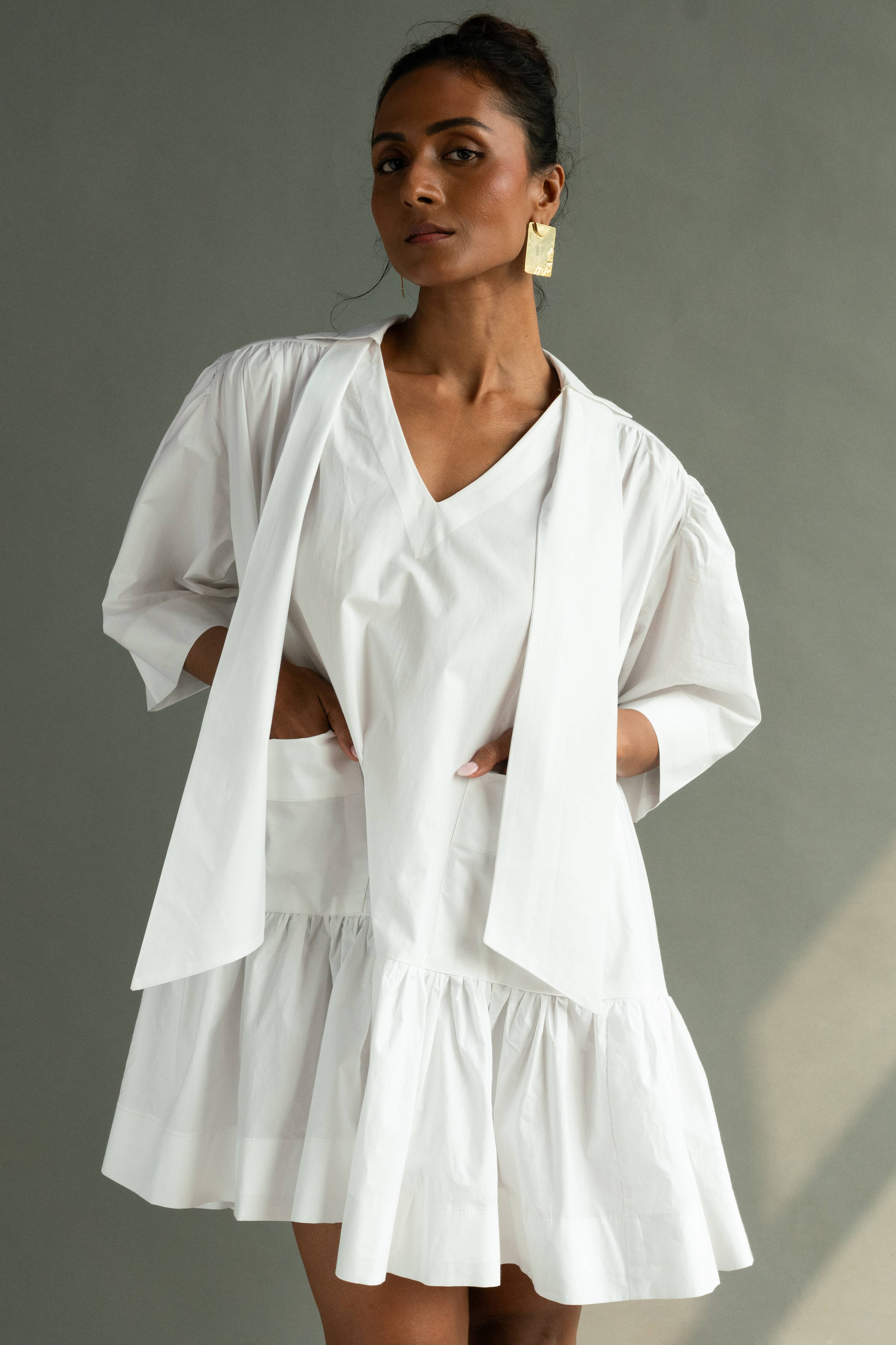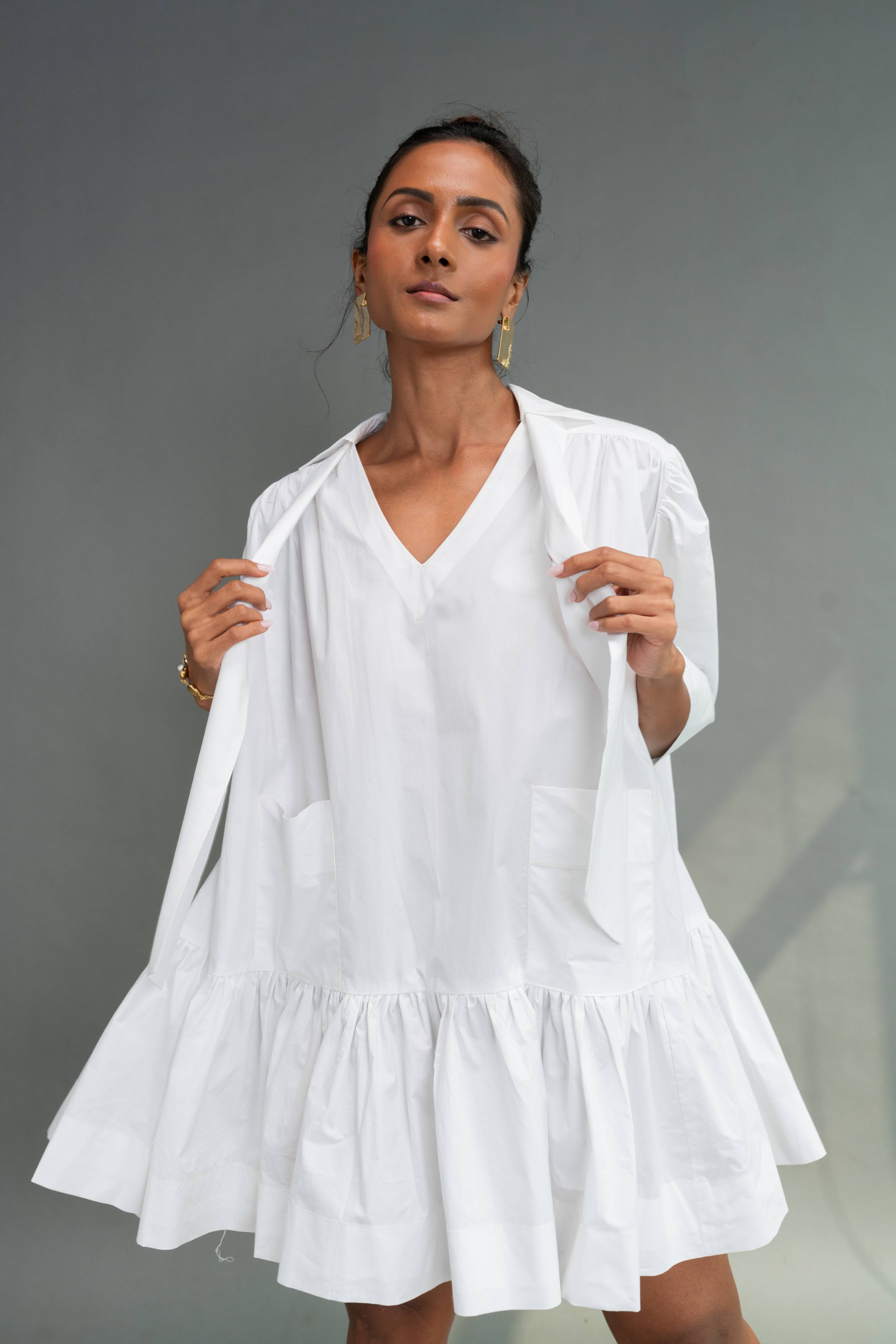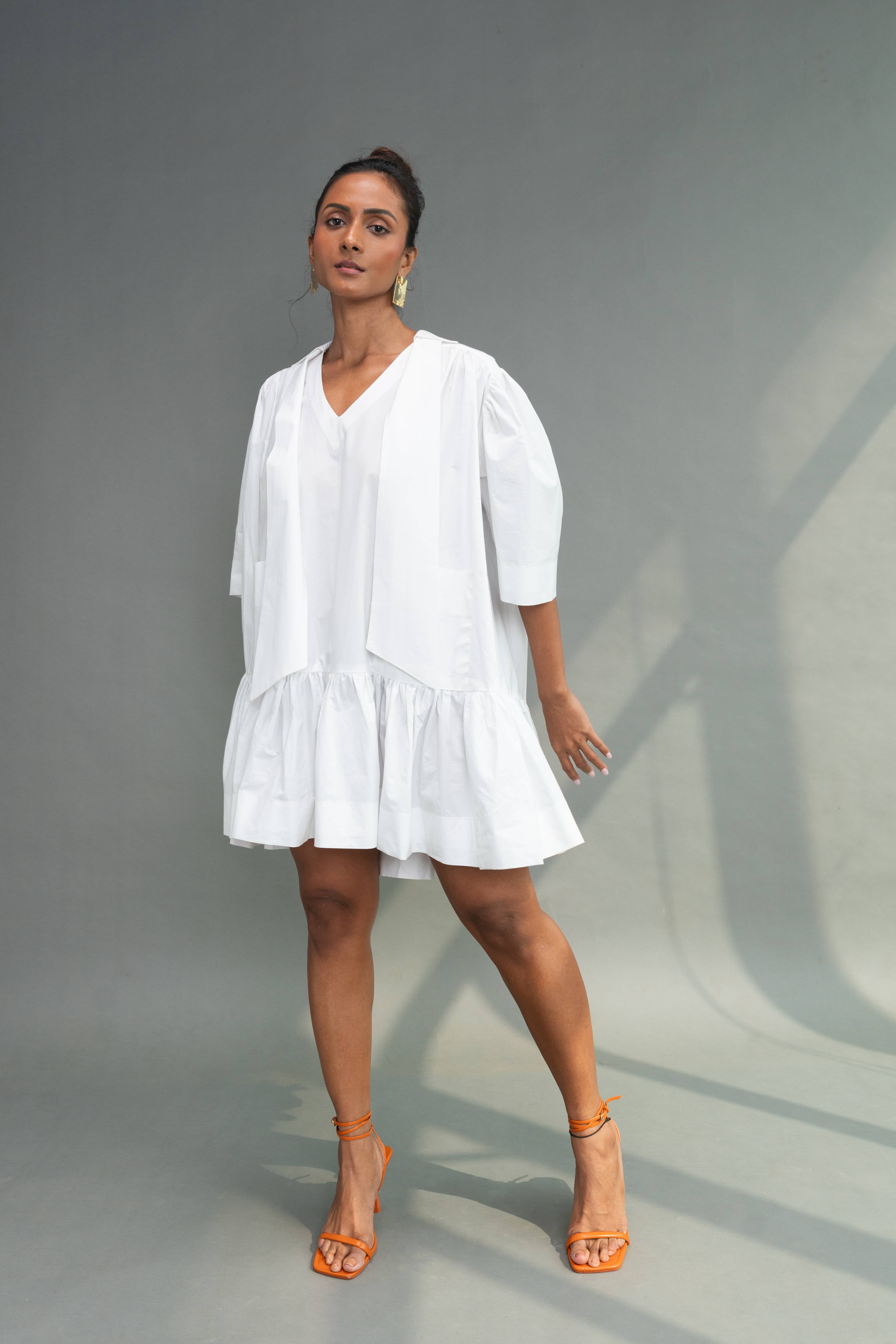 Half- sleeved tier dress with shirt collar, v-neckline and two front pockets with careful attention the finishing of every part.The back is voluminous with gathers starting from the yoke. It comes with a detachable scarf.