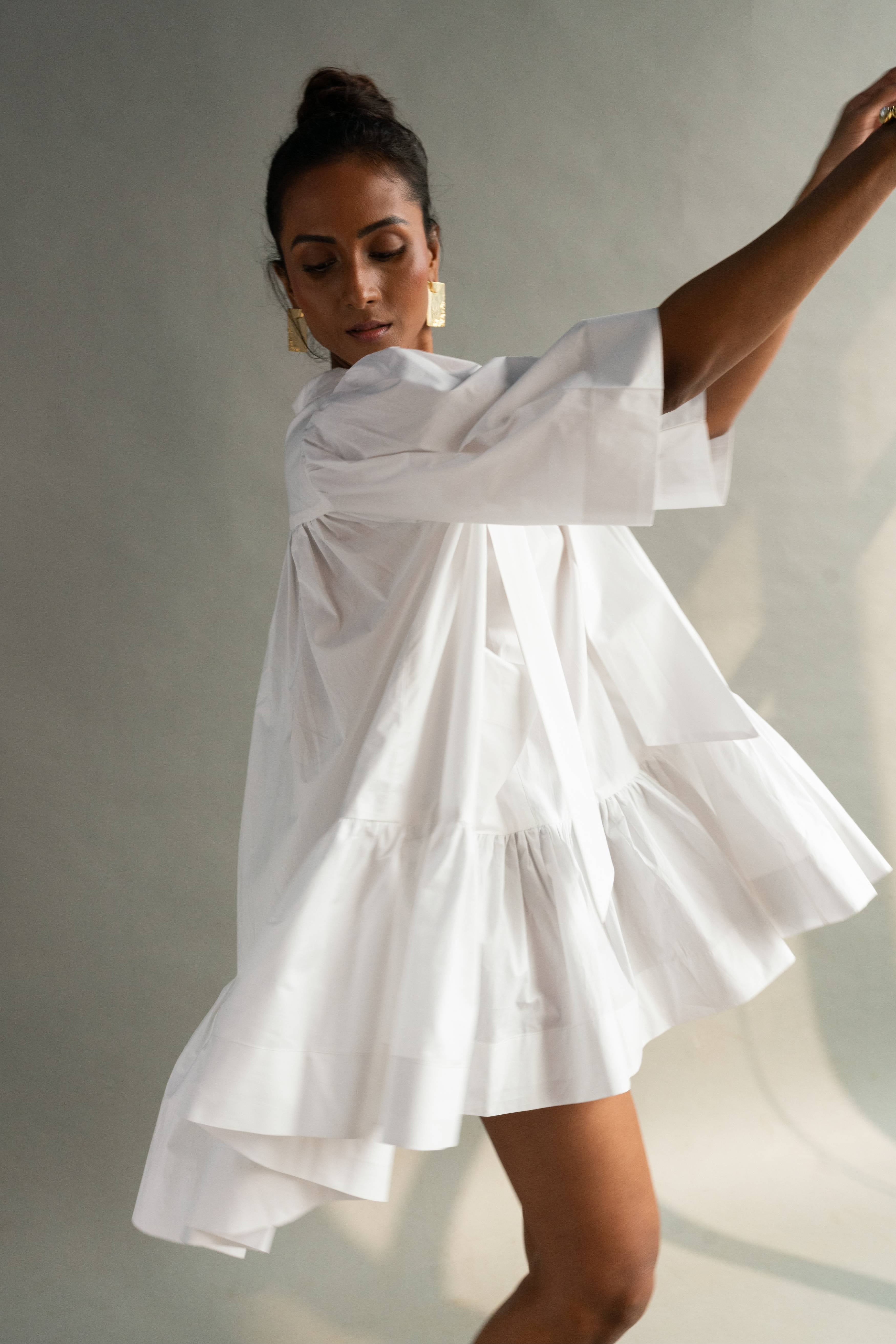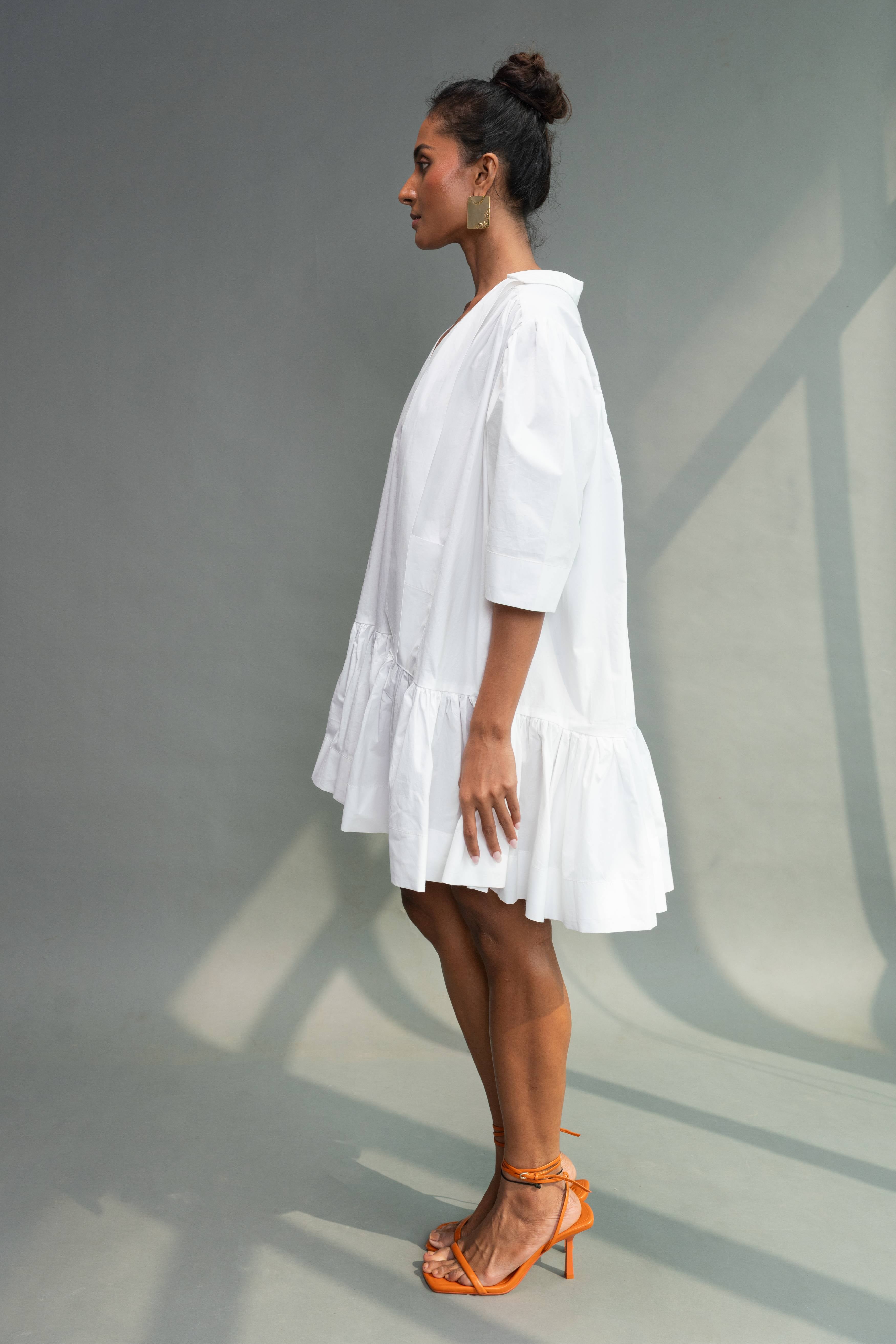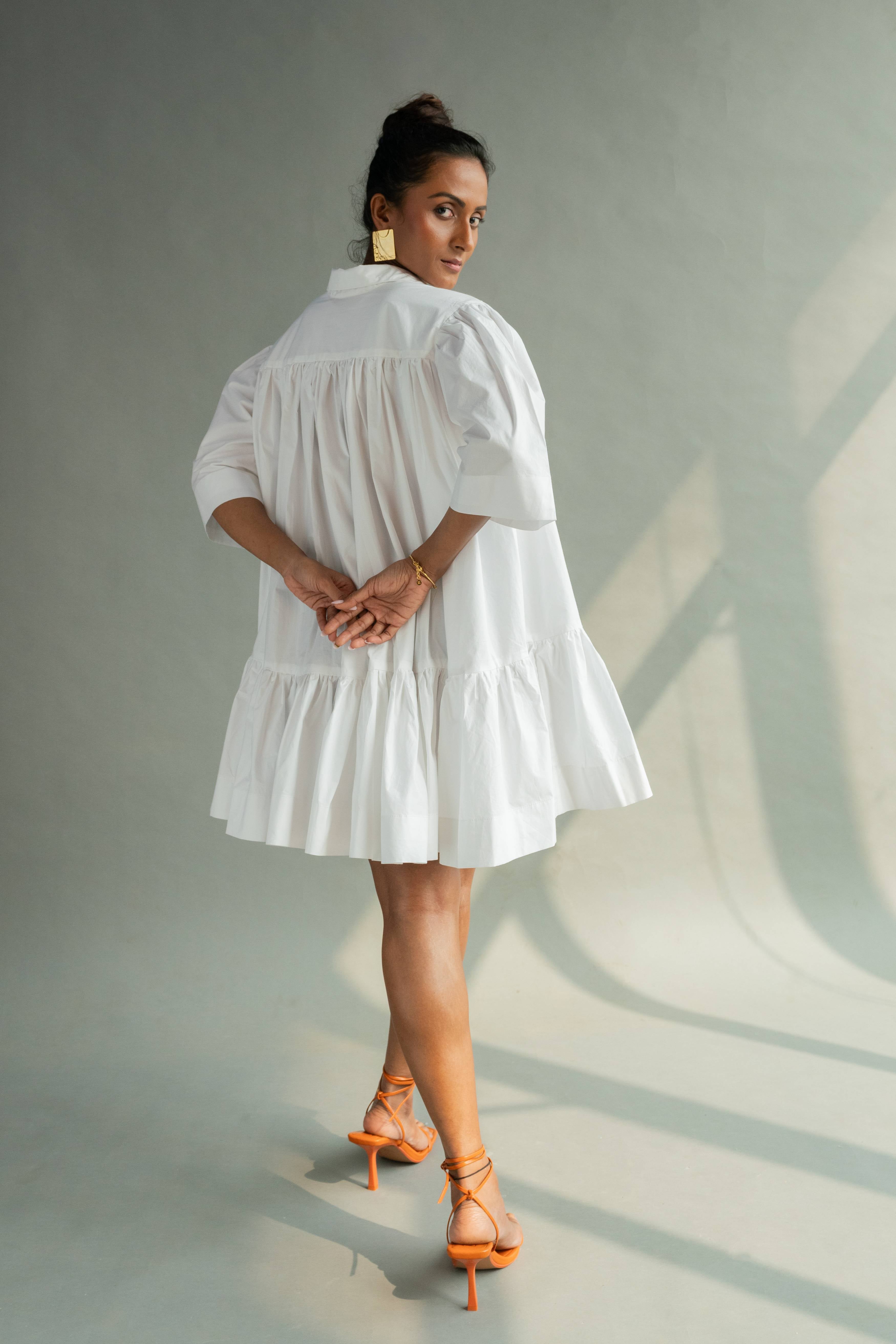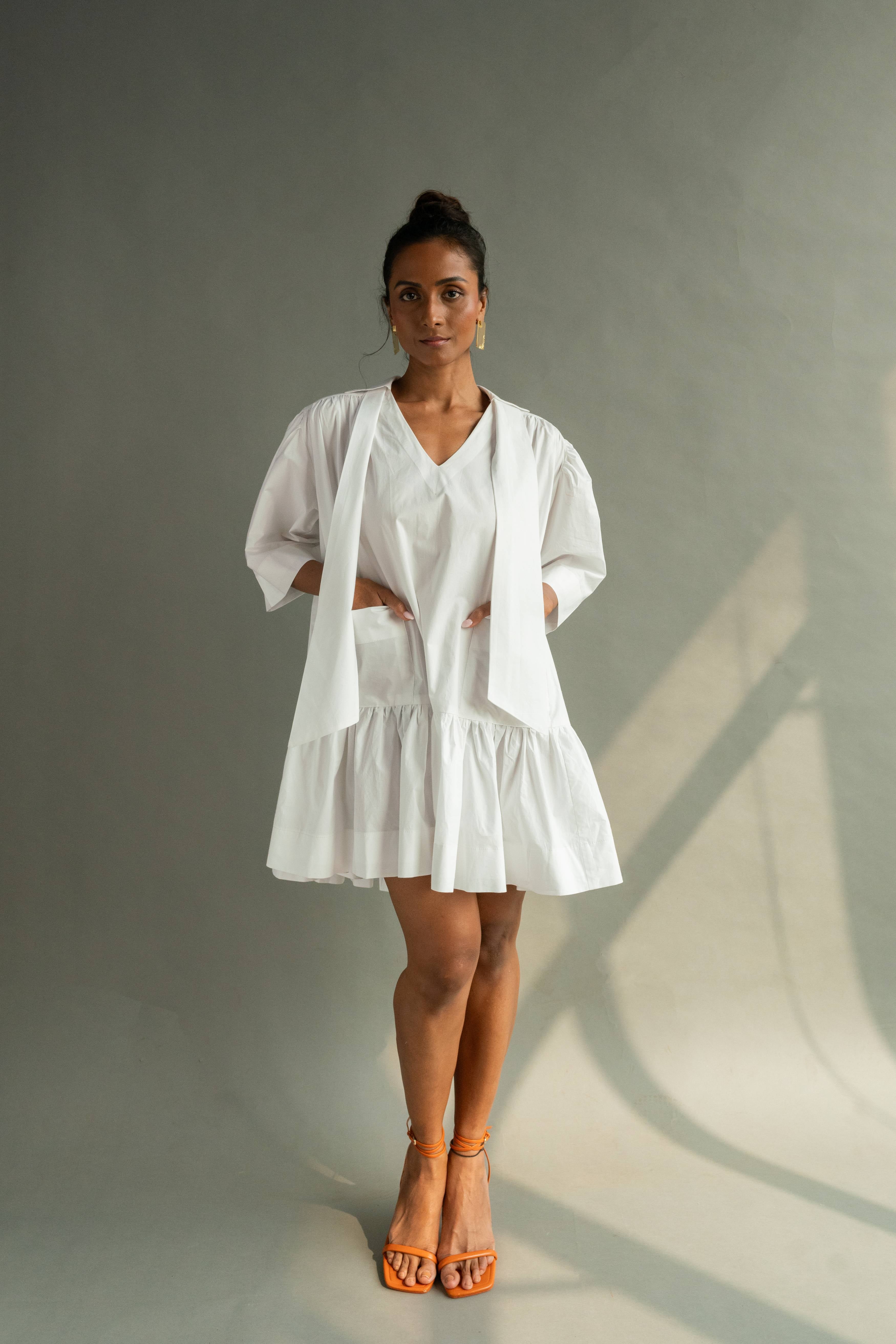Half- sleeved tier dress with shirt collar, v-neckline and two front pockets with careful attention the finishing of every part.The back is voluminous with gathers starting from the yoke. It comes with a detachable scarf.