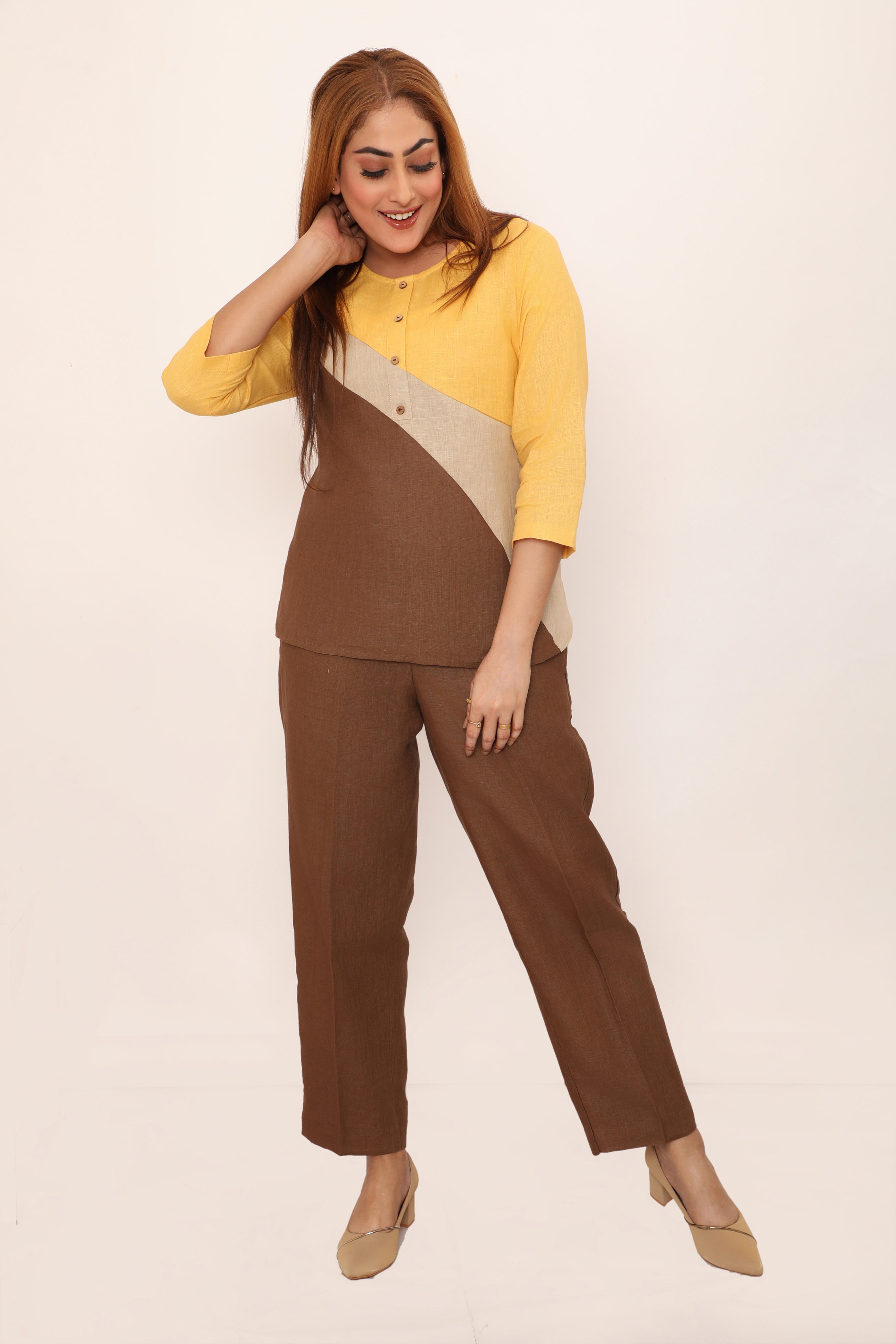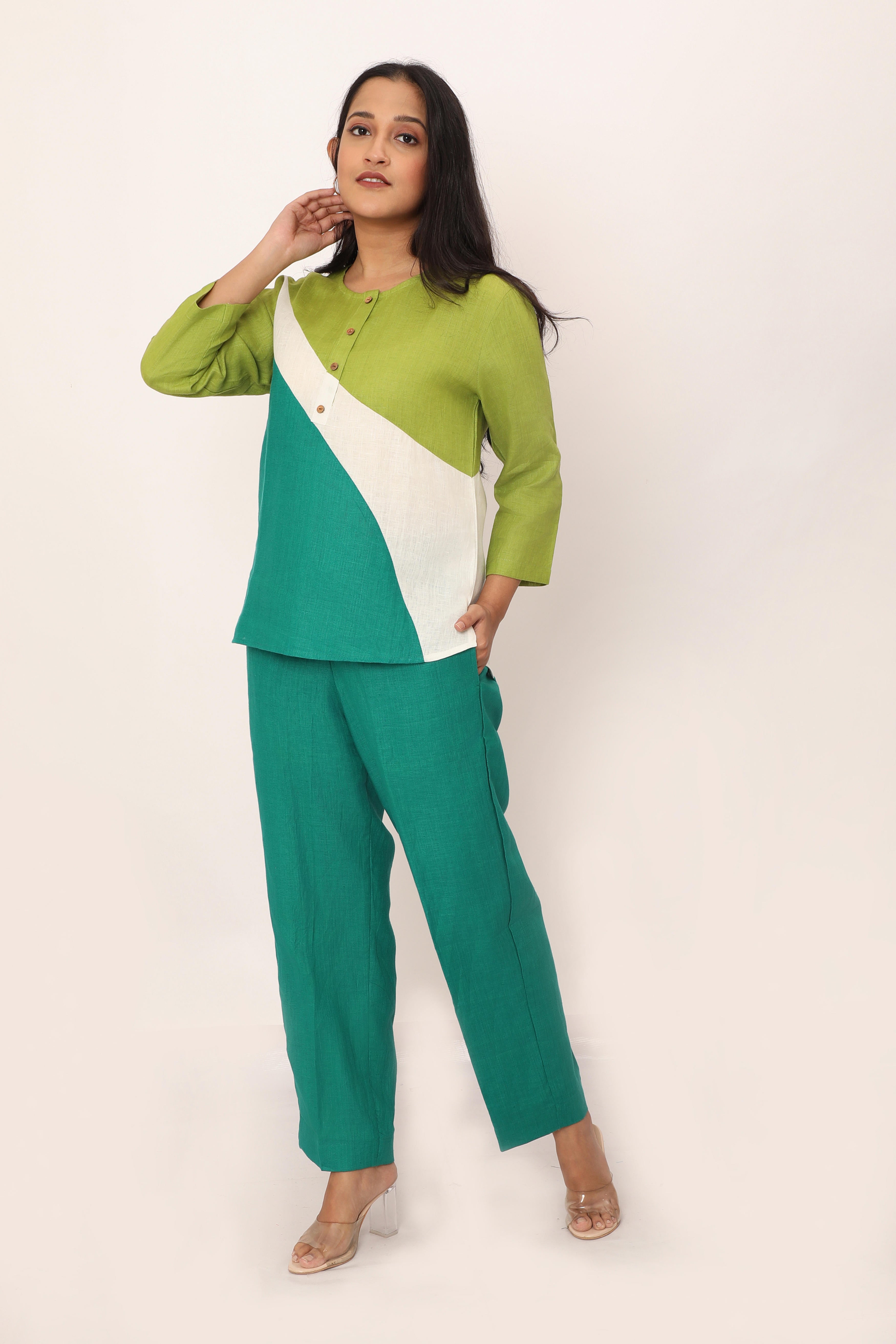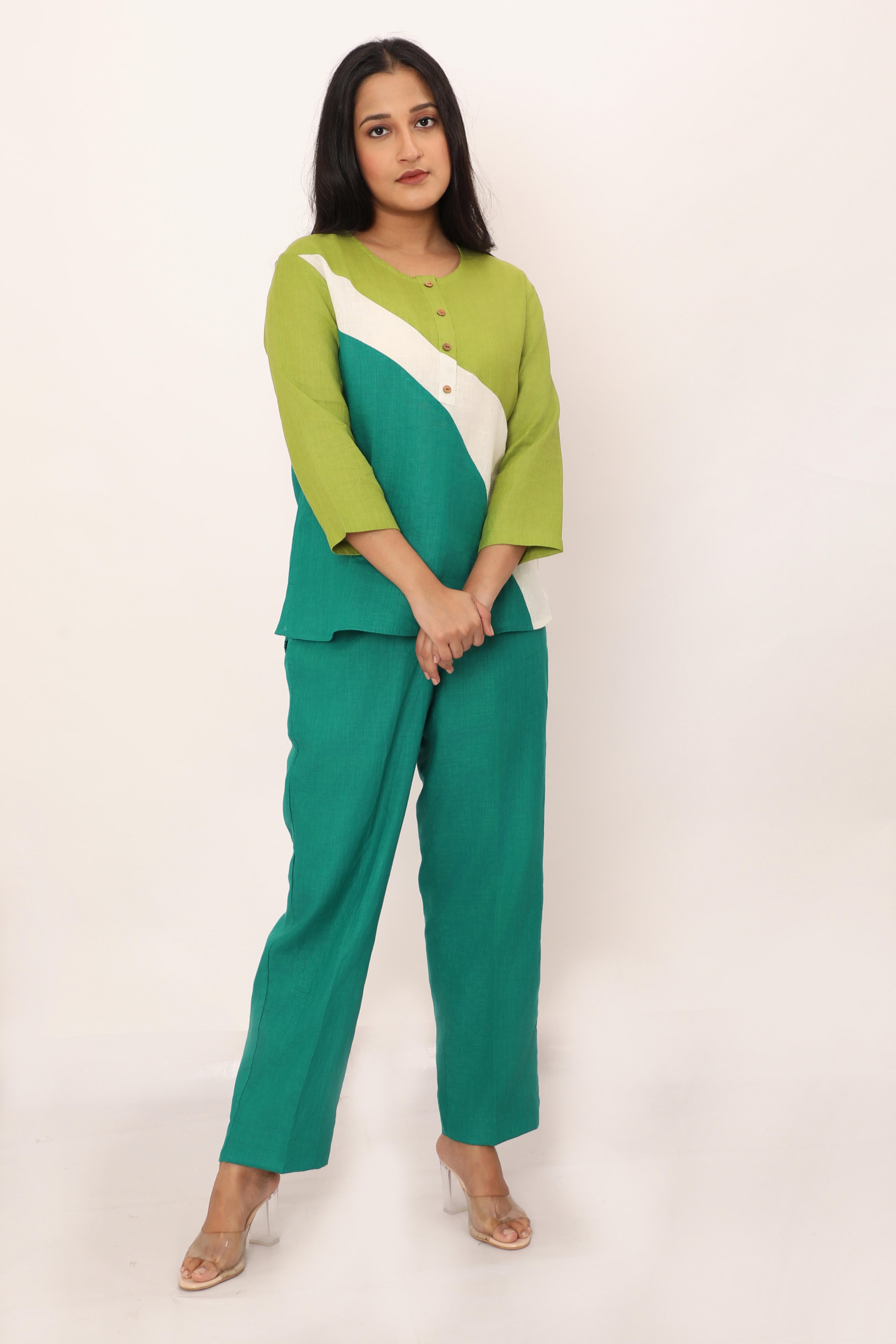 The Brianna set brings a fresh touch of vibrancy and elegance to your everyday wardrobe. Designed with thoughtful colour blocking, this co-ord set is crafted from breathable linen fabric, ensuring all-day comfort and style. The top features a relaxed fit with three-quarter sleeves and button detailing, while the straight-fit pants offer ease of movement, making it a perfect choice for both casual and semi-formal occasions.