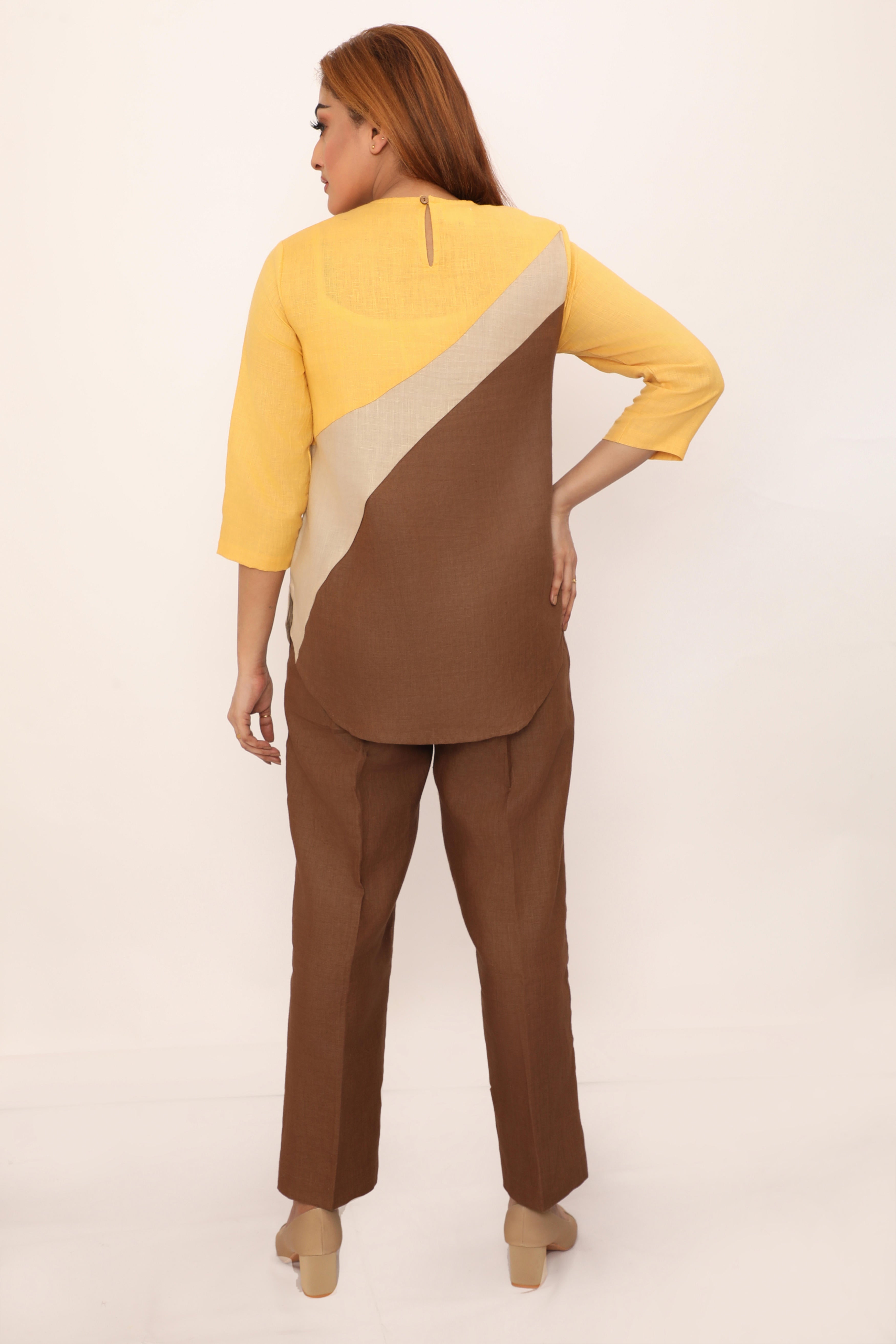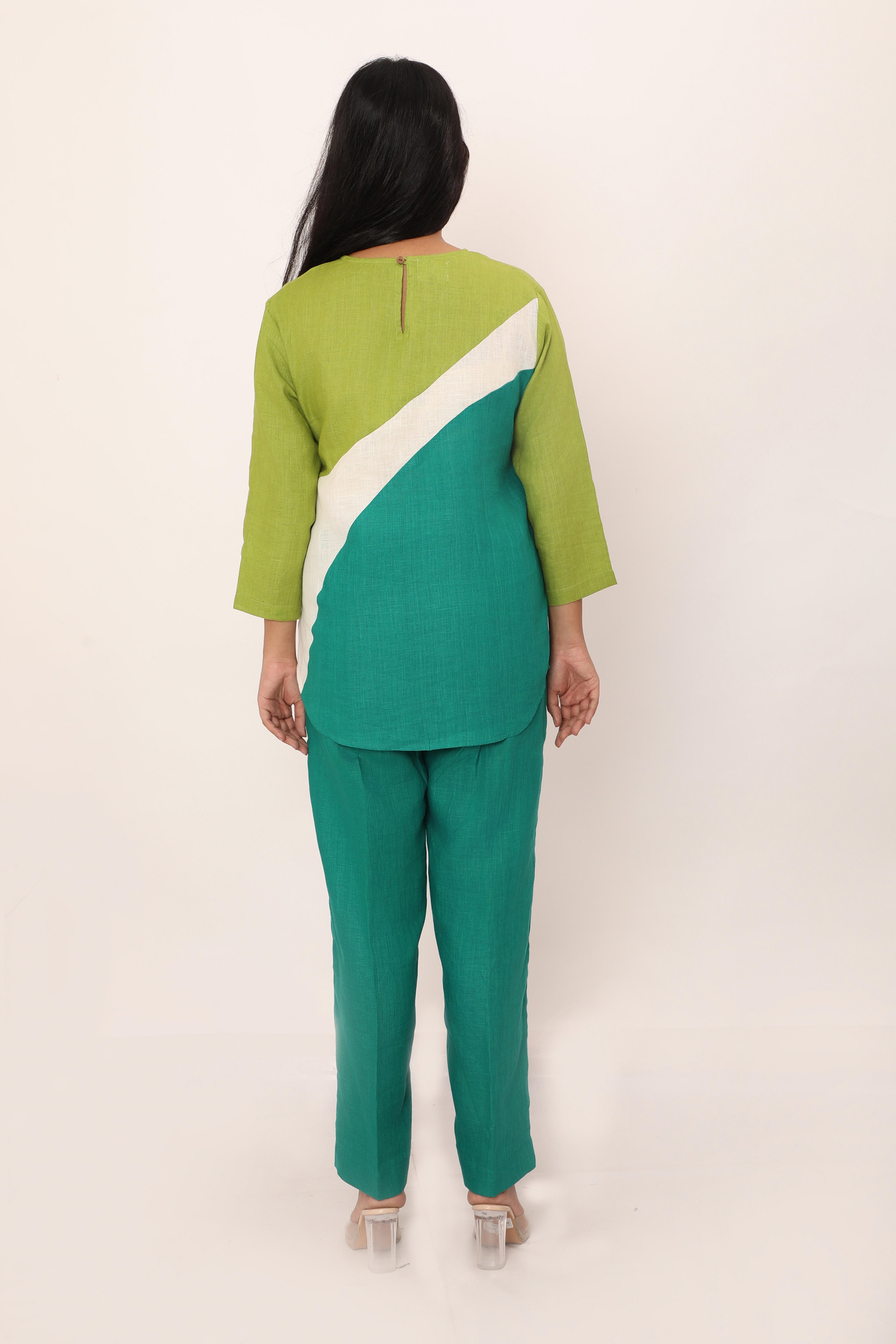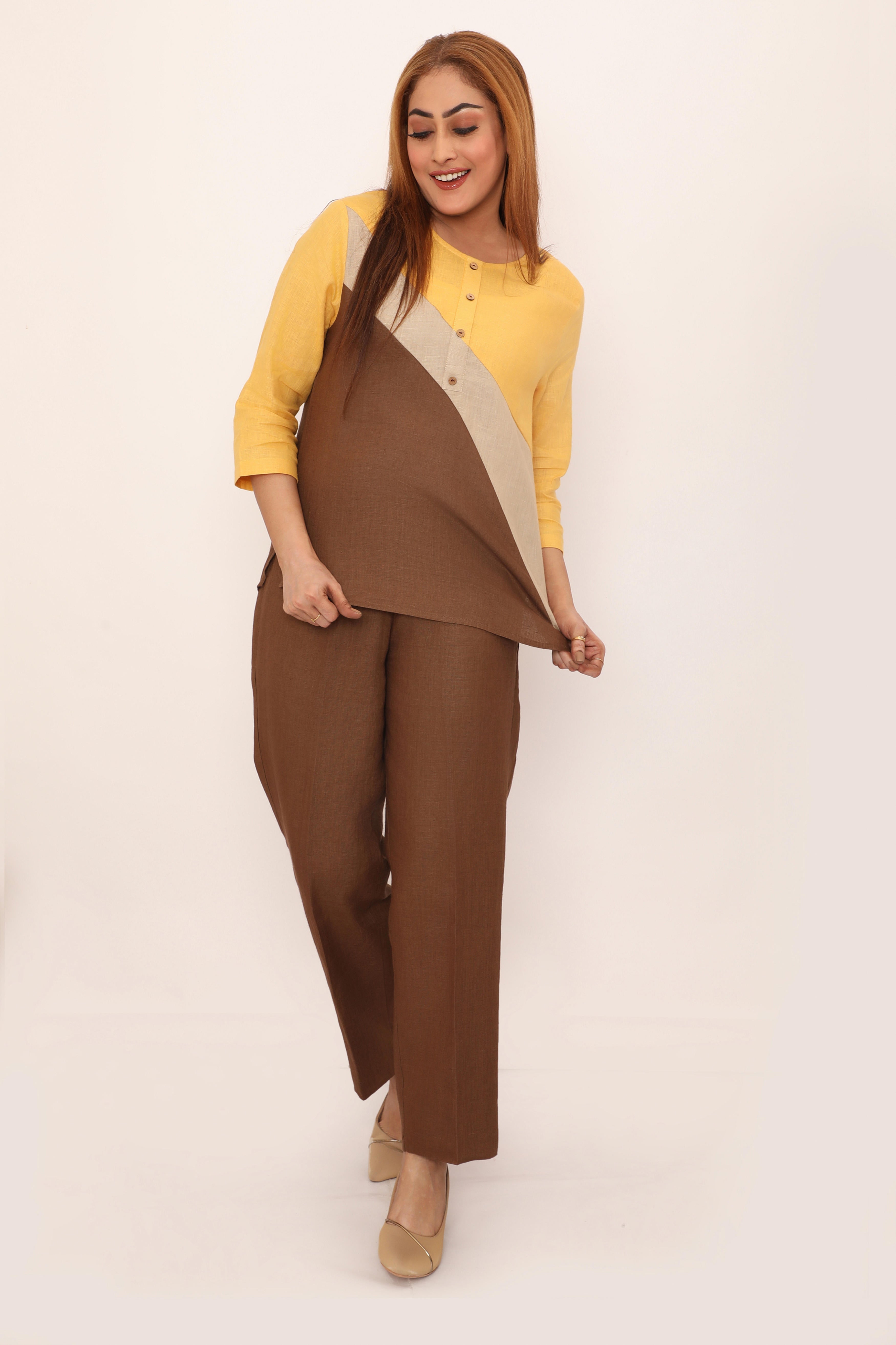 The Brianna set brings a fresh touch of vibrancy and elegance to your everyday wardrobe. Designed with thoughtful colour blocking, this co-ord set is crafted from breathable linen fabric, ensuring all-day comfort and style. The top features a relaxed fit with three-quarter sleeves and button detailing, while the straight-fit pants offer ease of movement, making it a perfect choice for both casual and semi-formal occasions.