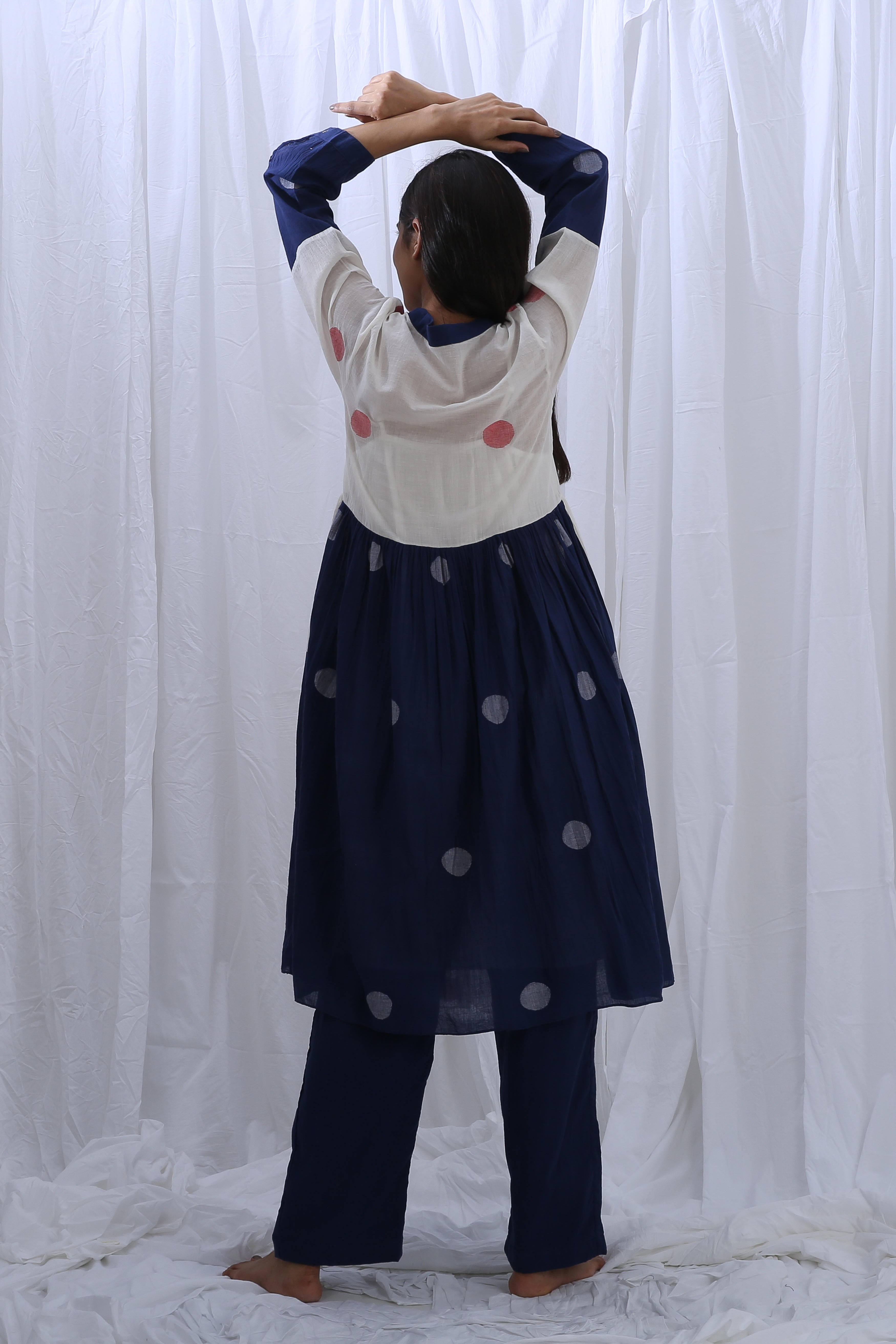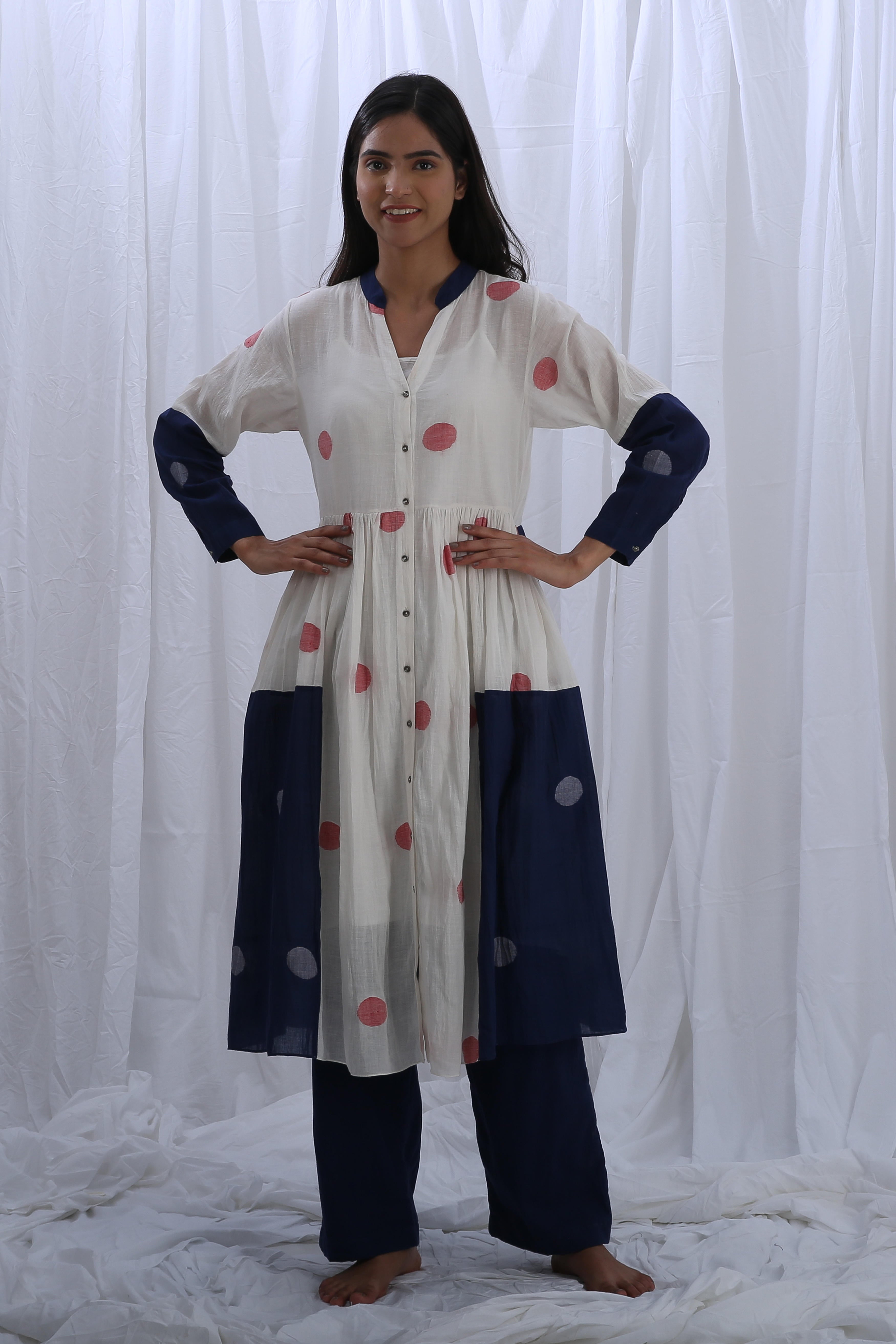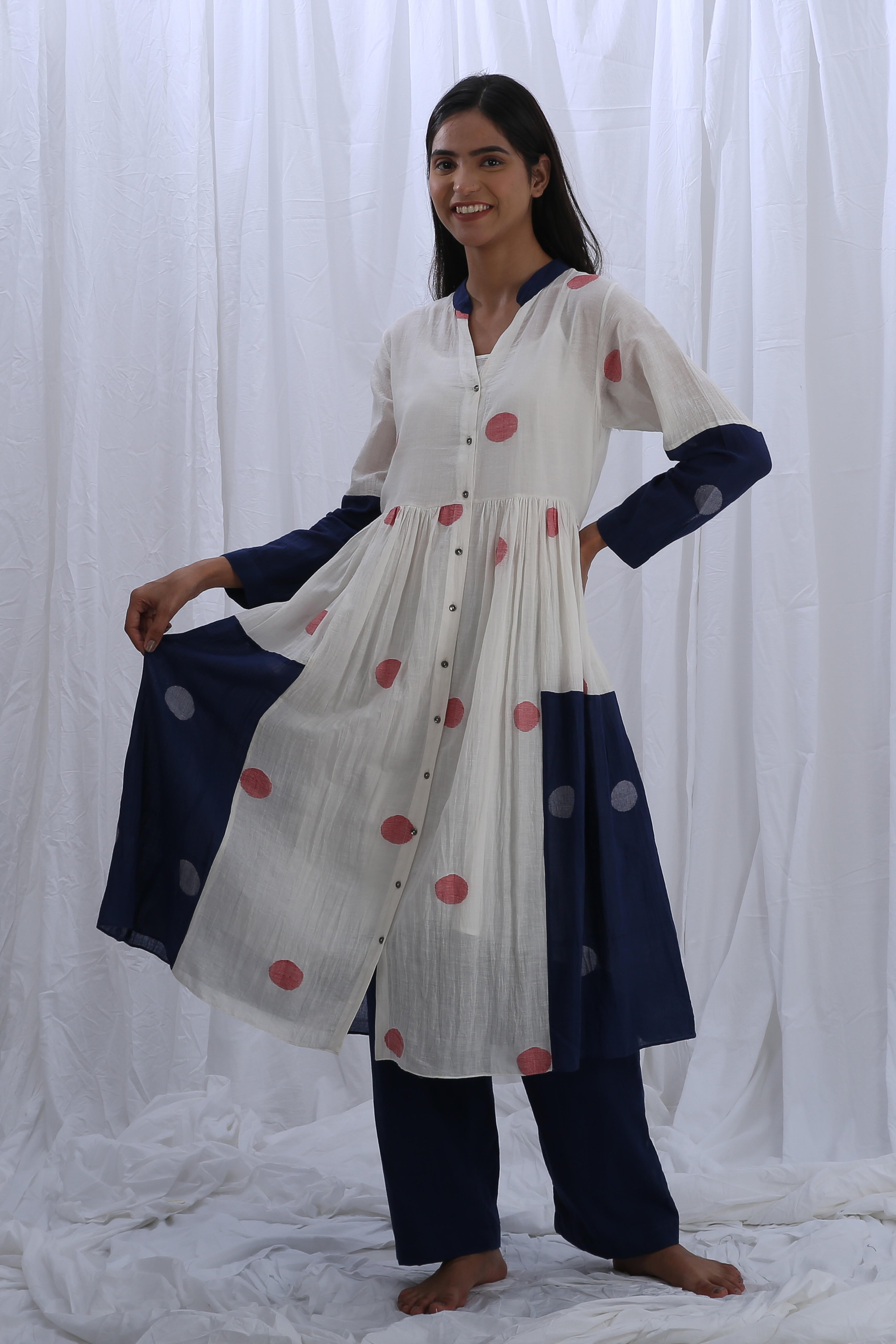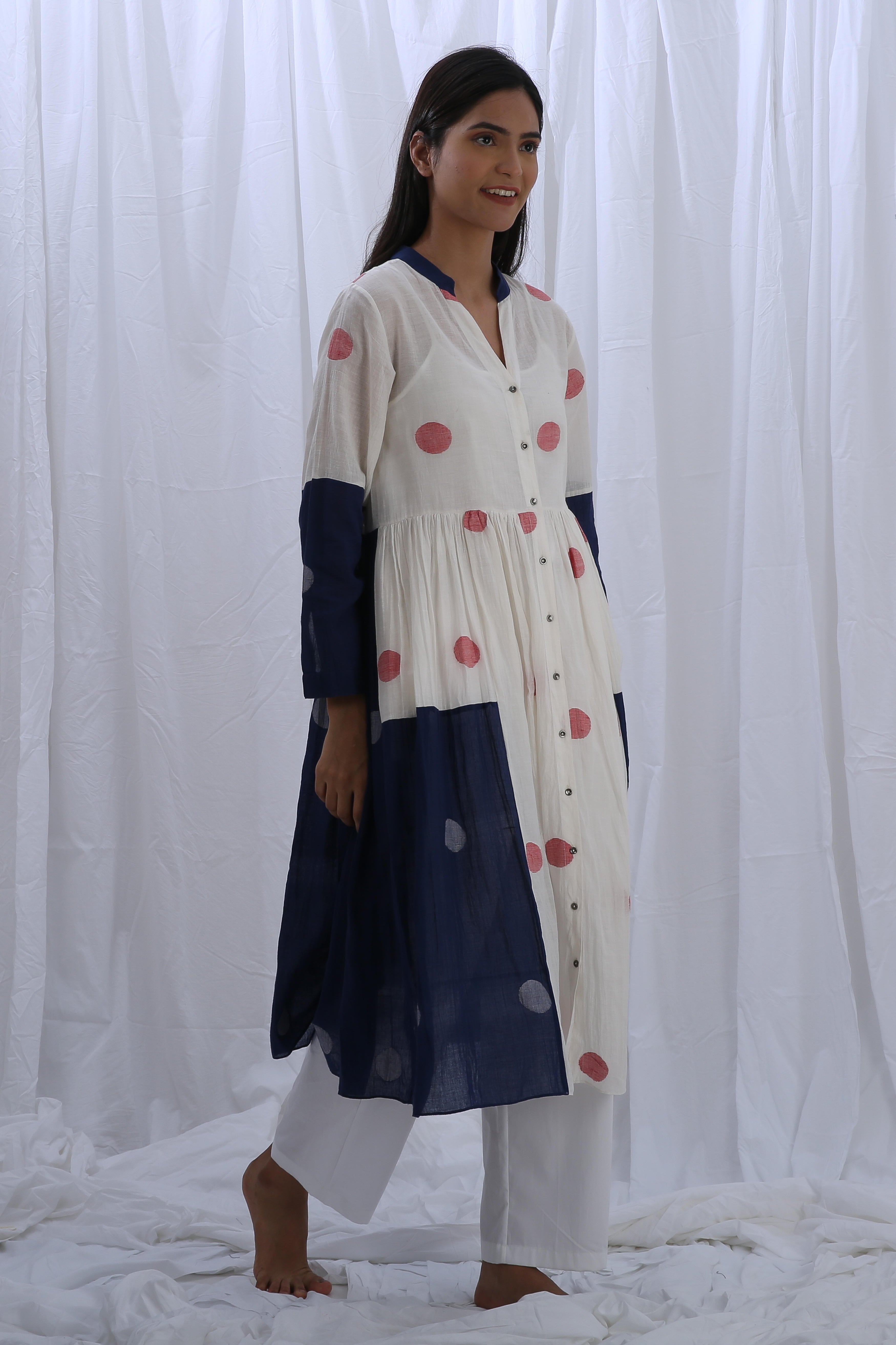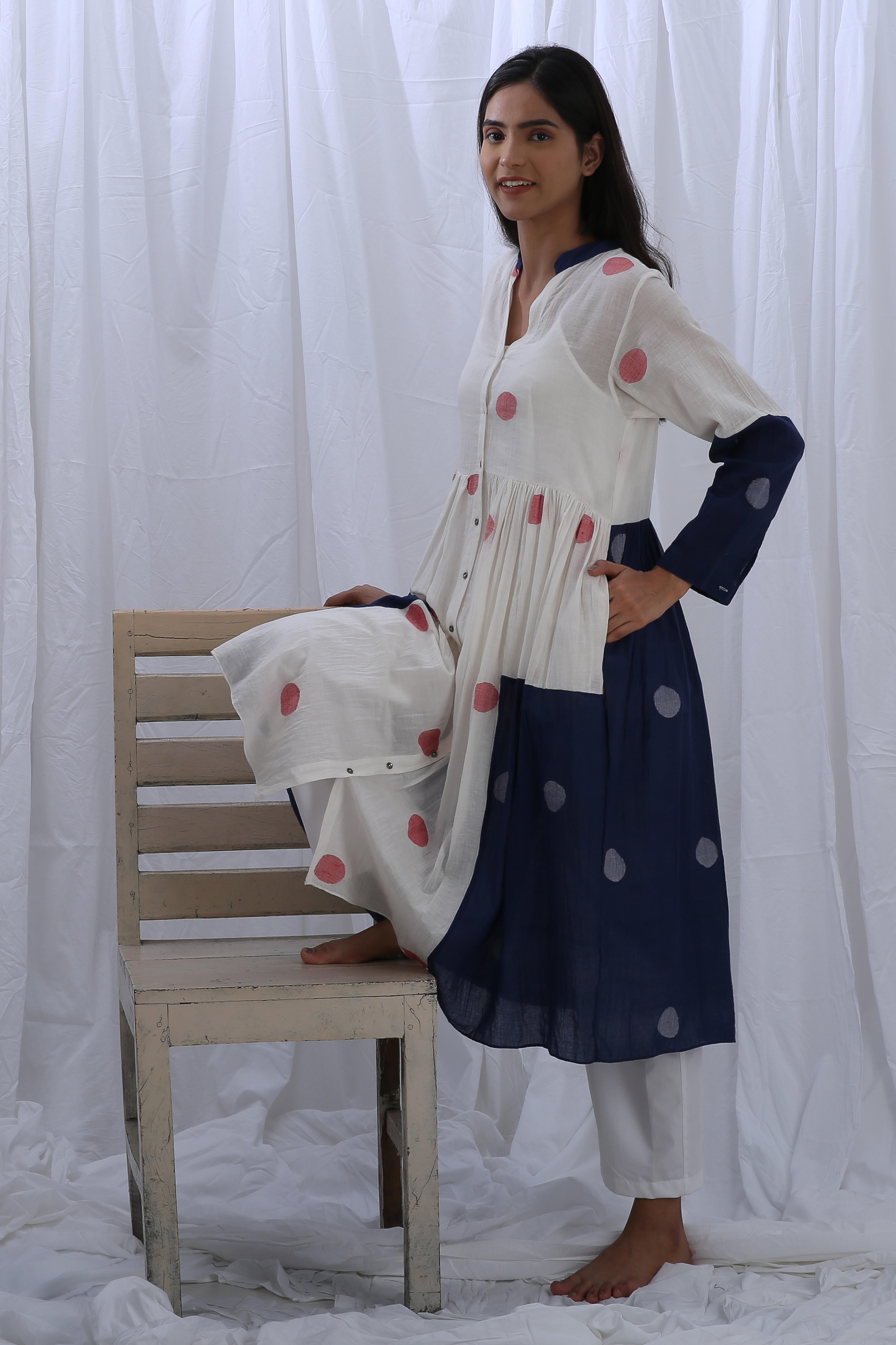 This elegant Handloom Cotton dress in Bright White and Indigo Blue features beautiful gathers on the bottom, adding texture and flow. The Shirt Length is 44 inches, and the Bottom Length is 38 inches, creating a flattering fit for any occasion. Our model, who is 5'8" tall, is wearing a size S.