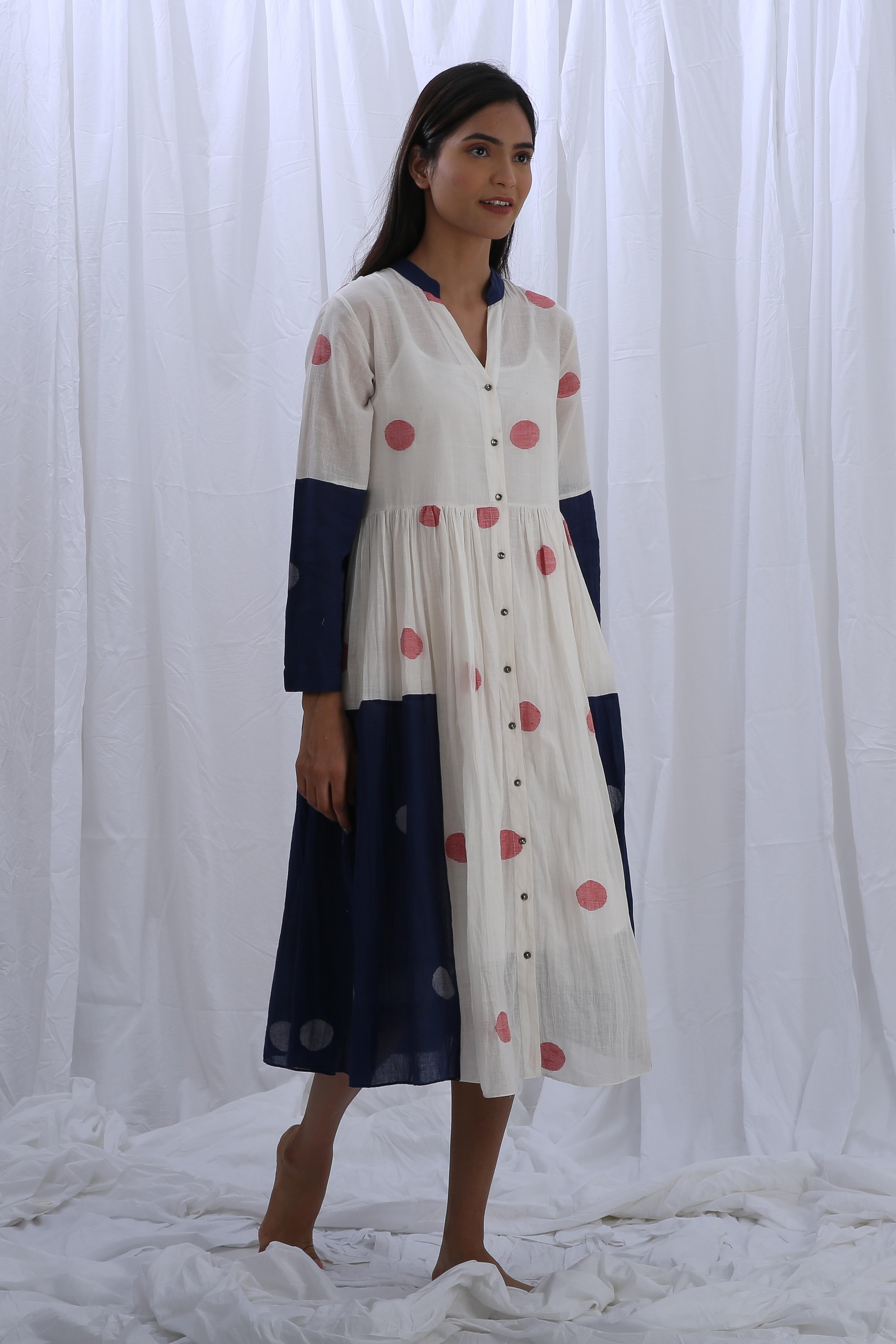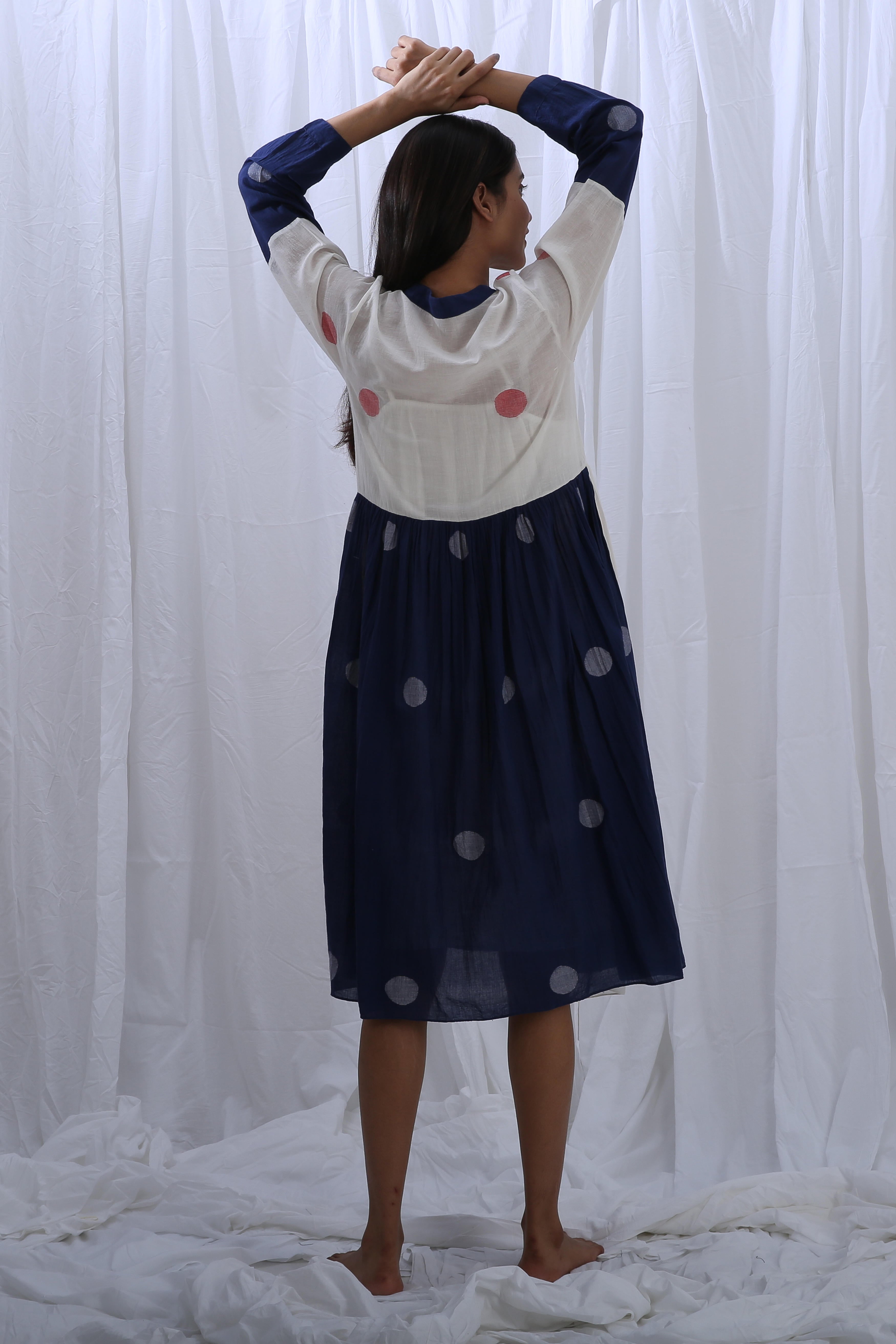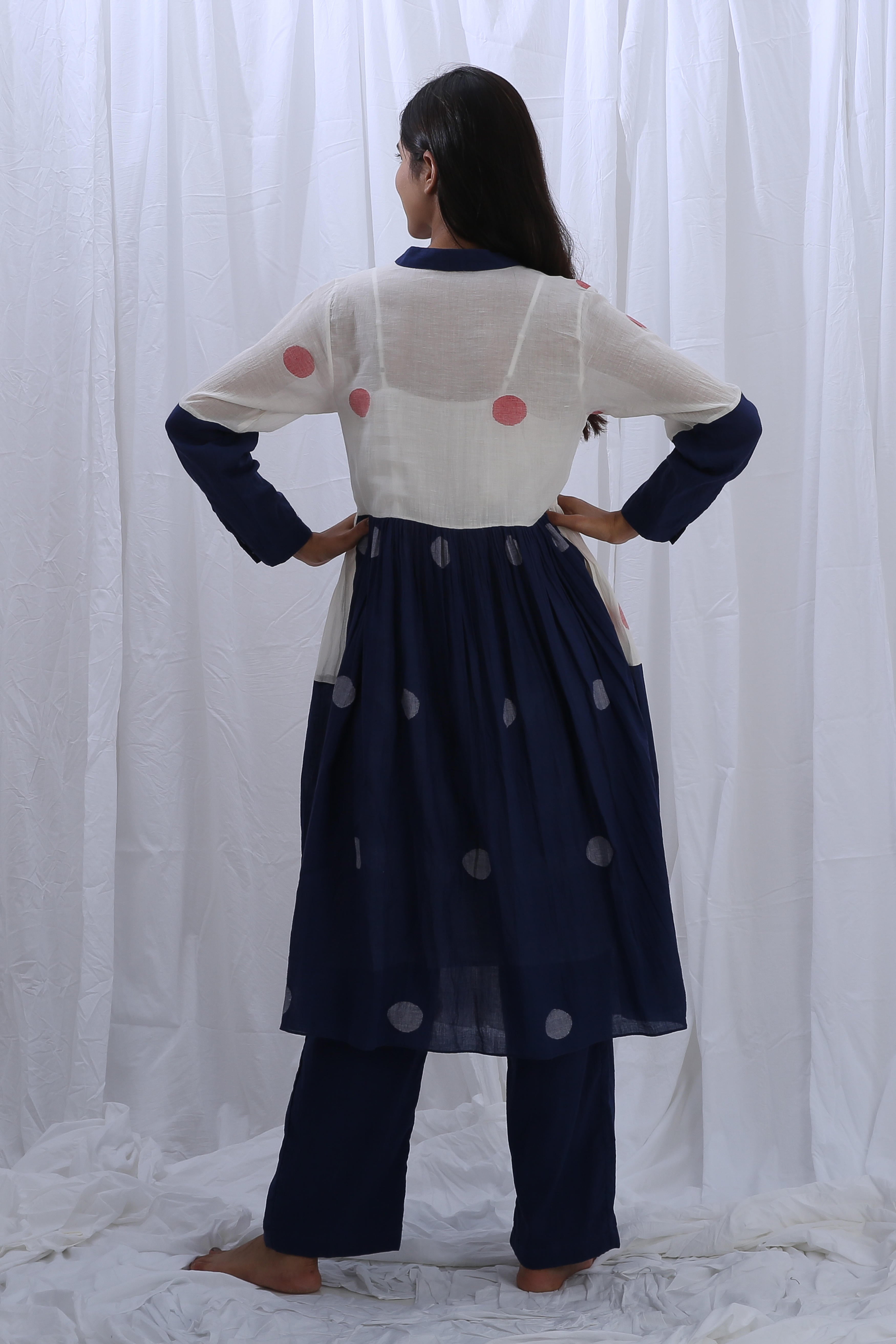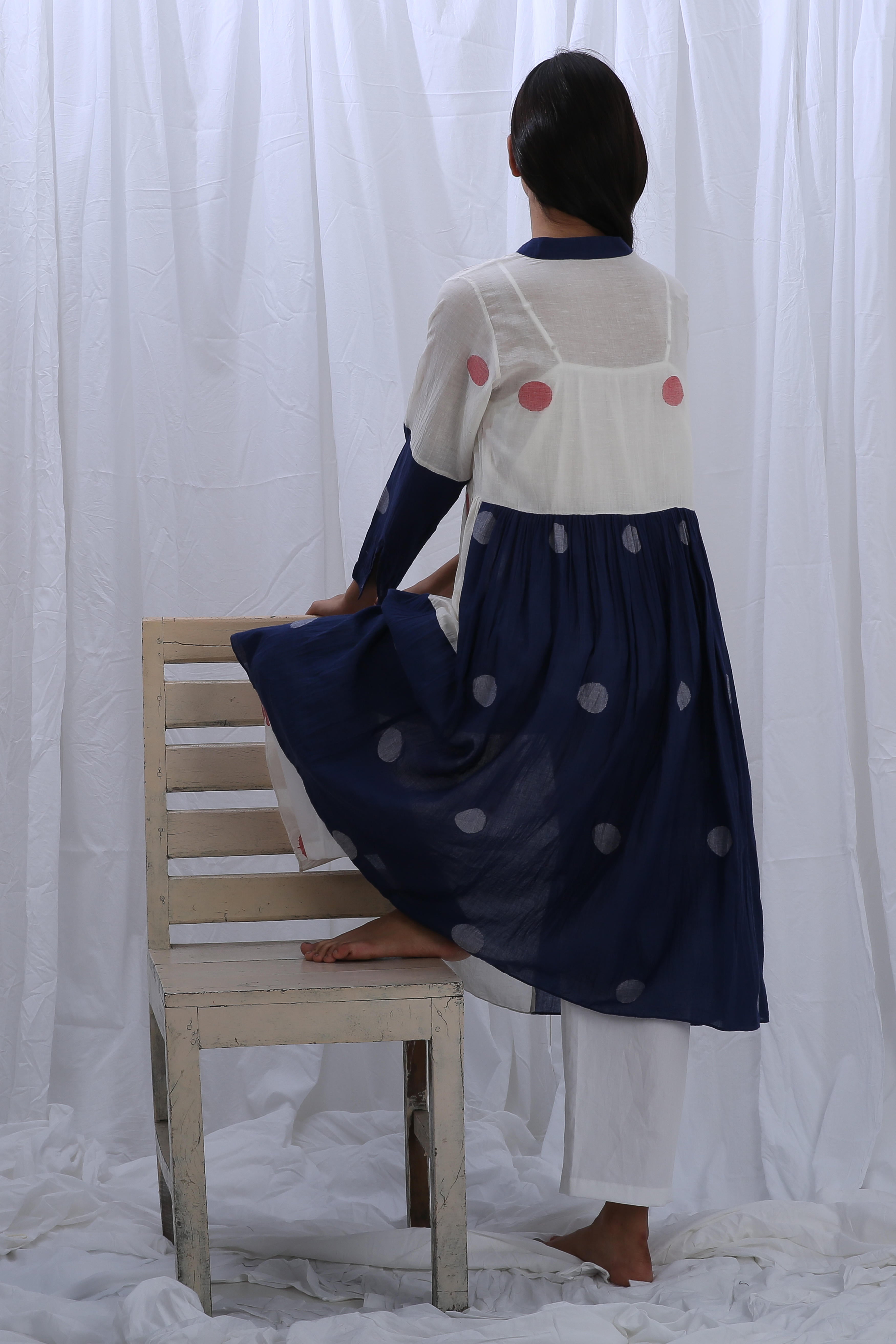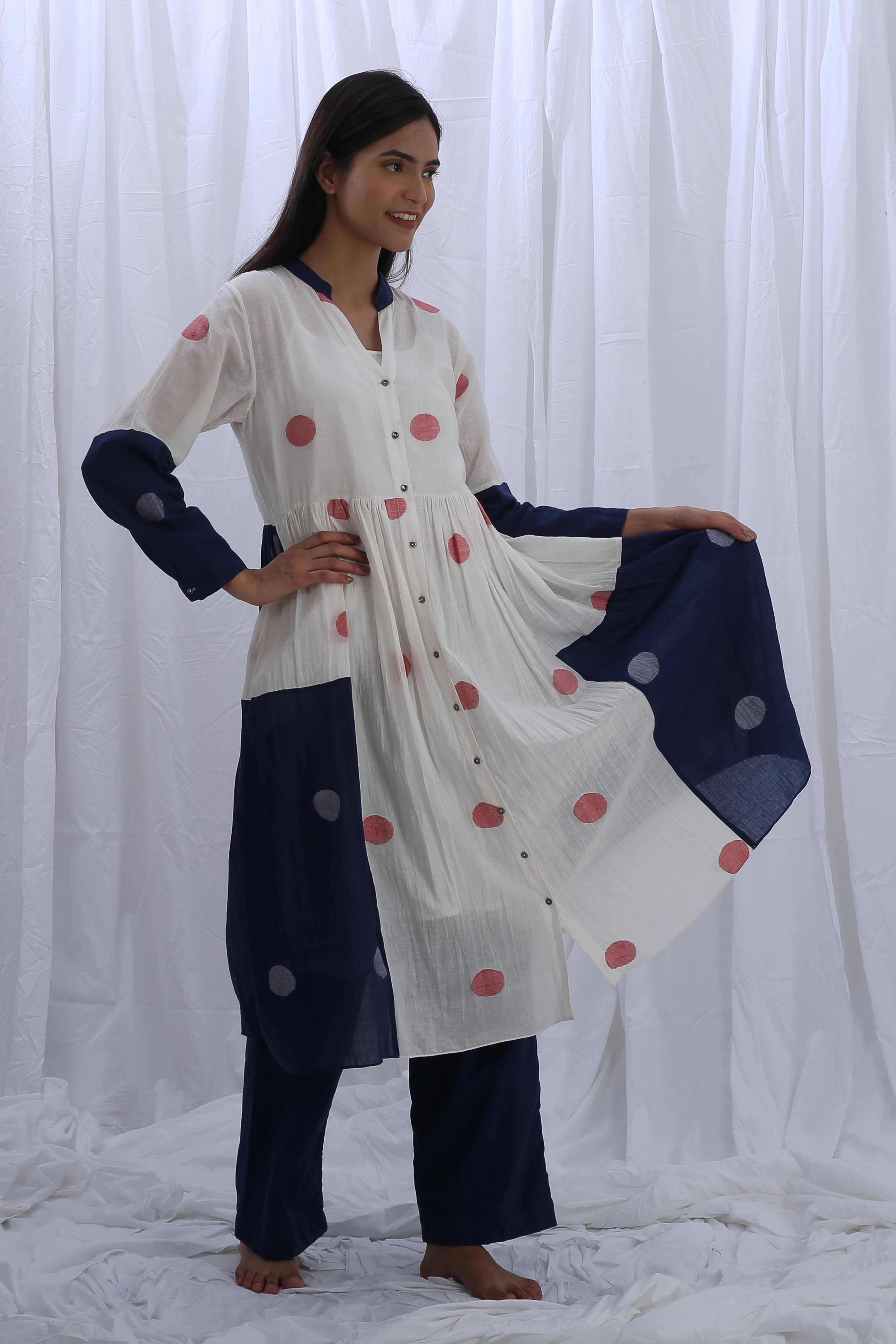 This elegant Handloom Cotton dress in Bright White and Indigo Blue features beautiful gathers on the bottom, adding texture and flow. The Shirt Length is 44 inches, and the Bottom Length is 38 inches, creating a flattering fit for any occasion. Our model, who is 5'8" tall, is wearing a size S.
