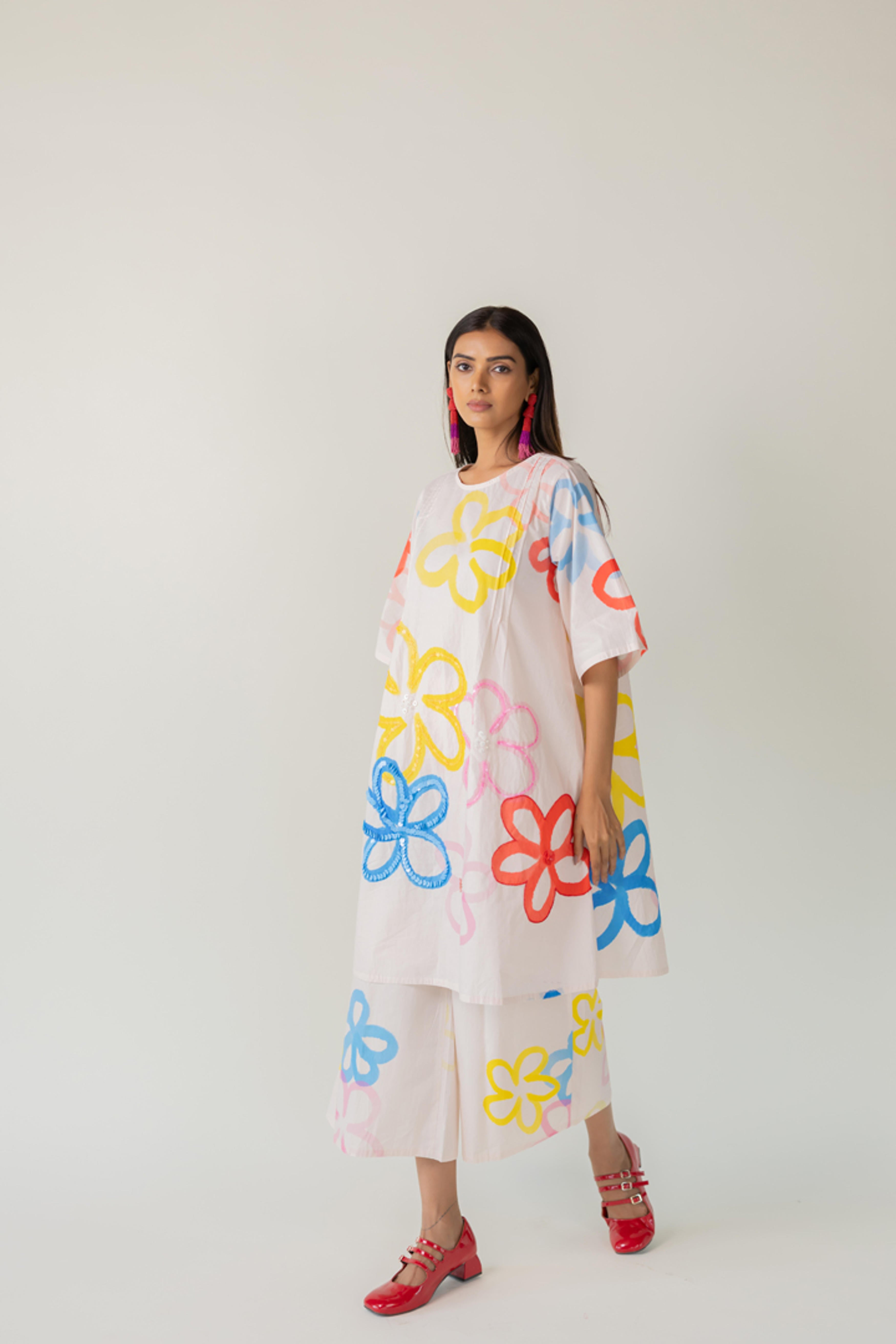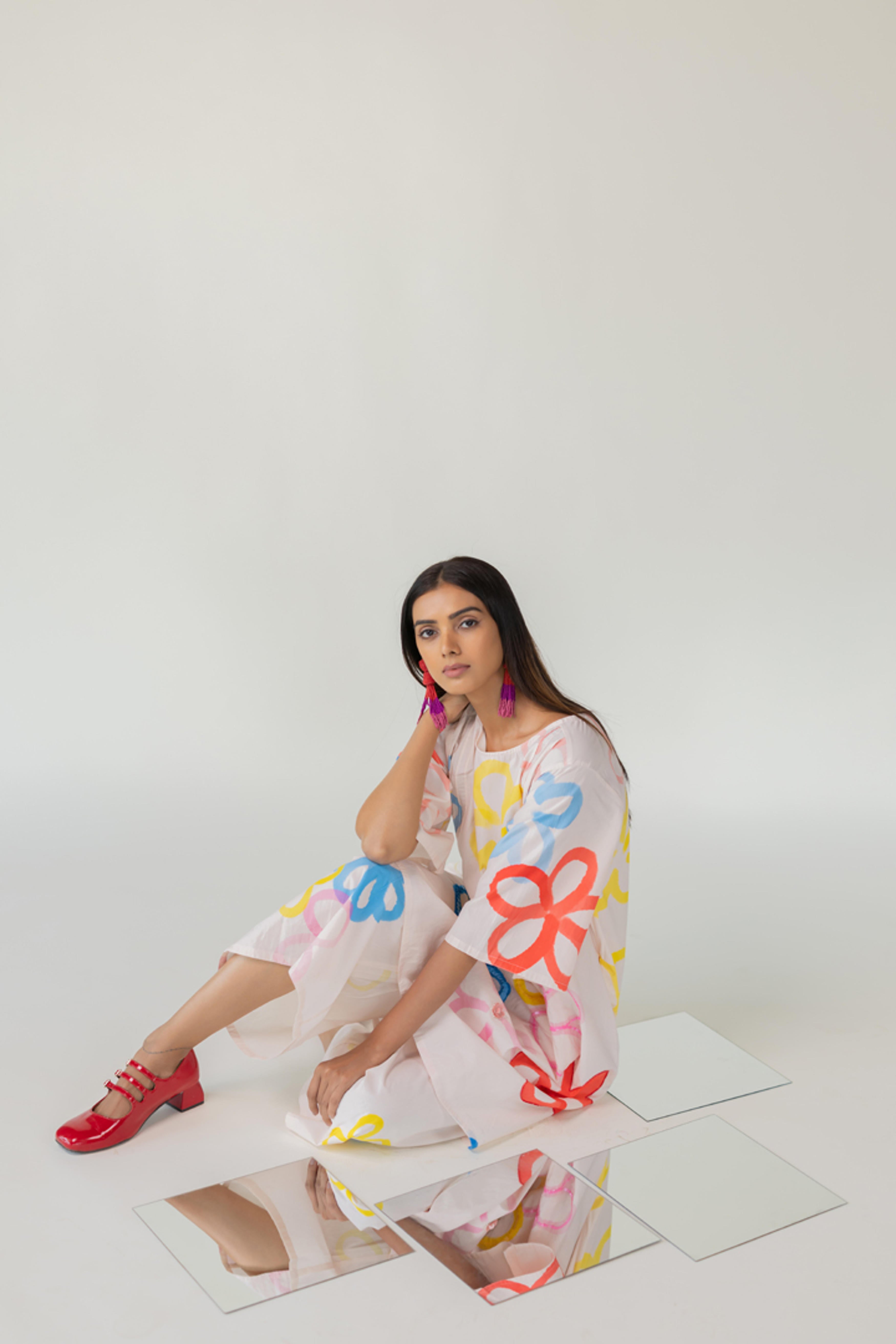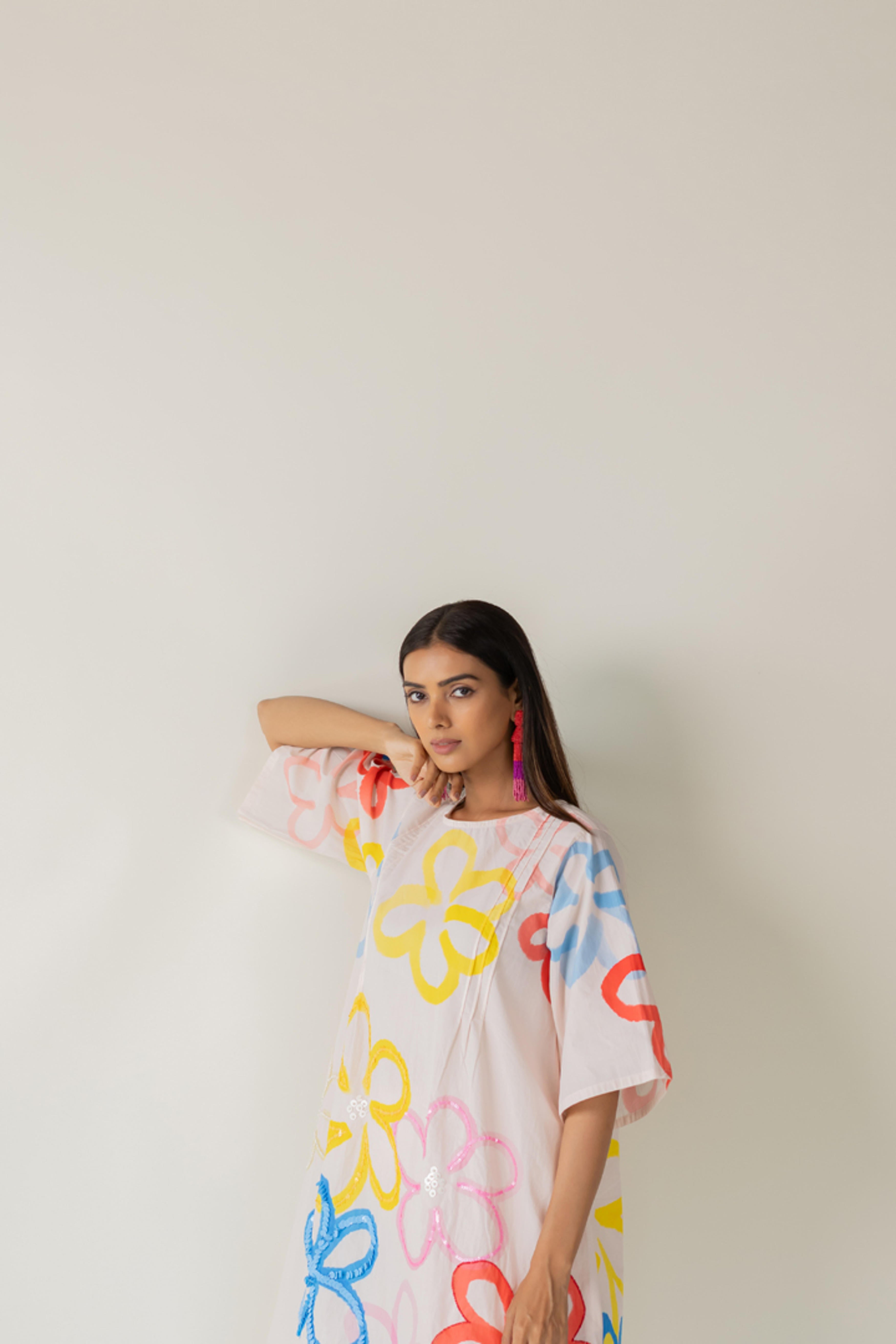 Let your playful side shine with our Bubble Bloom Embroidered Tunic ? a joyful celebration of color and carefree charm. This blush pink ensemble features hand-drawn, oversized floral motifs in vibrant primary hues, screen printed for a bold statement. Model is 5?7? and wearing size M Length- 38"