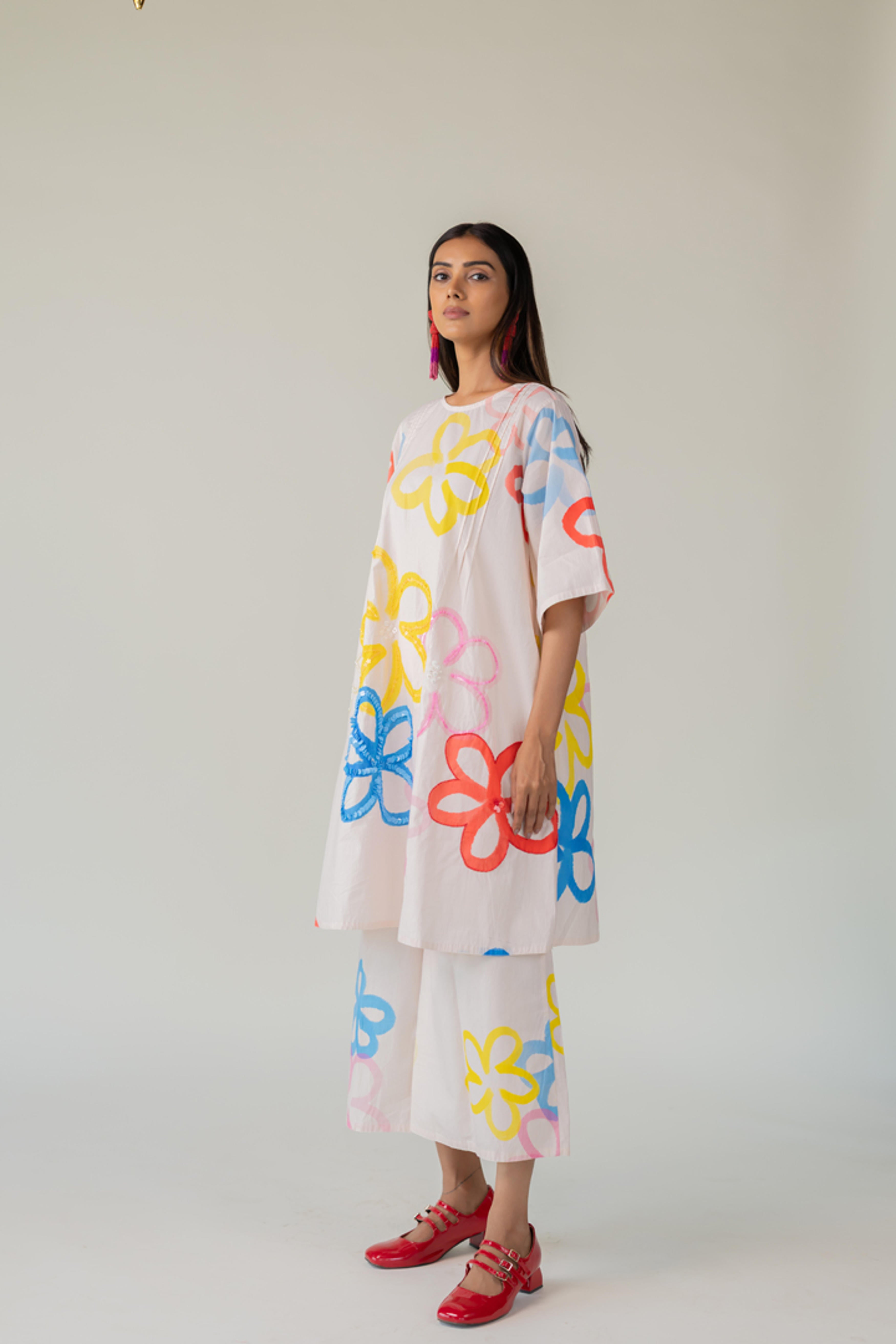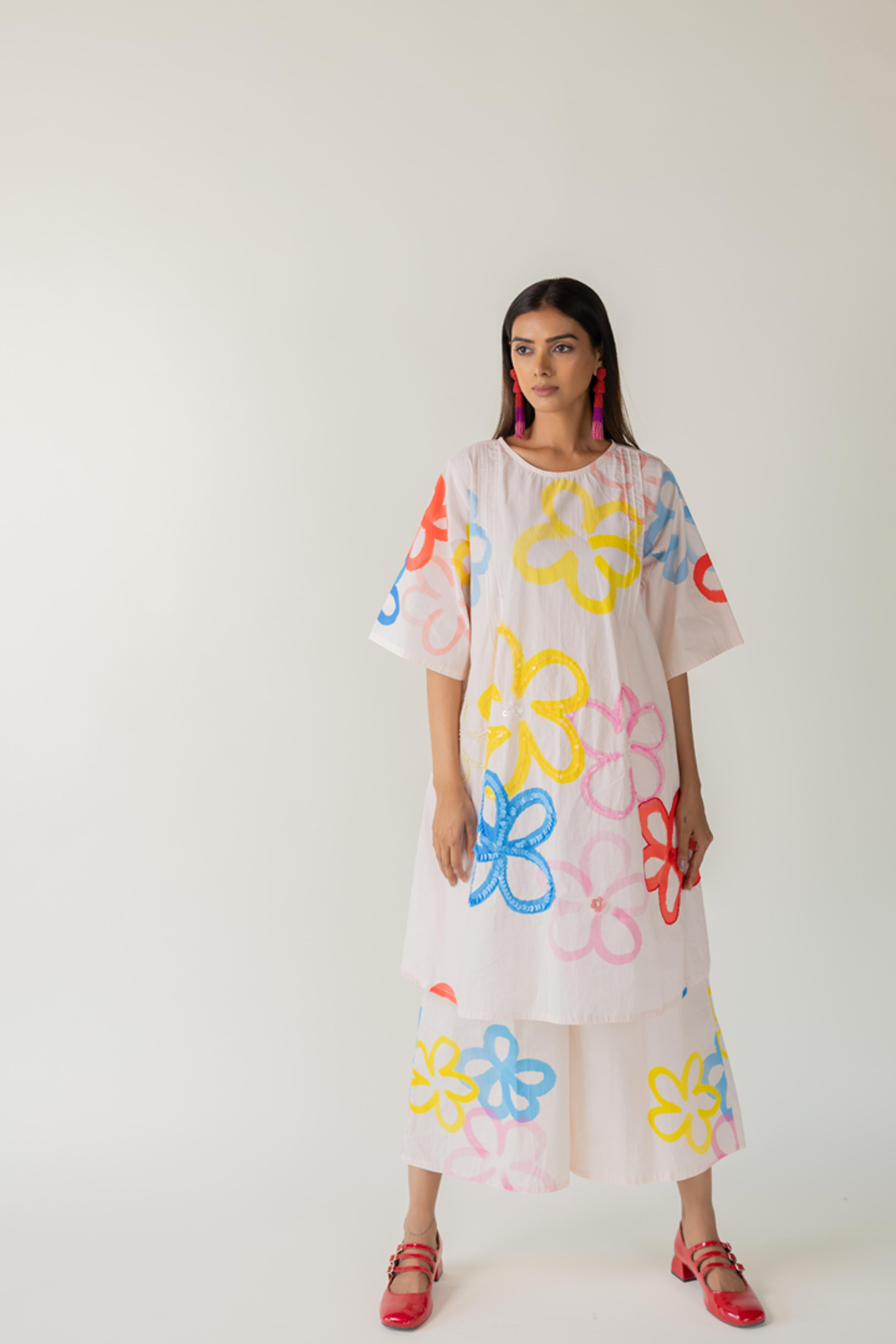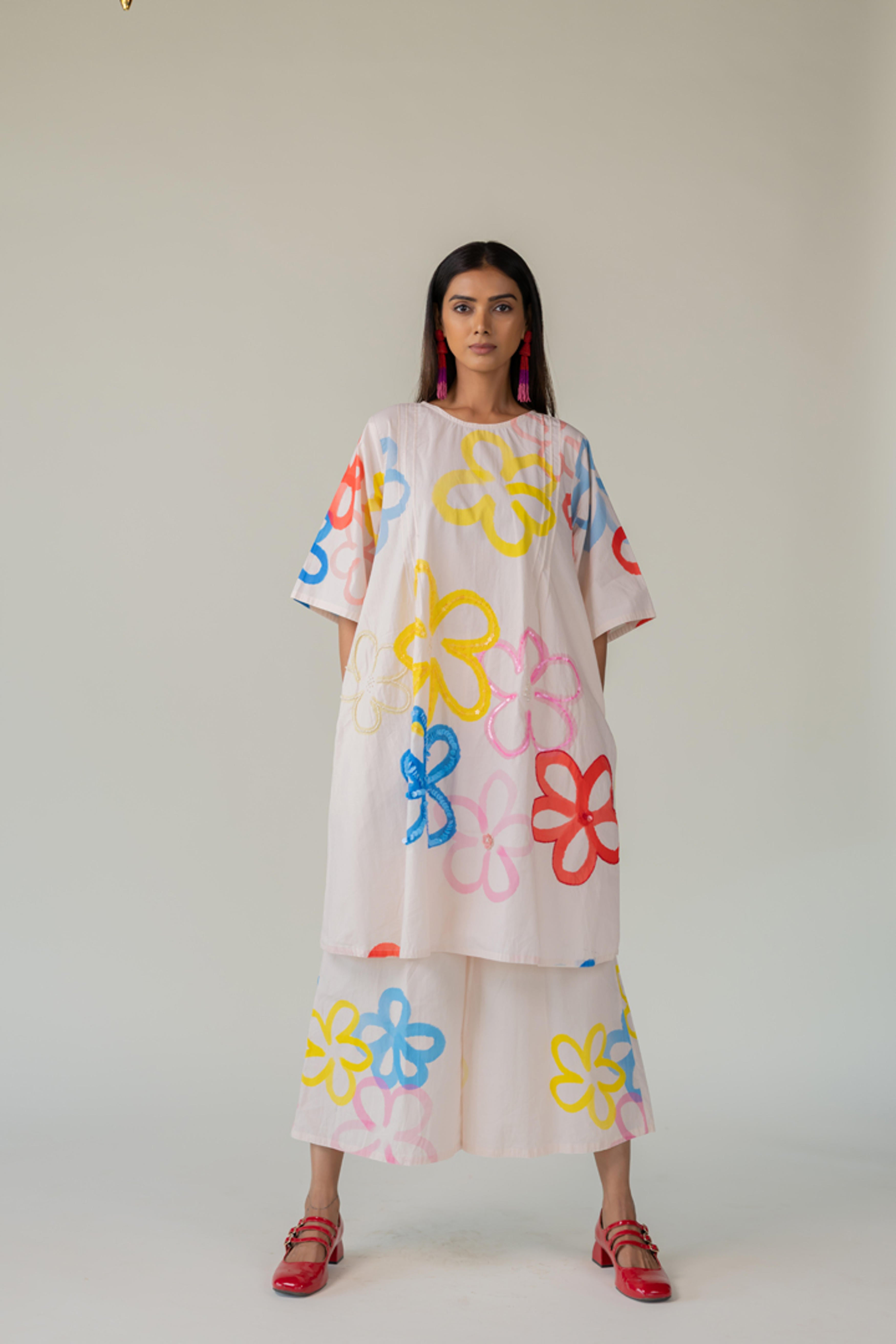 Let your playful side shine with our Bubble Bloom Embroidered Tunic ? a joyful celebration of color and carefree charm. This blush pink ensemble features hand-drawn, oversized floral motifs in vibrant primary hues, screen printed for a bold statement. Model is 5?7? and wearing size M Length- 38"