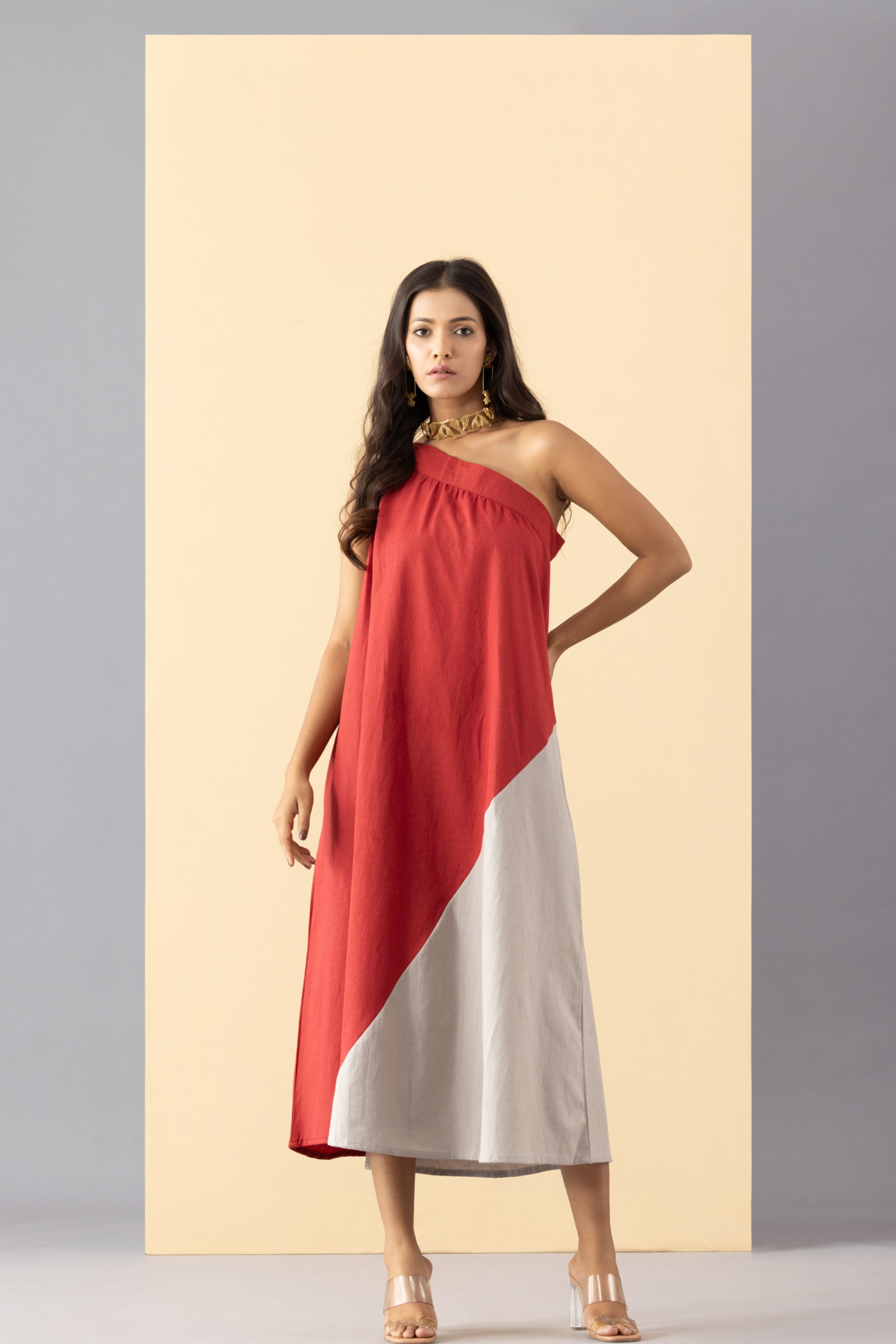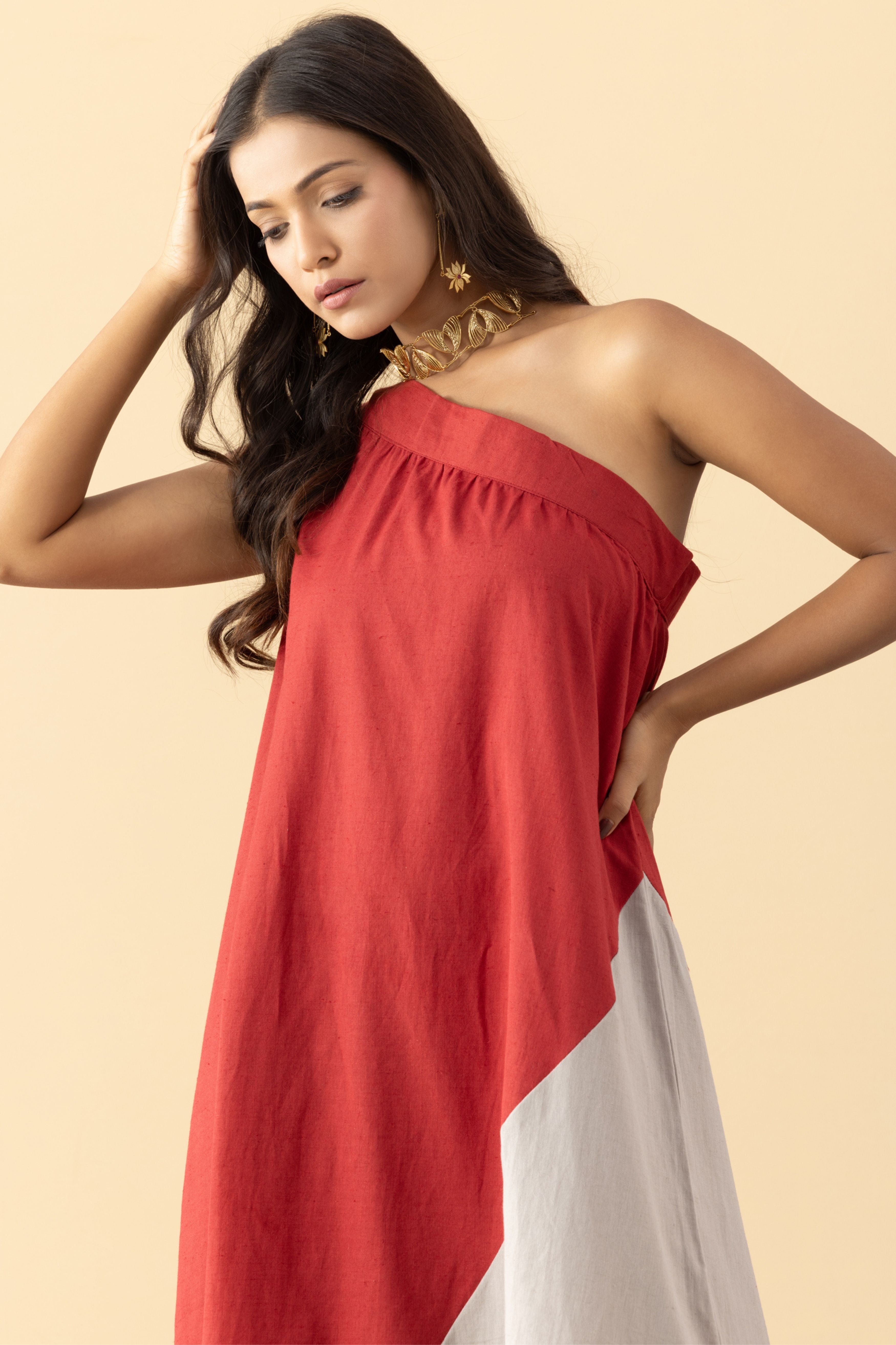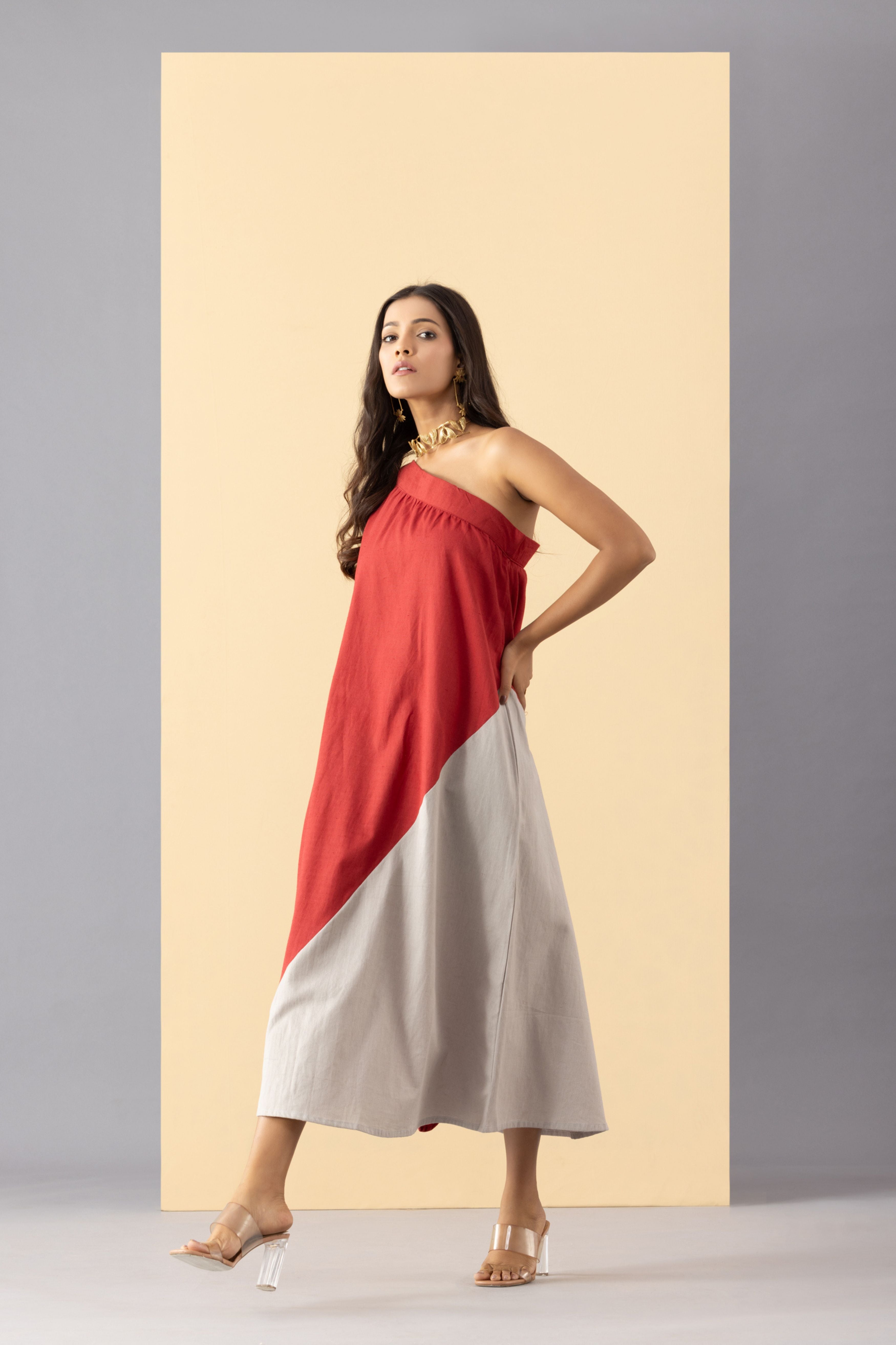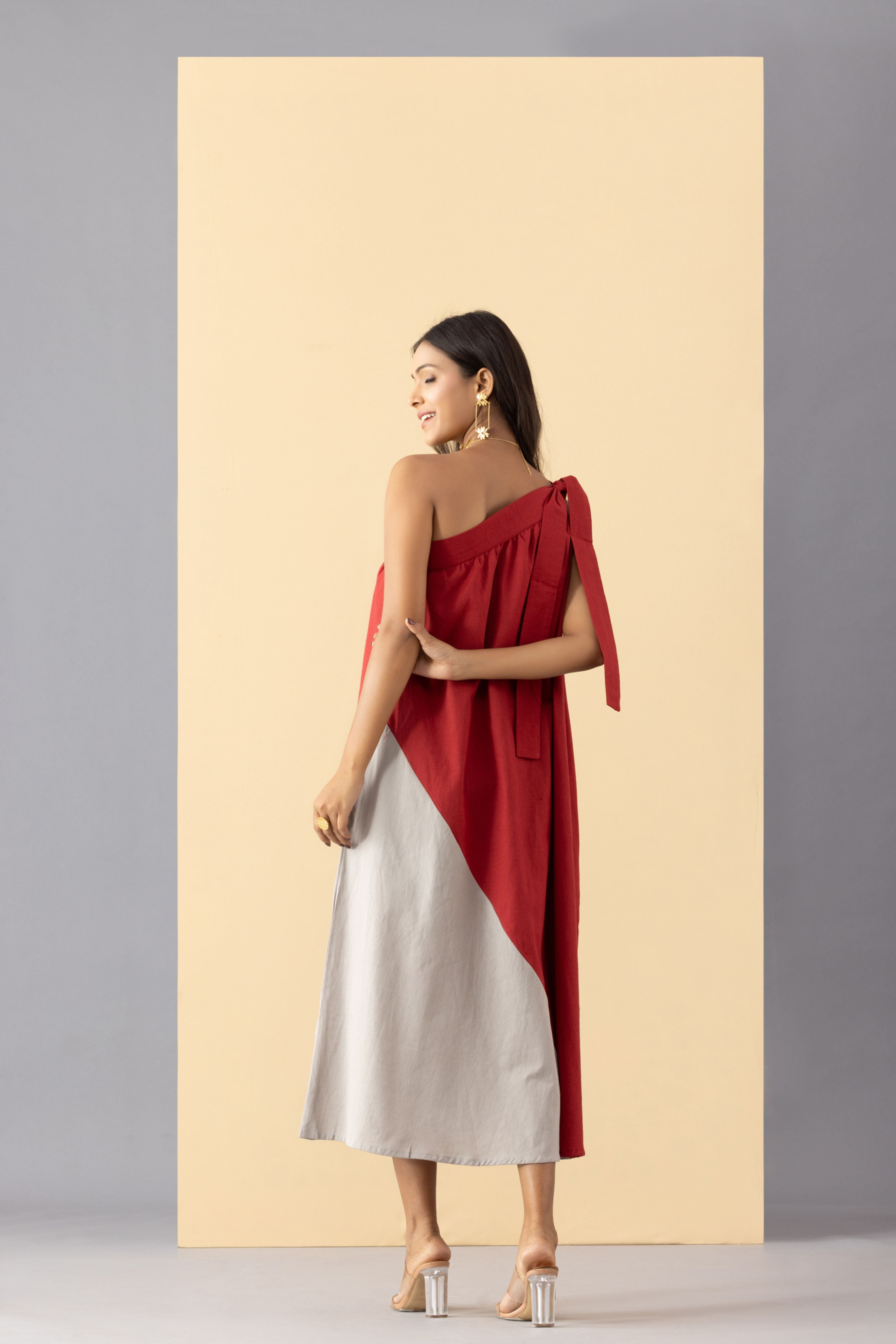 Buna tie dress is designed in 2 tones of scarlet red and grey , it is a one-shoulder tie dress with broad belt tie-up. This season-less dress is perfect for any day/ night occasion. - One shoulder dress, side pockets - Can be tightened or kept lose on the shoulder as per your body measurements - Free size - Lose fit - Model is wearing size S - This is a textile fabric. The subtle imperfections in the weave, texture and colors are a natural outcome of handcrafted textiles and not a defect.