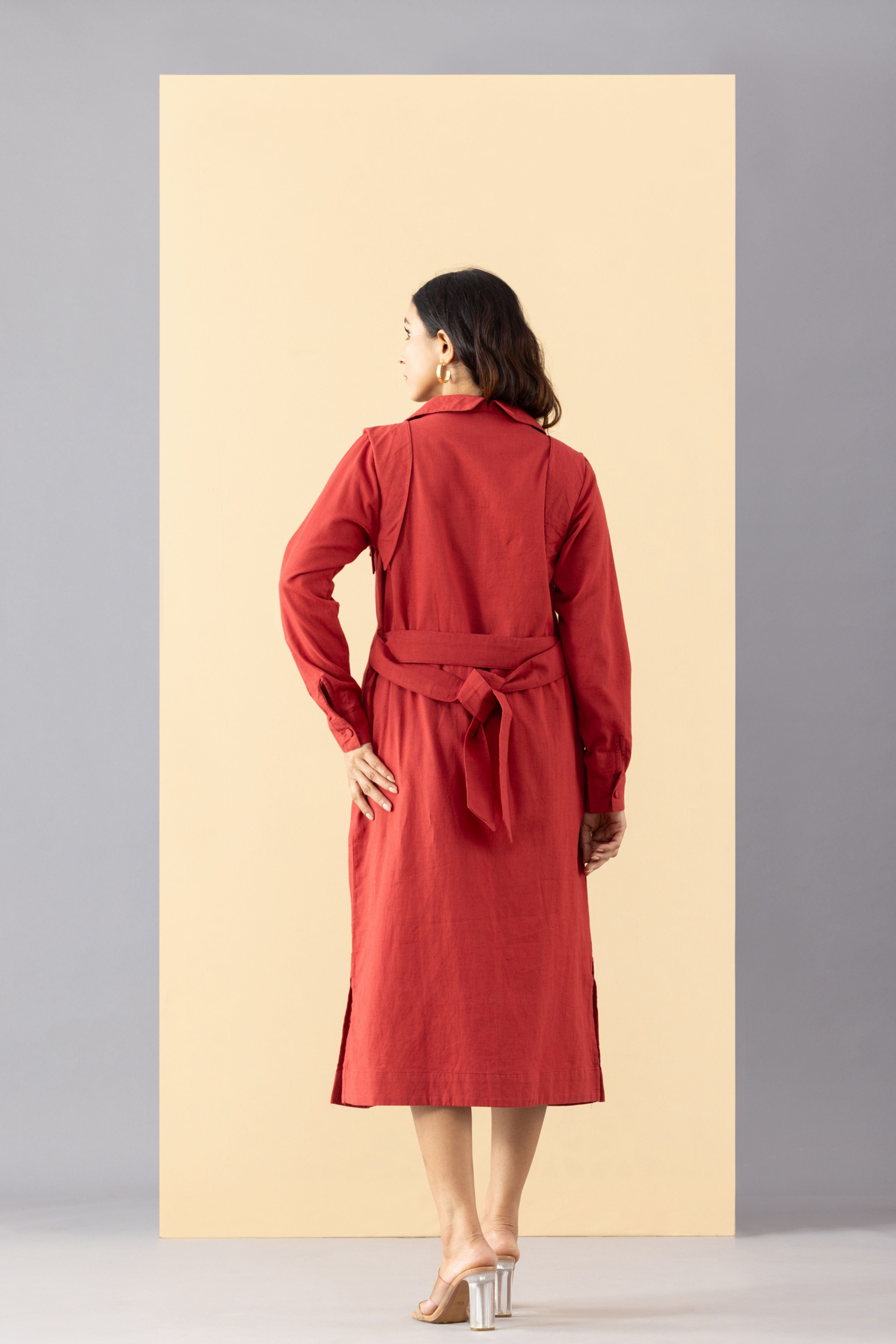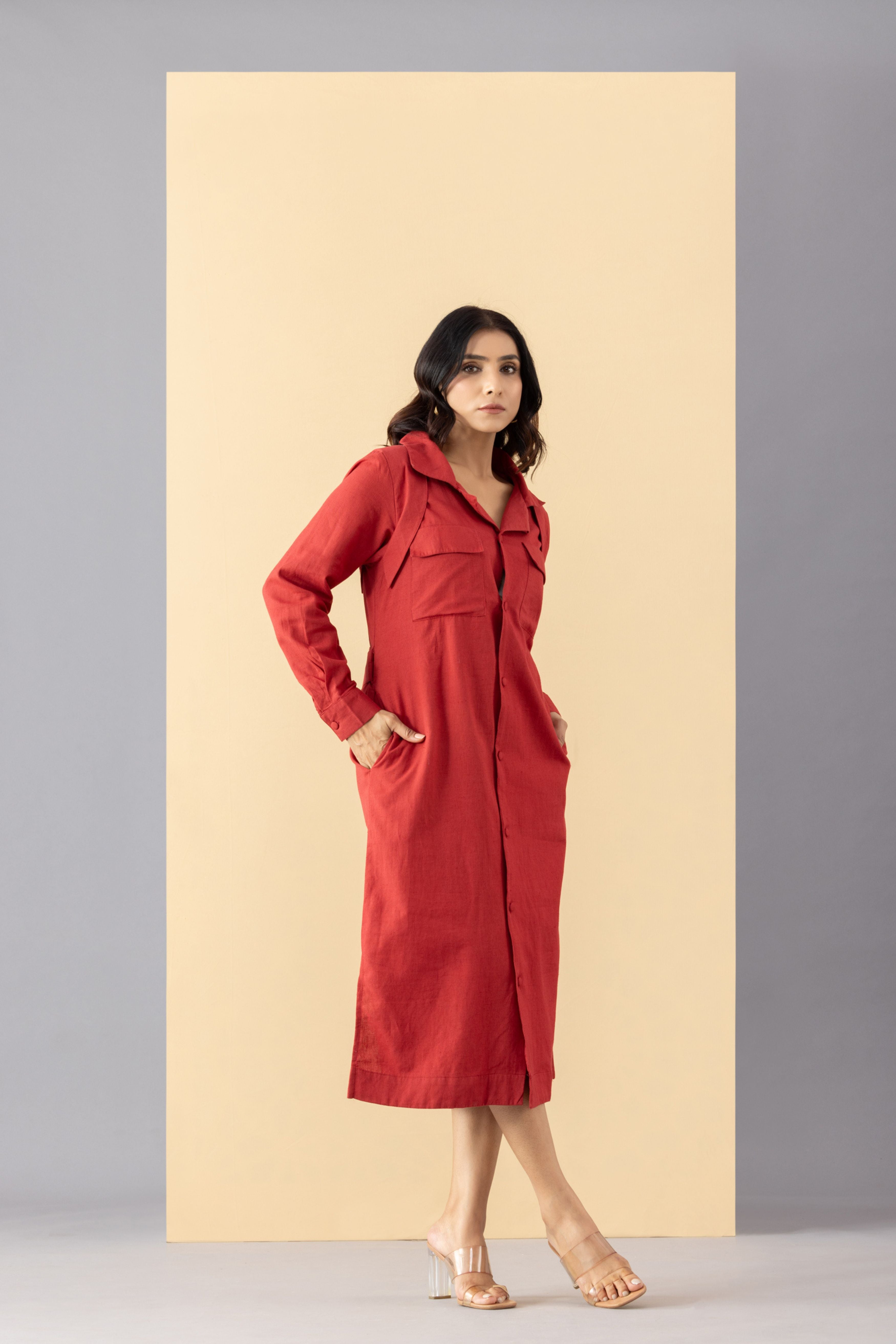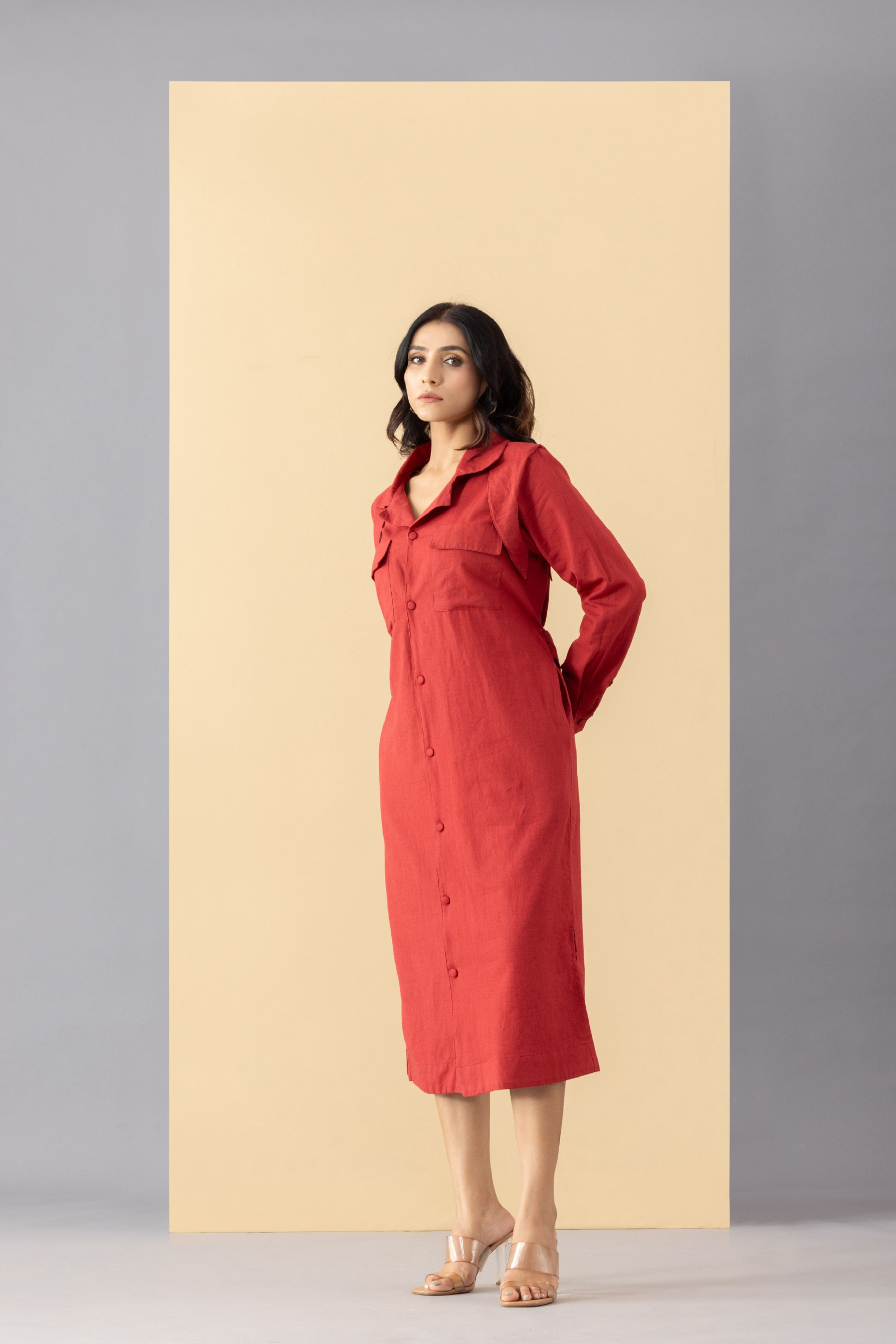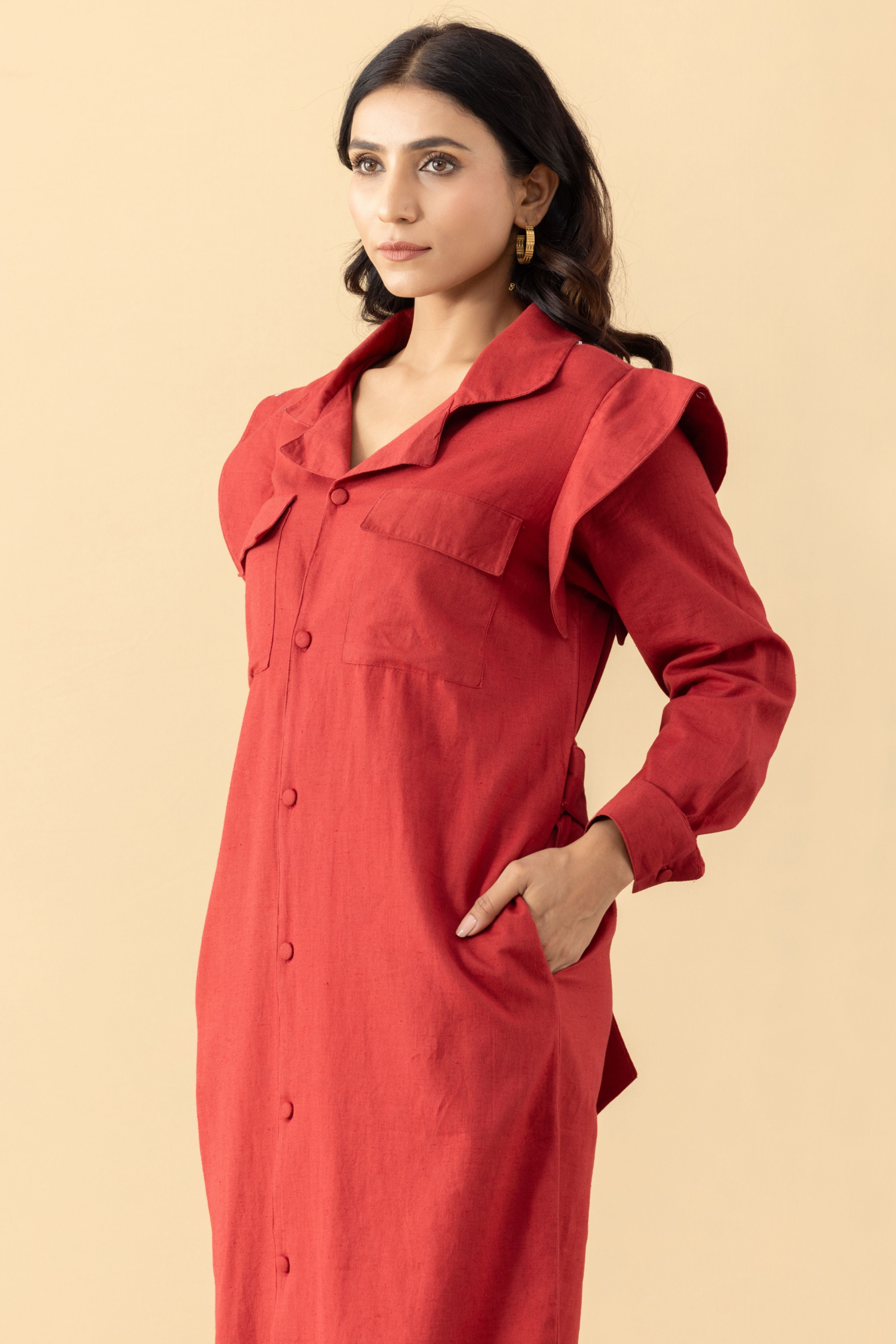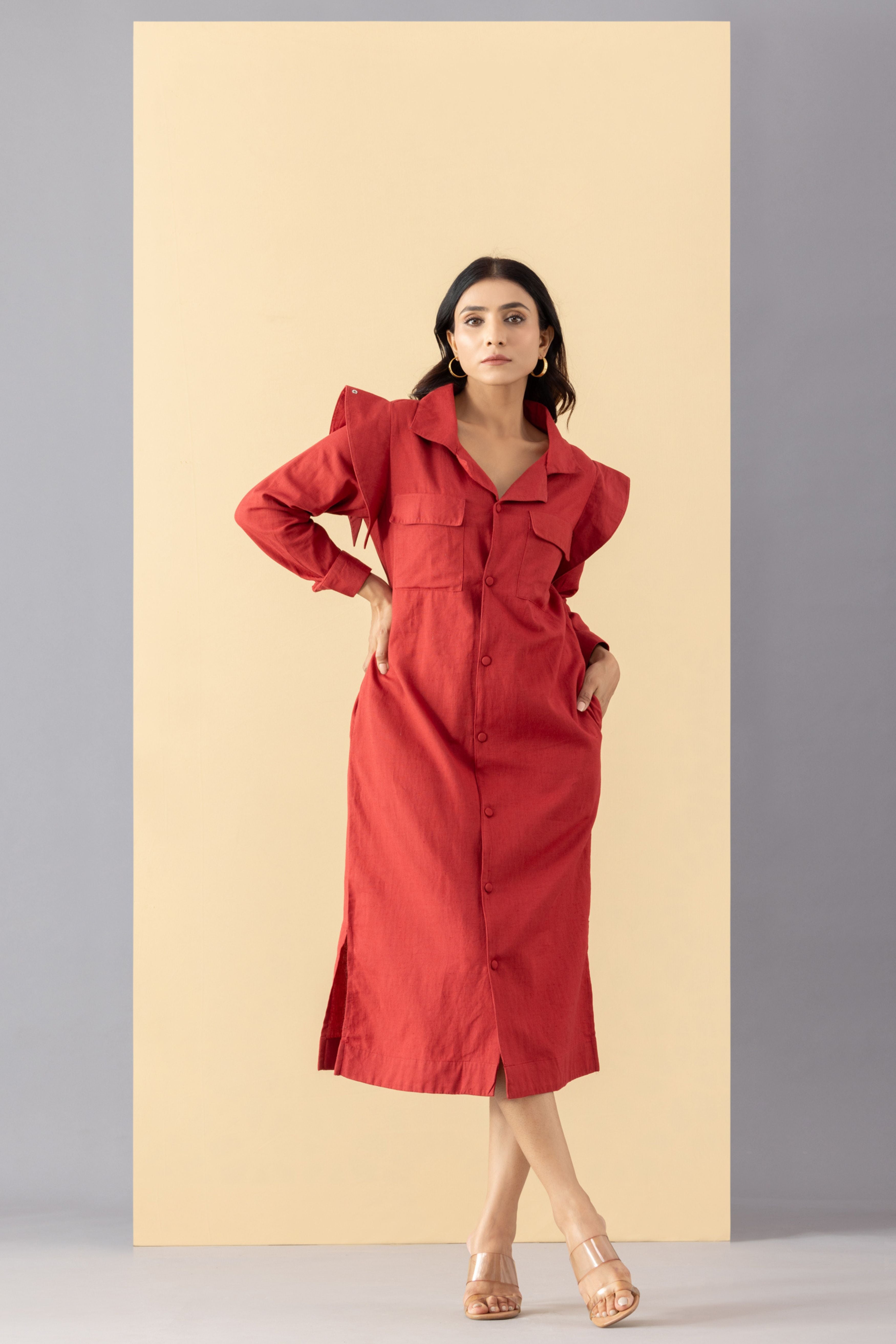 Caara scarlet dress is designed in rich monochrome rouge red shade , it is an experimental take on shift dress with shoulder manipulations. This season-less dress is perfect for any day/ night occasion. - Front Placket opening, side pockets - Shoulder panels can be buttoned in or opened to form exaggerated shoulders - Comfort fit - Model is wearing size S - This is a textile fabric. The subtle imperfections in the weave, texture and colors are a natural outcome of handcrafted textiles and not a defect.