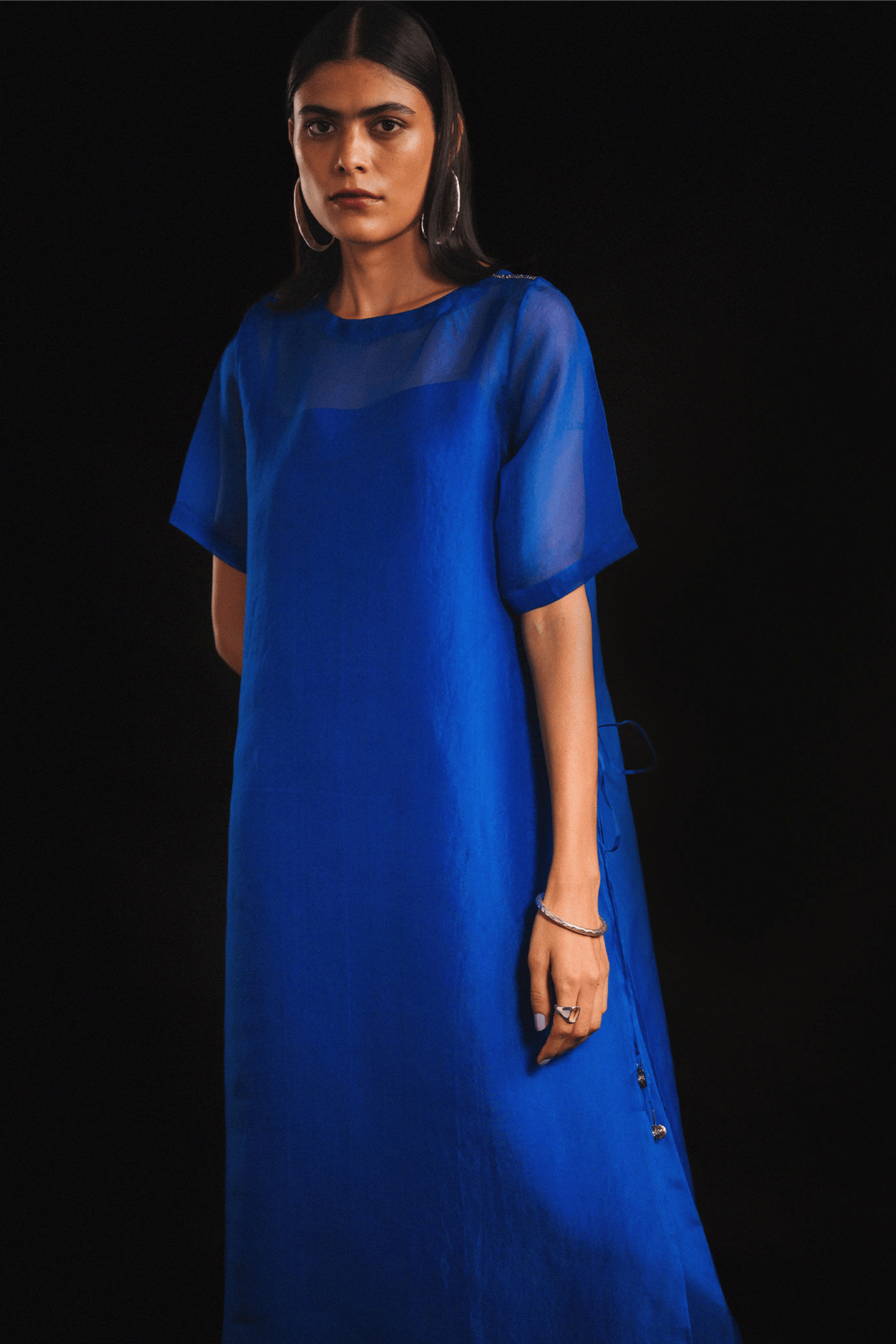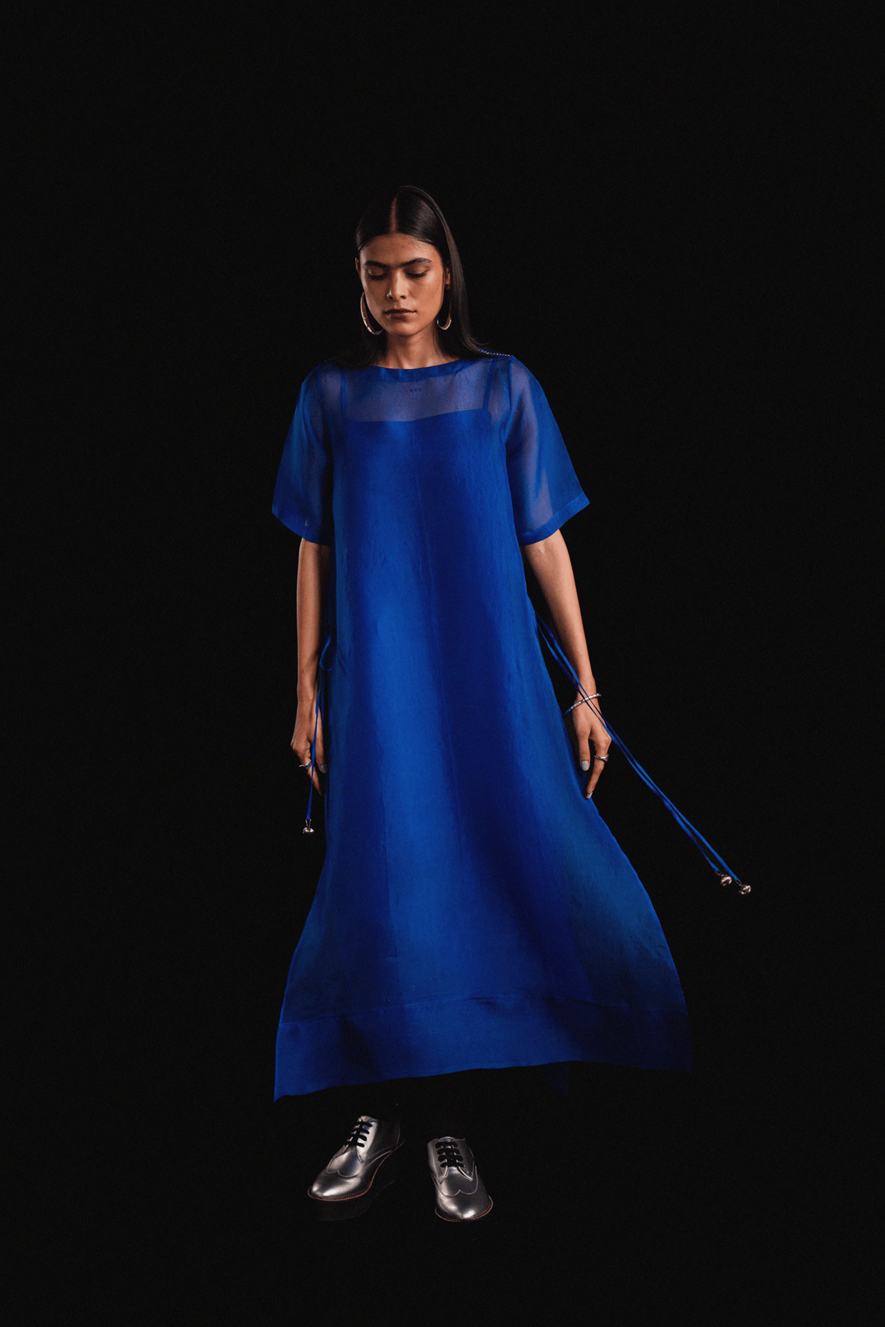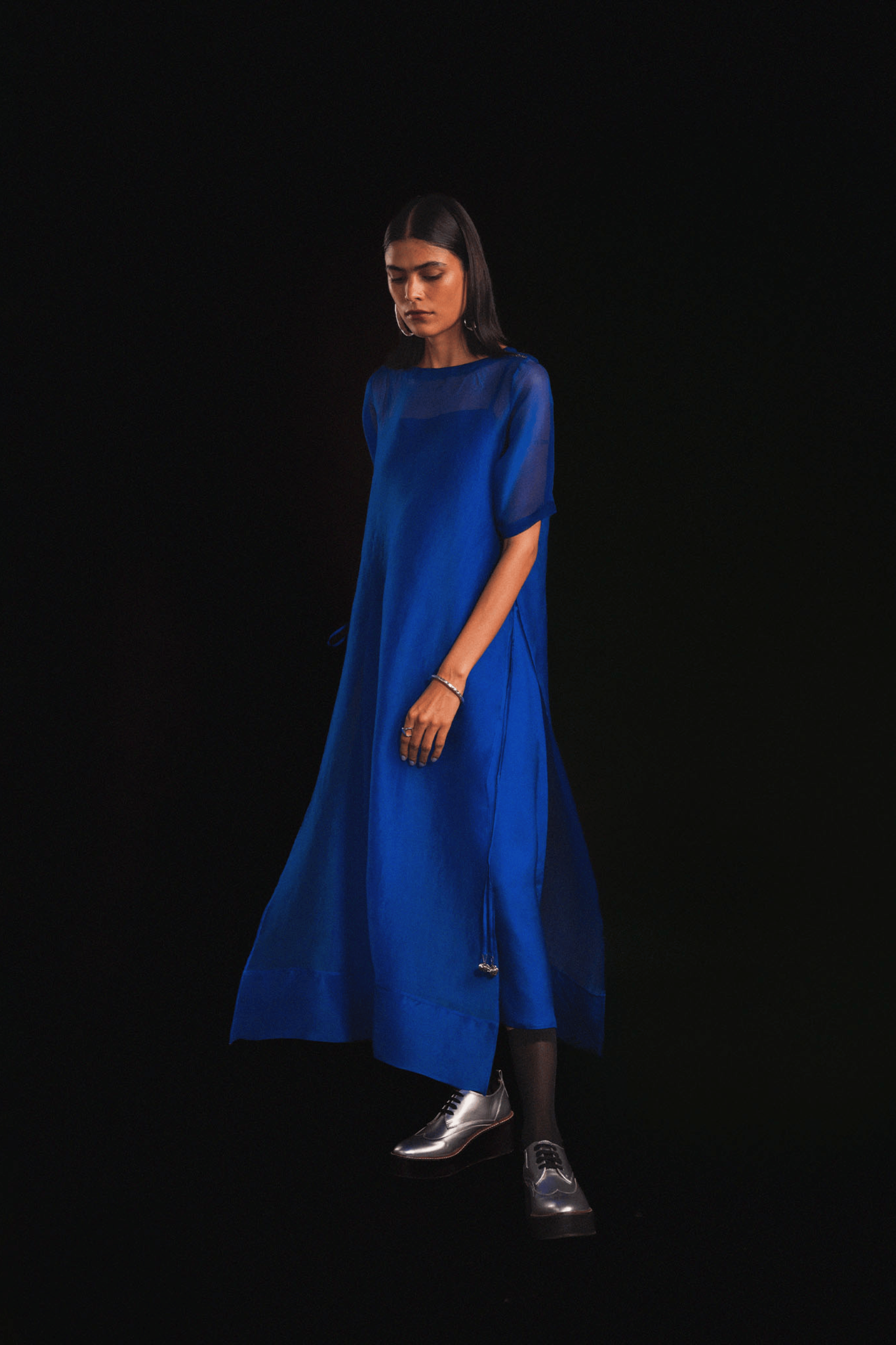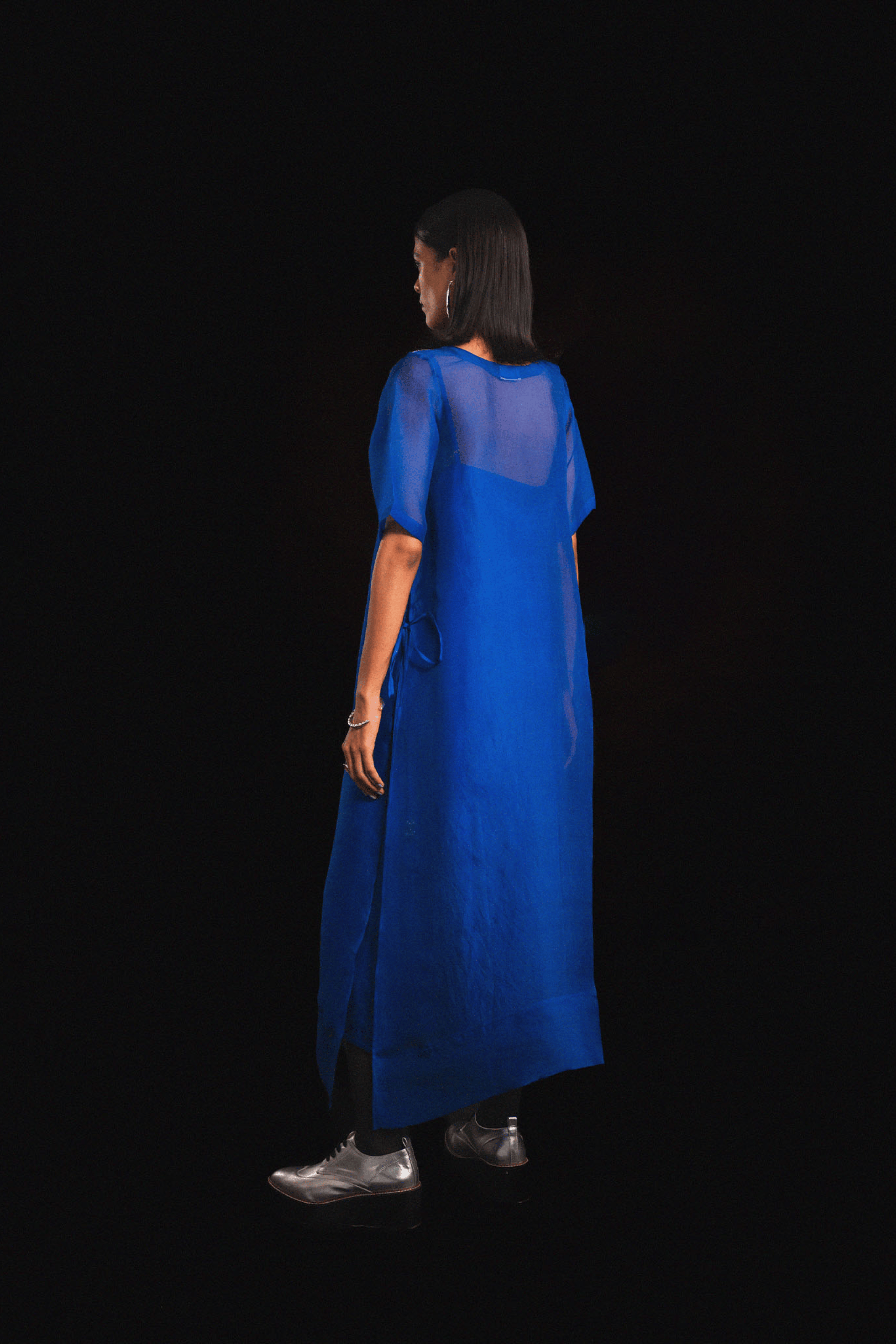 The Horizon Organza Dress is a long blue A-line silhouette with open side seams. Made from 100% organza, it features shirt sleeves with a broad hem and a boat neckline, paired with a satin slip for a refined look.