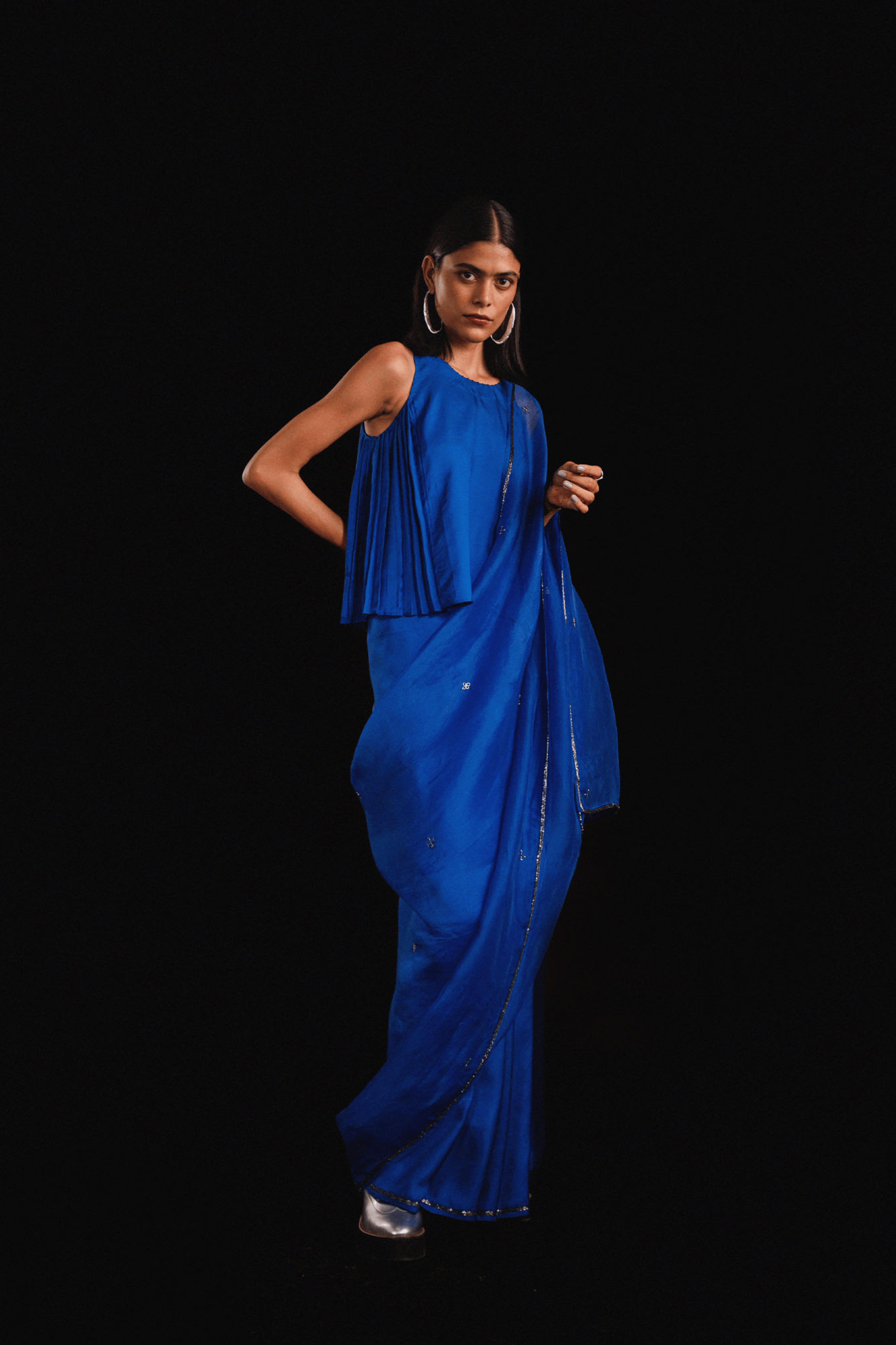 Sleeveless silk blouse in royal blue, featuring delicate pleating under the arms and embroidery on the neckline.