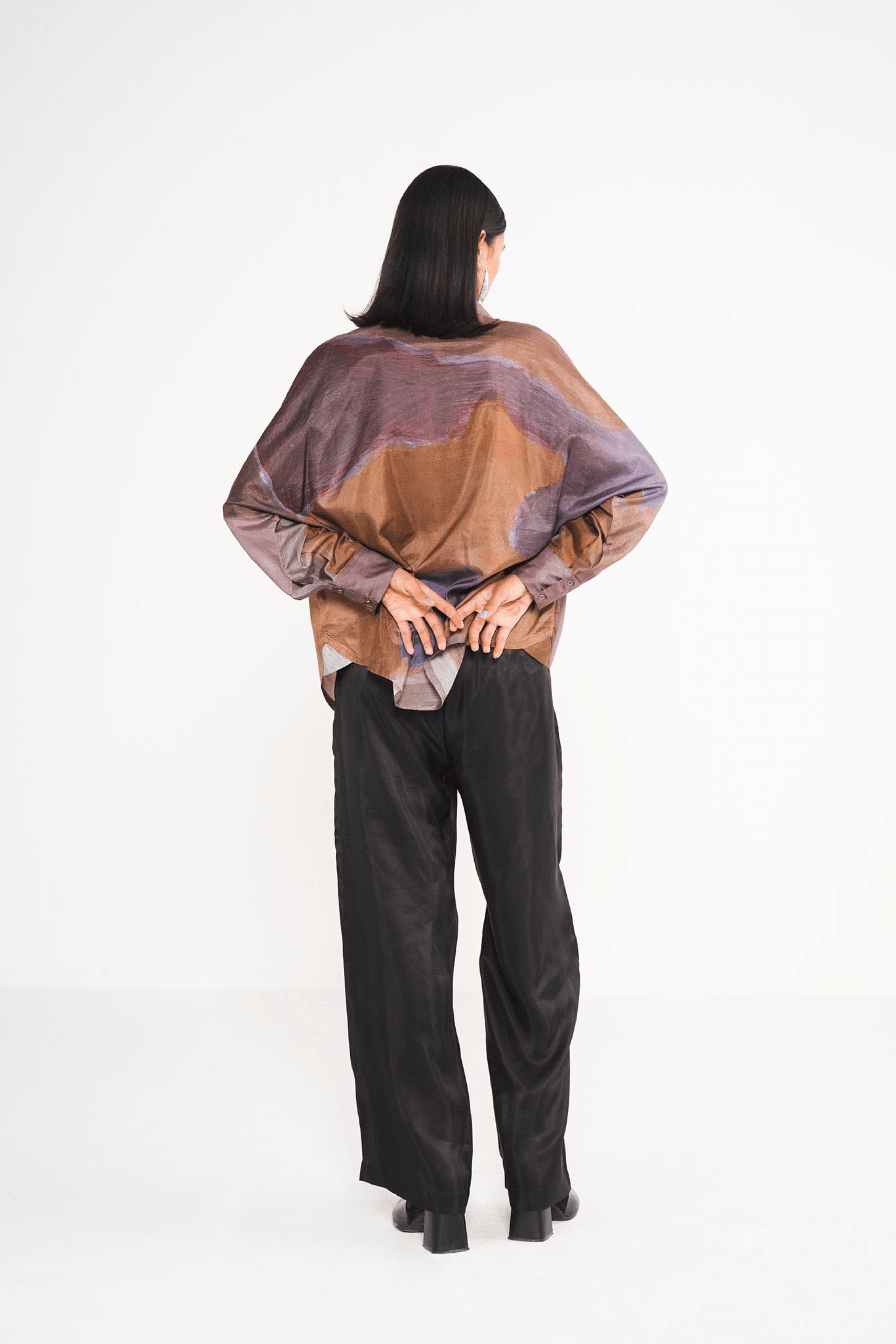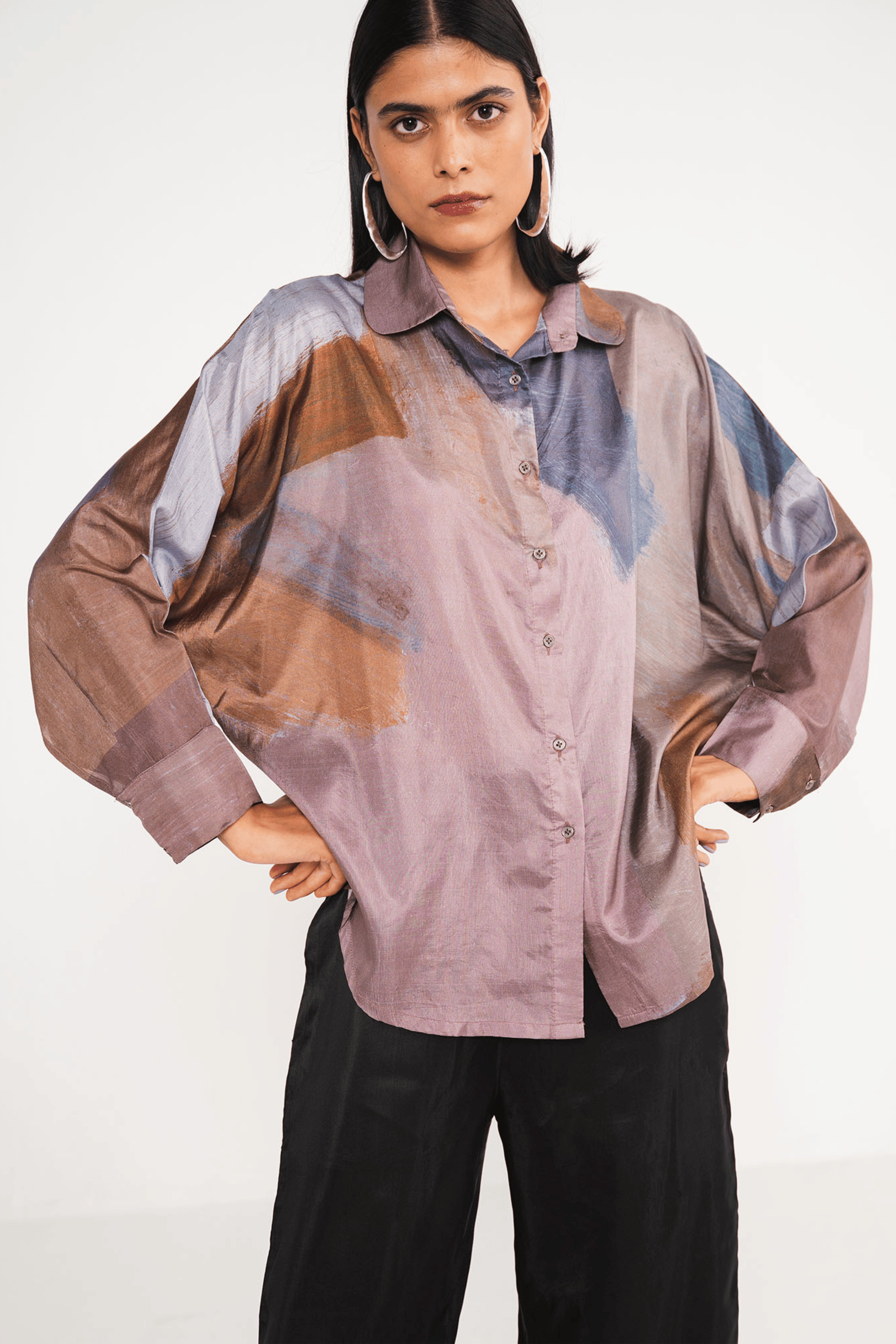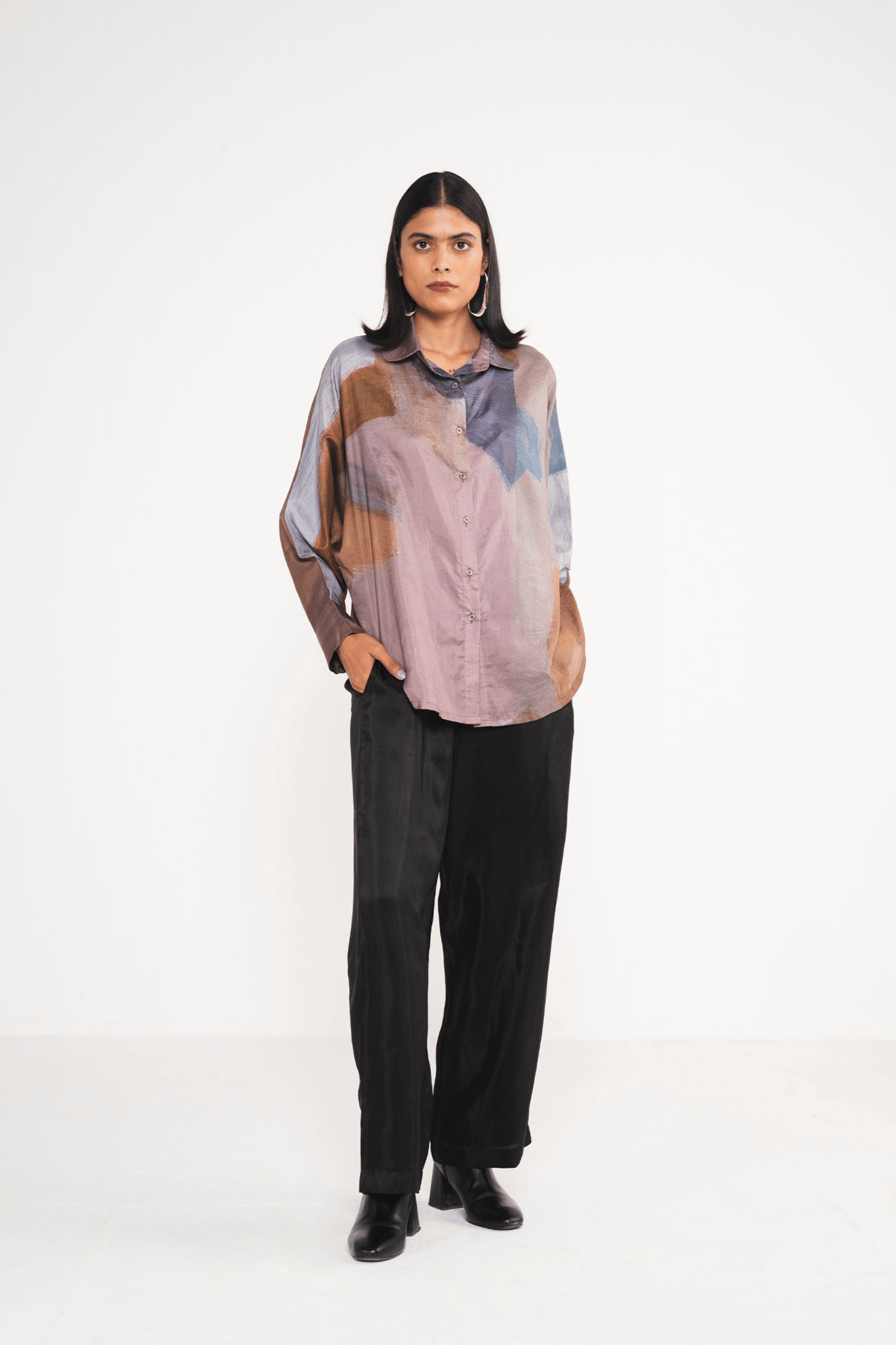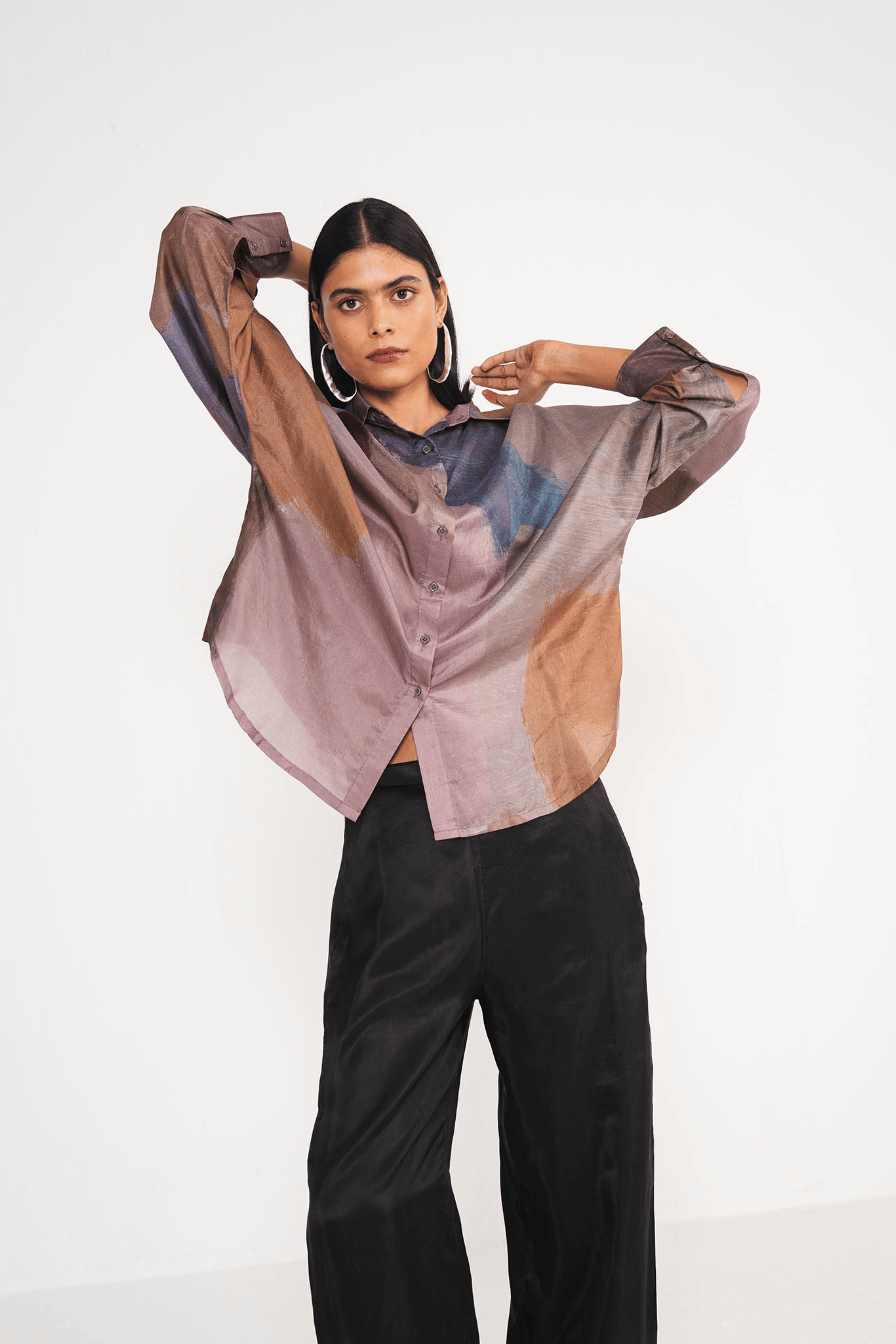 Abstract brown print emblazes this pure silk Crop Shirt. It is designed with notched collar for a boxy relaxed fit . Style yours with white trousers or skirt.