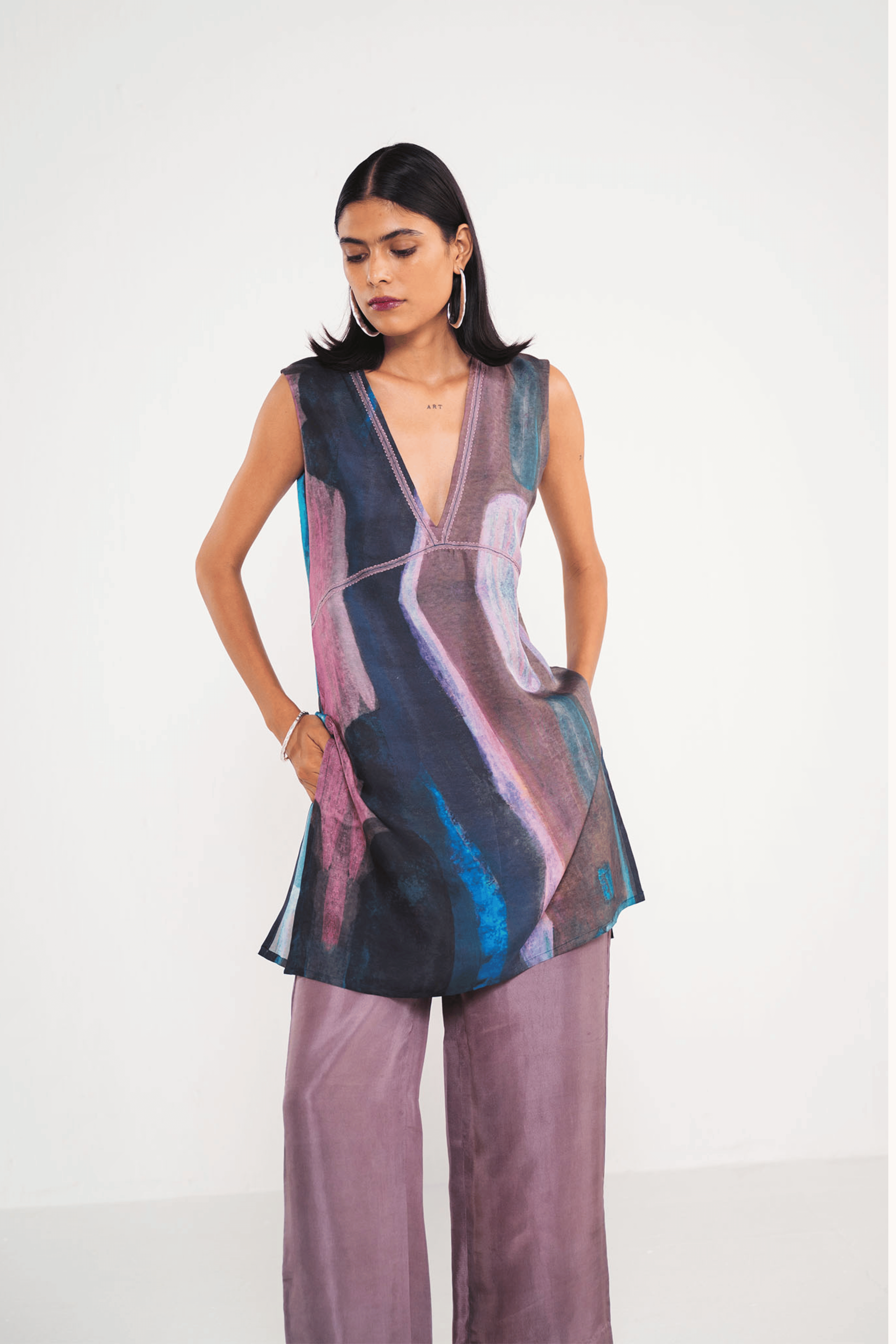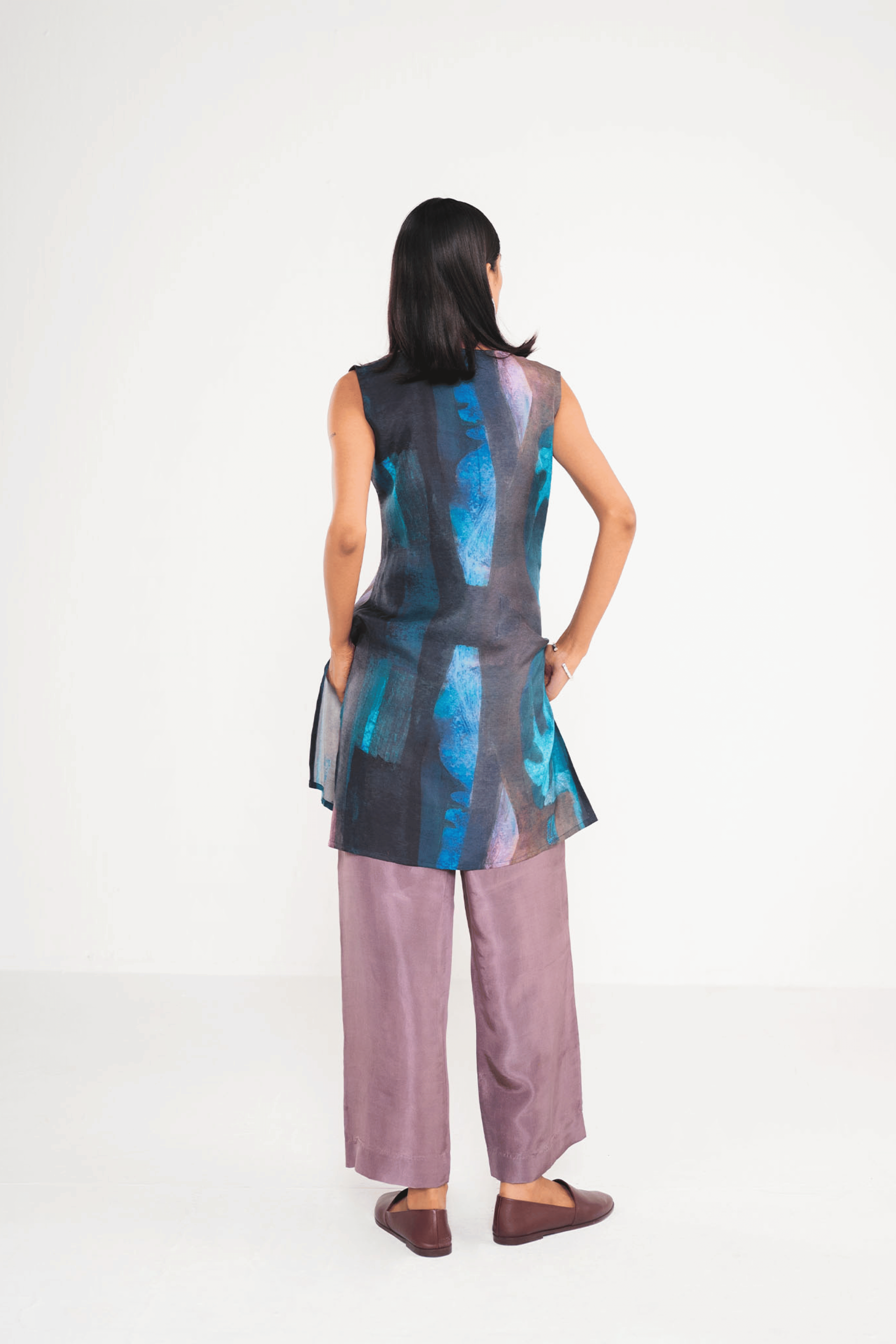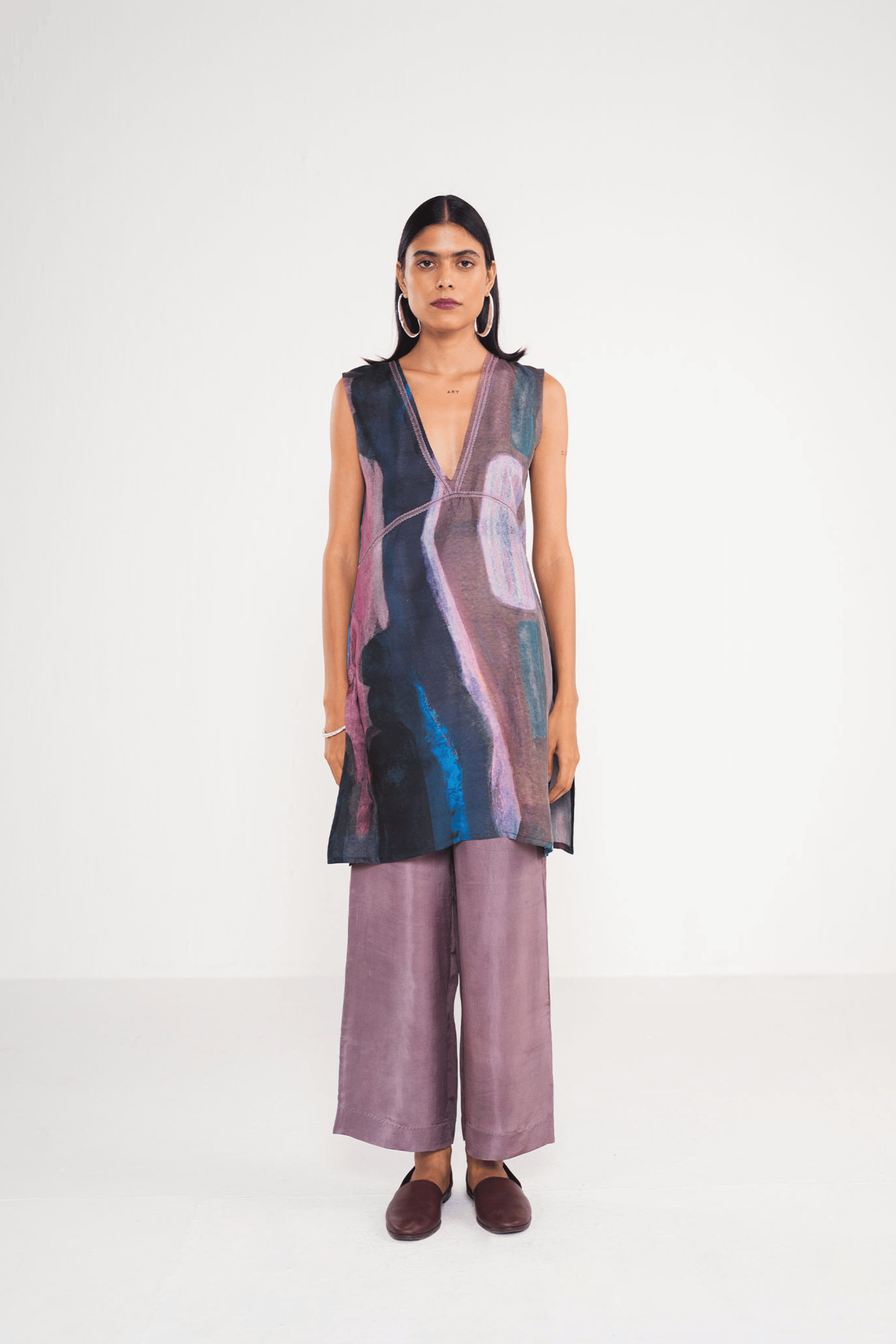 Mauve straight silk pants, simple and versatile for any outfit. Pair it with our prismatic top to complete the look!
