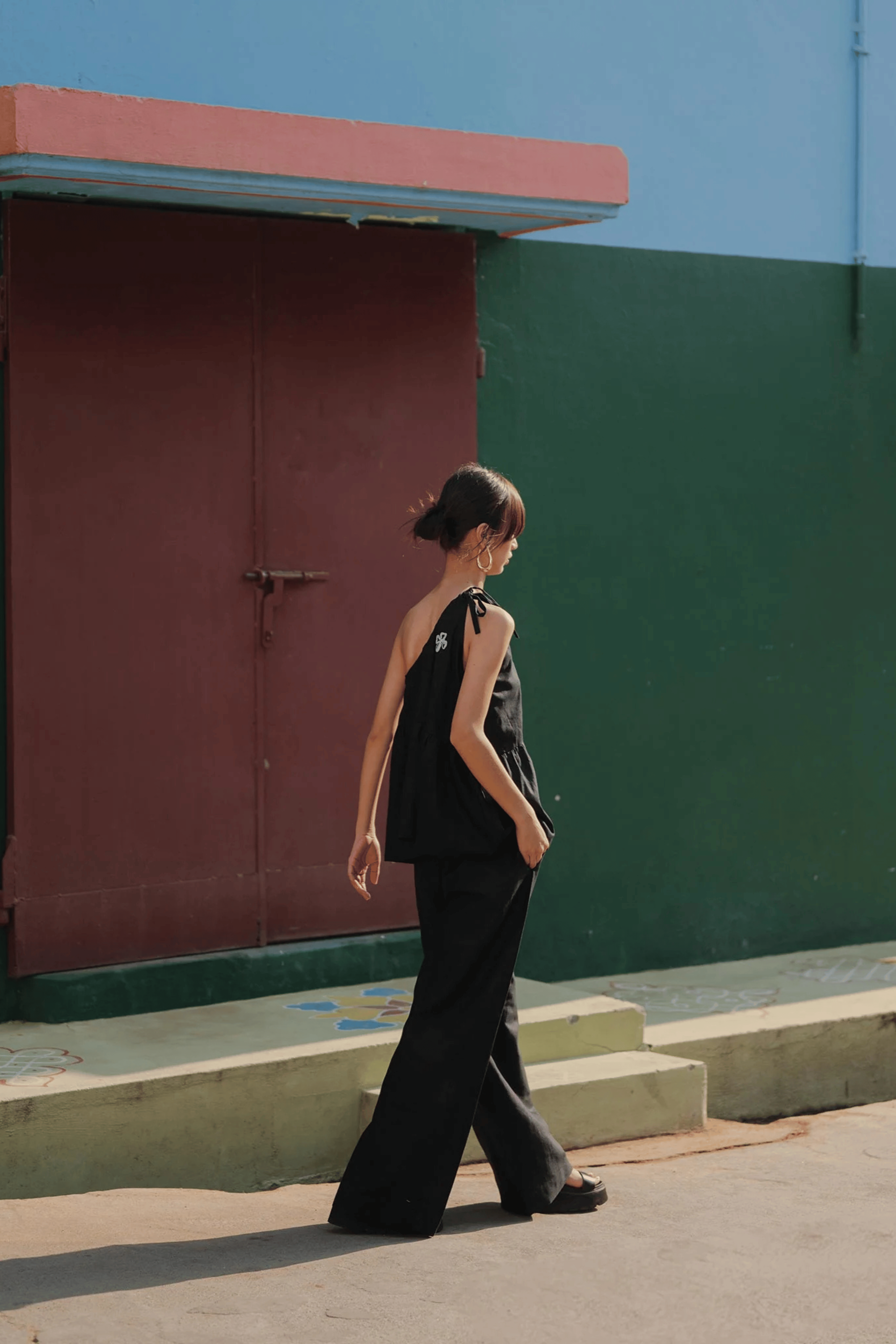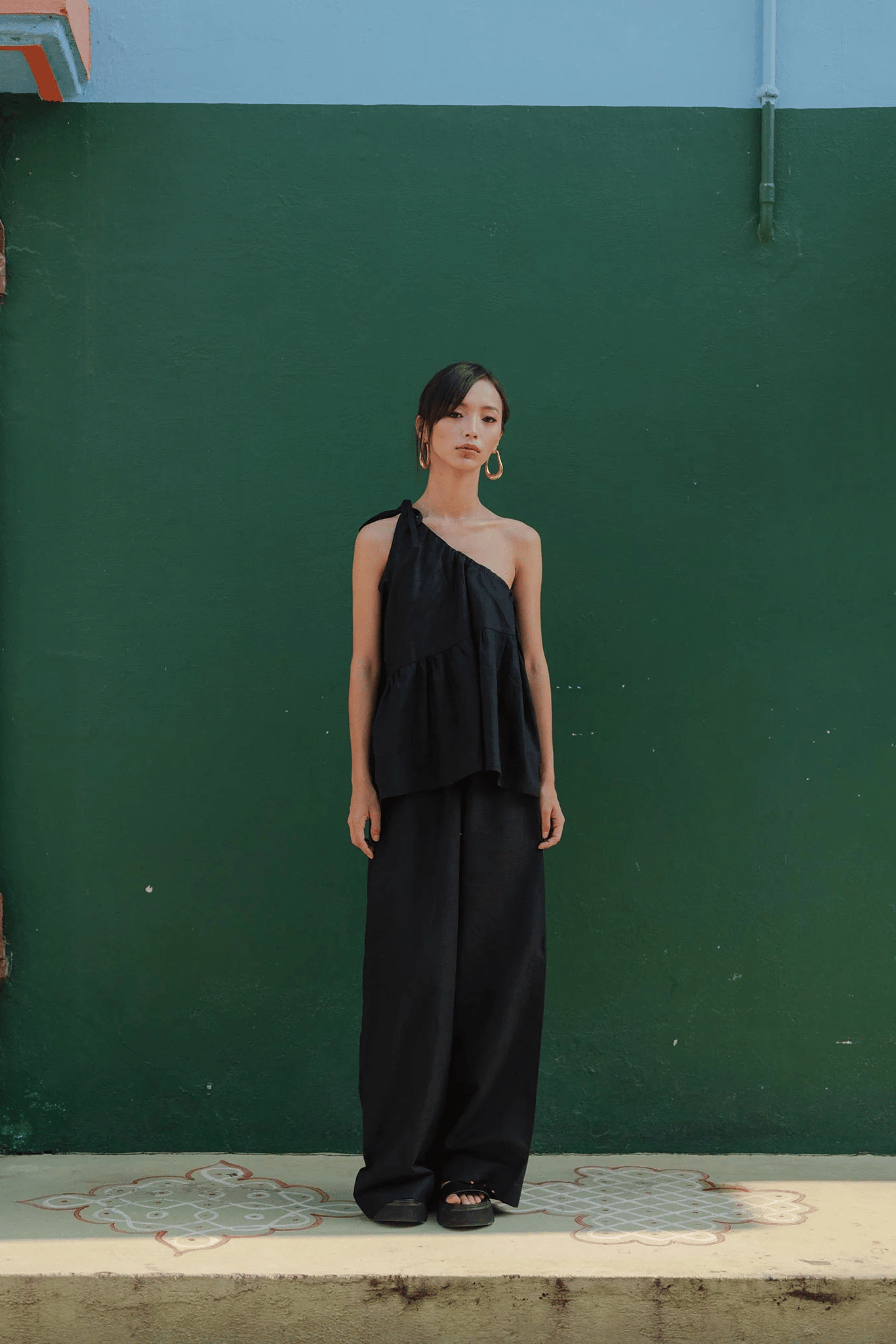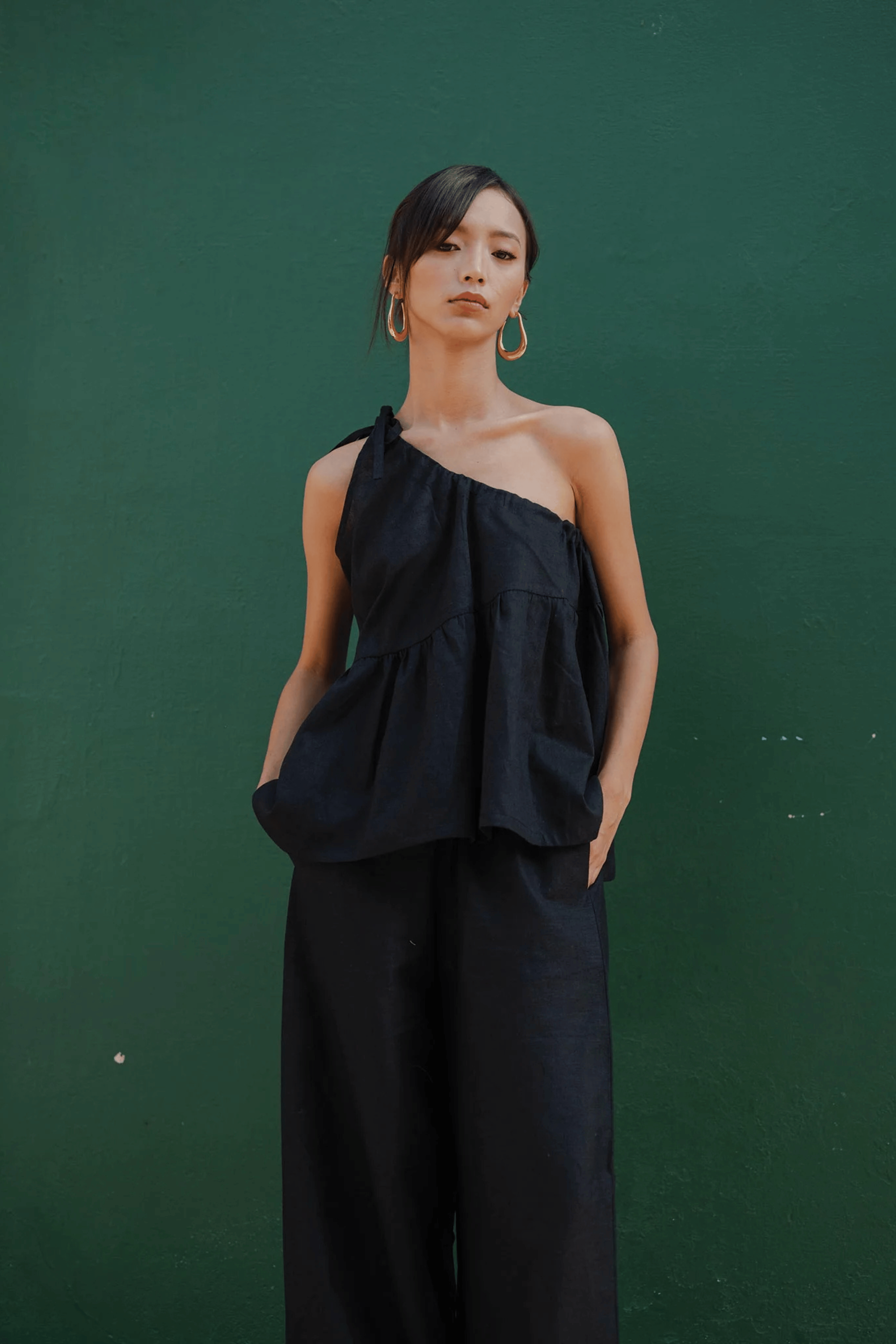 Crafted in pure Black linen off shoulder top gathered with a tie on shoulders, the off center seam provides it with a boxy fit, paired with linen pants. It is also available in Red and White upon request.