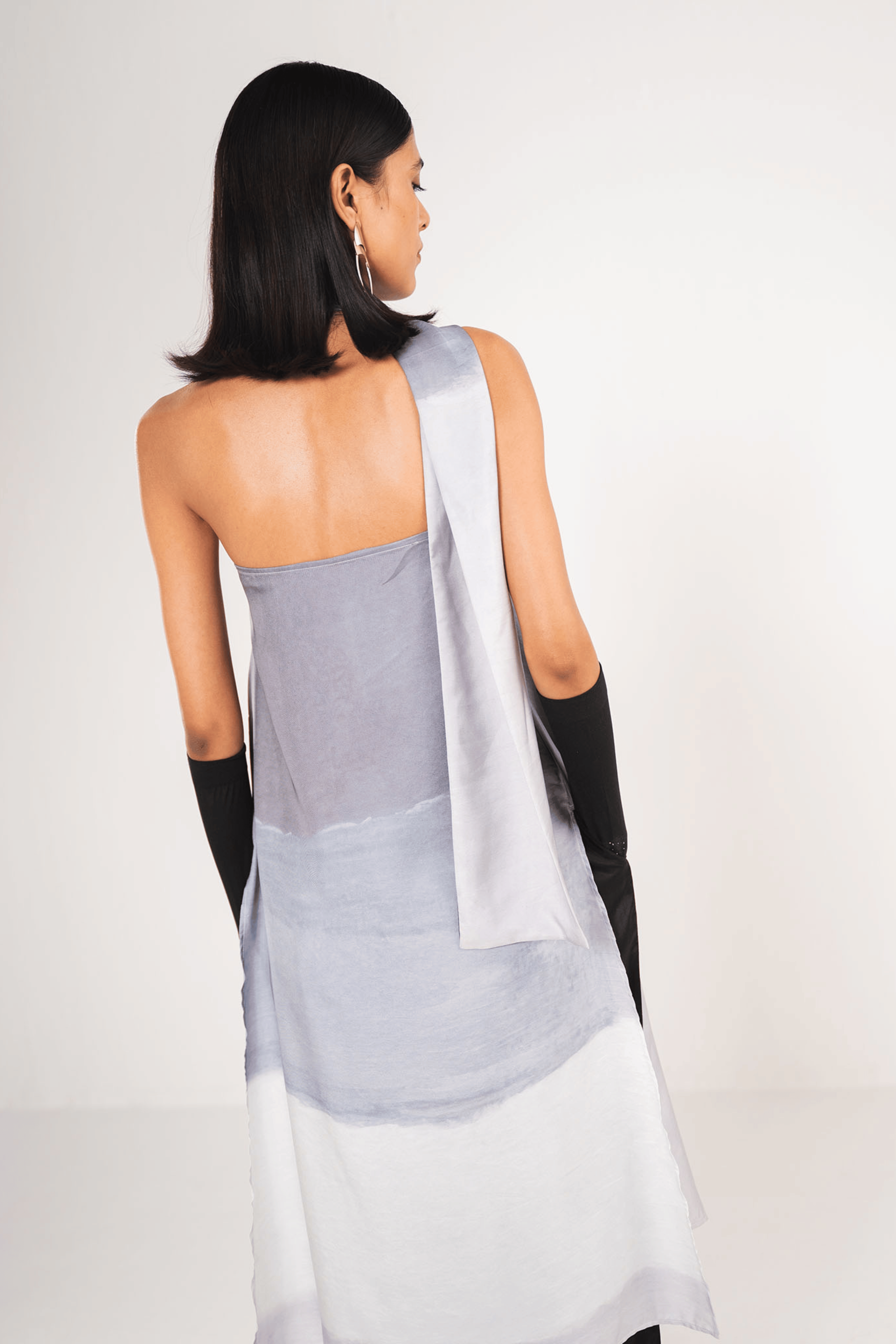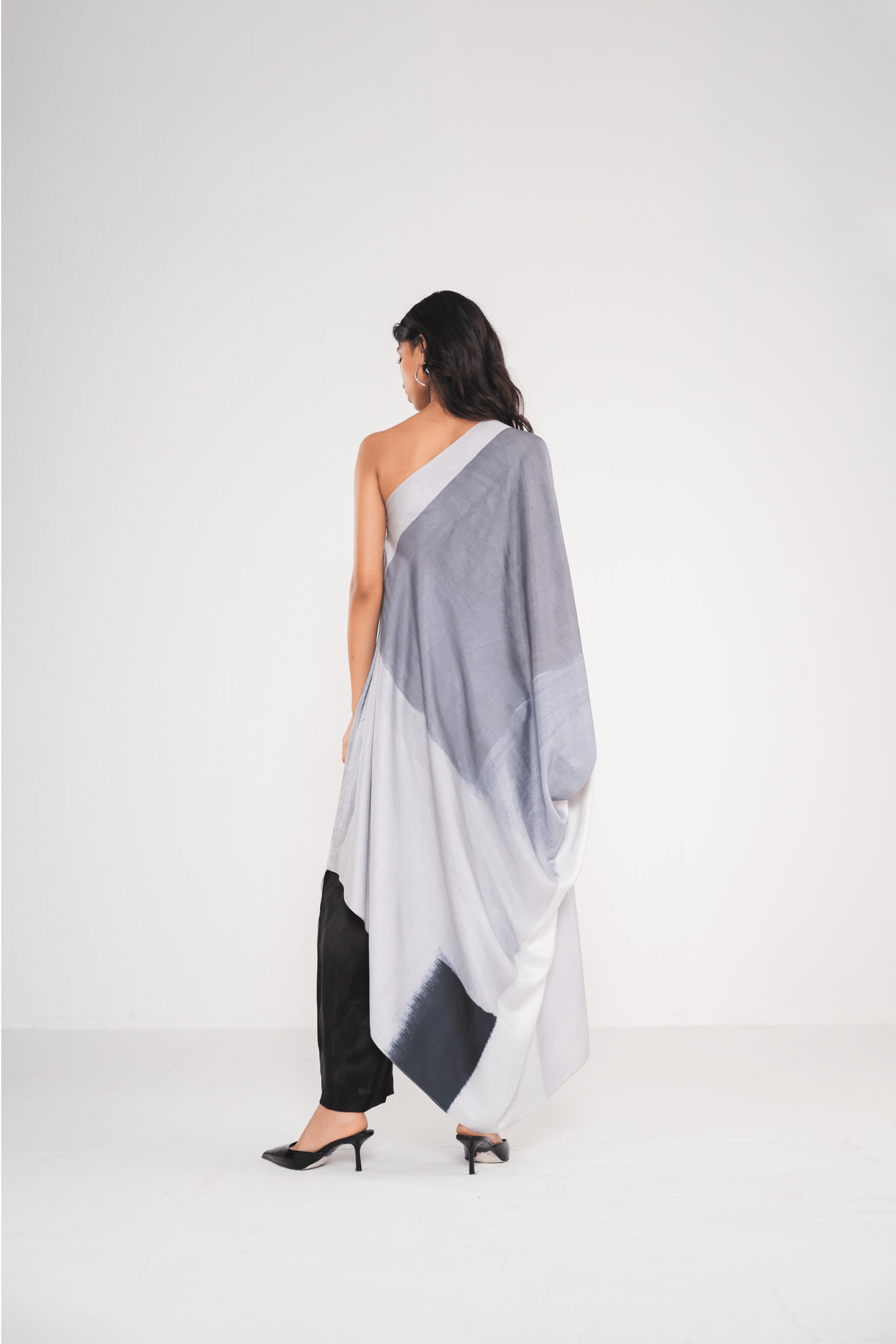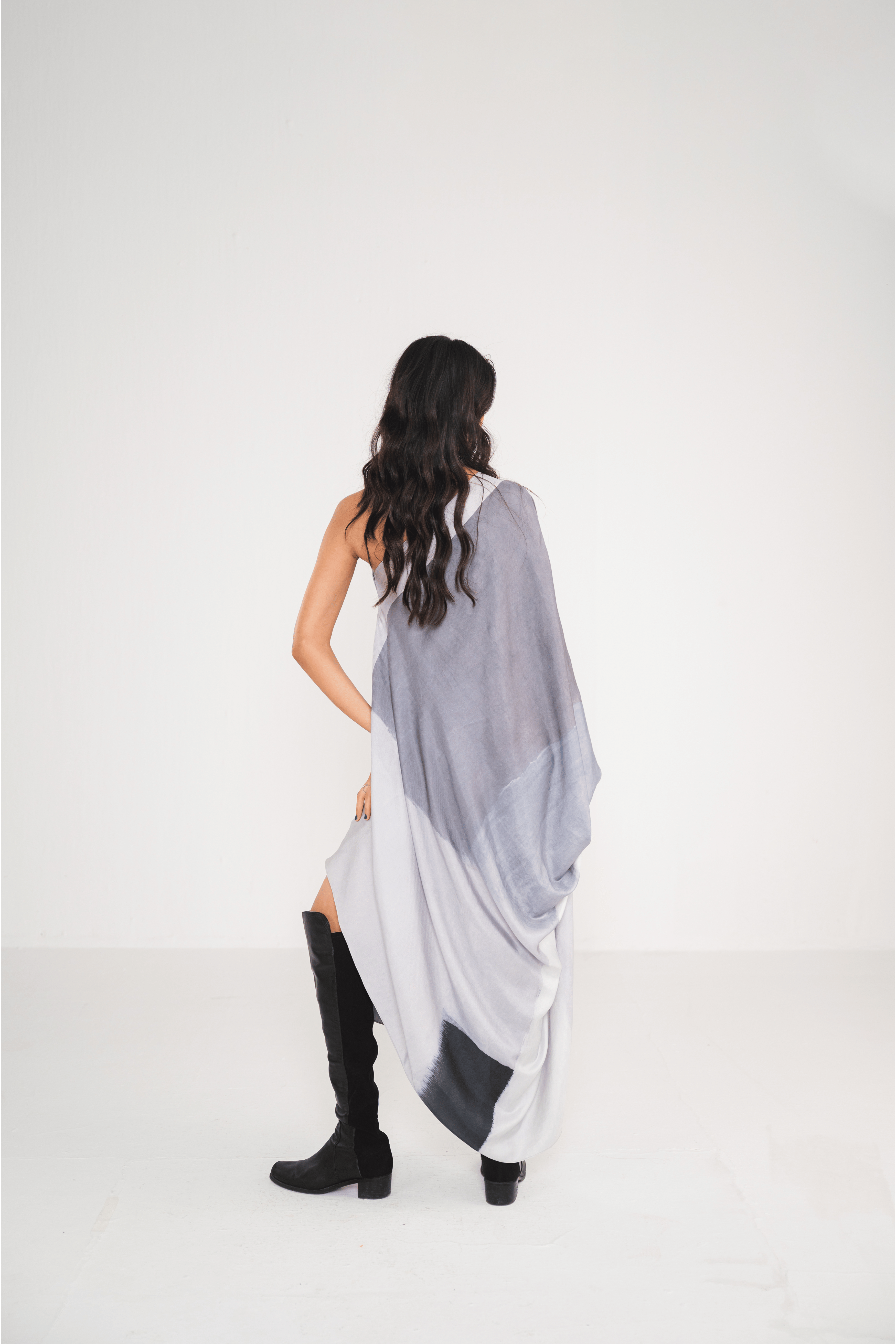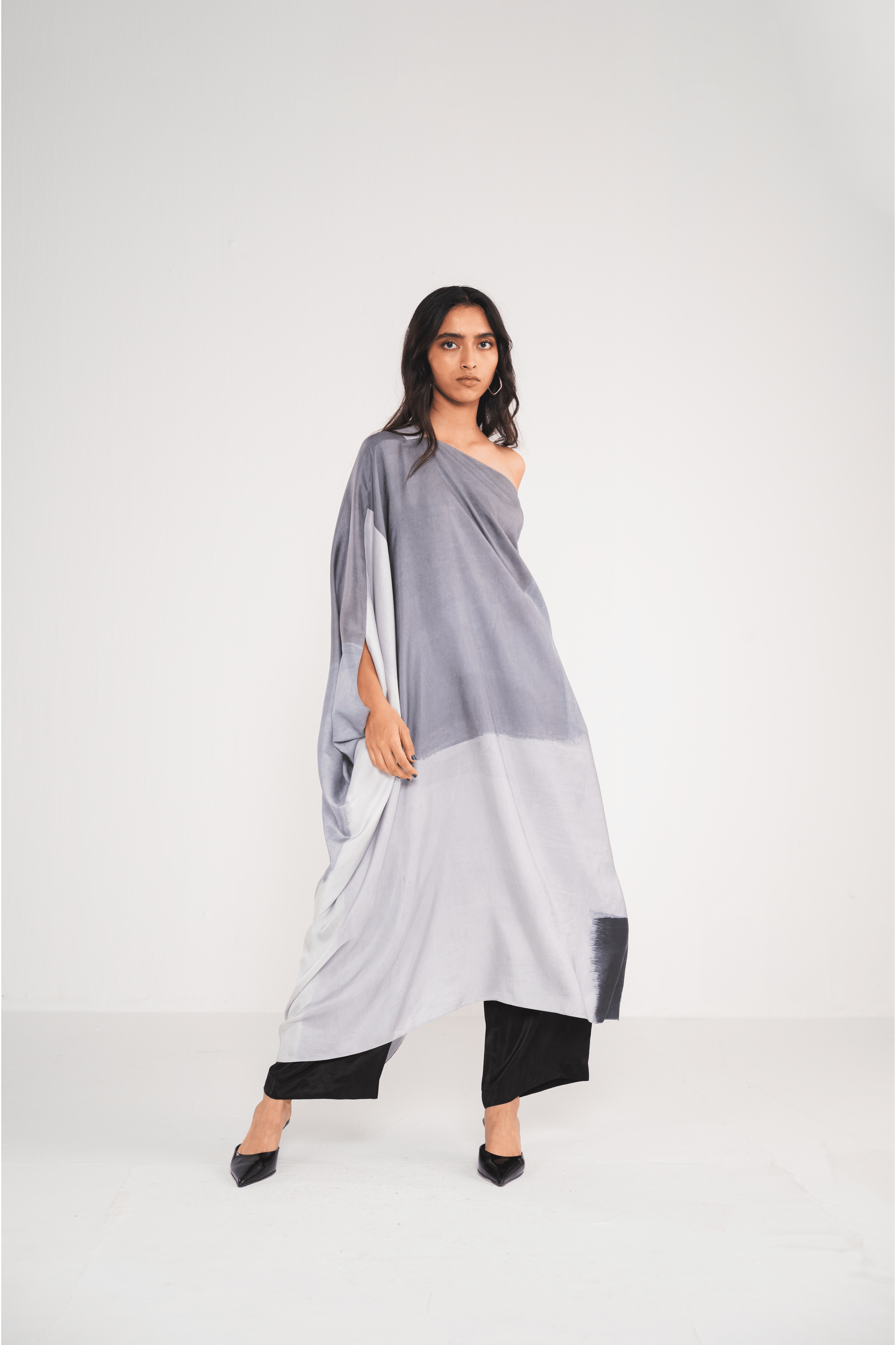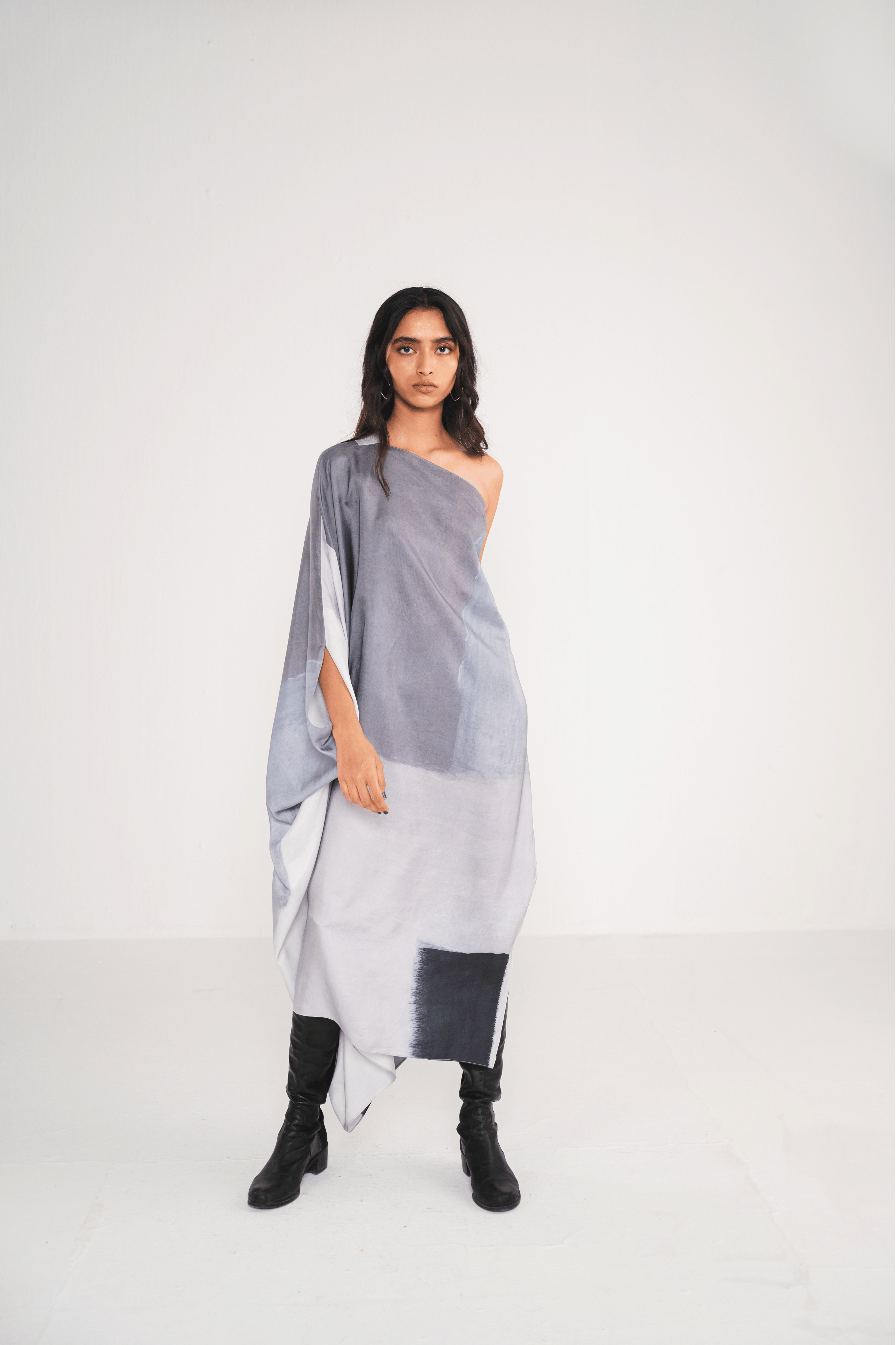 The Ash Off-Shoulder Dress is a one-shoulder kaftan featuring a chic abstract grey print, with a slit for the arm. Its flowing design offers a perfect blend of comfort and modern elegance, making it an ideal standout piece for any occasion.