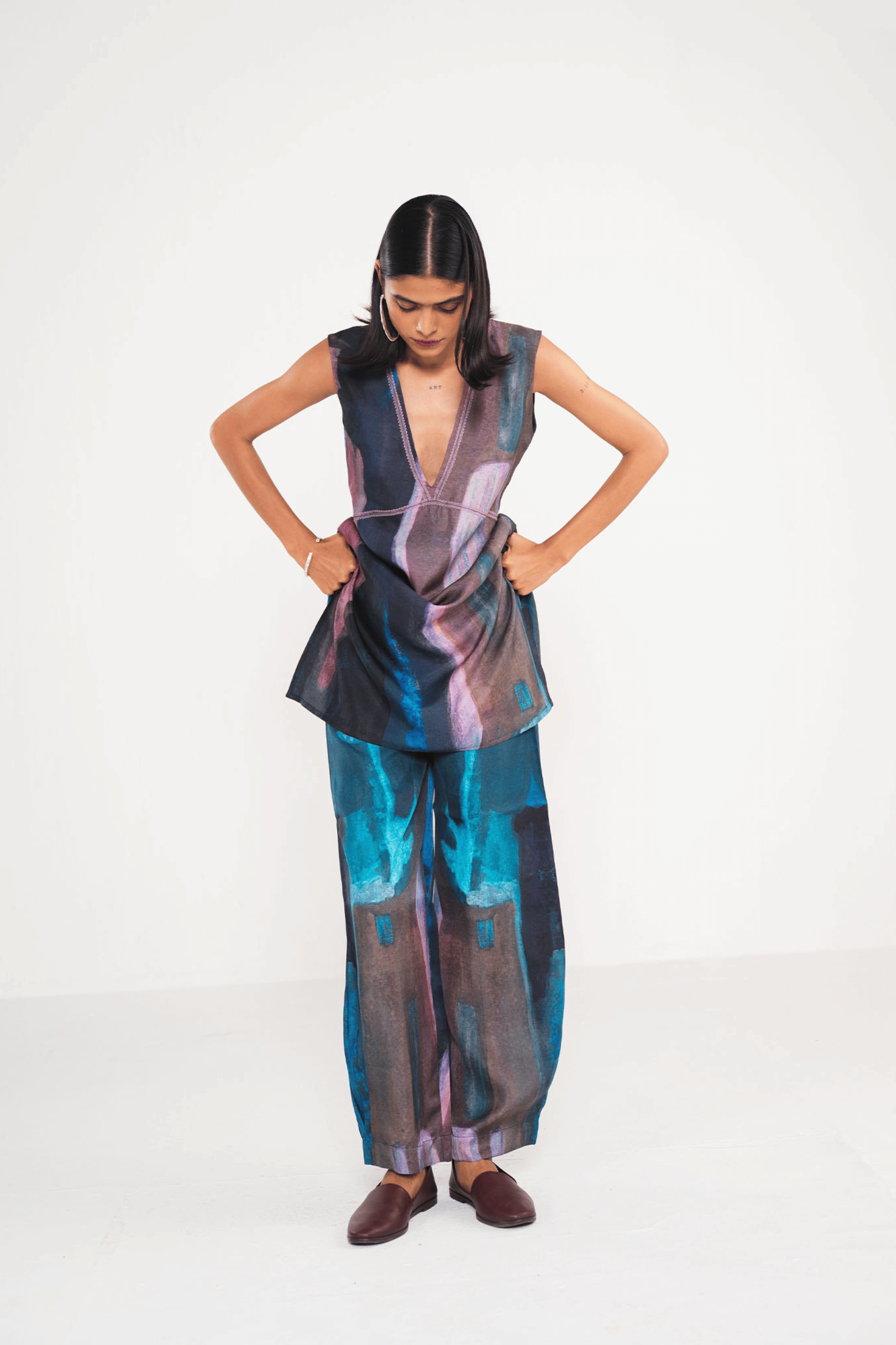 A striking saree featuring a print in rich shades of blue, purple, and black, paired with a soft mauve sheer organza pallu. Perfect for a modern, elegant look.