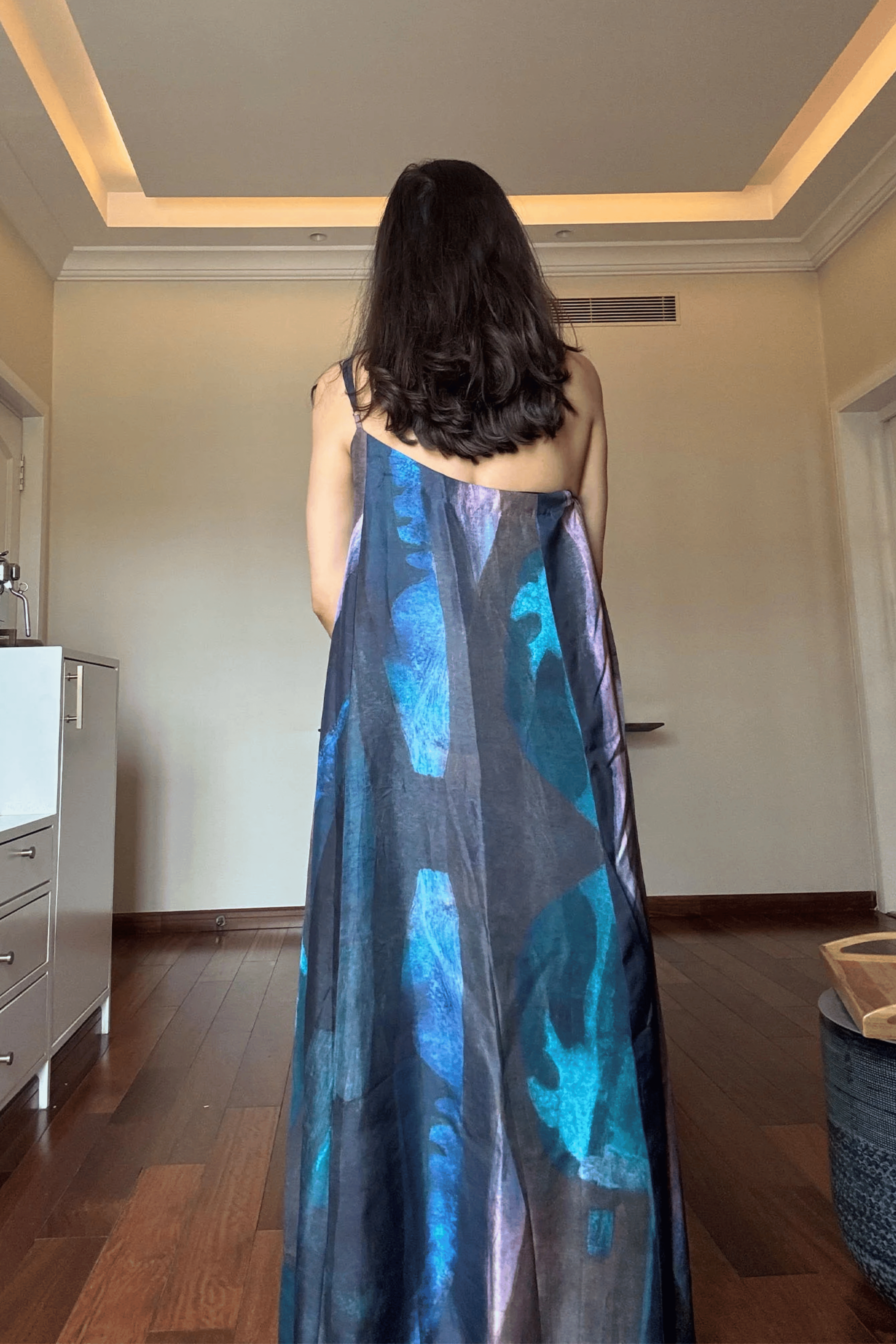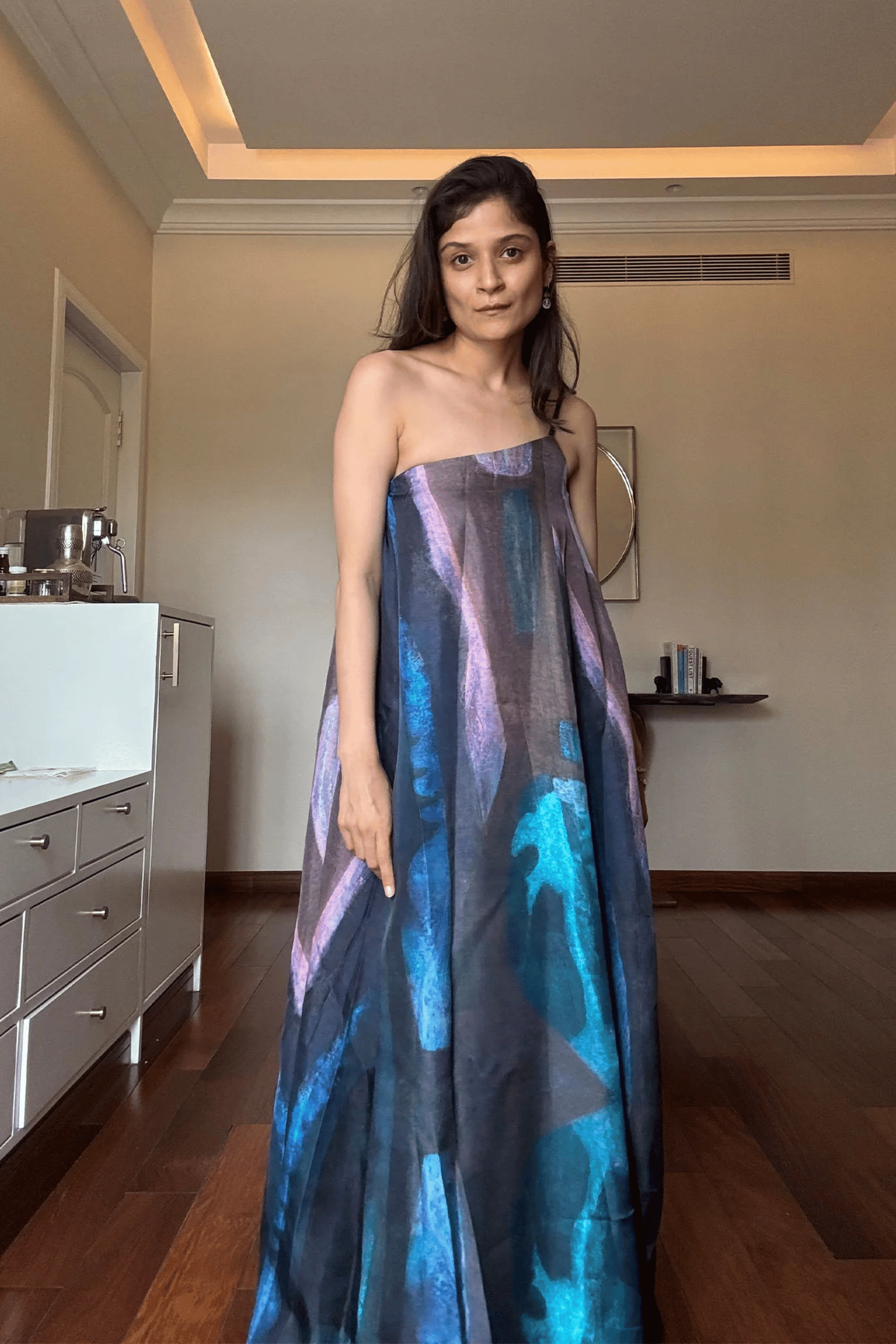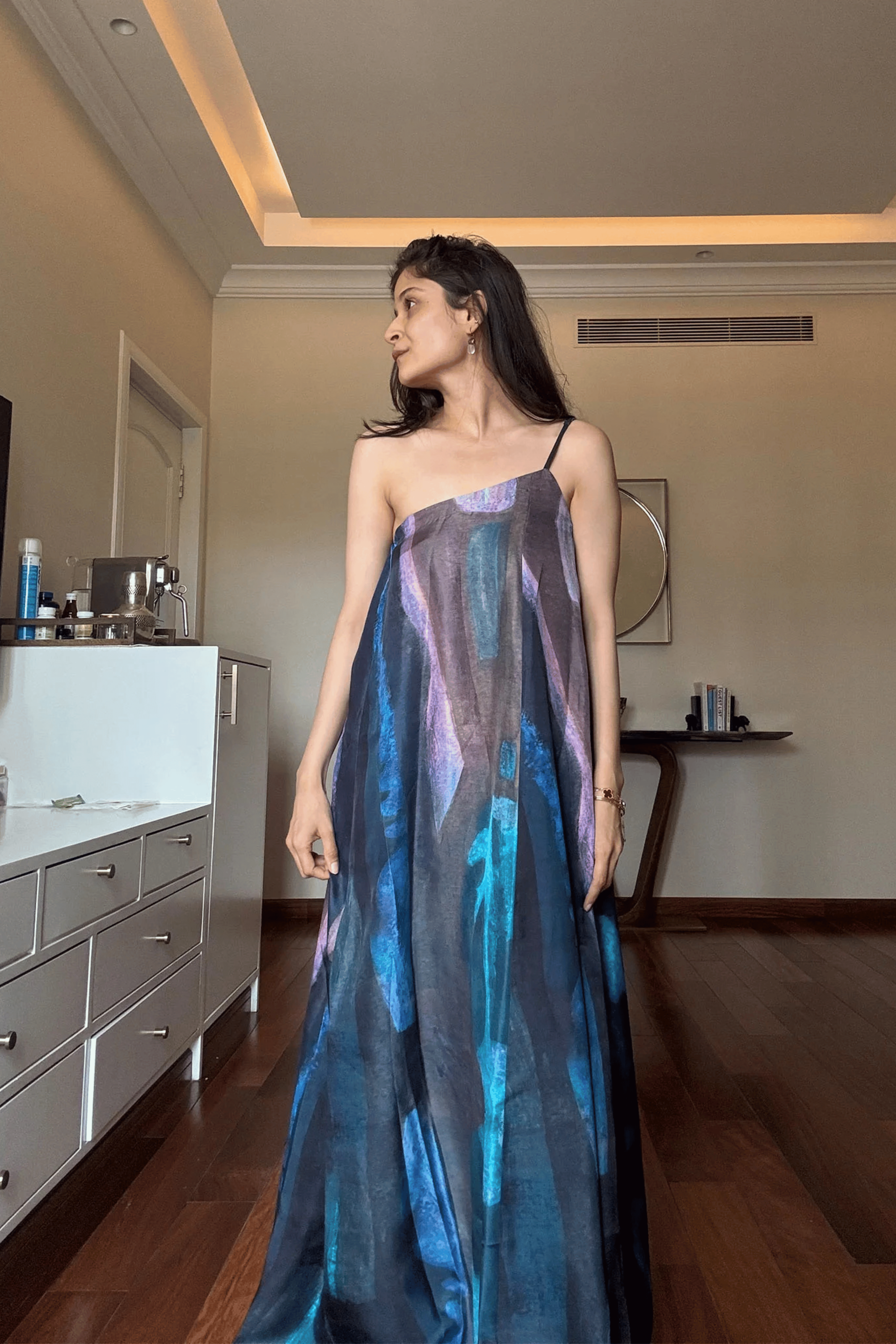 Made in pure SATIN TWILL , the printed dress features an elegant one-shoulder silhouette. It falls to a full flowing, floor-length skirt. The perfect dress for daytime events or evening soires.