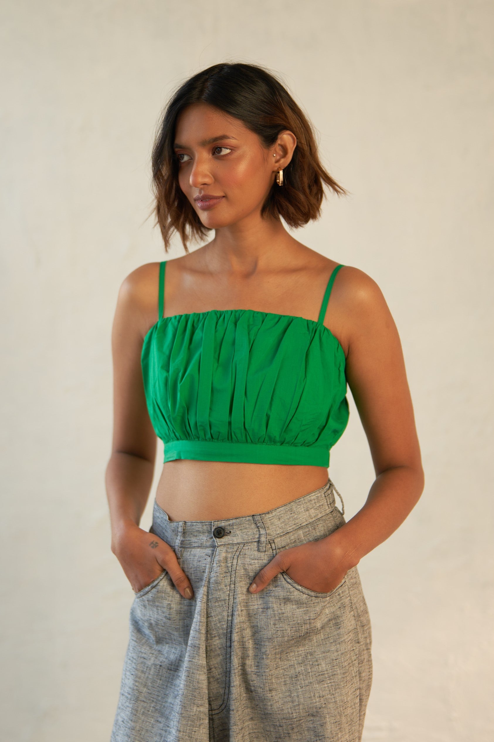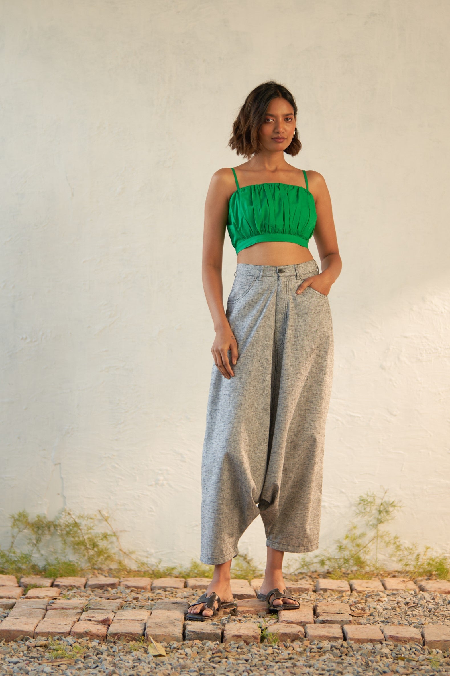 The Calm Forest outfit combines a gathered crop top with a baggy pant for a beautiful ensemble. The top effortlessly folds and tucks, featuring adjustable straps and an elasticated back for comfort. The harem pant is crafted from textured cotton, showcasing an exaggerated silhouette with a dramatic flare at the center, adding a touch of unique style to the look.