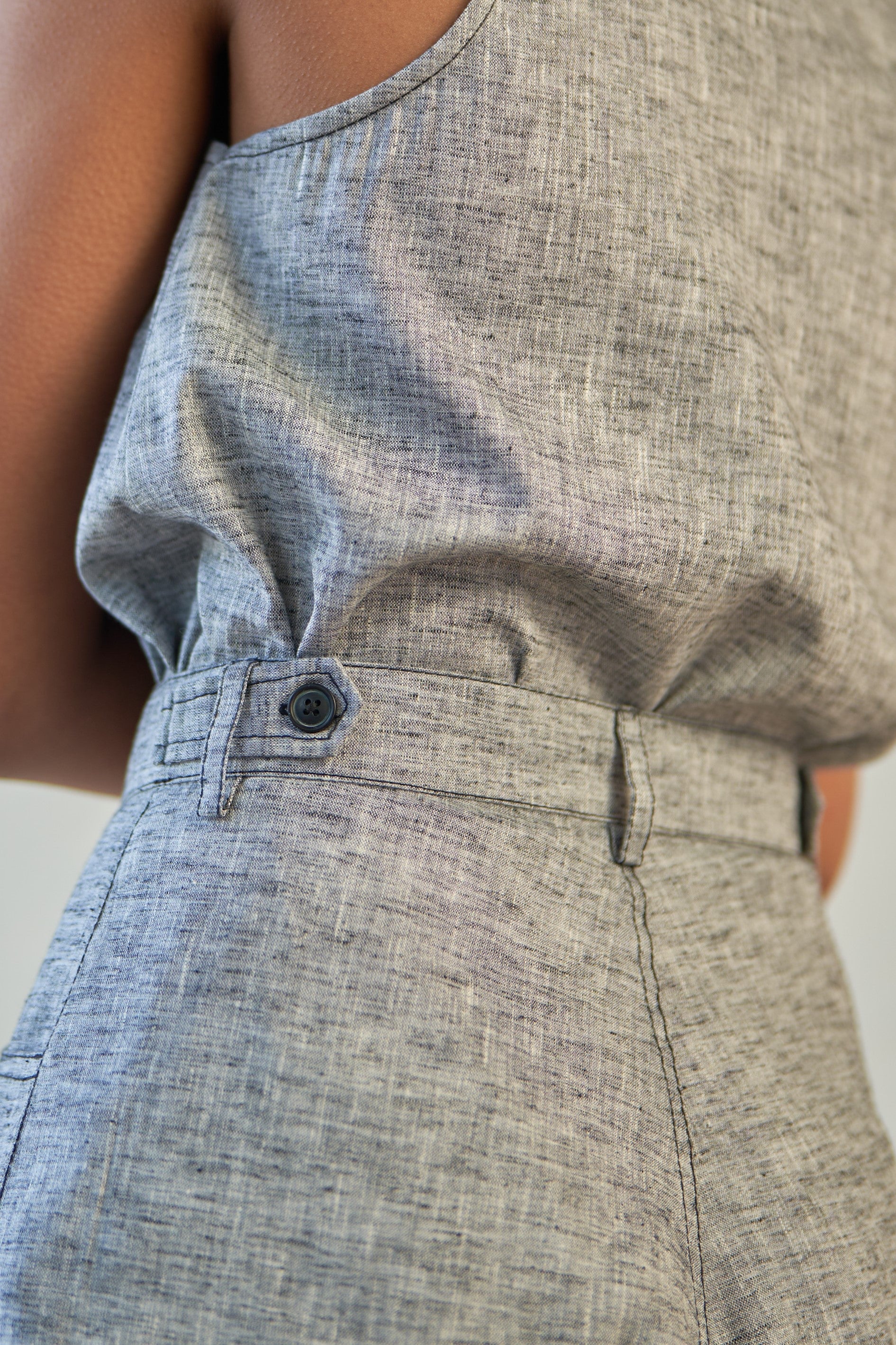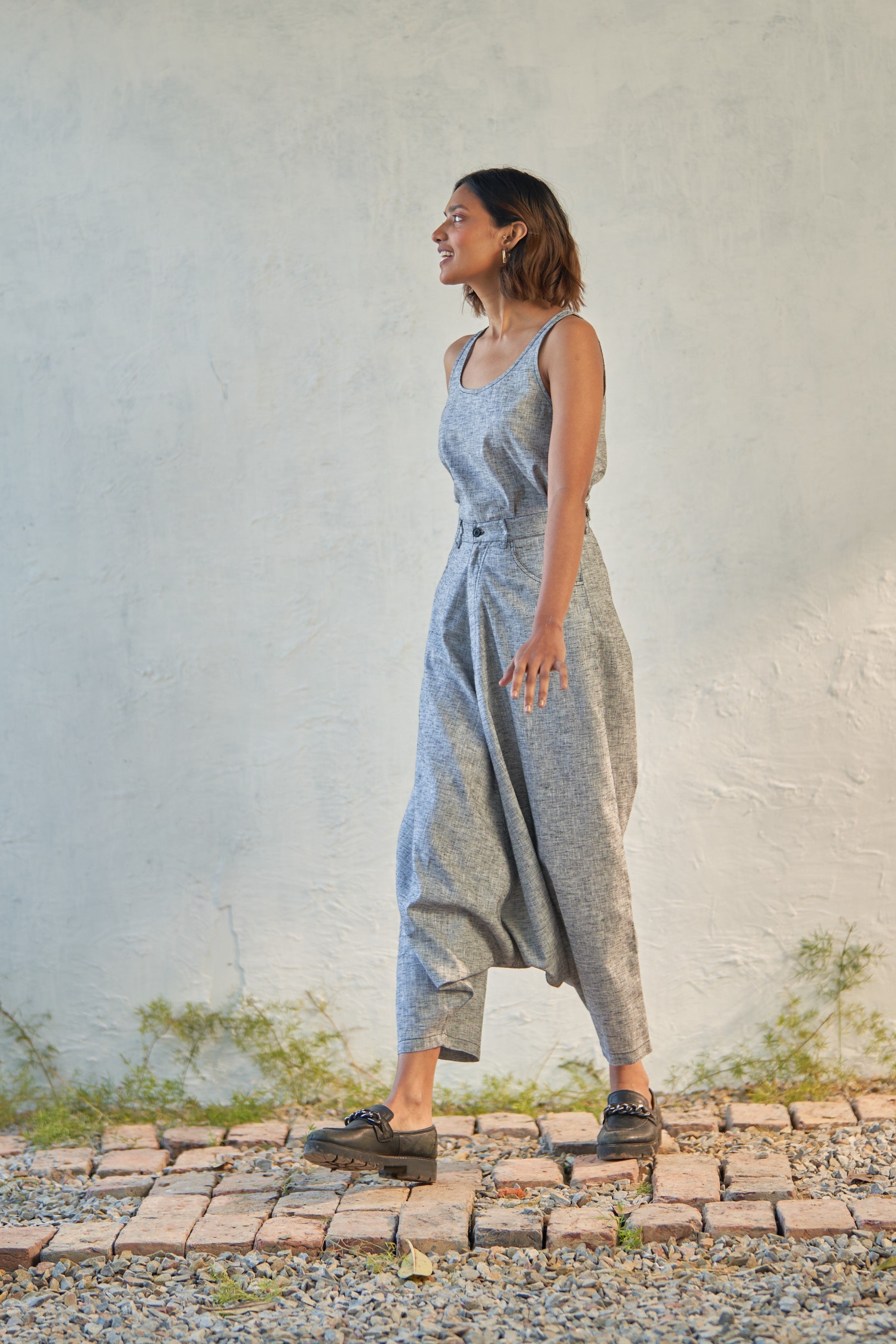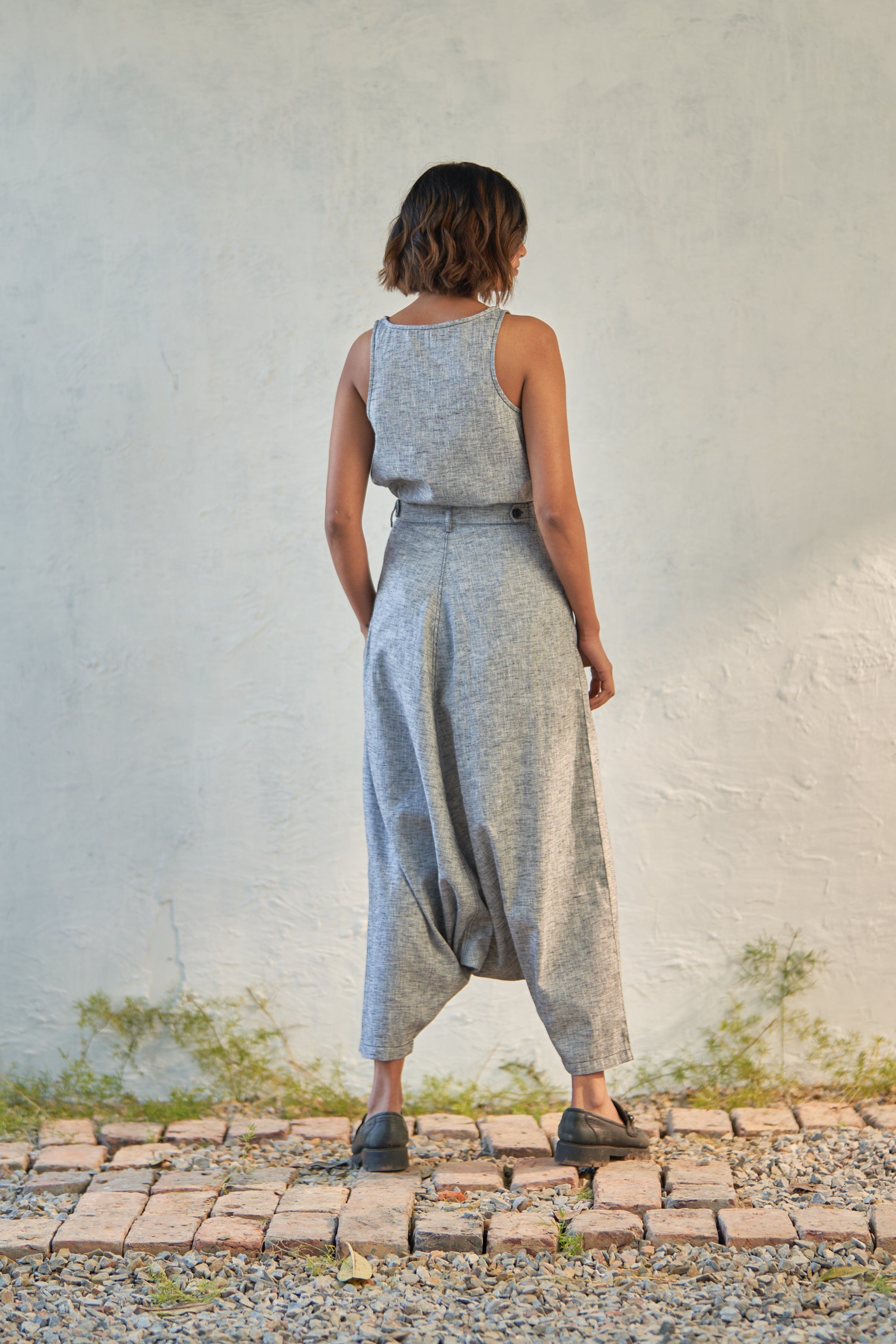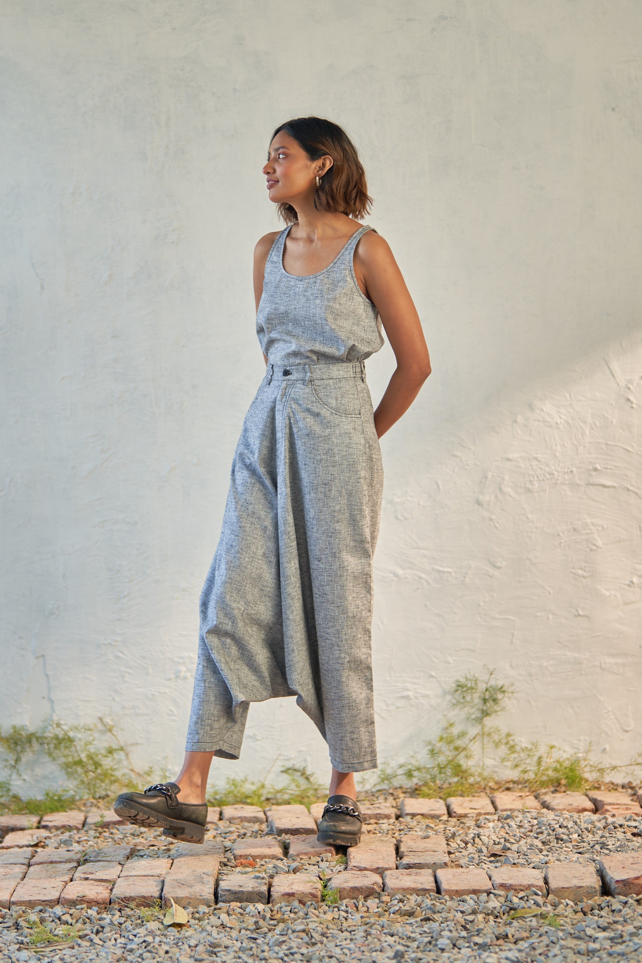 A regal ensemble crafted from classic grey textured cotton. The top boasts an A-line silhouette and versatile design. Paired with harem pants featuring an exaggerated silhouette and detailed with black thread accents. Whether you're hopping the streets or covering new ground, this outfit is your go-to for making a statement with effortless style.
