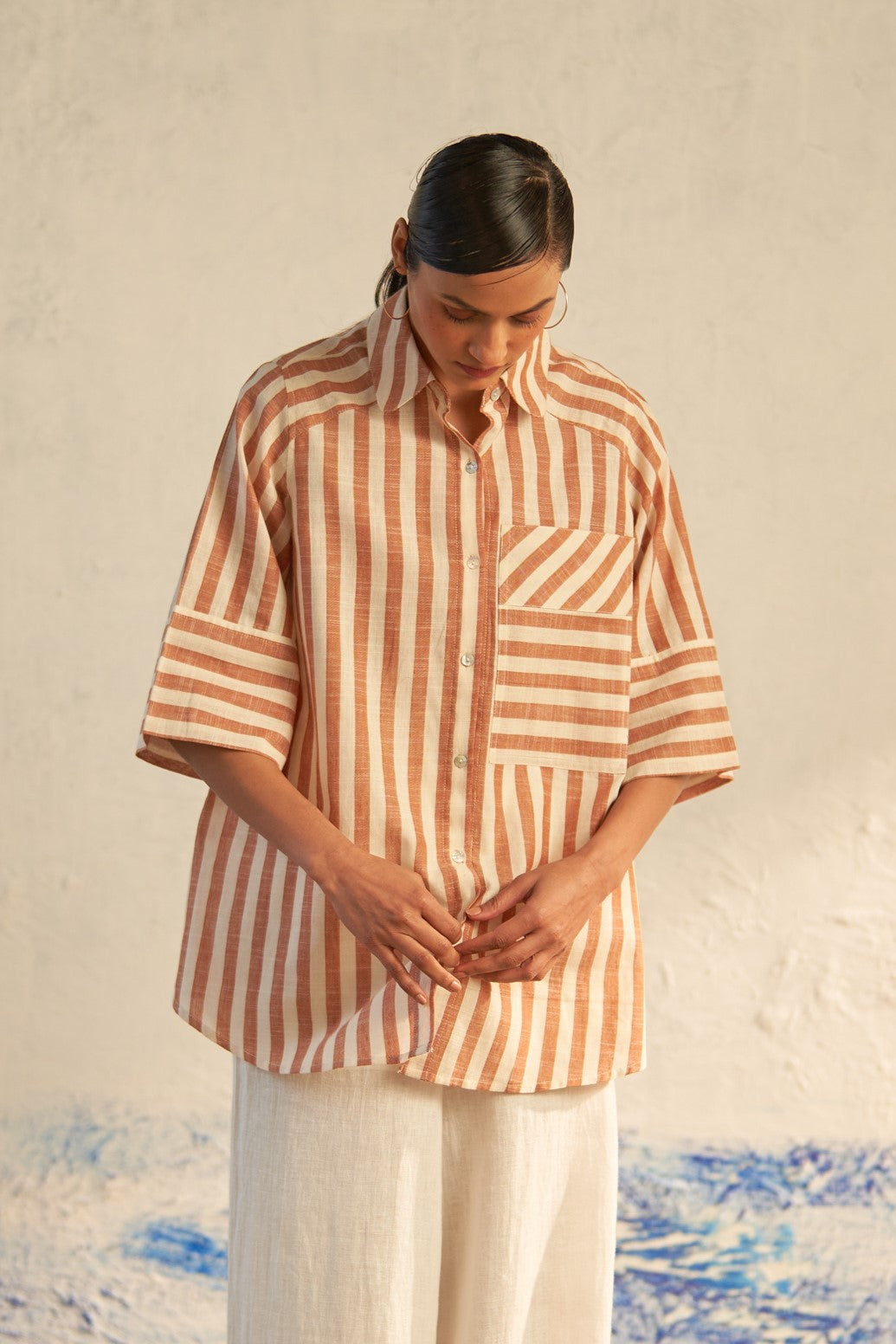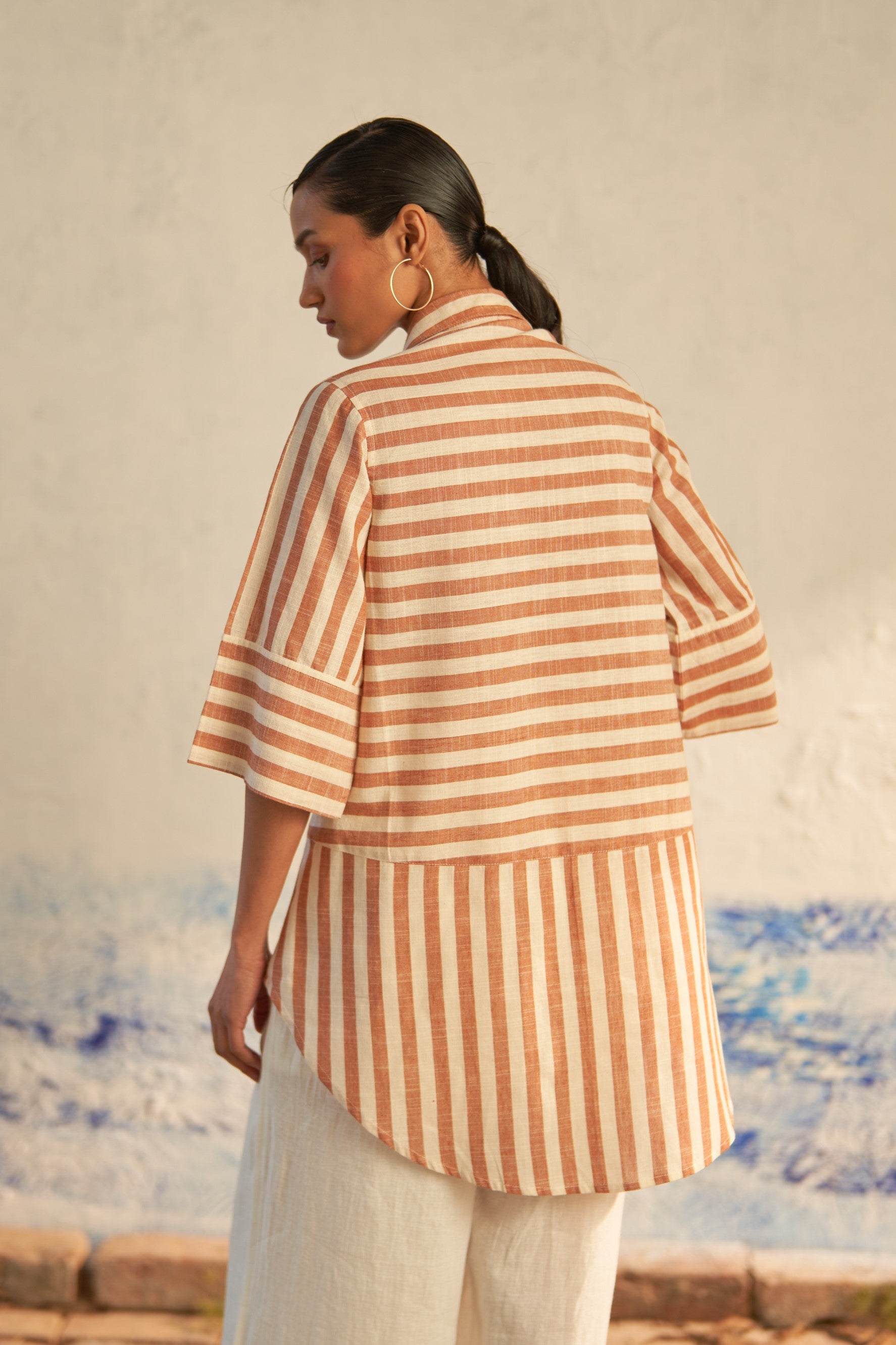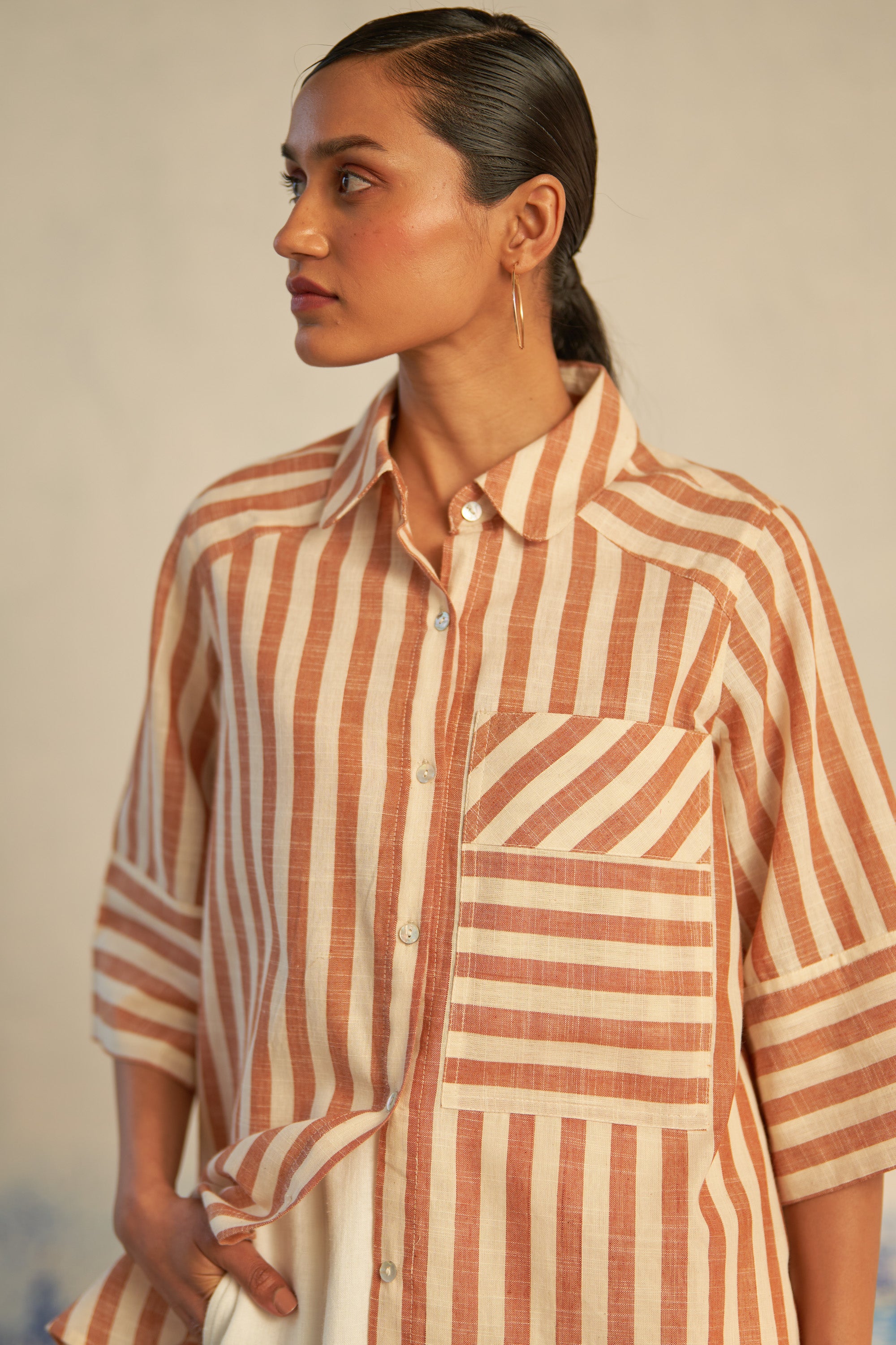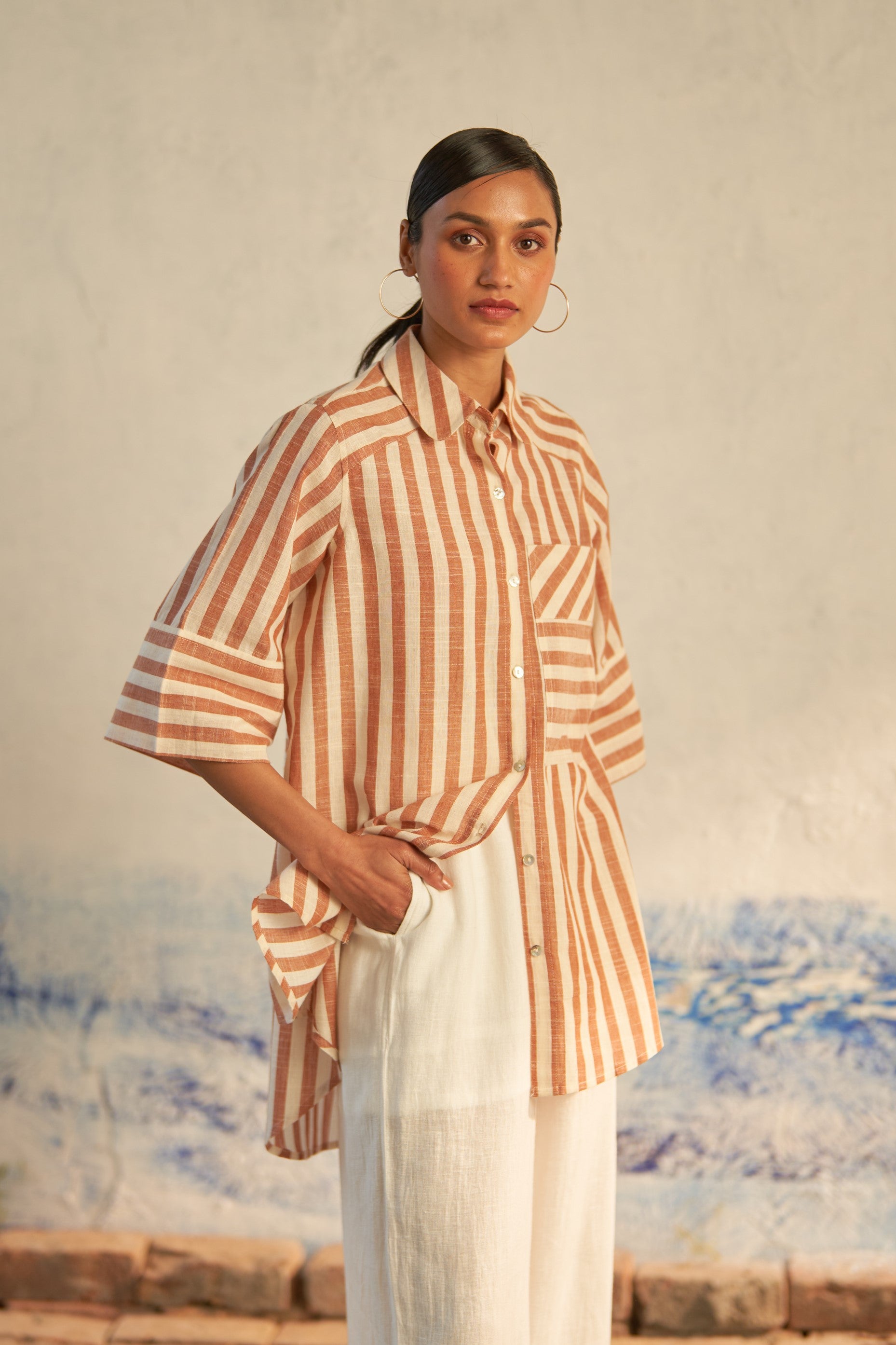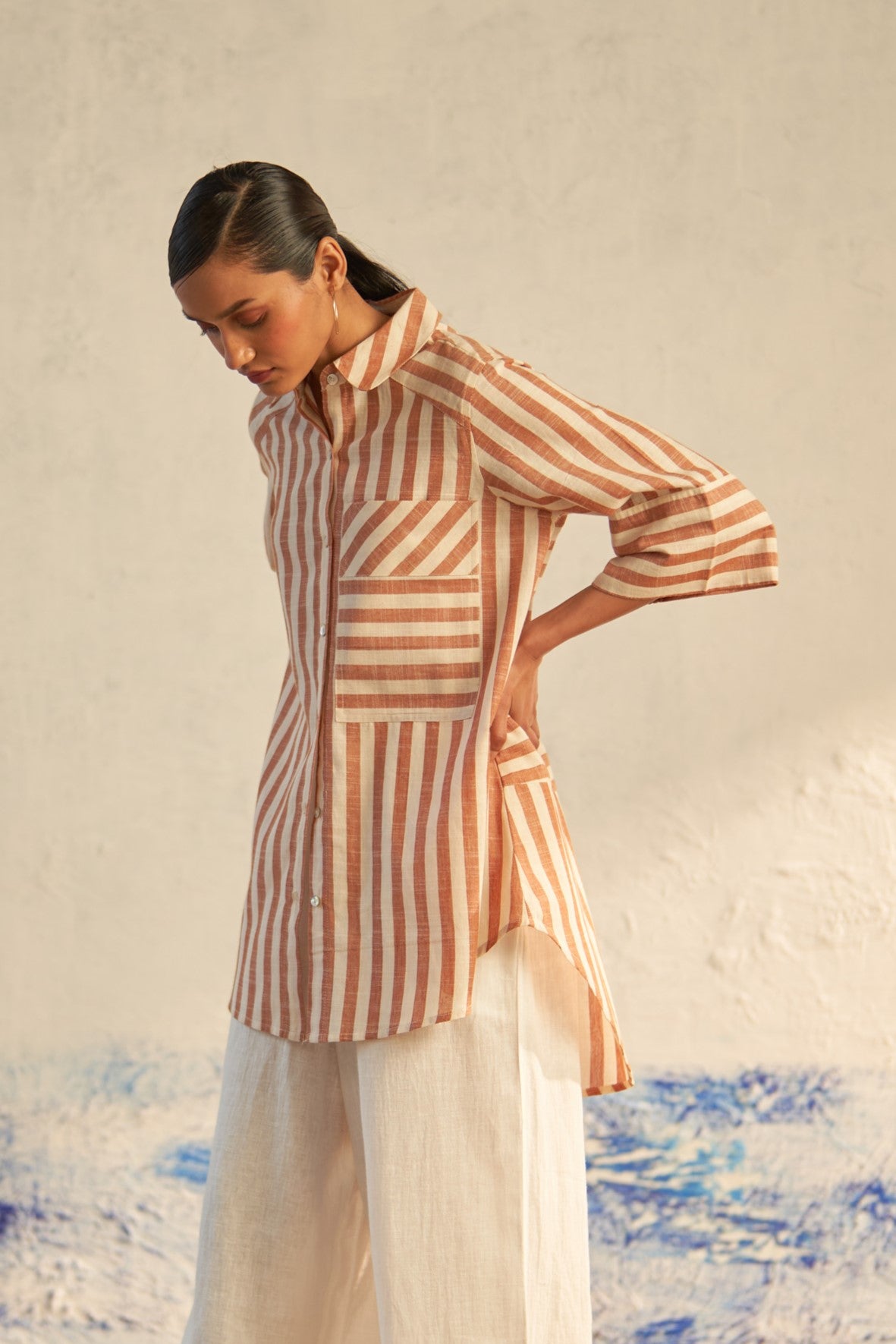 This hi-lo striped shirt seamlessly blends refined tailoring with an effortless, airy silhouette. Boasting details such as a patch pocket, curved hemline, and elegant shell buttons, it exudes sophistication with a playful twist. The directional play of lines and the dynamic hi-lo silhouette create an ensemble that's both chic and fun.