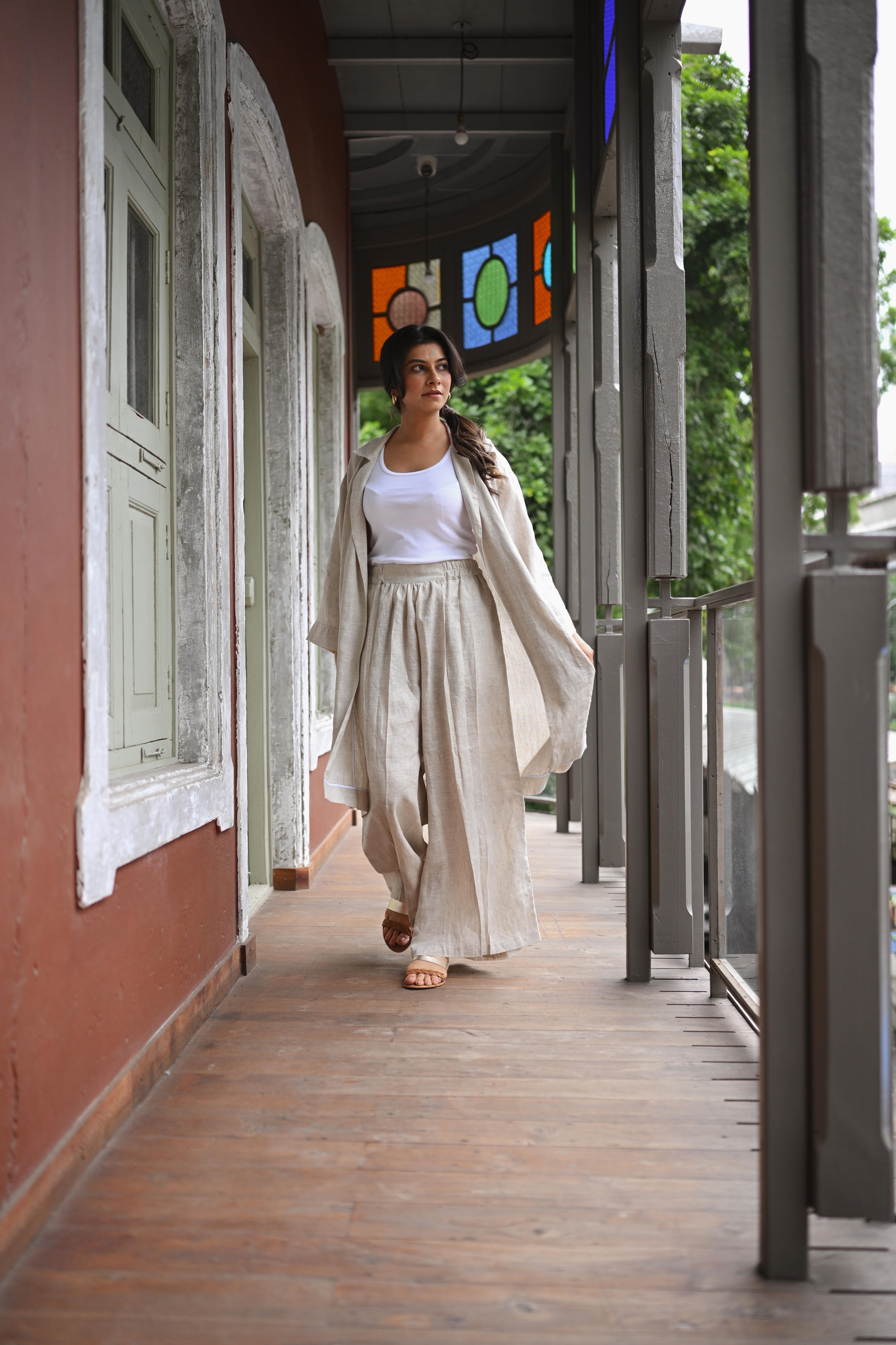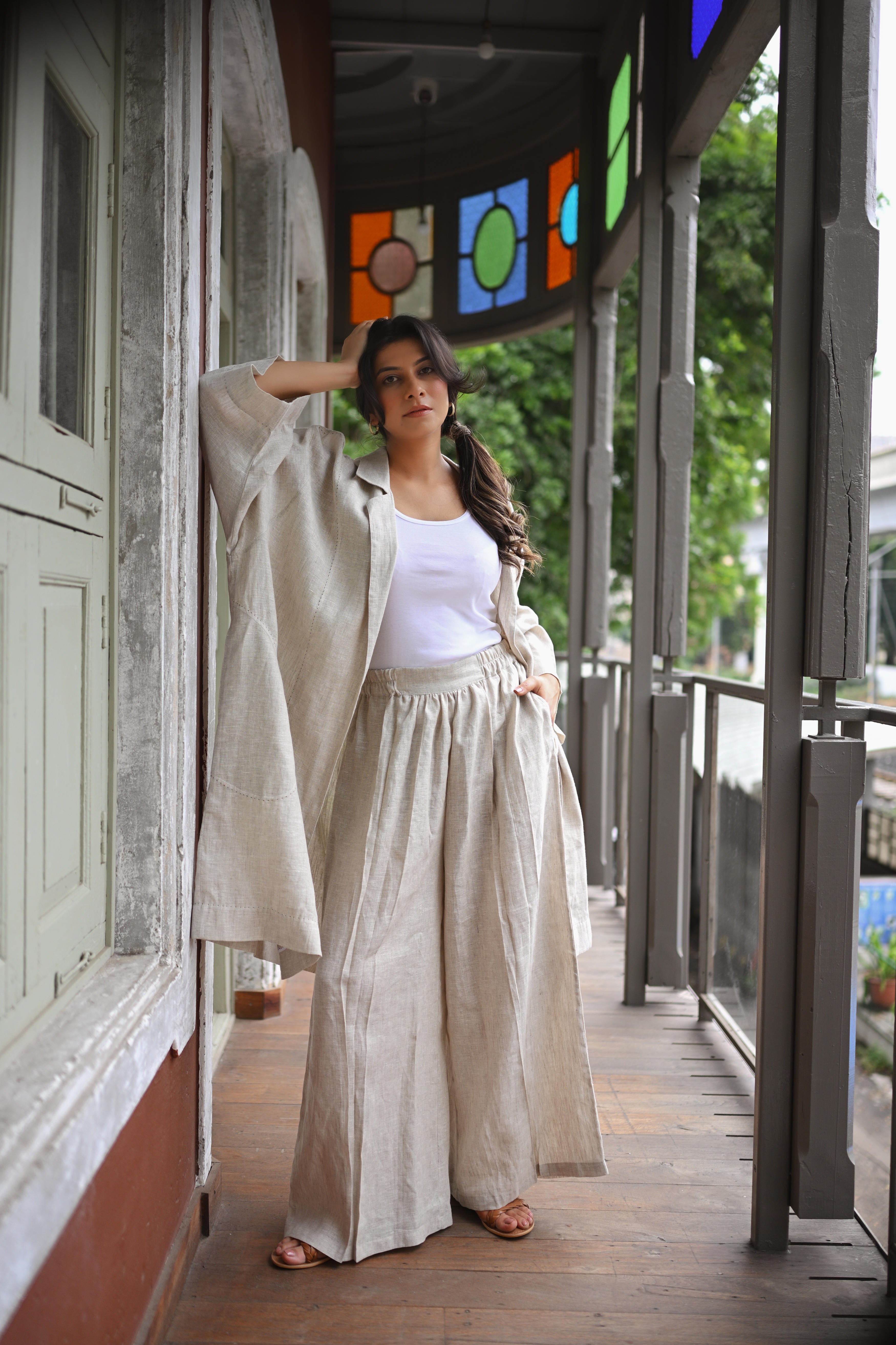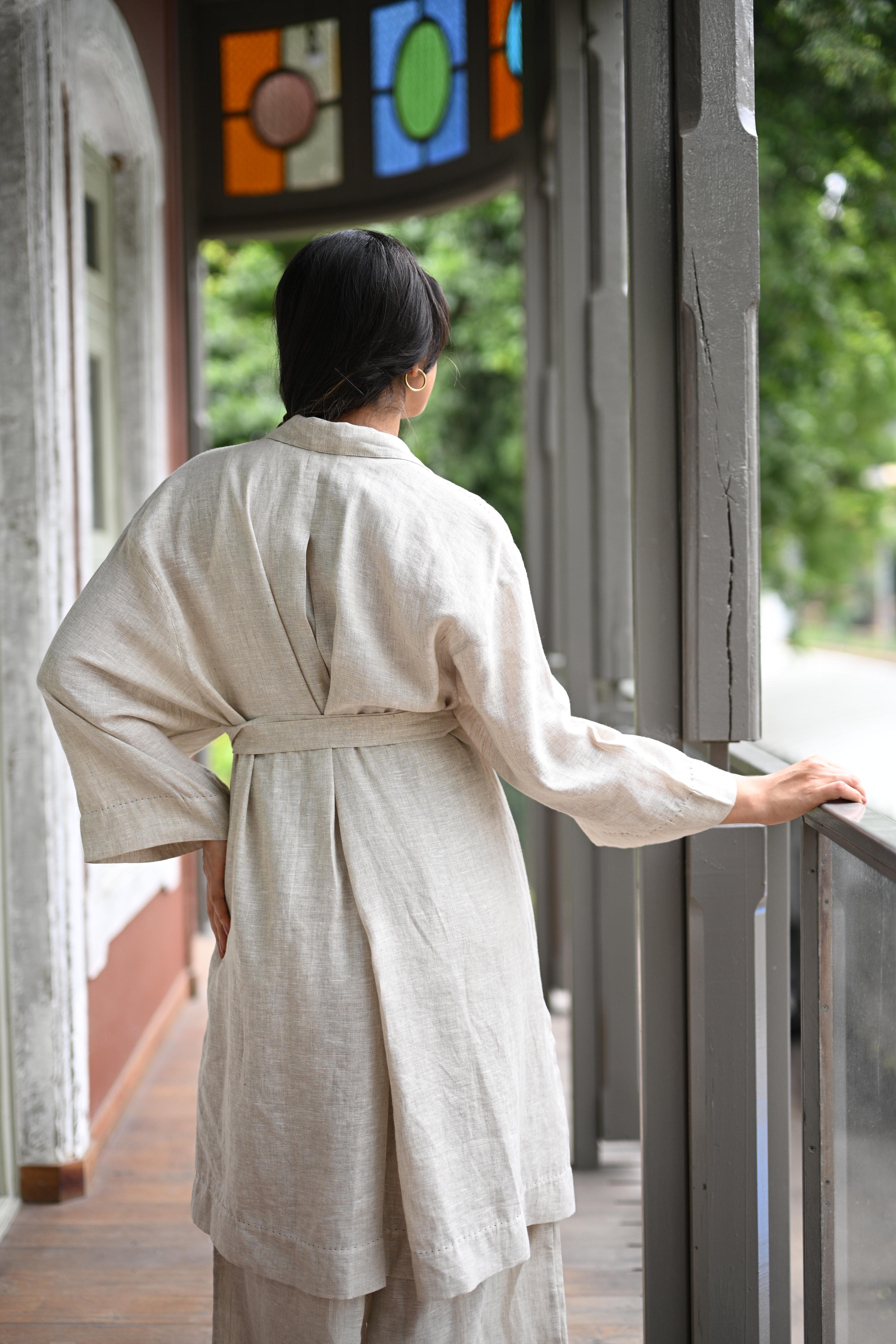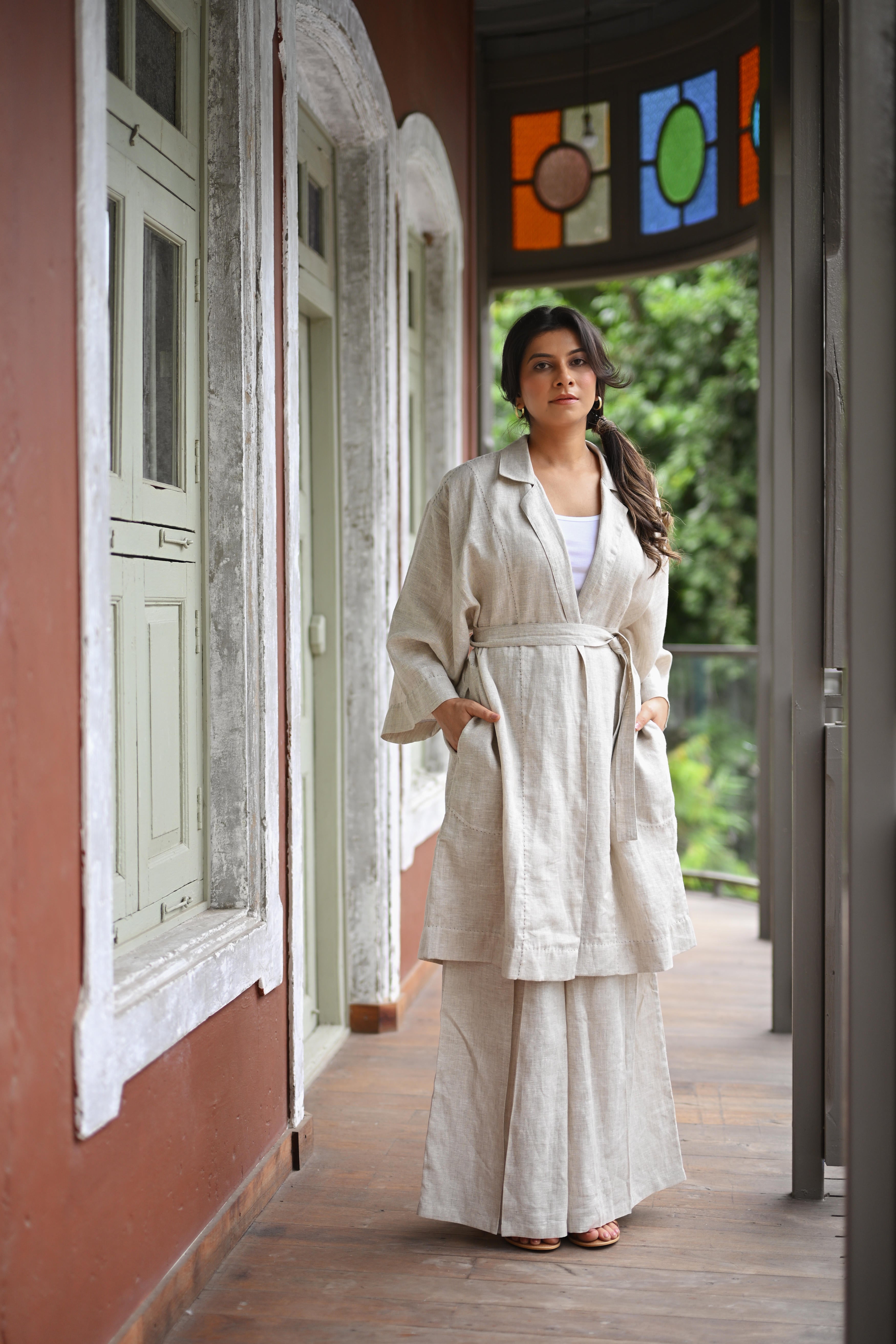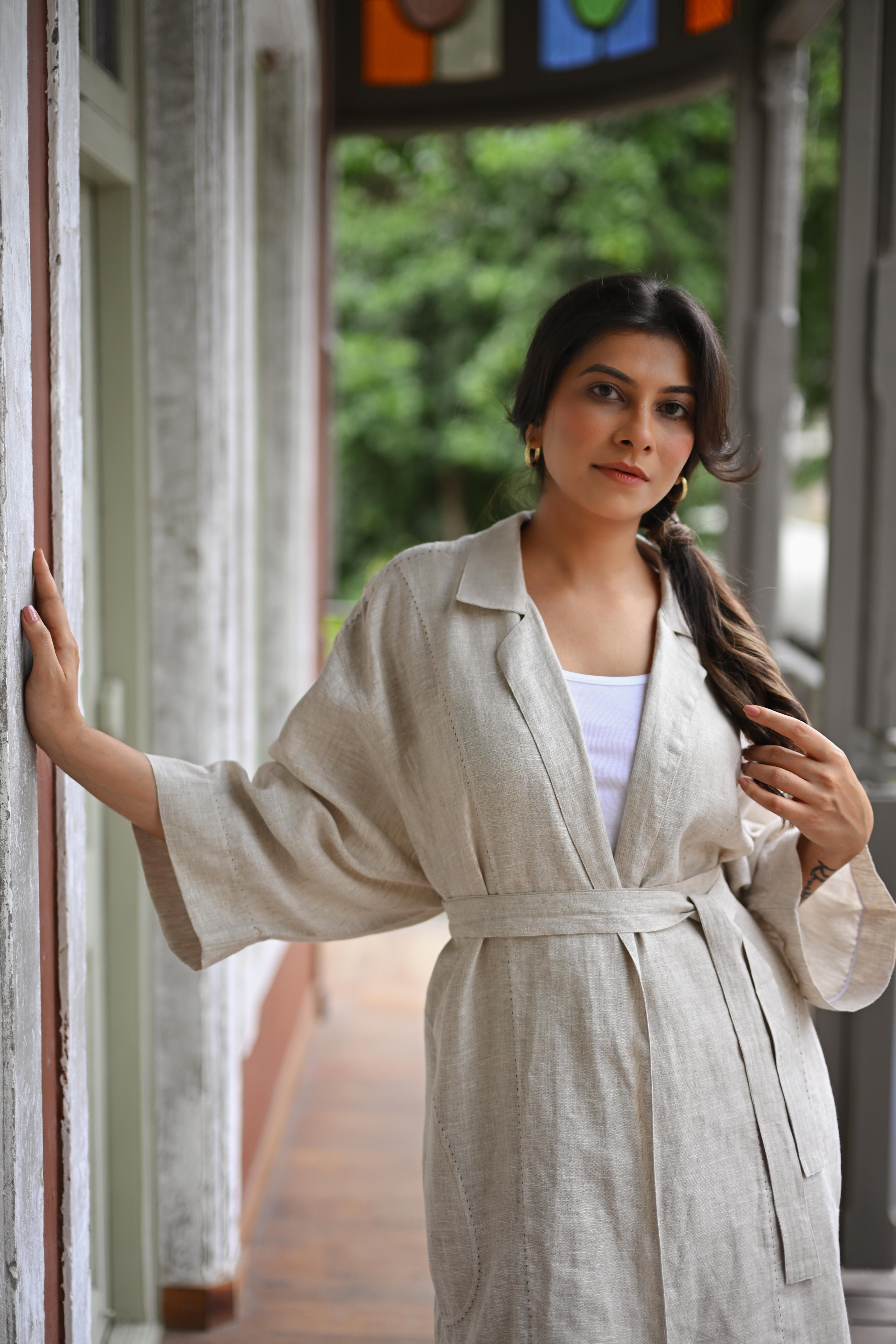 A long Jacket Trench in Organic Linen which can be worn as an open cape or belted for more structure. It can be paired with our Cascadian linen pants or with almost anything from your wardrobe. A true wardrobe basic and essential