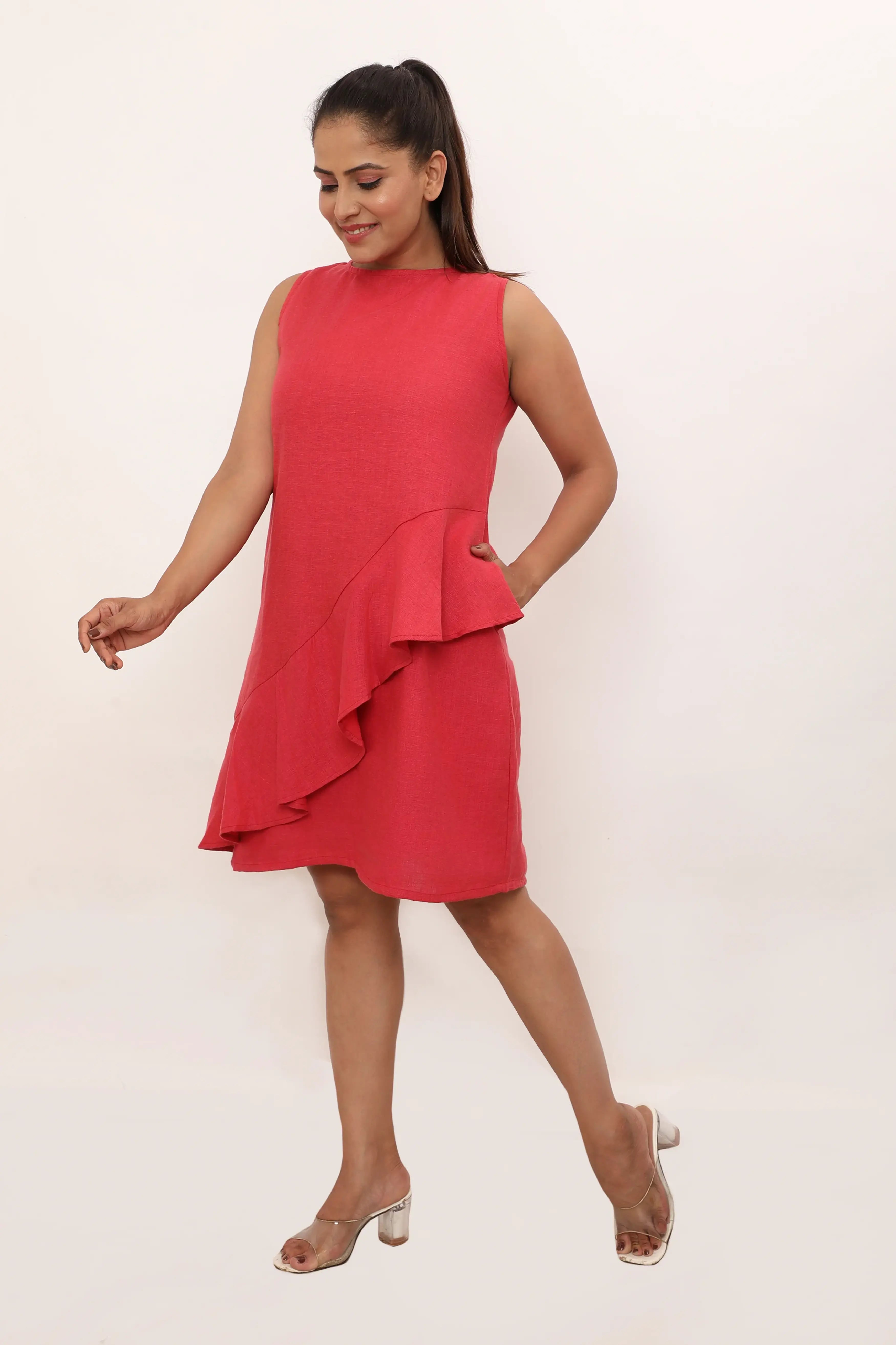 The Cassidy Dress - This sleeveless dress is the epitome of effortless elegance. The striking ruffle detail cascades diagonally across the front, adding a touch of femininity and movement to the sleek silhouette. Crafted from luxurious linen, this dress not only offers style but also ensures comfort throughout the day. Perfect for a brunch date or a casual evening out, pair it with your favourite heels or flats for a versatile look that transitions easily from day to night.