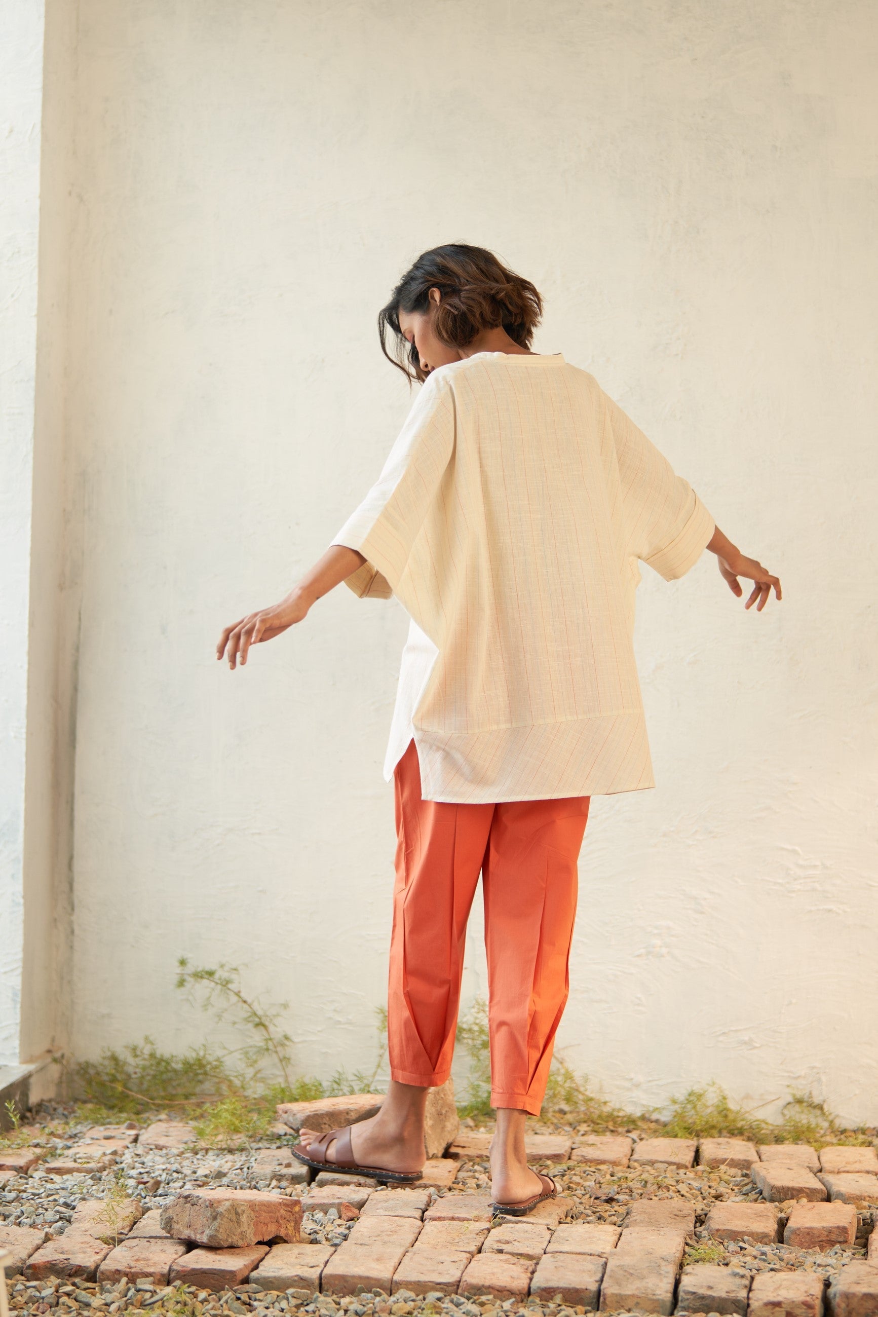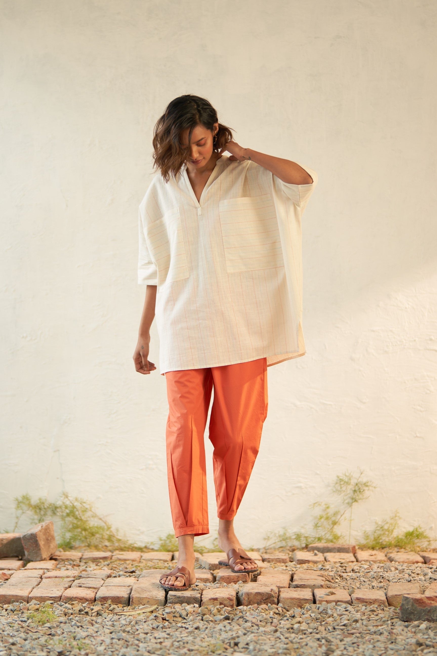 Casual Bliss Set, designed for leisurely day ventures and a feeling of comfort and freedom. Canoopi's boho-inspired top features a flattering V neckline and standout pockets adorned with a subtle twist. Crafted from lightweight textured cotton, this piece exudes effortless style. Paired with soft orange casual salwar pants pleated at the bottom, complete with an elasticated waistband and drawstring for added comfort and ease.