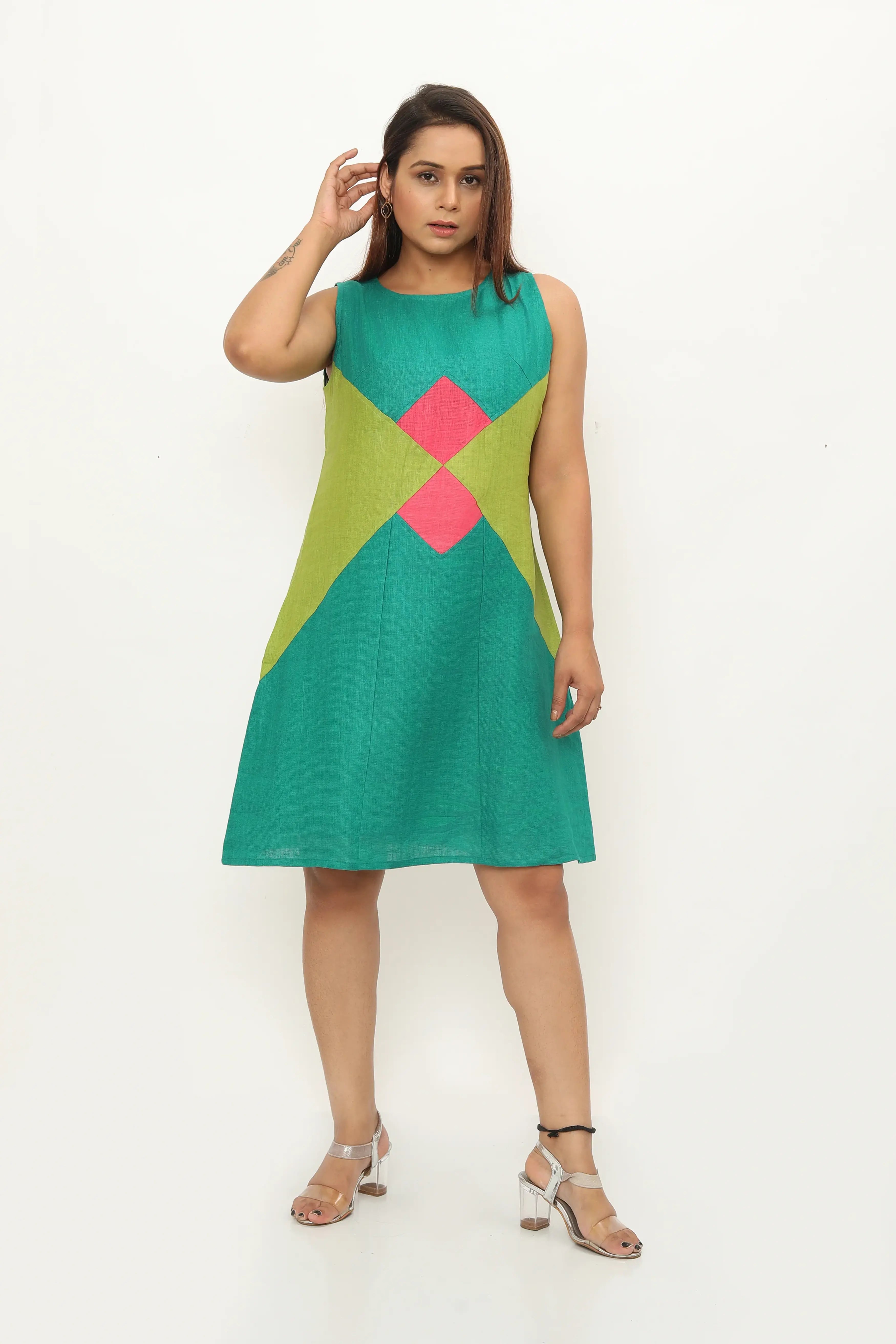 Elevate your wardrobe with the Catalina Dress, a knee-length marvel that exudes elegance and charm. Crafted with meticulous attention to detail, this dress features a refined round neck and tailored waist, ensuring a flattering fit for every occasion. What sets it apart? Striking colour-blocked patches in triangular and diamond motifs adorning the waist, ensuring you stand out with every step. Experience luxurious comfort and timeless sophistication with the Catalina Dress, where style meets individuality.