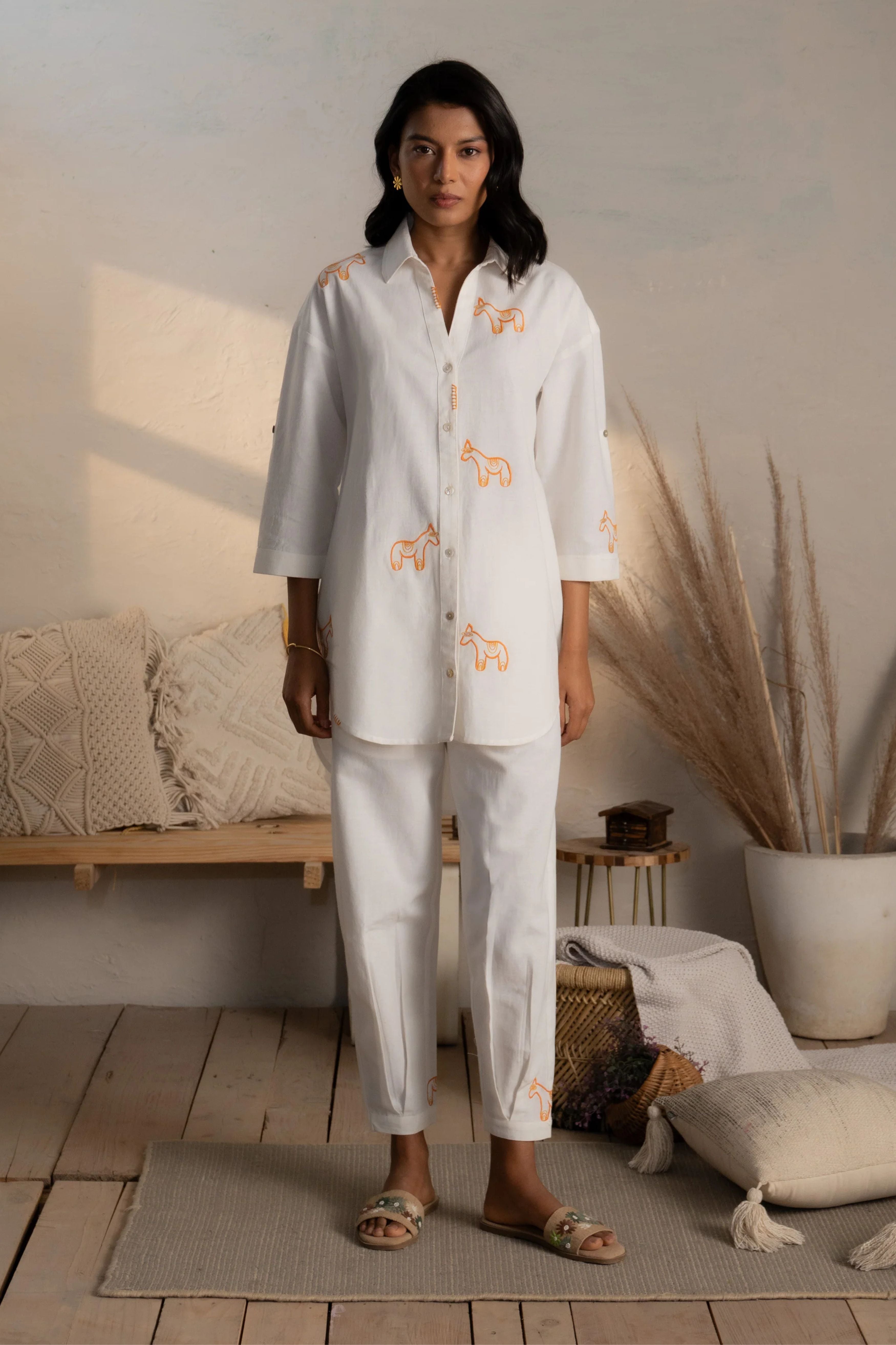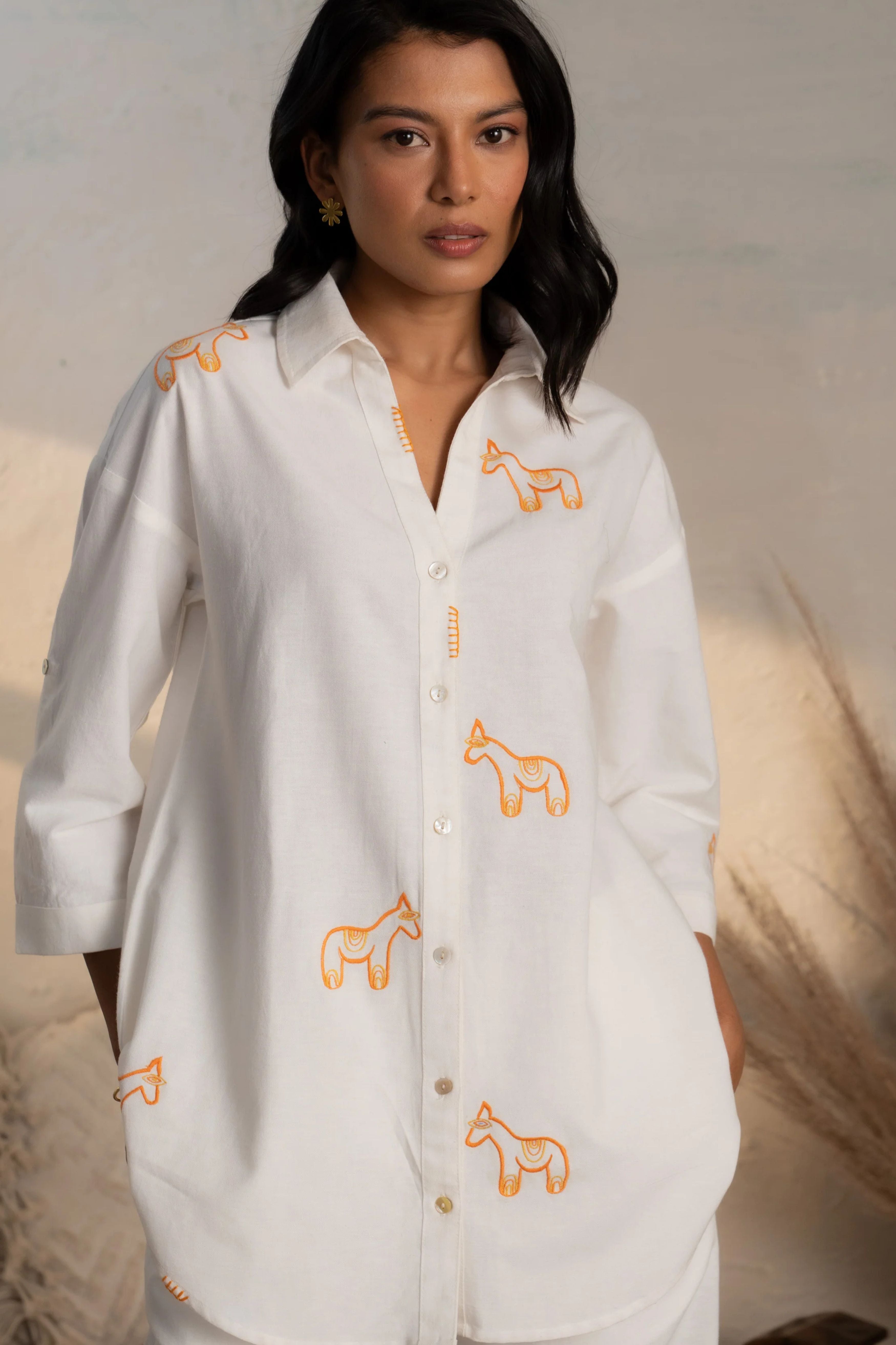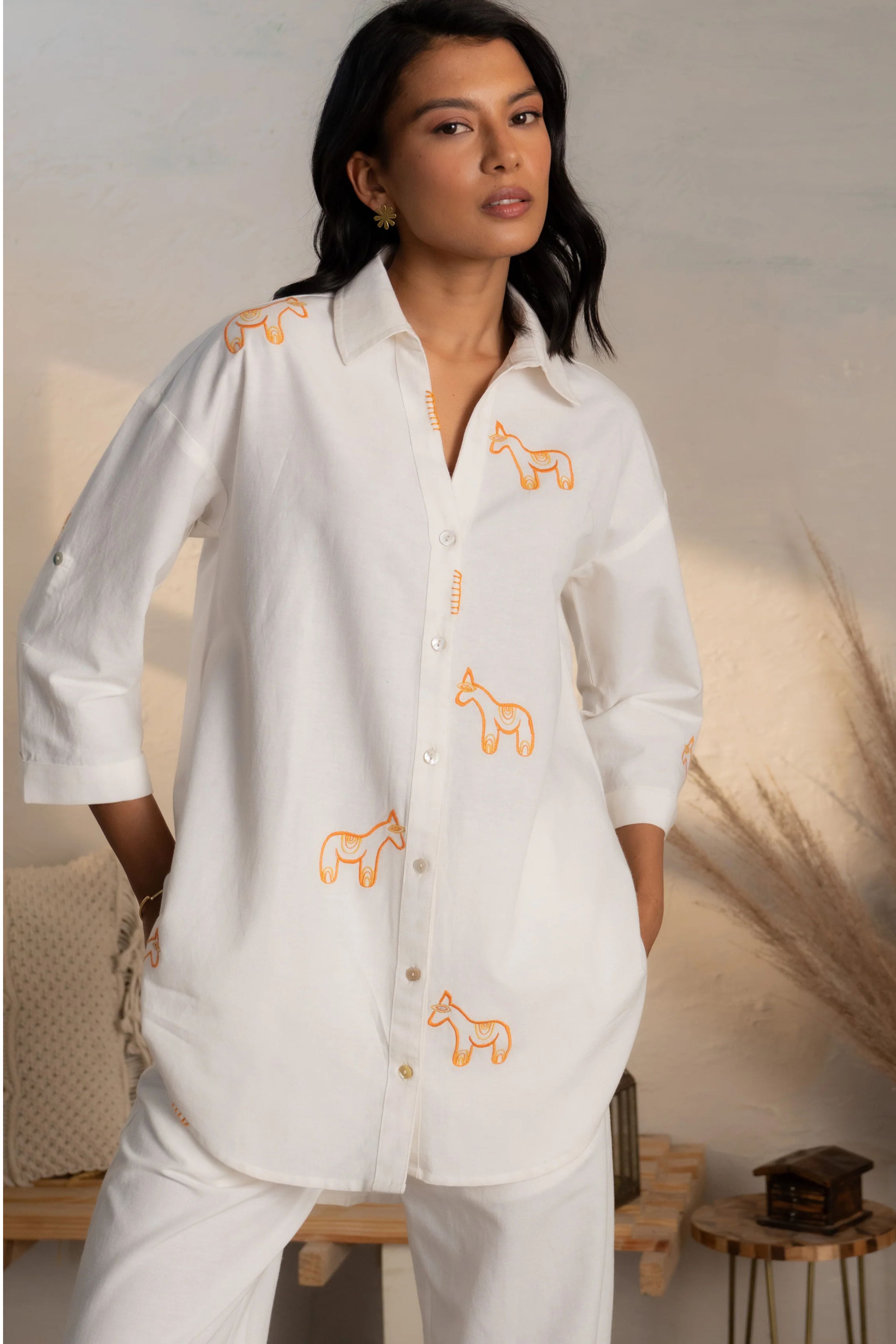 Make a bold statement with the Cavalier Crisp Shirt Coord, featuring vibrant orange horse embroidery that captures spontaneity and elegance. Crafted from breathable flex fabric, this oversized shirt boasts a flattering V-neckline and a gently curved hemline, offering a relaxed yet polished vibe. Whether paired with pleated pants for an effortlessly chic outfit or styled independently, this shirt embodies comfort and charm for any occasion.