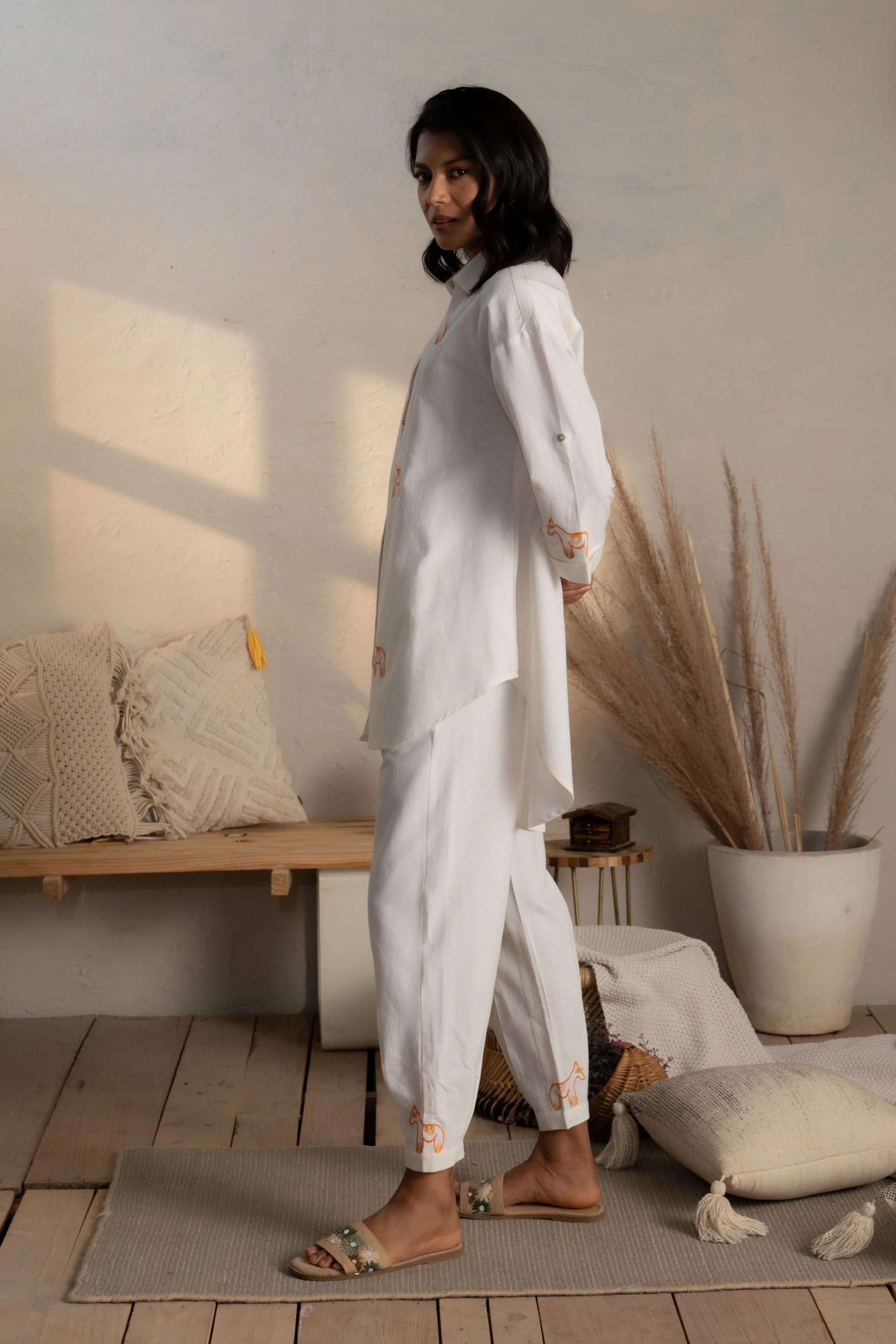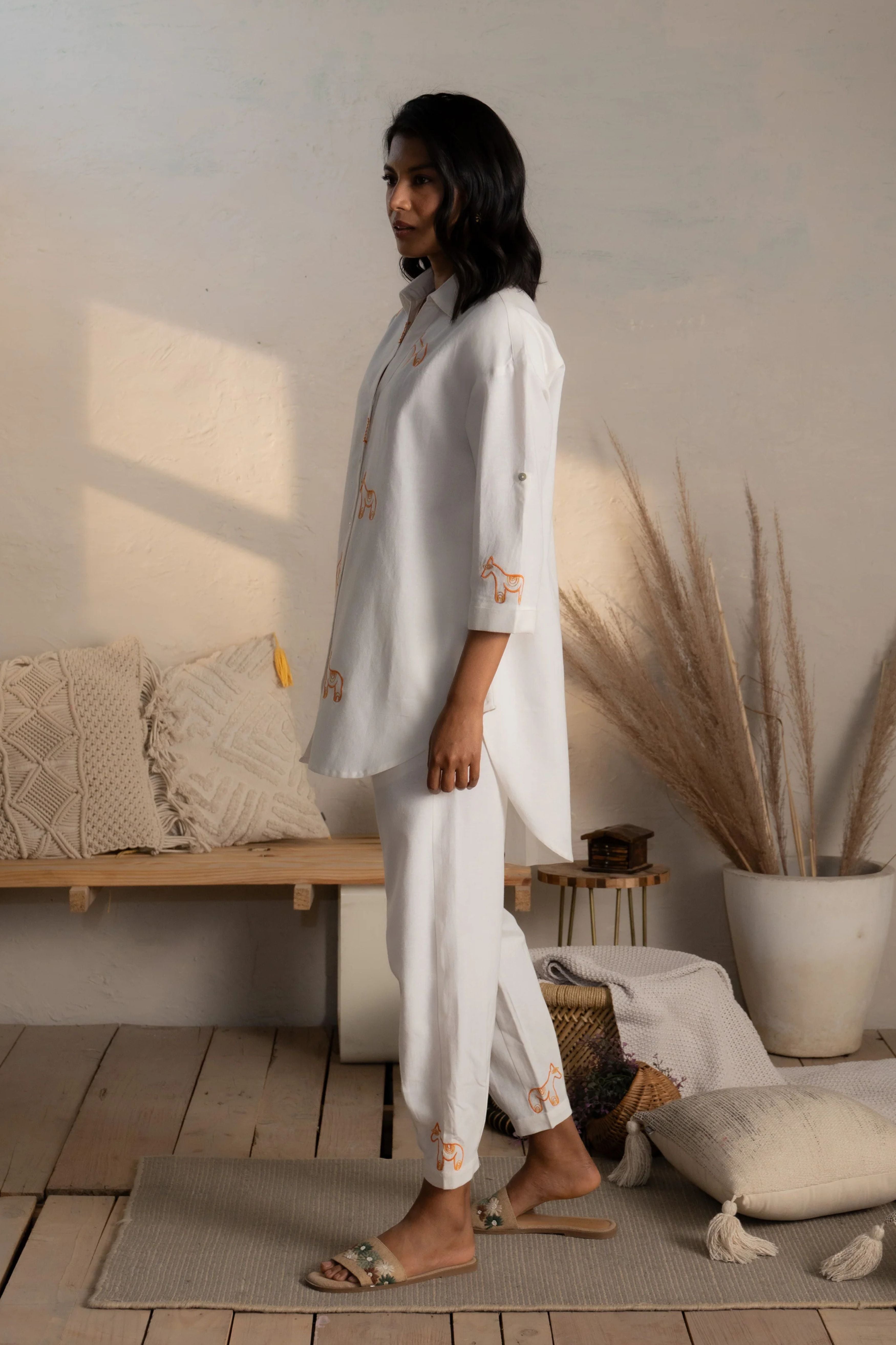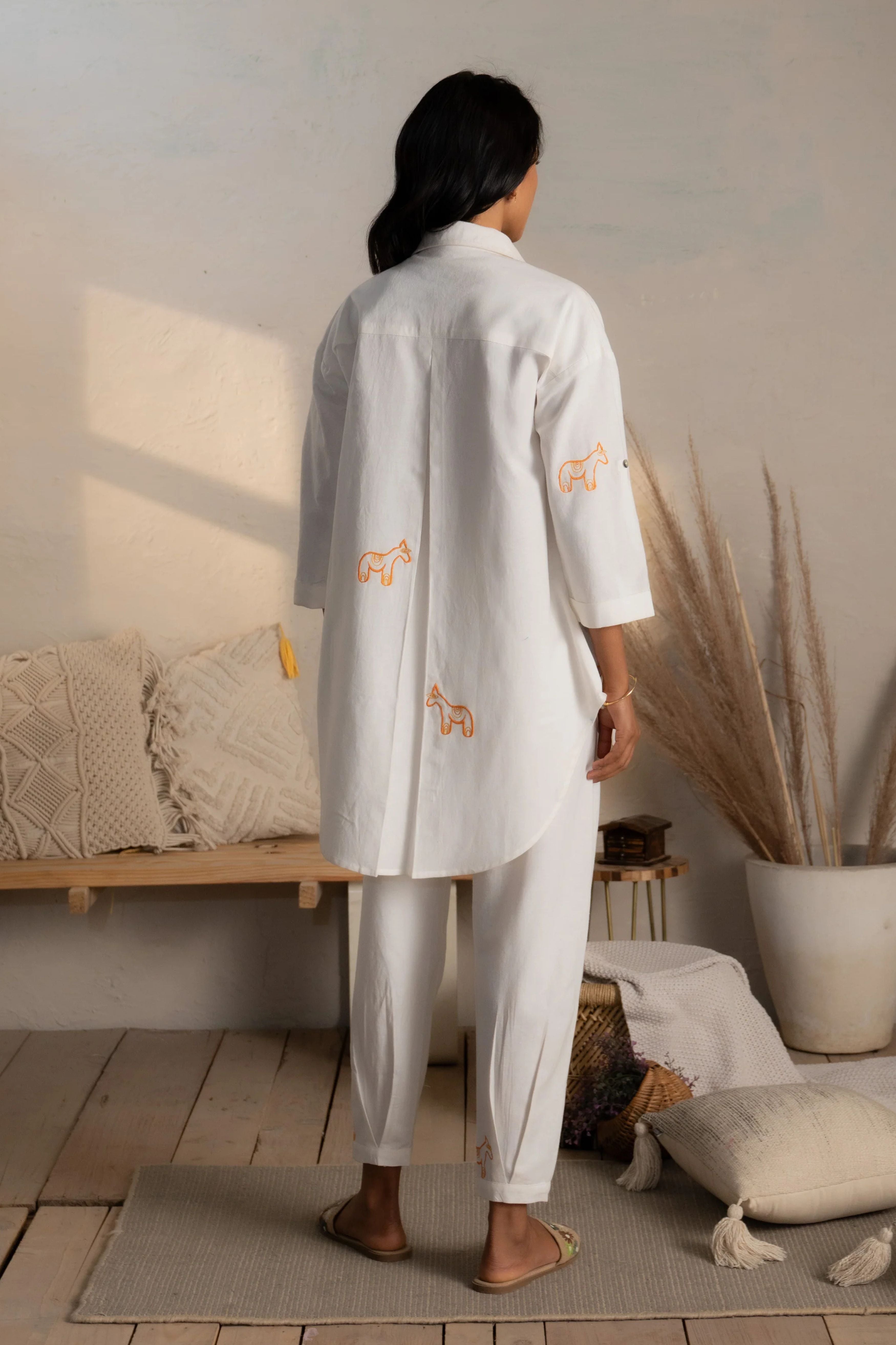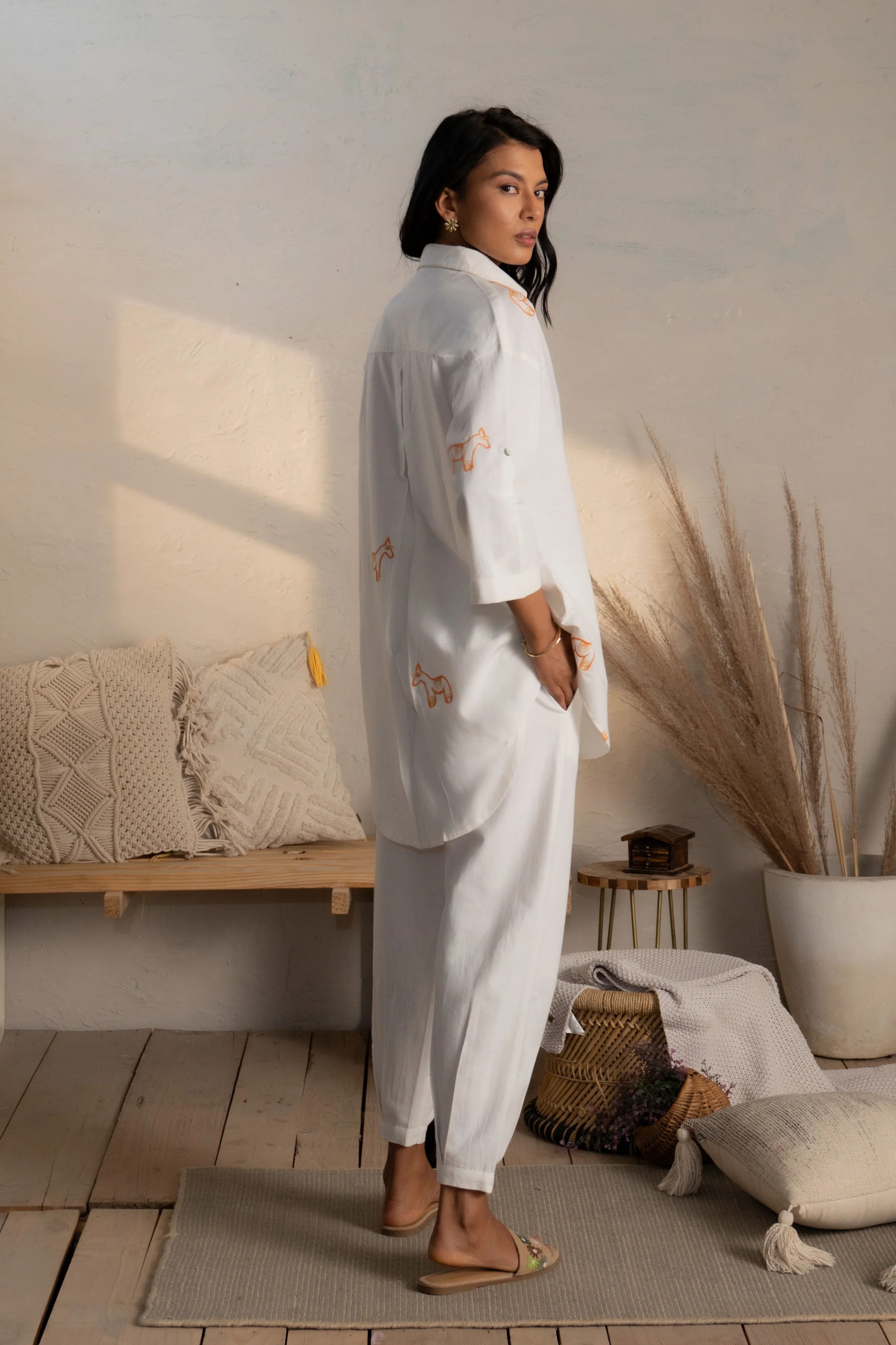 Make a bold statement with the Cavalier Crisp Shirt Coord, featuring vibrant orange horse embroidery that captures spontaneity and elegance. Crafted from breathable flex fabric, this oversized shirt boasts a flattering V-neckline and a gently curved hemline, offering a relaxed yet polished vibe. Whether paired with pleated pants for an effortlessly chic outfit or styled independently, this shirt embodies comfort and charm for any occasion.