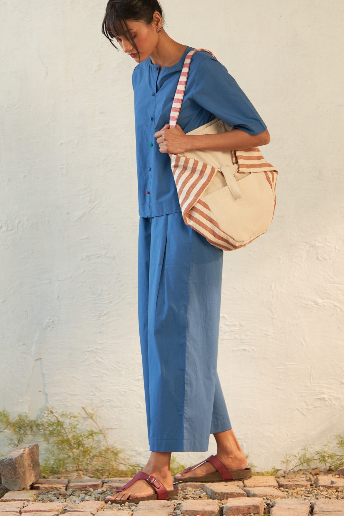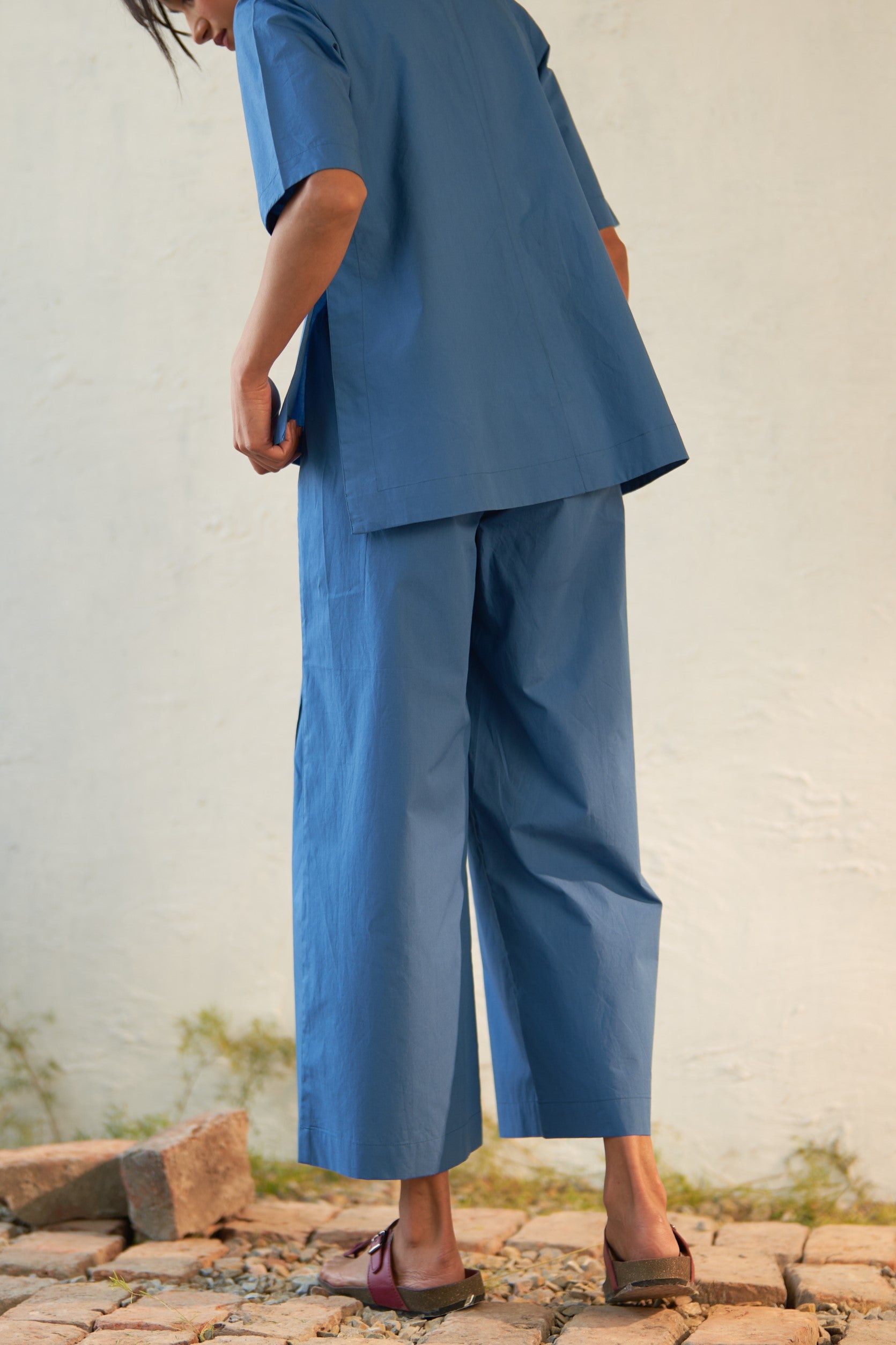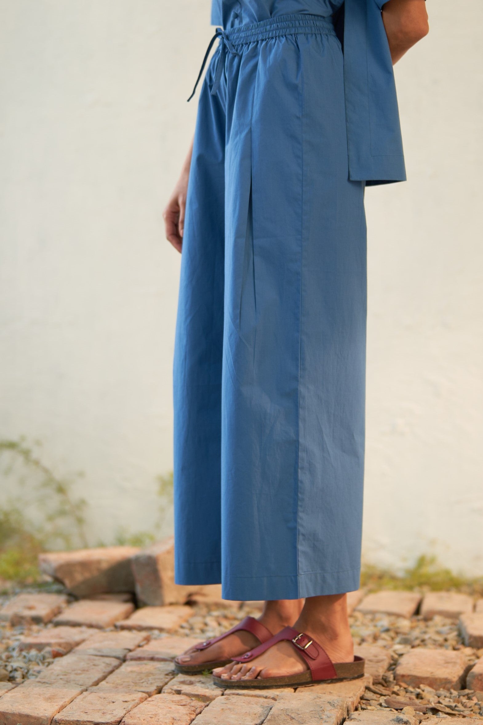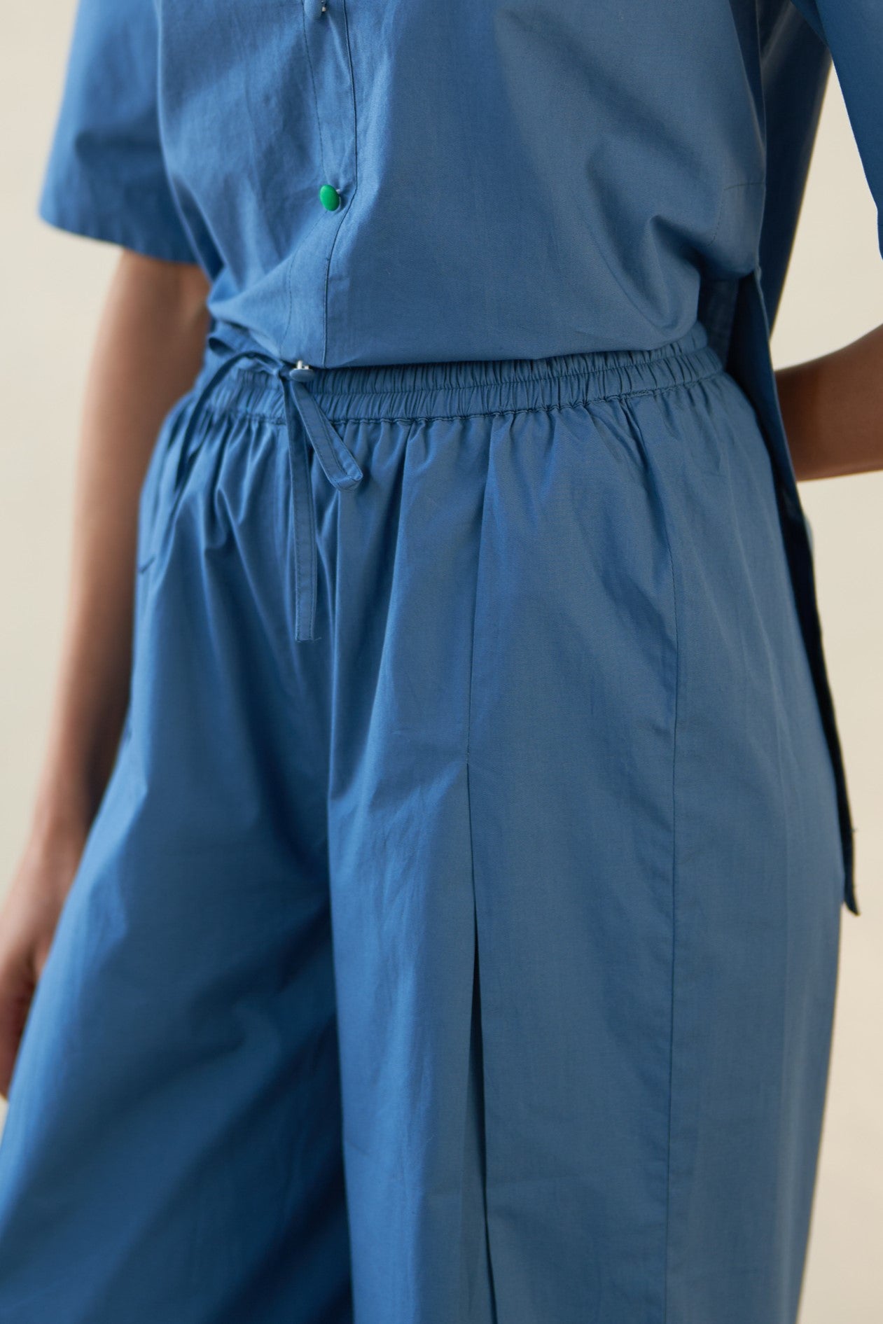 Canoopi's drawstring pleated pants in refreshing blue. These must-have pants boast a convenient elasticated waistband and stylish inward box pleats, adding a touch of sophistication to your ensemble. The wide legs create a relaxed, breezy silhouette, perfect for warm-weather outings. Crafted from high-quality cotton poplin, they offer both comfort and style for your summer adventures.
