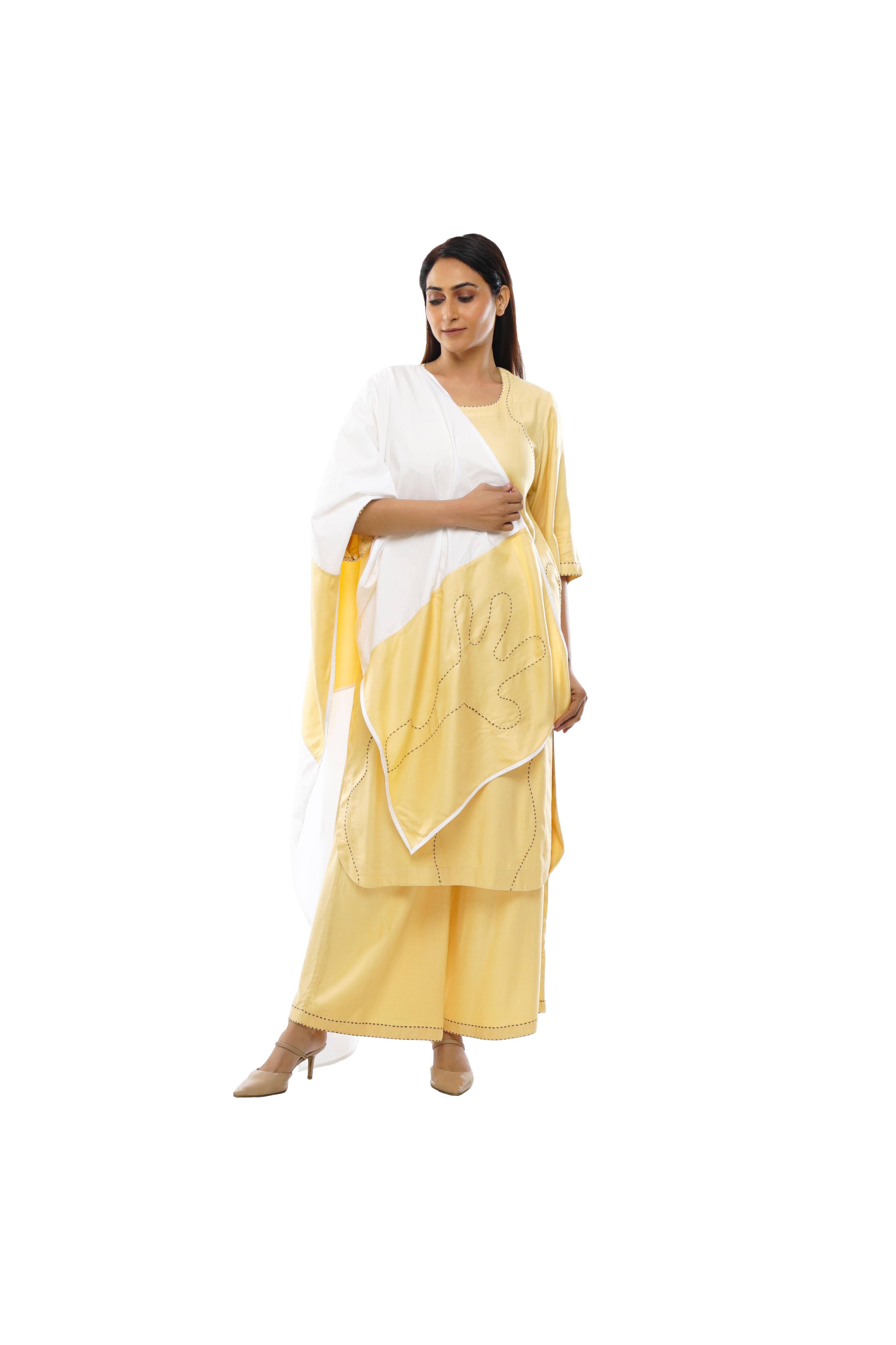 Bring elegance to your everyday with this 3-piece kurta set featuring all-over chawal takka embroidery and matching pants. The dupatta in soft yellow and white adds an effortless finish, while the elasticated waist ensures all-day comfort with no compromise on style.