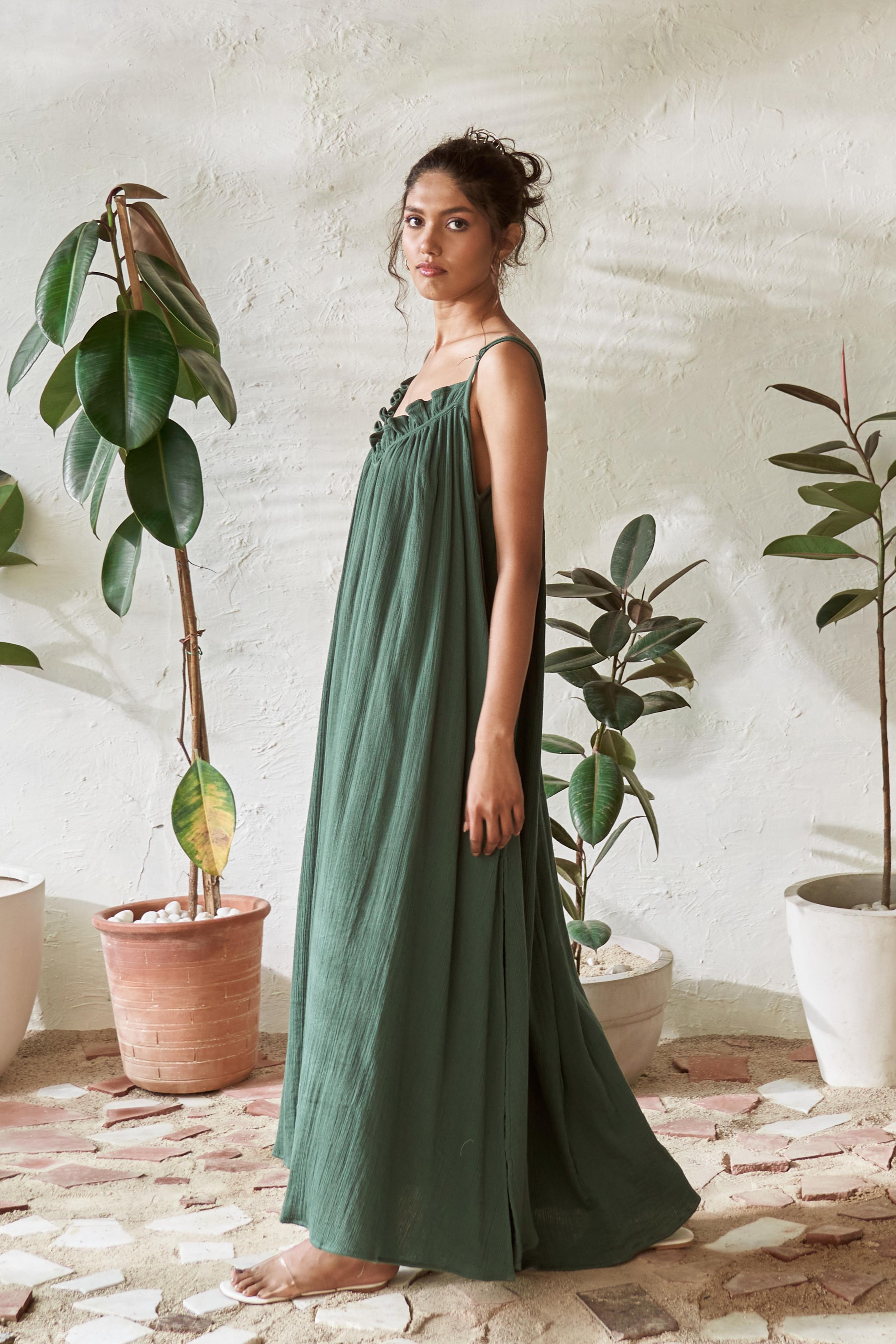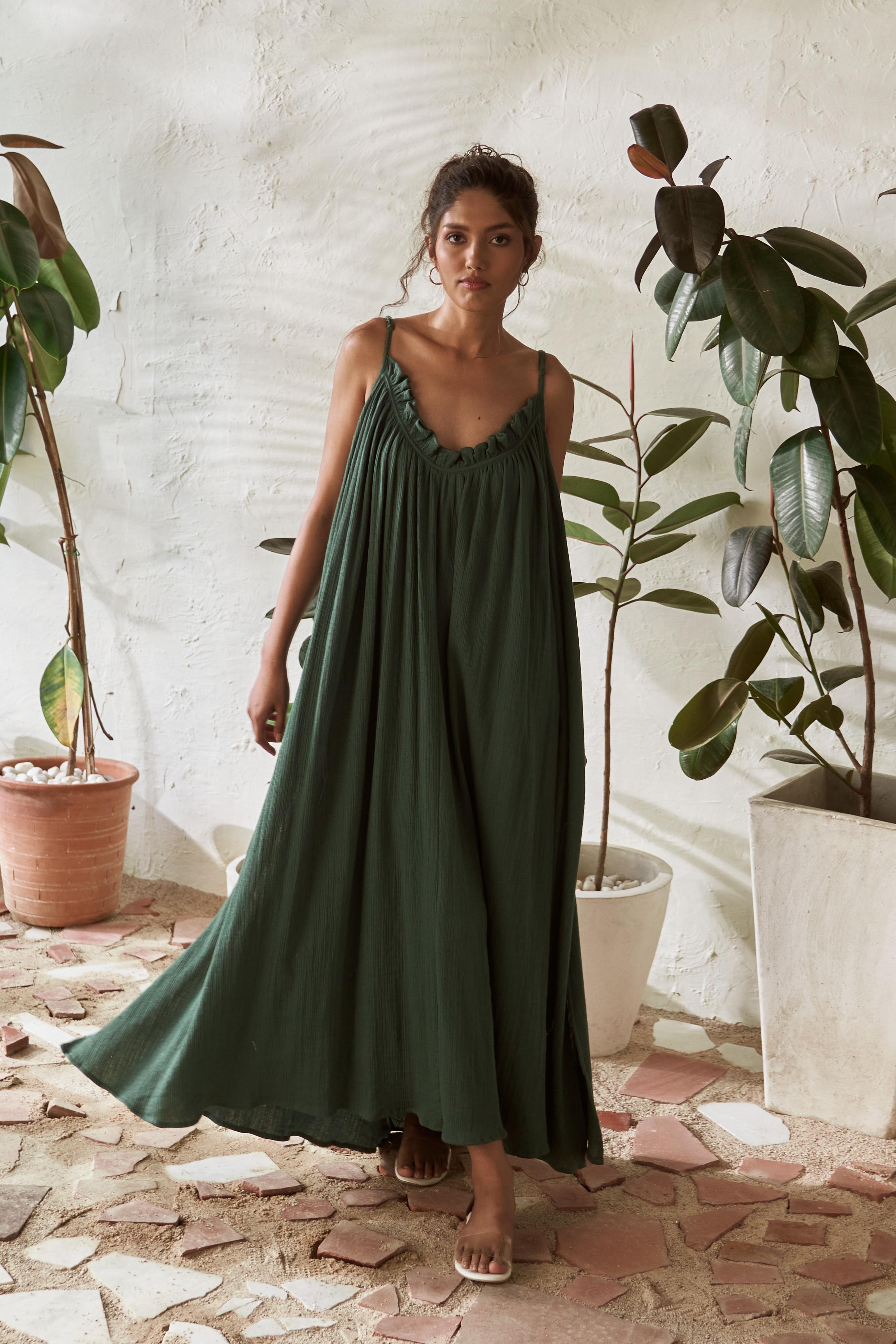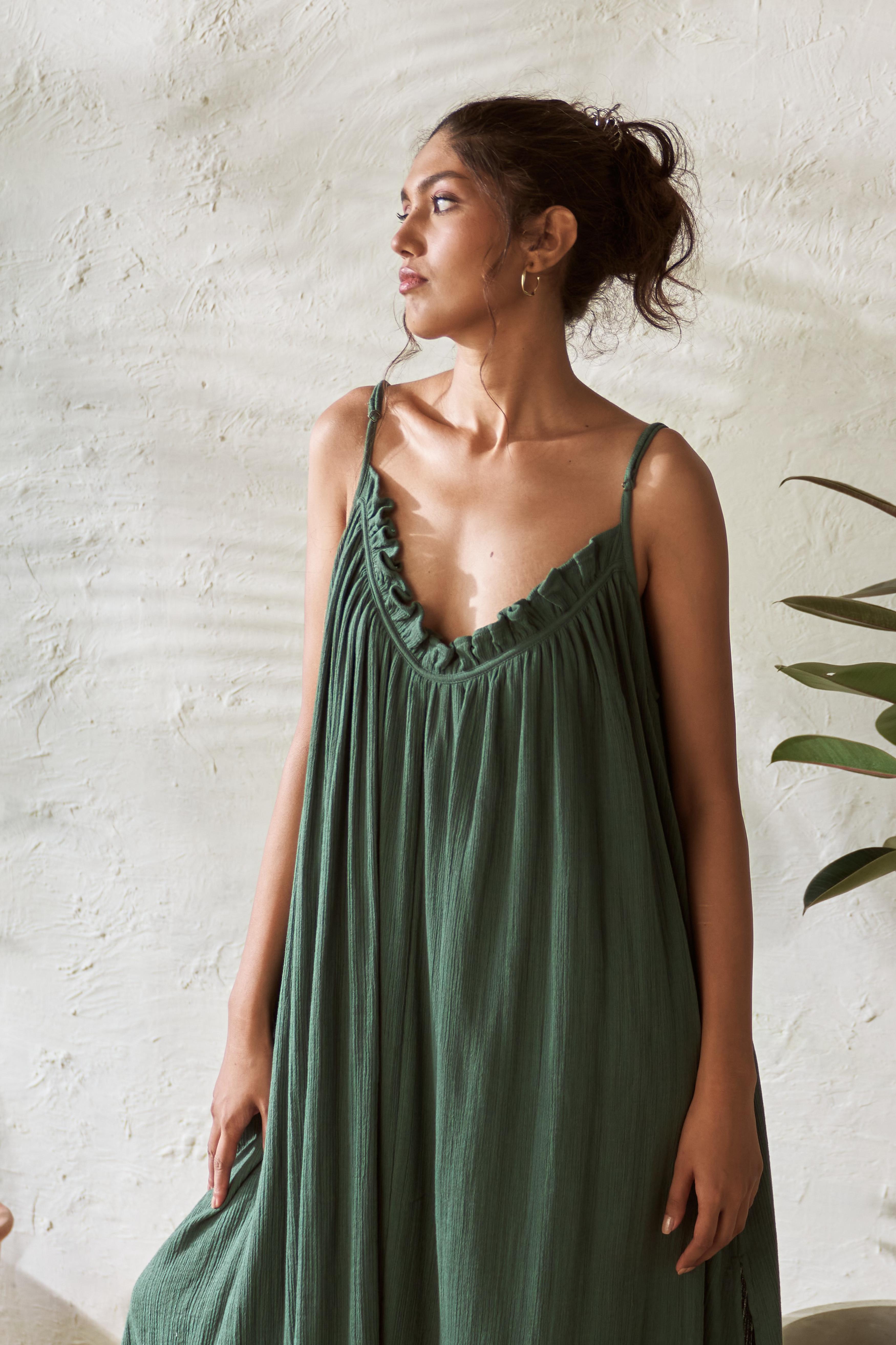 Step into refined style with the Chicory Dress, a leafy green floor-length gown perfect for summer soirées and elegant events. Crafted for a flowing silhouette that drapes effortlessly, this dress exudes grace with every movement. The dipped ruffled neckline adds a soft, romantic touch, while the delicate straps offer a sophisticated finish. The vibrant green hue brings a refreshing pop of color to your wardrobe, making the Chicory Dress a standout choice for any occasion that calls for chic and effortless elegance.