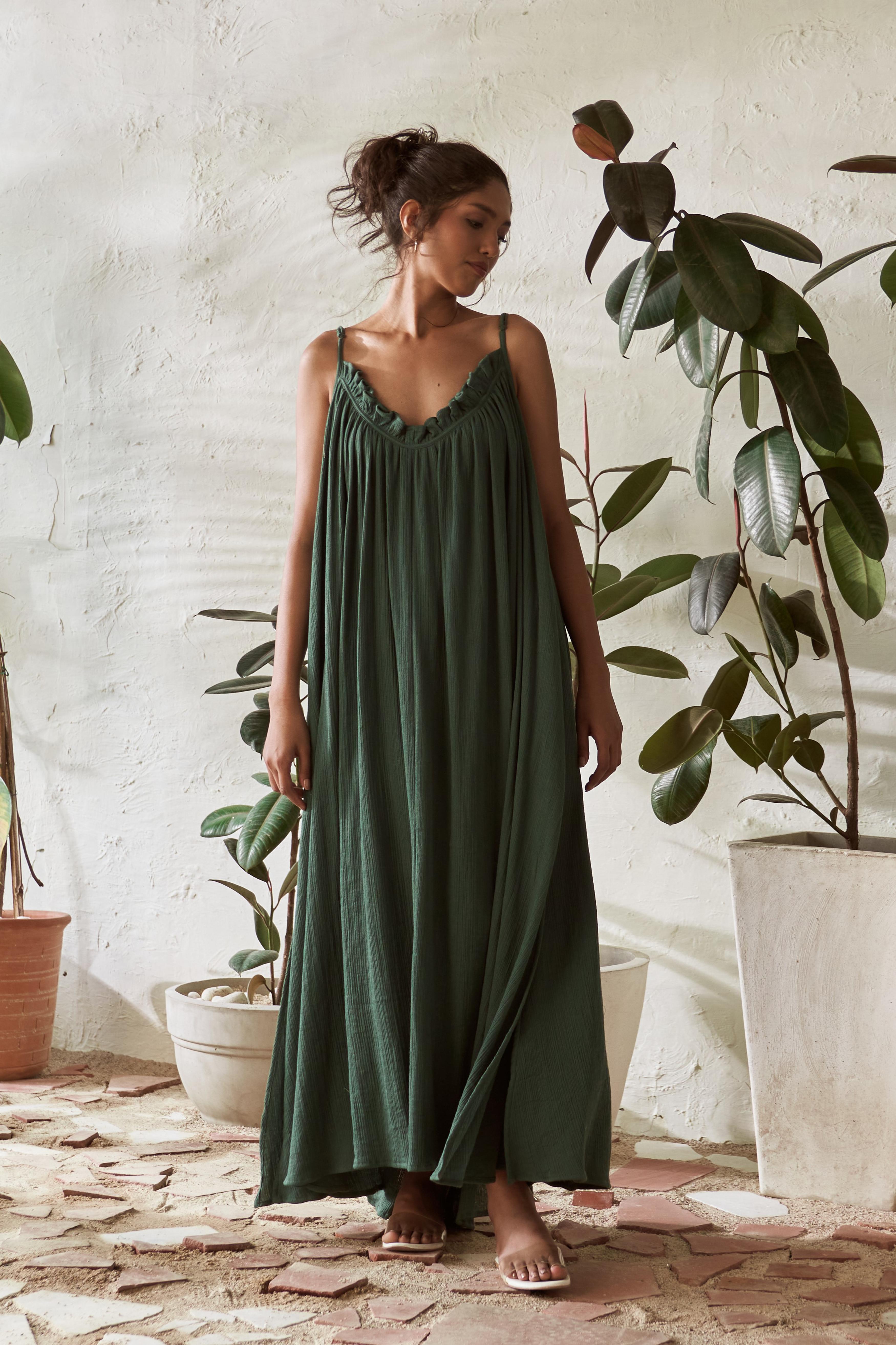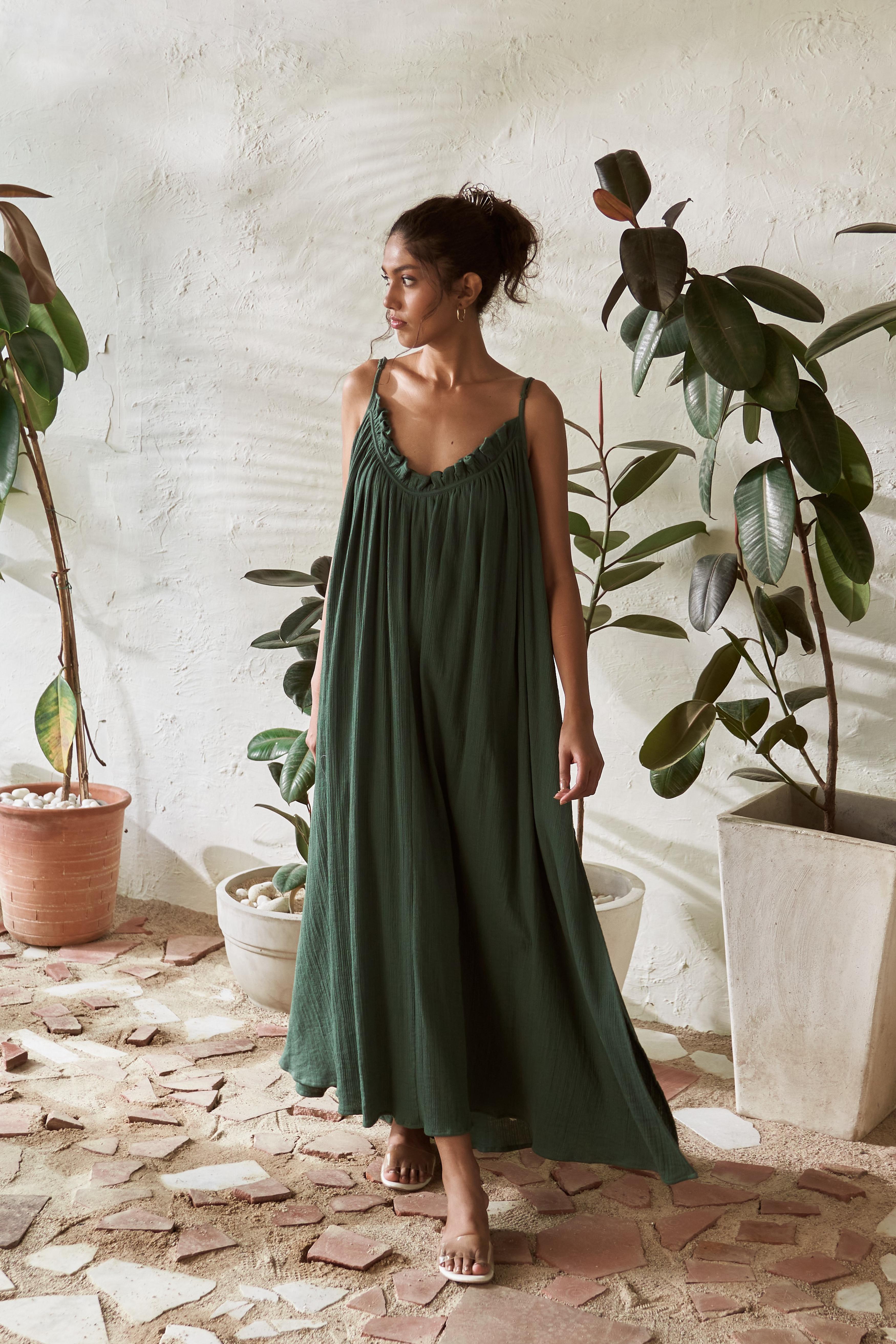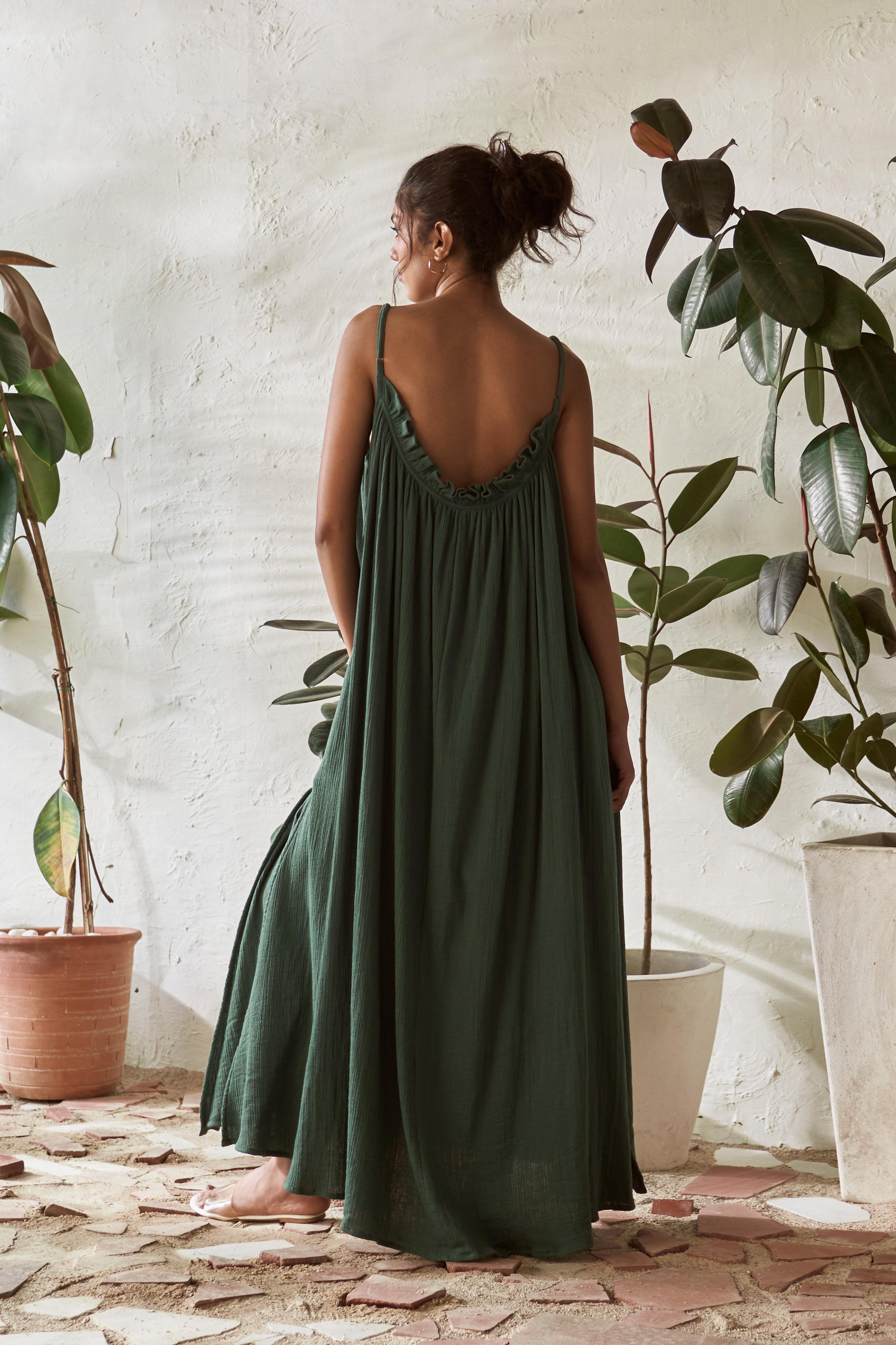 Step into refined style with the Chicory Dress, a leafy green floor-length gown perfect for summer soirées and elegant events. Crafted for a flowing silhouette that drapes effortlessly, this dress exudes grace with every movement. The dipped ruffled neckline adds a soft, romantic touch, while the delicate straps offer a sophisticated finish. The vibrant green hue brings a refreshing pop of color to your wardrobe, making the Chicory Dress a standout choice for any occasion that calls for chic and effortless elegance.
