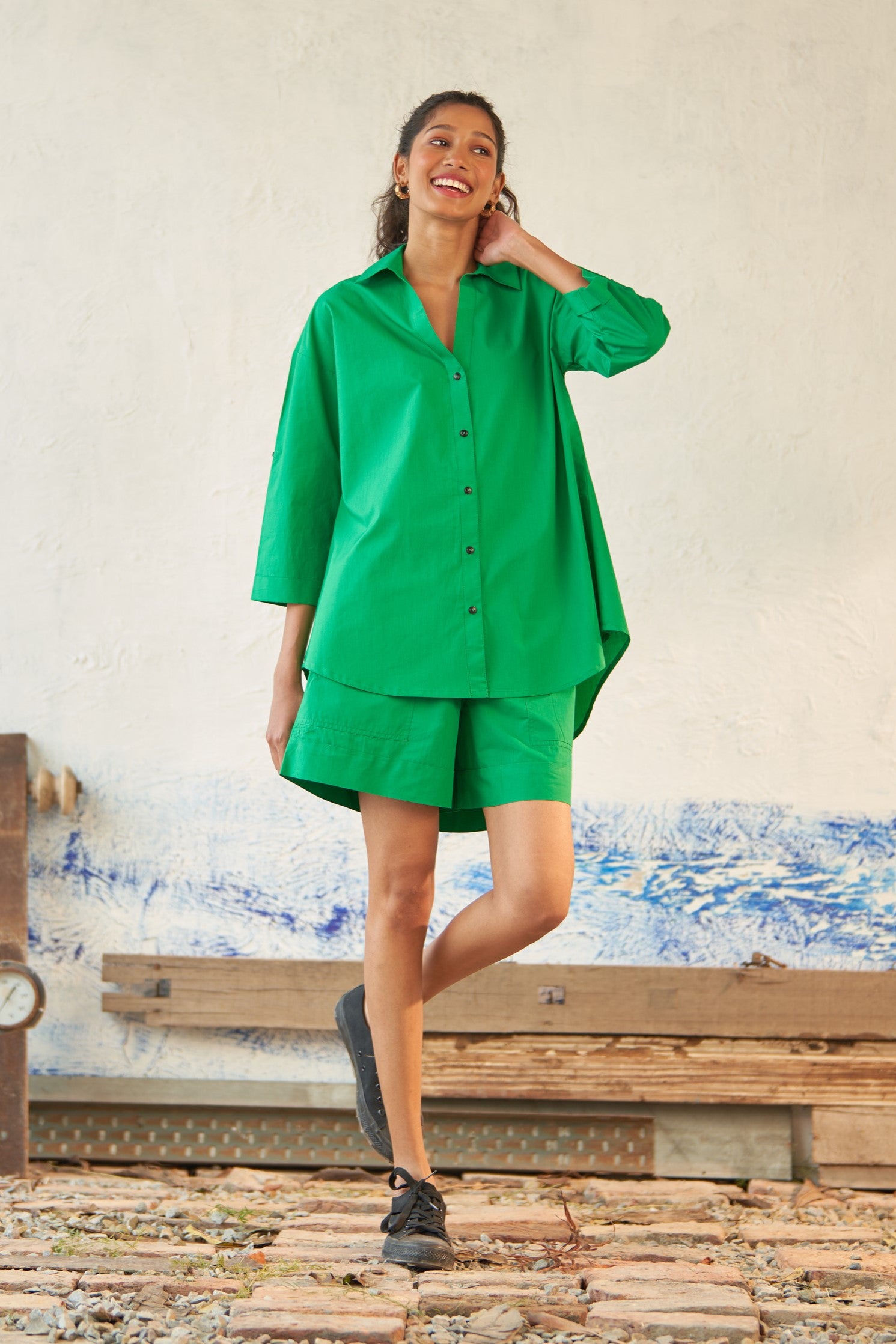 Our shorts, in the refreshing shade of chill pepper green, boast a half elastic waistband that offers unparalleled comfort and flexibility. Complete with convenient flap pockets, they provide both functionality and style. Elevate your summer wardrobe with our comfortable and chic shorts.