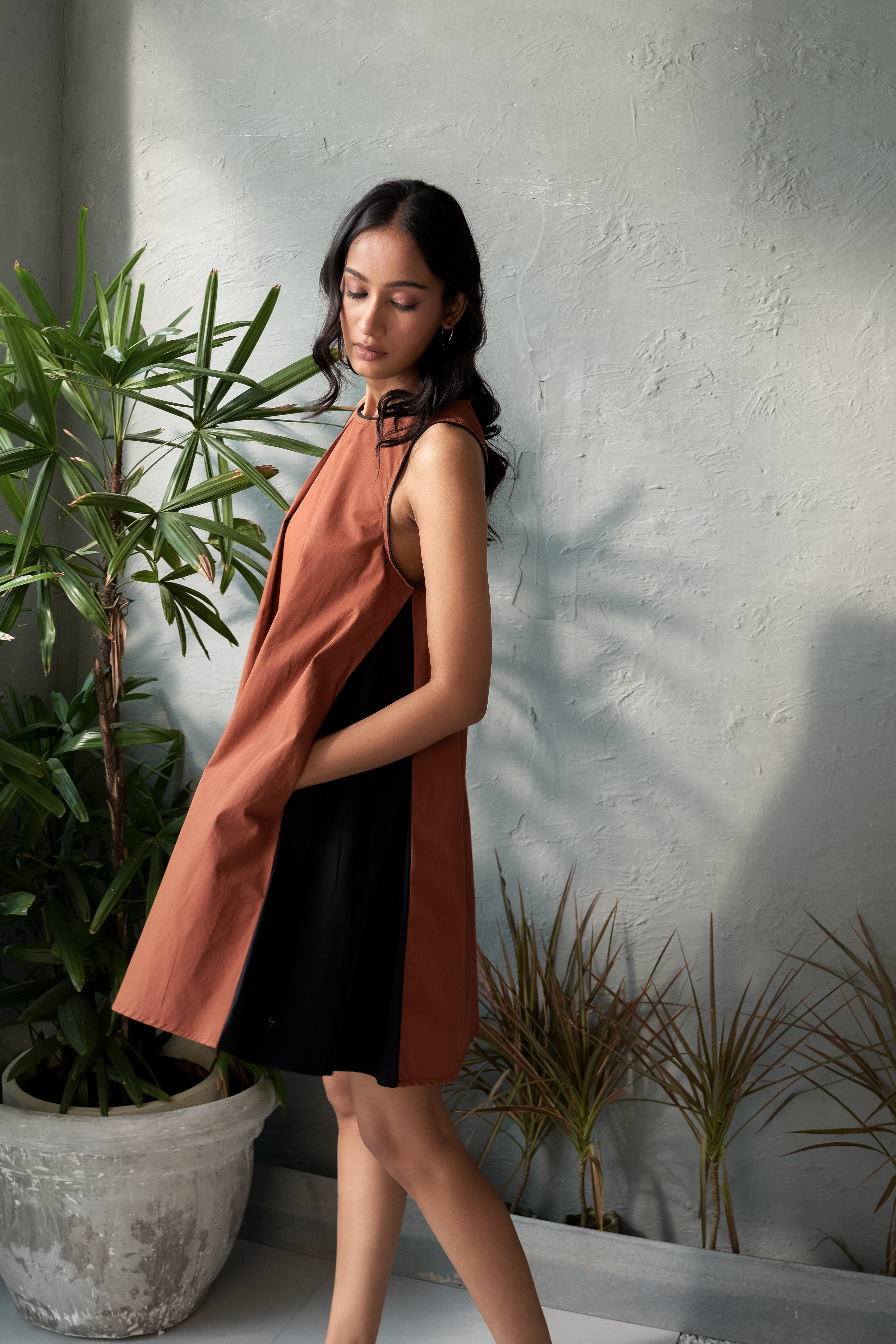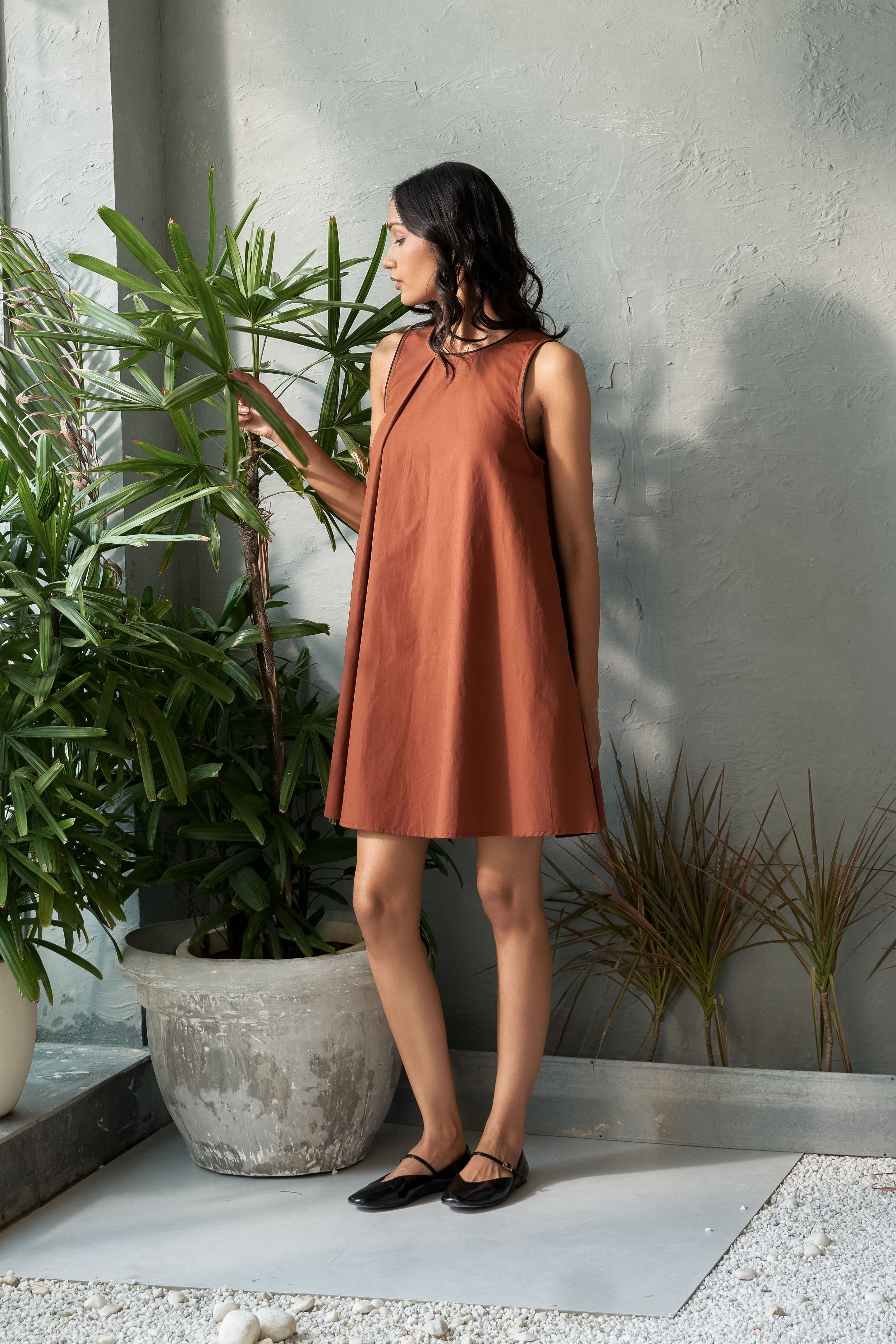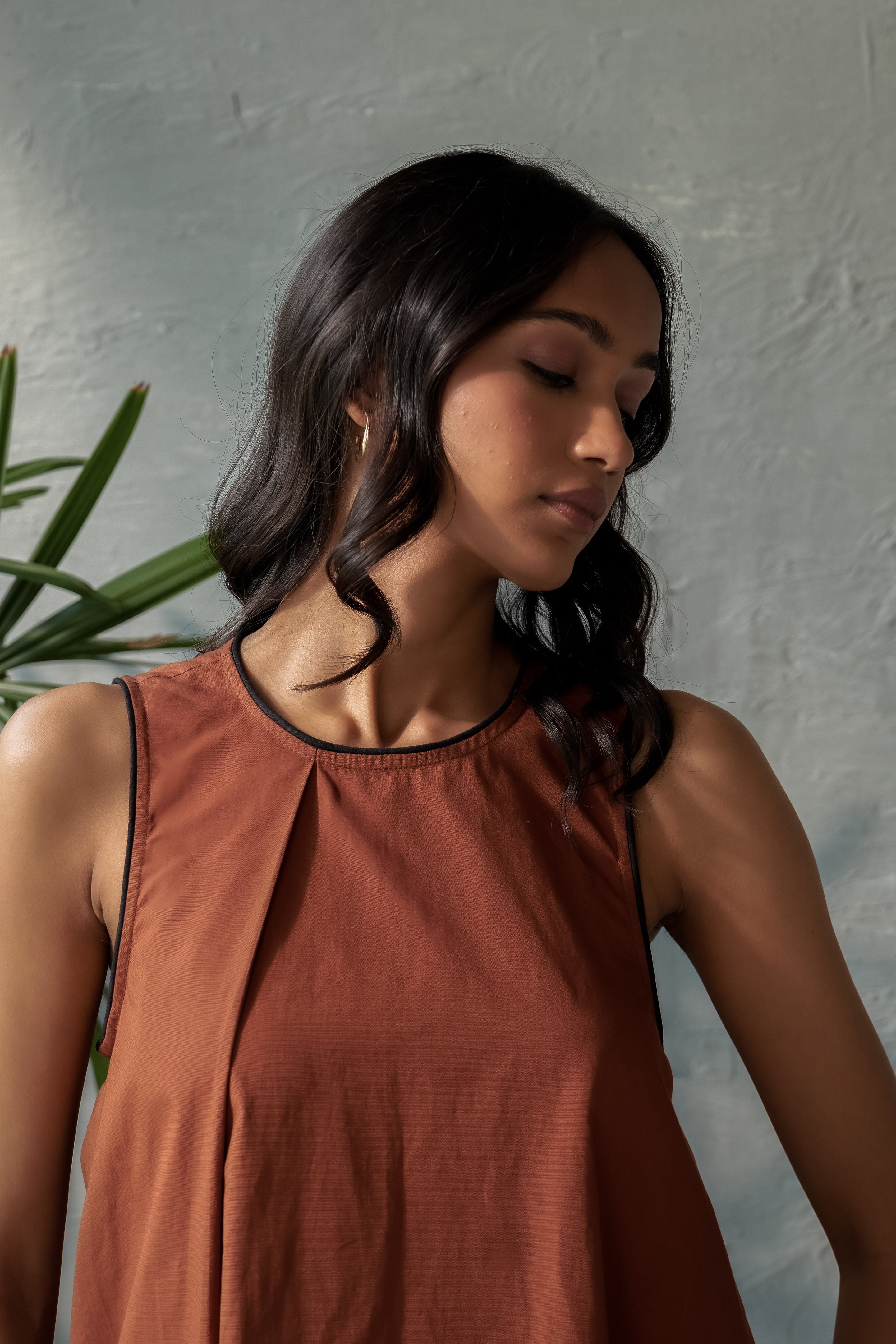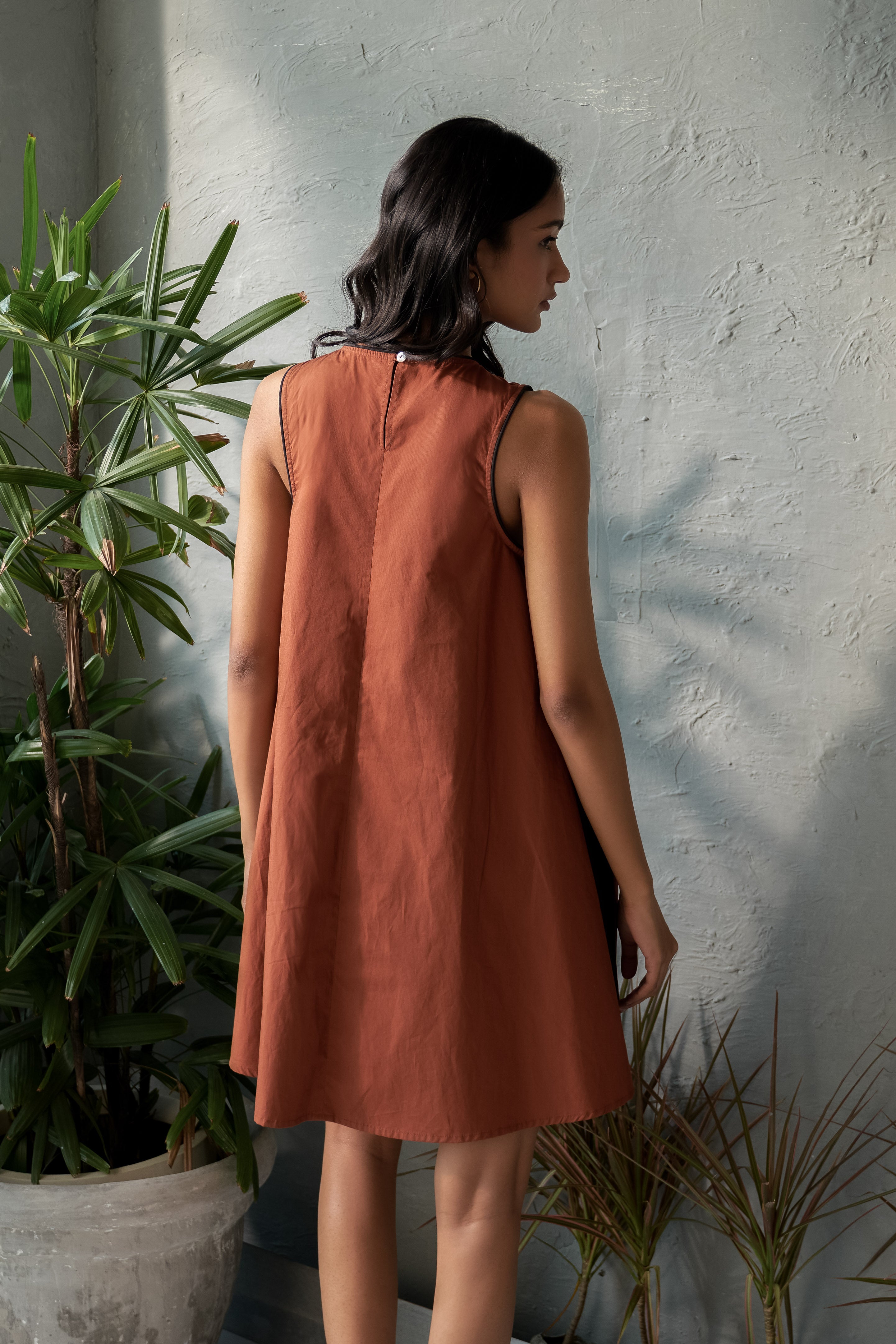 This short brown hued dress is a perfect blend of simplicity and style, designed to offer a relaxed yet chic look. Contrast side panels along with piping details along the neckline and armholes adds a modern twist to the classic silhouette, creating a flattering shape and visual interest. With its soft, flowing fabric, this dress is ideal for both casual outings and more polished occasions, ensuring you stay comfortable and stylish throughout the day. Pair it with your favorite accessories to complete the look